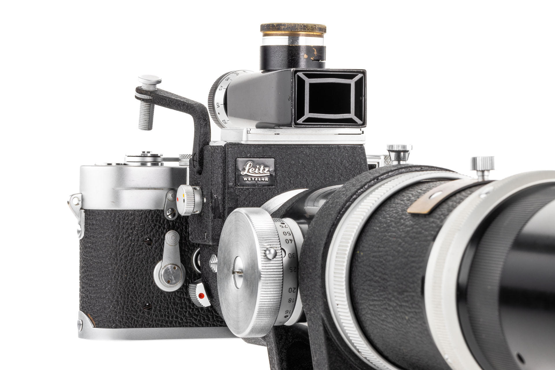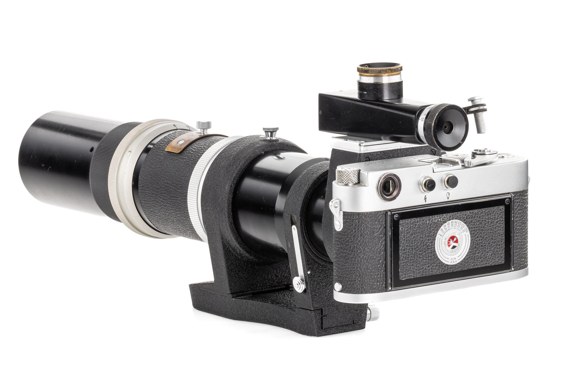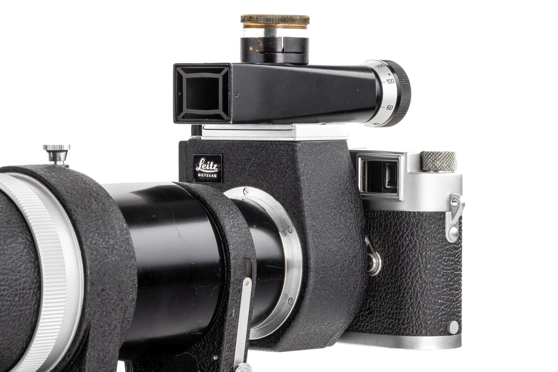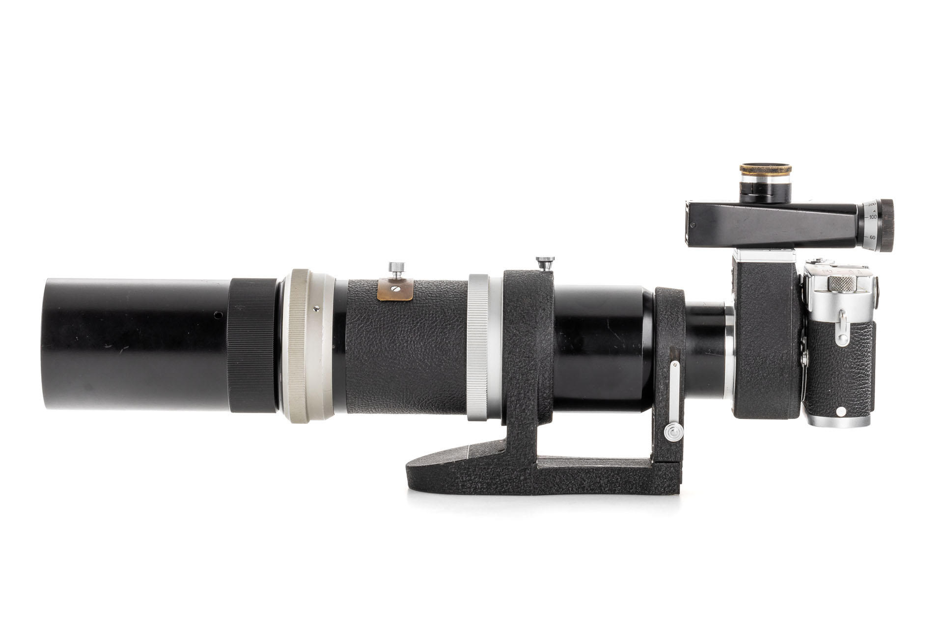 A unique set including a prototype Telyt 8/40cm no.0000048, showing many special features, like the focusing knob that can be moved from the right to the left side, the camera mount that can be rotated 90° for landscape and portrait orientation, the filter slot accepting filters in two different sizes, and the entire lens head equipped with a quick-exchange system (resembling the one on much later Telyt V lenses). It is also one of the first prototype M-mount lenses. The set also includes an original Leica M3 Betriebskamera no.M3-1149 and a prototype SFTOO 20cm finder, heavily modified with a magnifier built-in on the top, for critical focusing on a Visoflex. Accompanying this unique finder is an original pencil design drawing on parchment dated 17.09.1955.