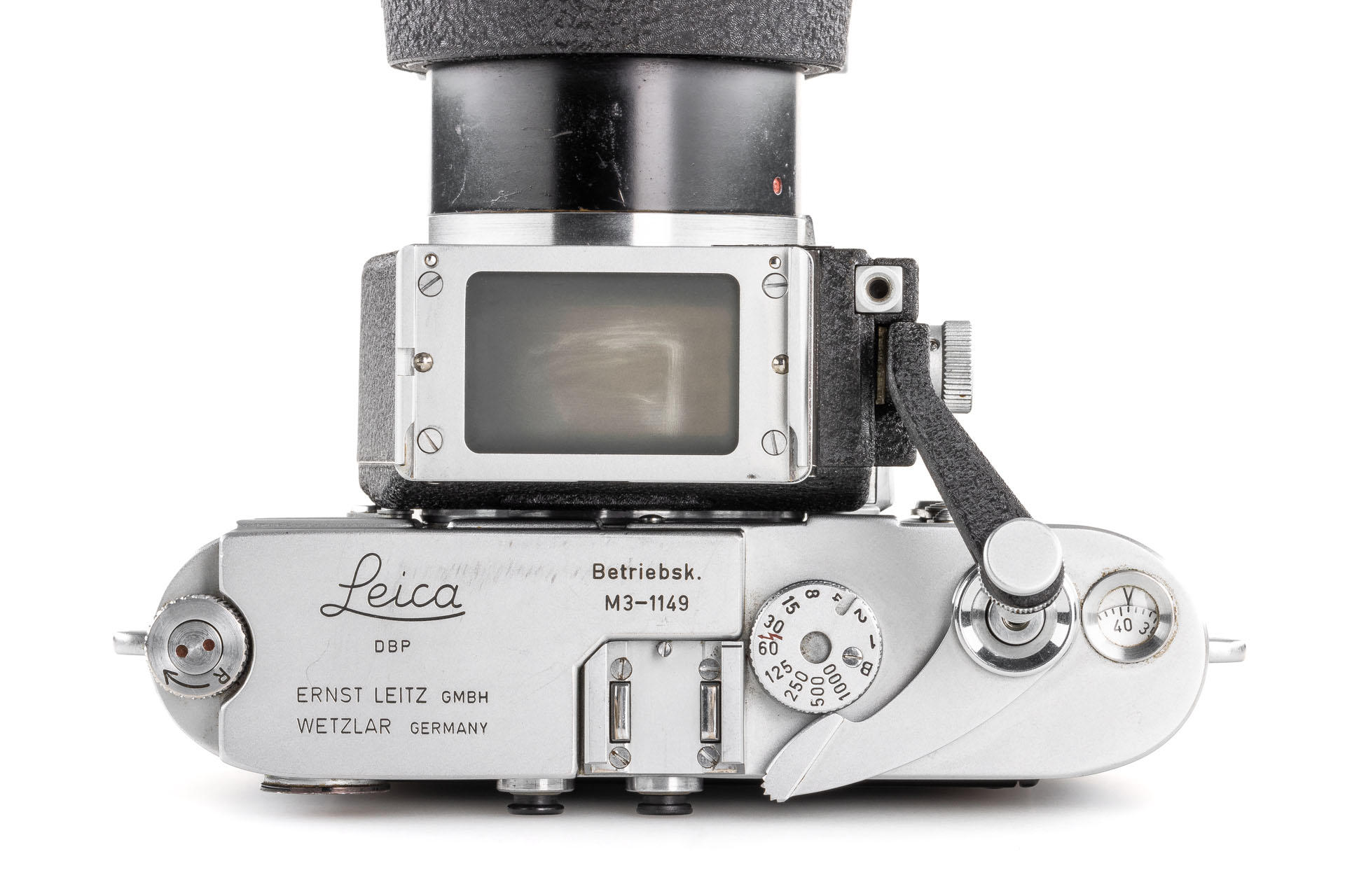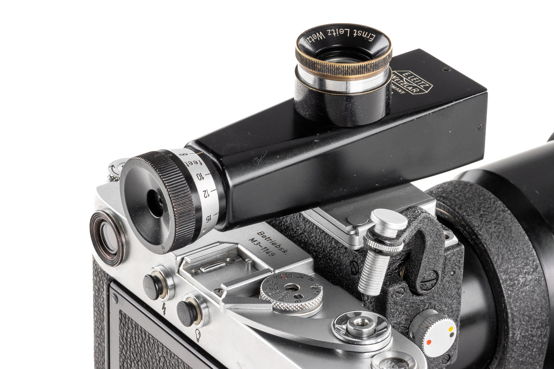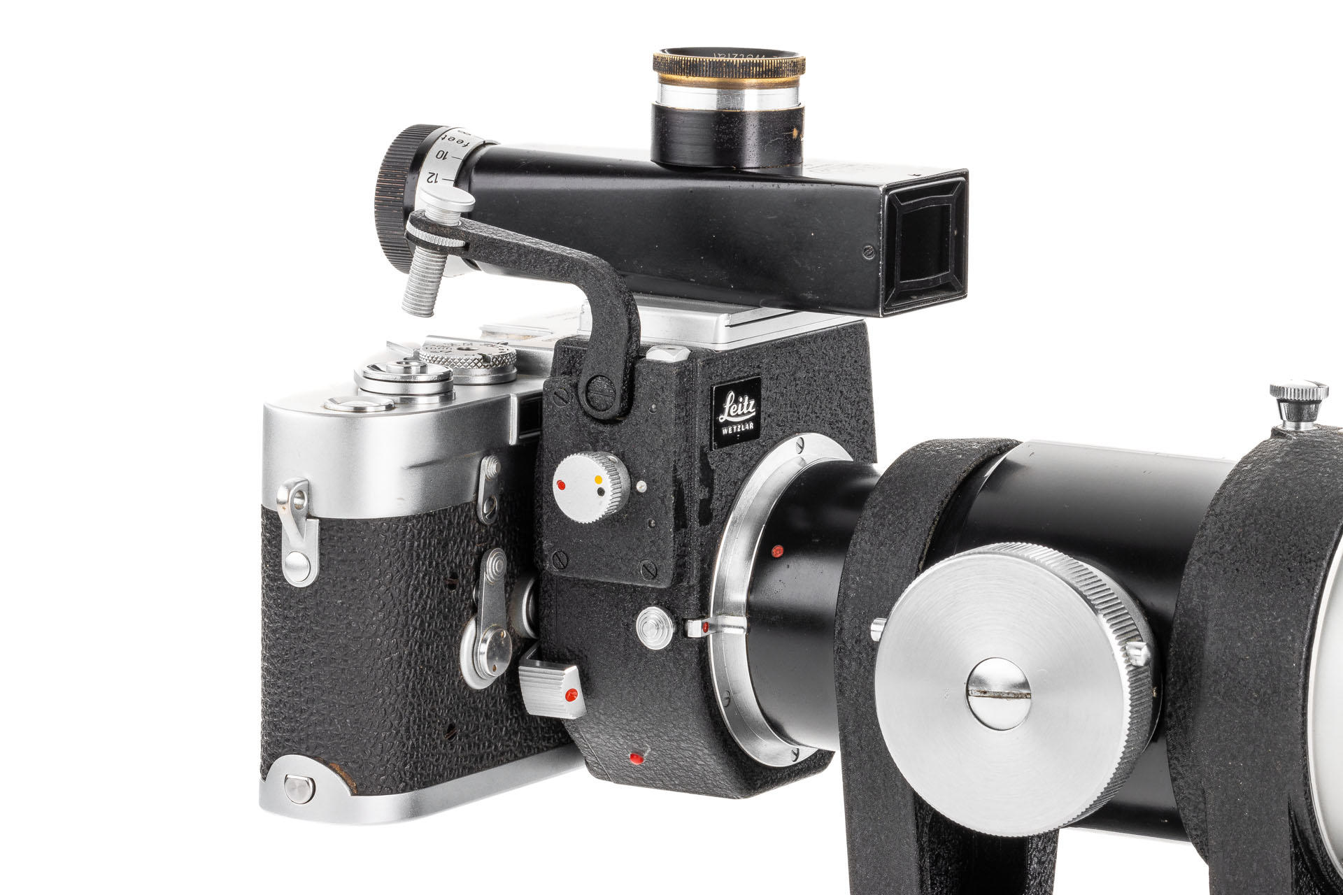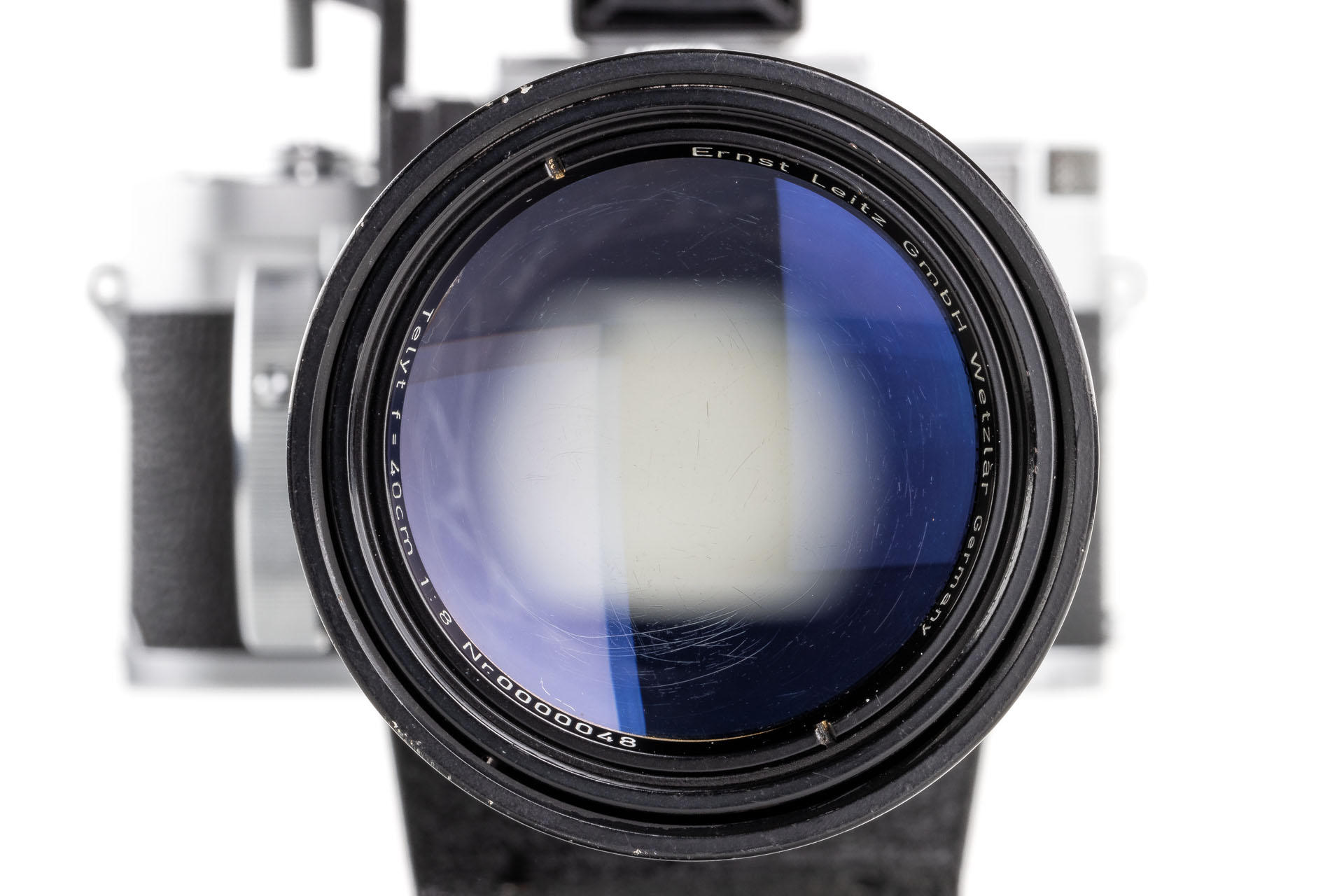 A unique set including a prototype Telyt 8/40cm no.0000048, showing many special features, like the focusing knob that can be moved from the right to the left side, the camera mount that can be rotated 90° for landscape and portrait orientation, the filter slot accepting filters in two different sizes, and the entire lens head equipped with a quick-exchange system (resembling the one on much later Telyt V lenses). It is also one of the first prototype M-mount lenses. The set also includes an original Leica M3 Betriebskamera no.M3-1149 and a prototype SFTOO 20cm finder, heavily modified with a magnifier built-in on the top, for critical focusing on a Visoflex. Accompanying this unique finder is an original pencil design drawing on parchment dated 17.09.1955.