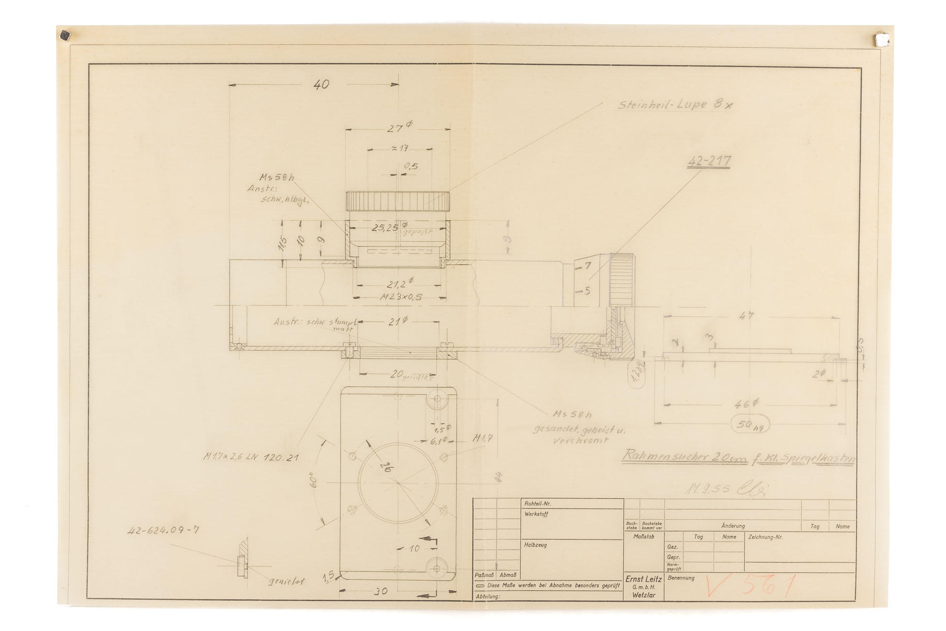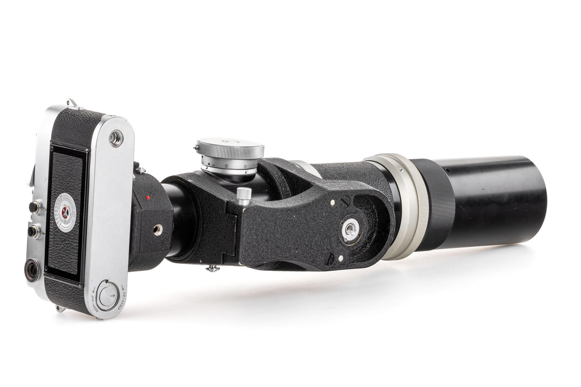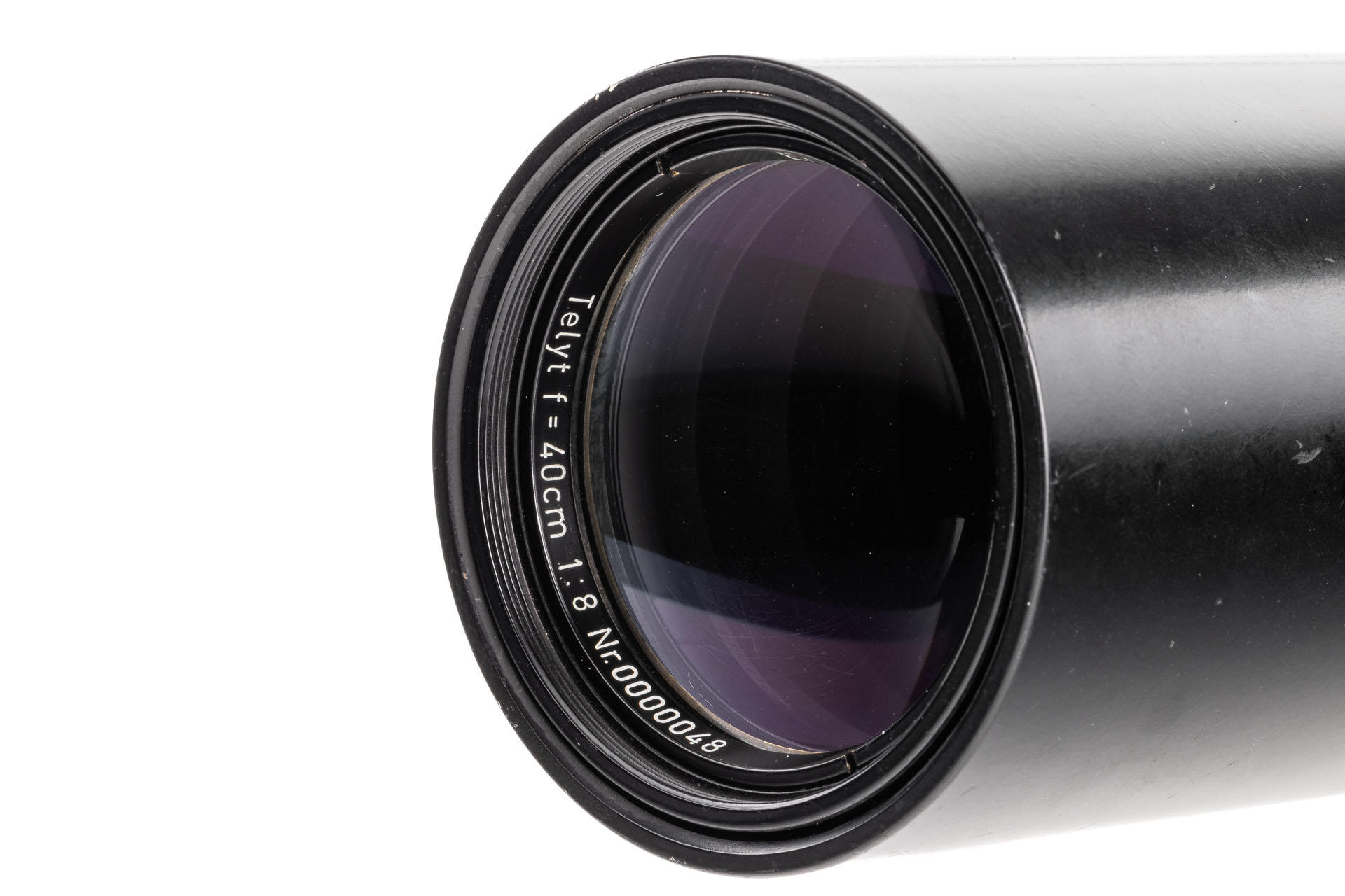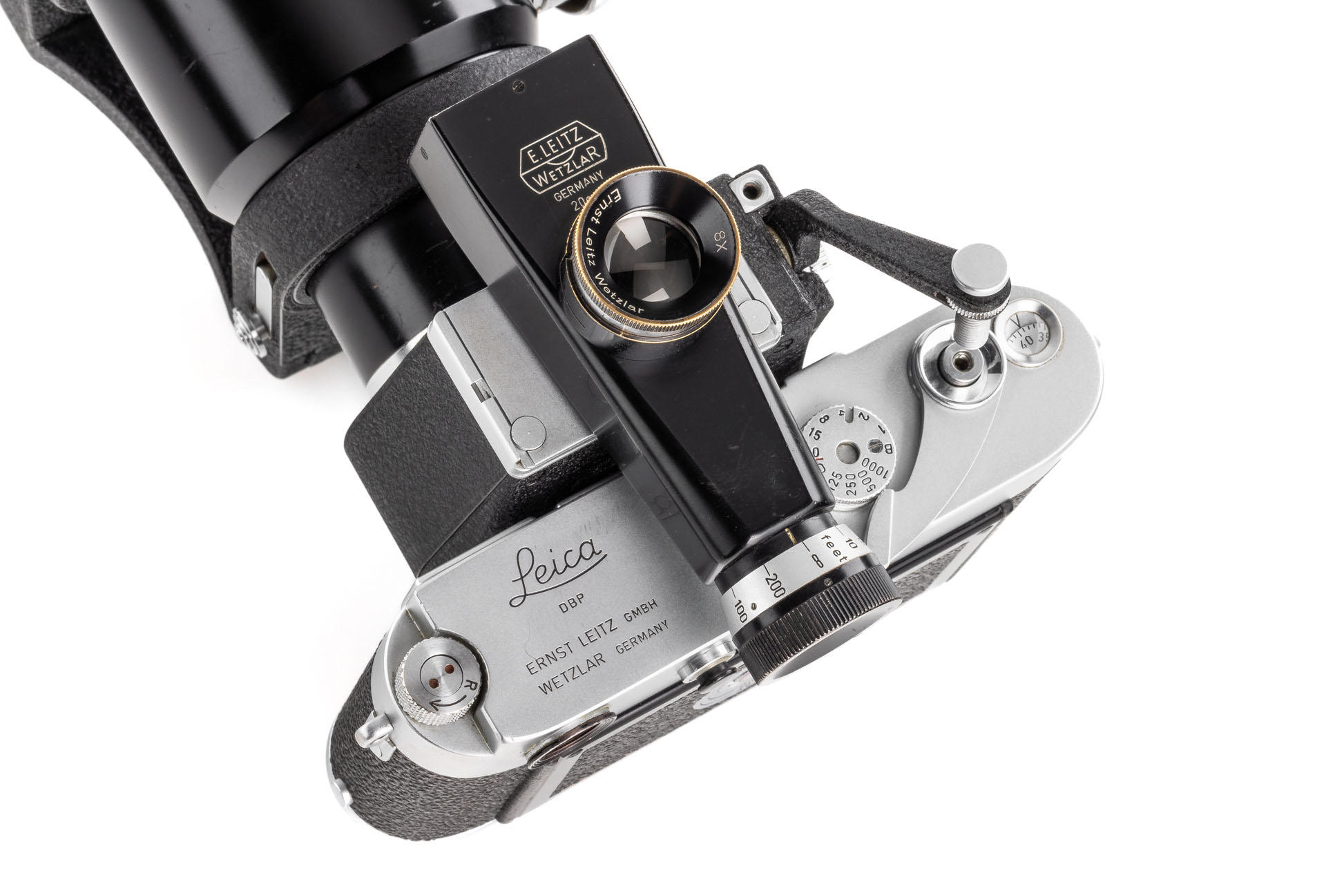 A unique set including a prototype Telyt 8/40cm no.0000048, showing many special features, like the focusing knob that can be moved from the right to the left side, the camera mount that can be rotated 90° for landscape and portrait orientation, the filter slot accepting filters in two different sizes, and the entire lens head equipped with a quick-exchange system (resembling the one on much later Telyt V lenses). It is also one of the first prototype M-mount lenses. The set also includes an original Leica M3 Betriebskamera no.M3-1149 and a prototype SFTOO 20cm finder, heavily modified with a magnifier built-in on the top, for critical focusing on a Visoflex. Accompanying this unique finder is an original pencil design drawing on parchment dated 17.09.1955.