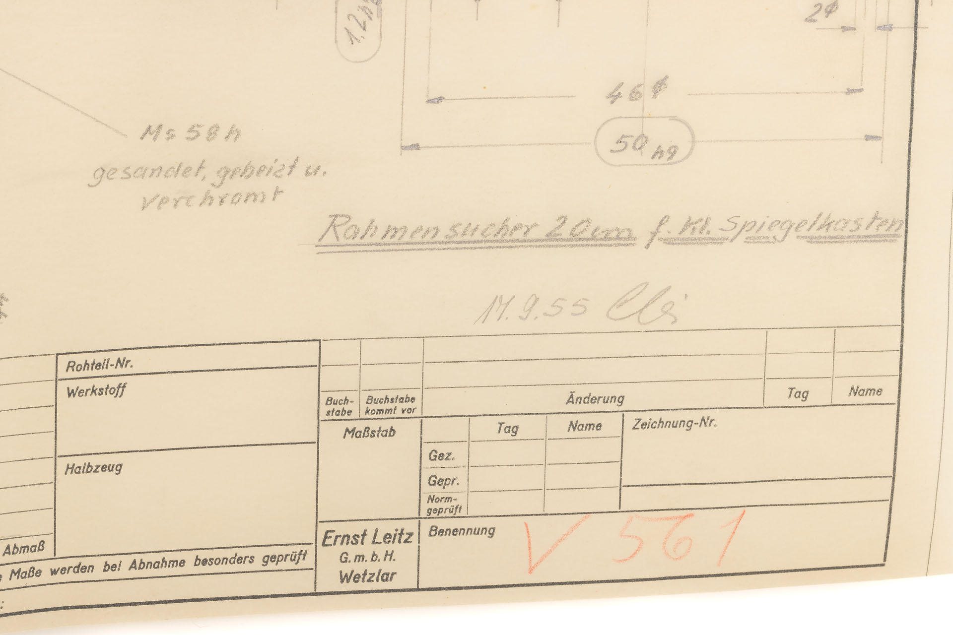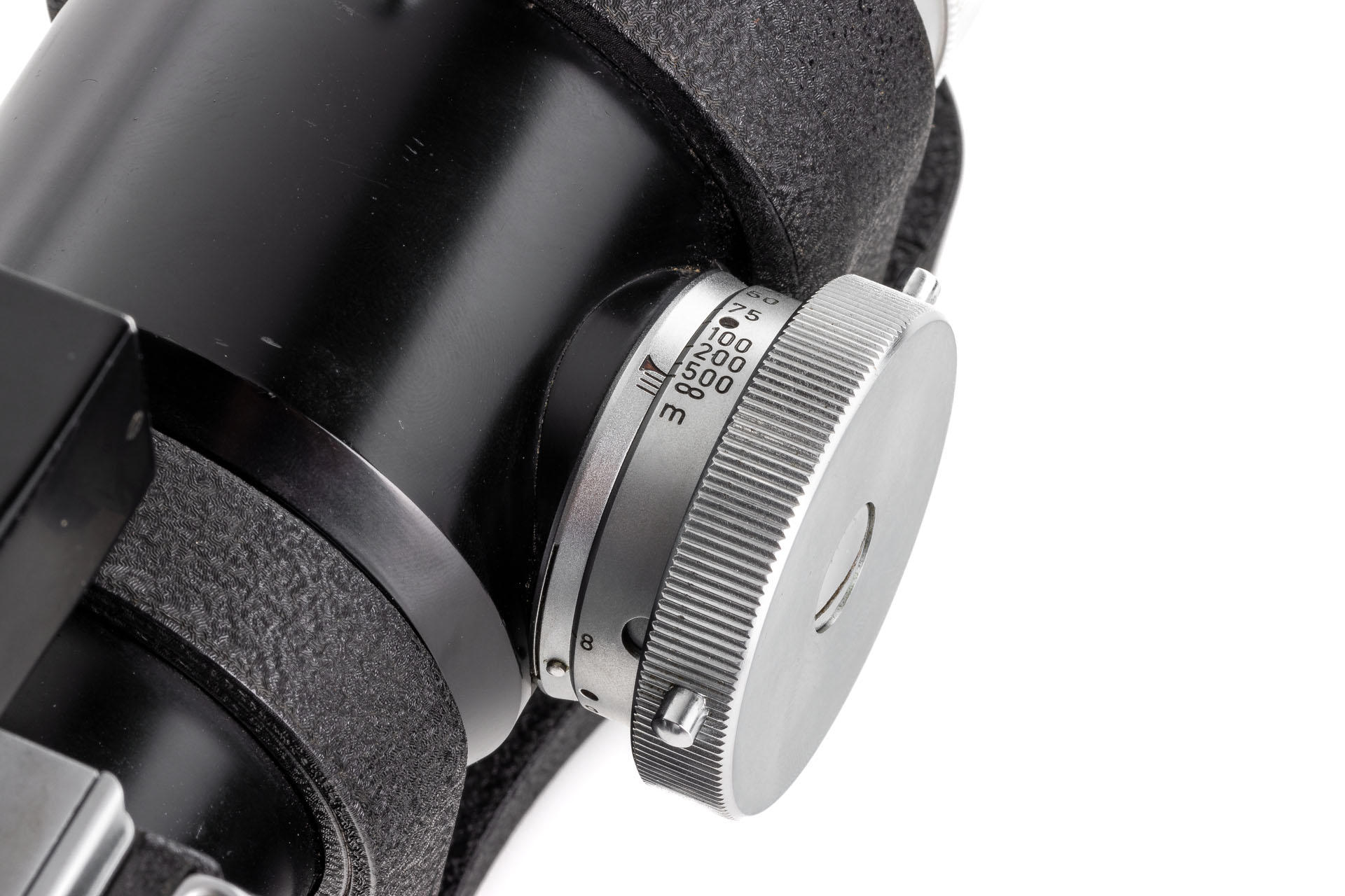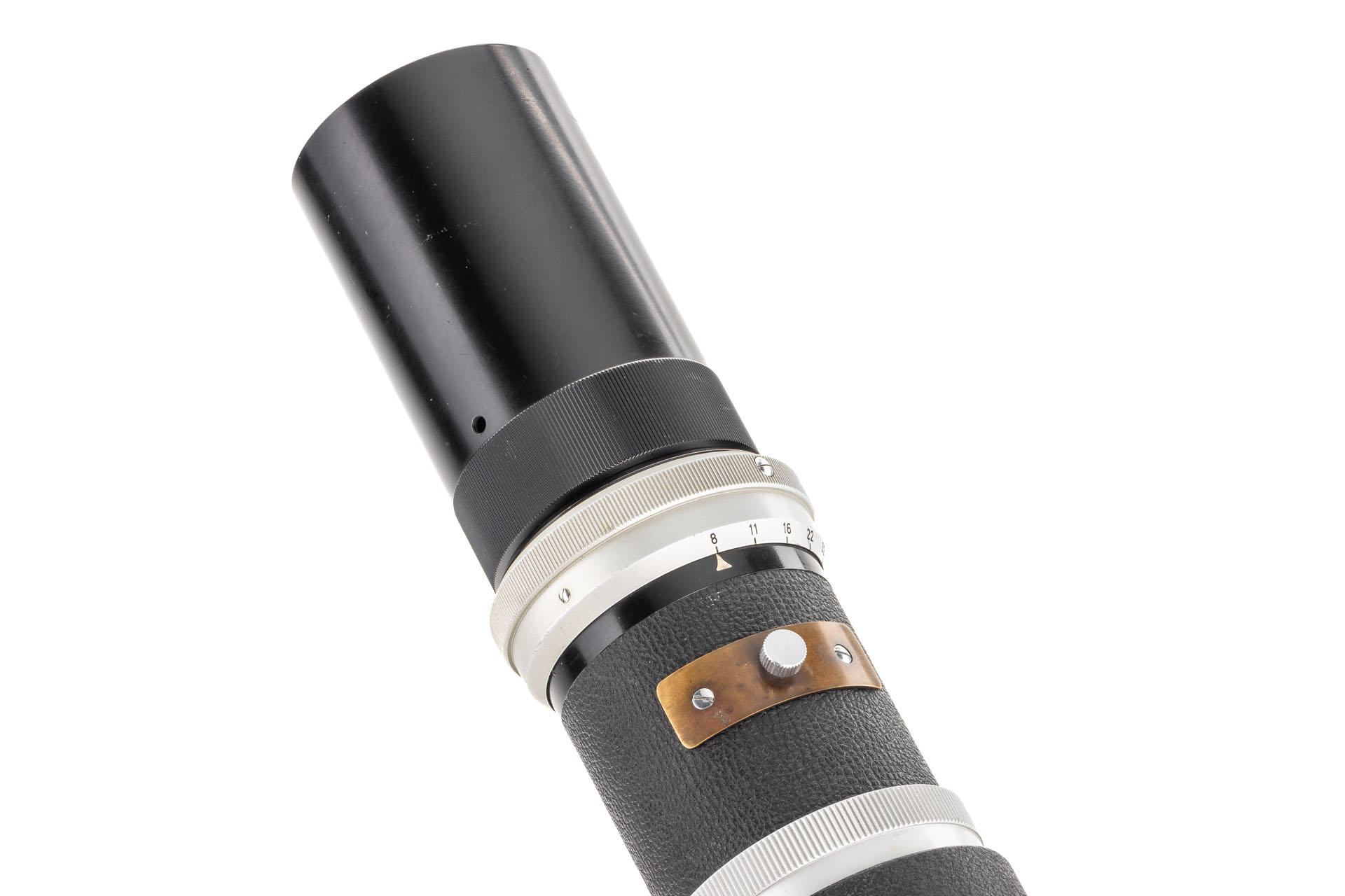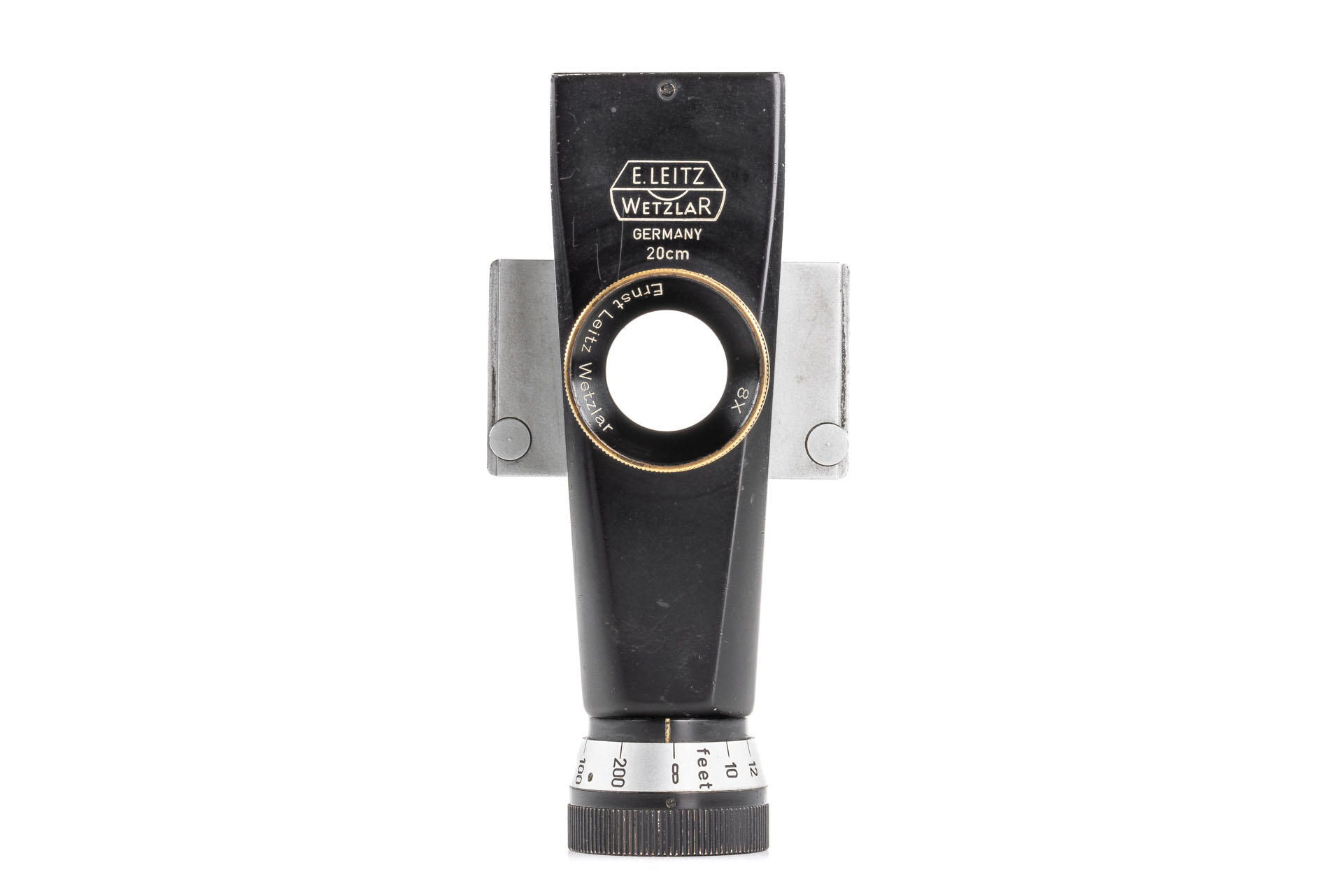 A unique set including a prototype Telyt 8/40cm no.0000048, showing many special features, like the focusing knob that can be moved from the right to the left side, the camera mount that can be rotated 90° for landscape and portrait orientation, the filter slot accepting filters in two different sizes, and the entire lens head equipped with a quick-exchange system (resembling the one on much later Telyt V lenses). It is also one of the first prototype M-mount lenses. The set also includes an original Leica M3 Betriebskamera no.M3-1149 and a prototype SFTOO 20cm finder, heavily modified with a magnifier built-in on the top, for critical focusing on a Visoflex. Accompanying this unique finder is an original pencil design drawing on parchment dated 17.09.1955.