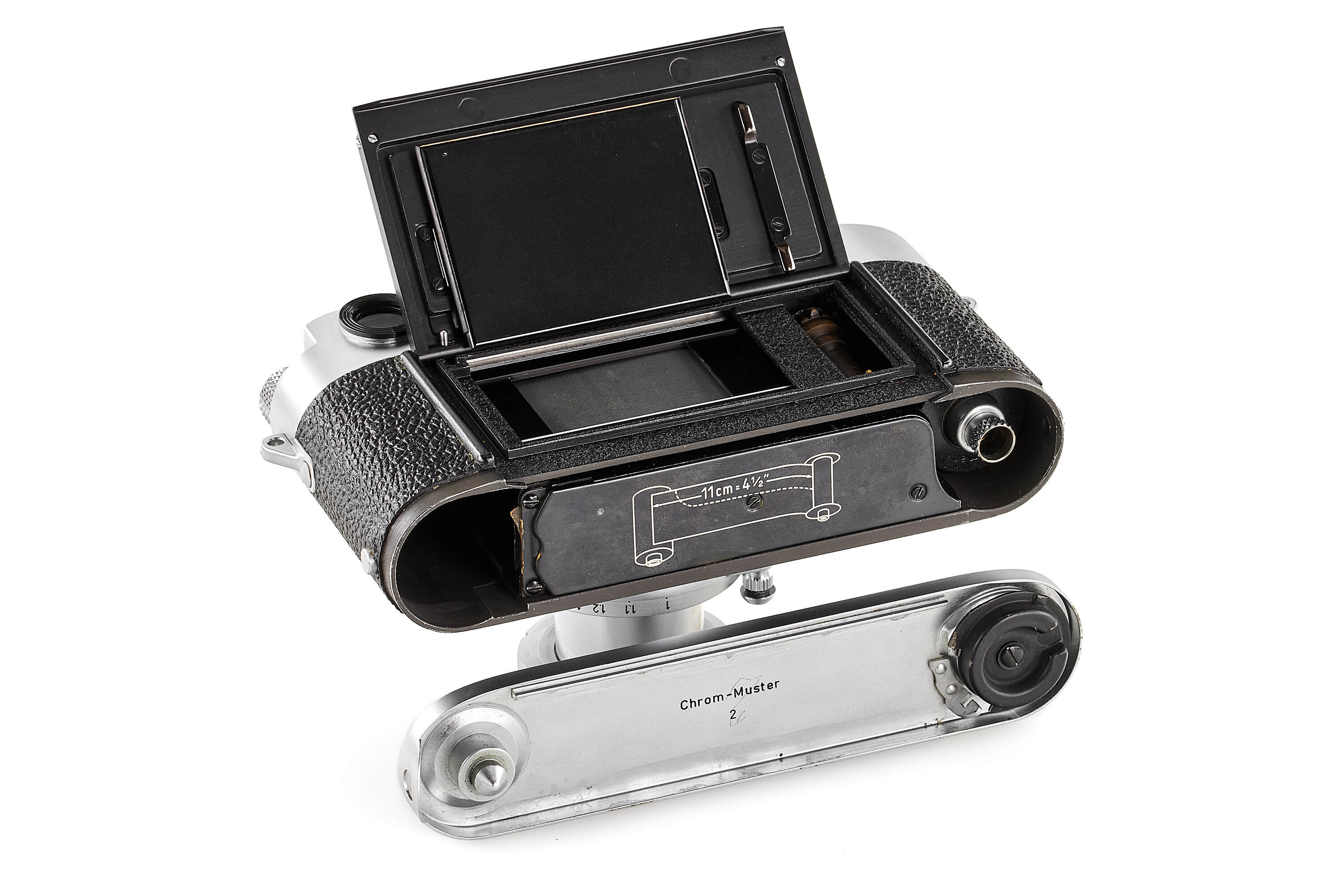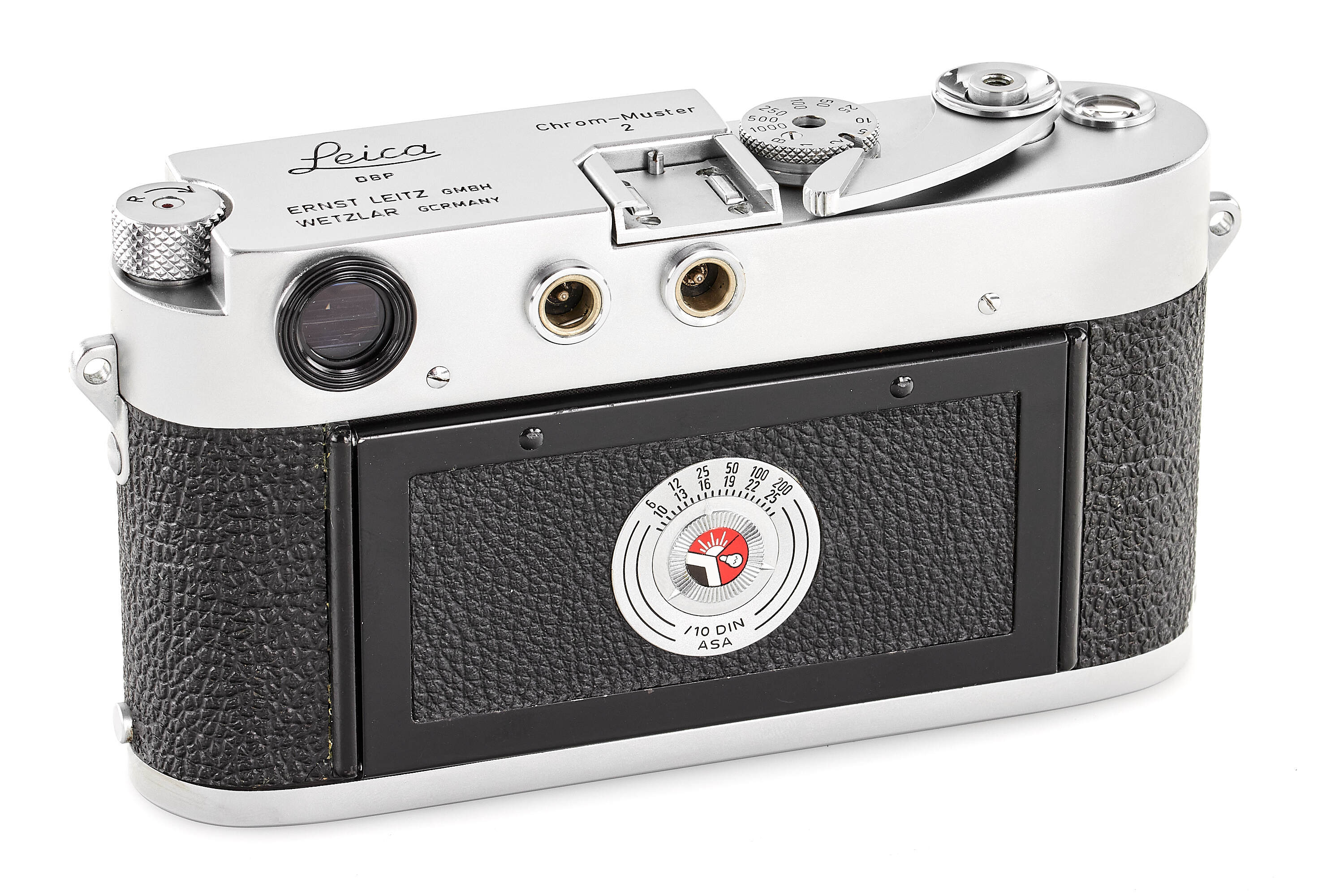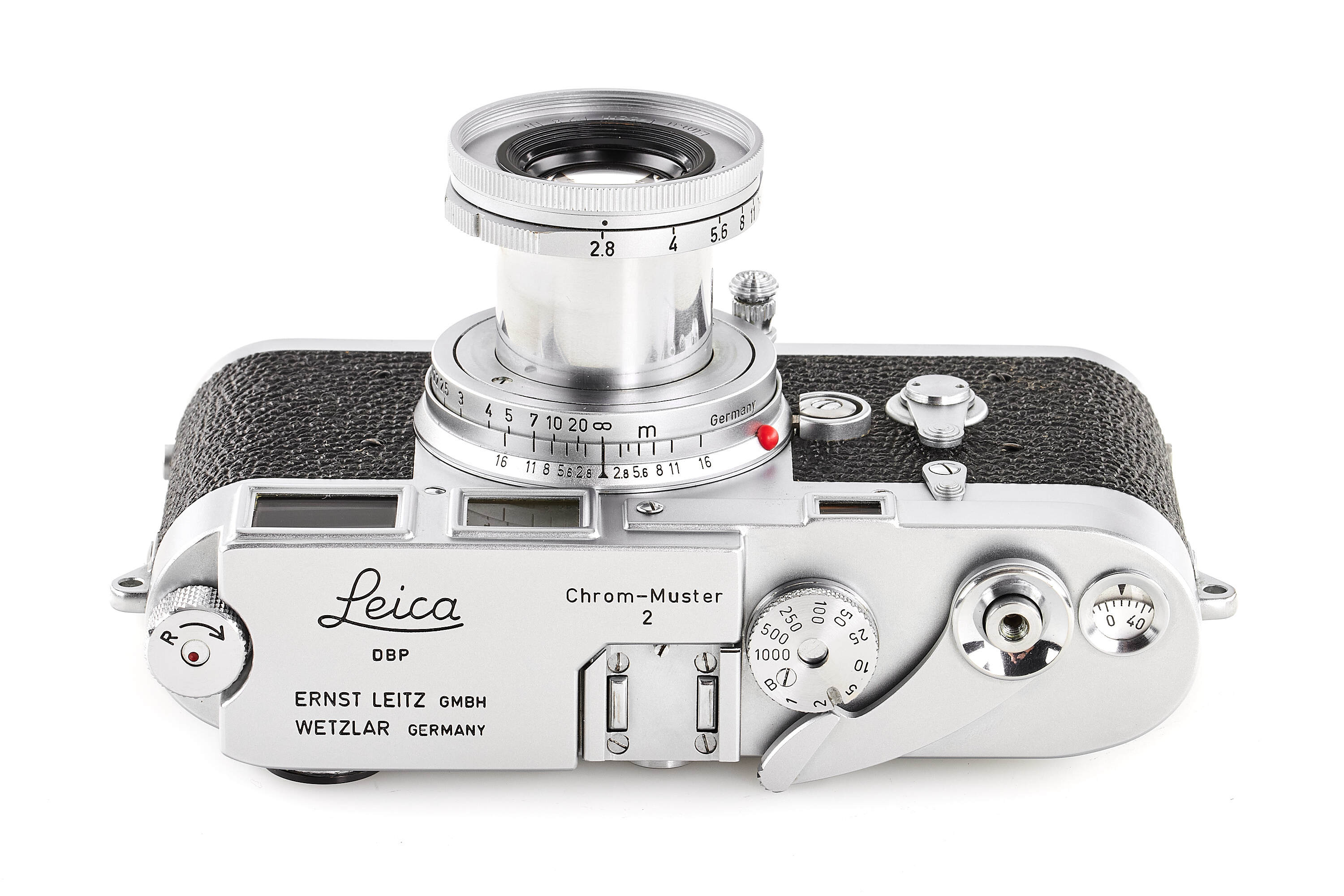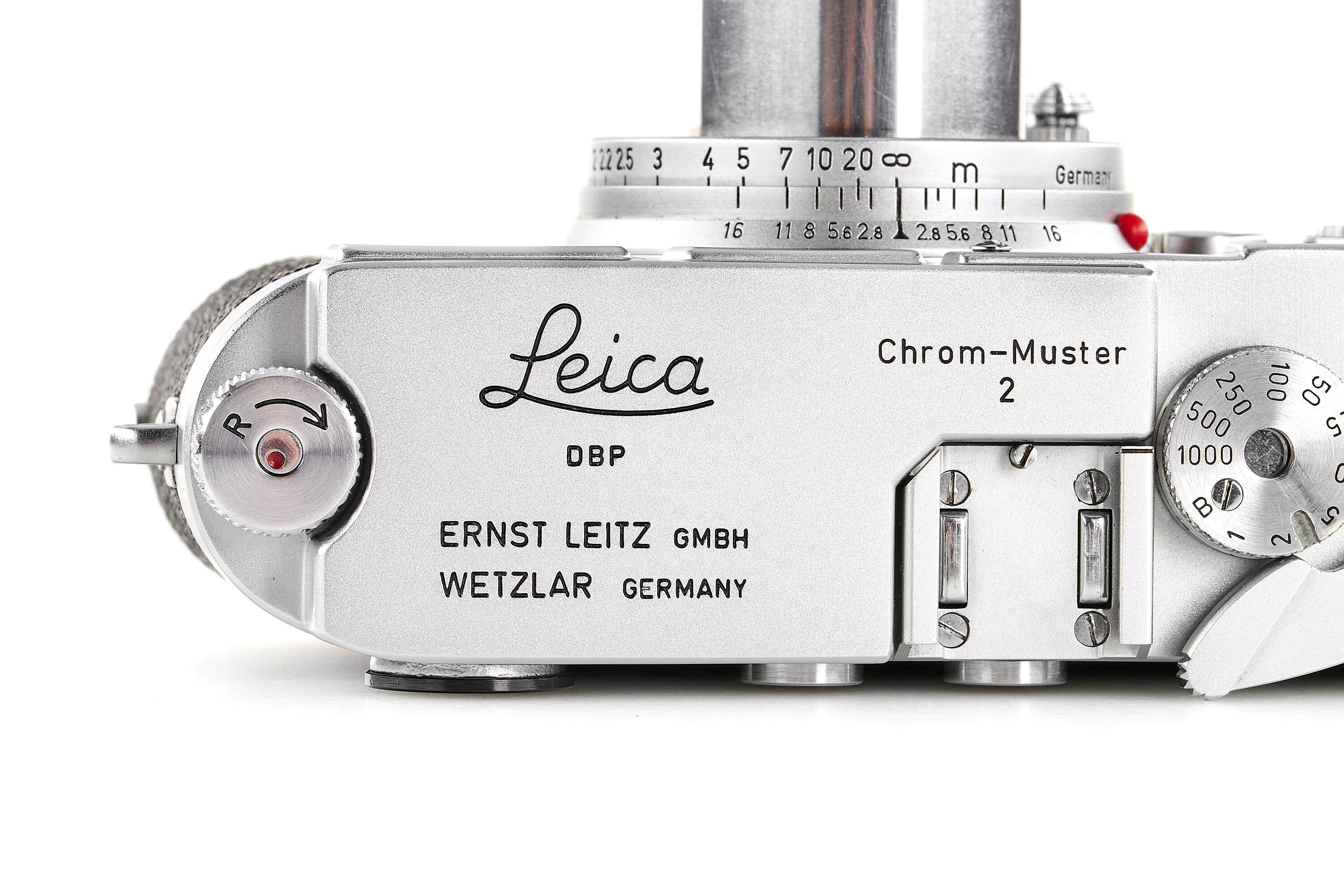 An early prototype Leica M3, produced as a sample for the chrome finish, engraved on the top plate and inside the base plate with "Chrom-Muster 2". Interestingly, this example shows no flash contact symbols engraved, an uncommon and noteworthy feature. The camera is in beautiful, near-mint condition, and comes with a matching unnumbered Elmar 2.8/5cm lens.