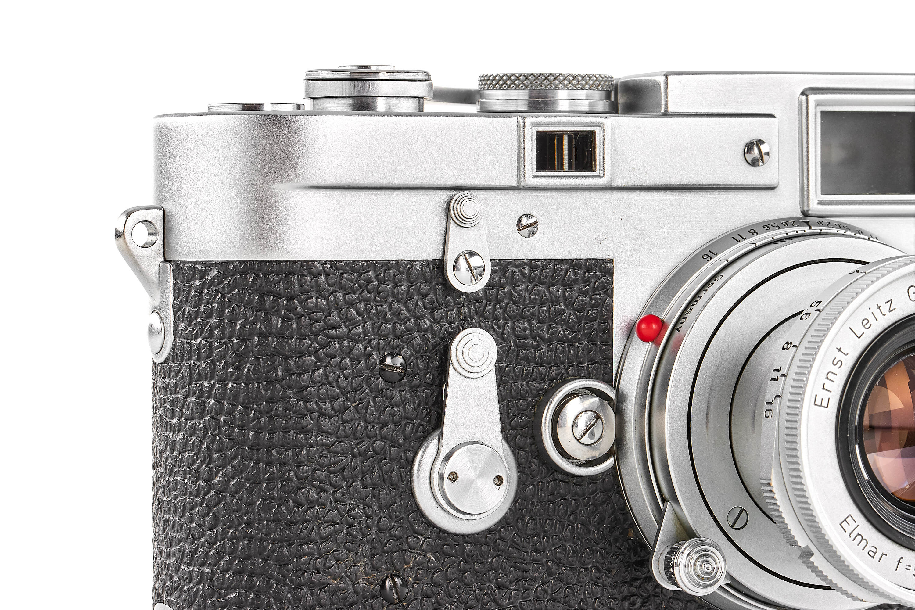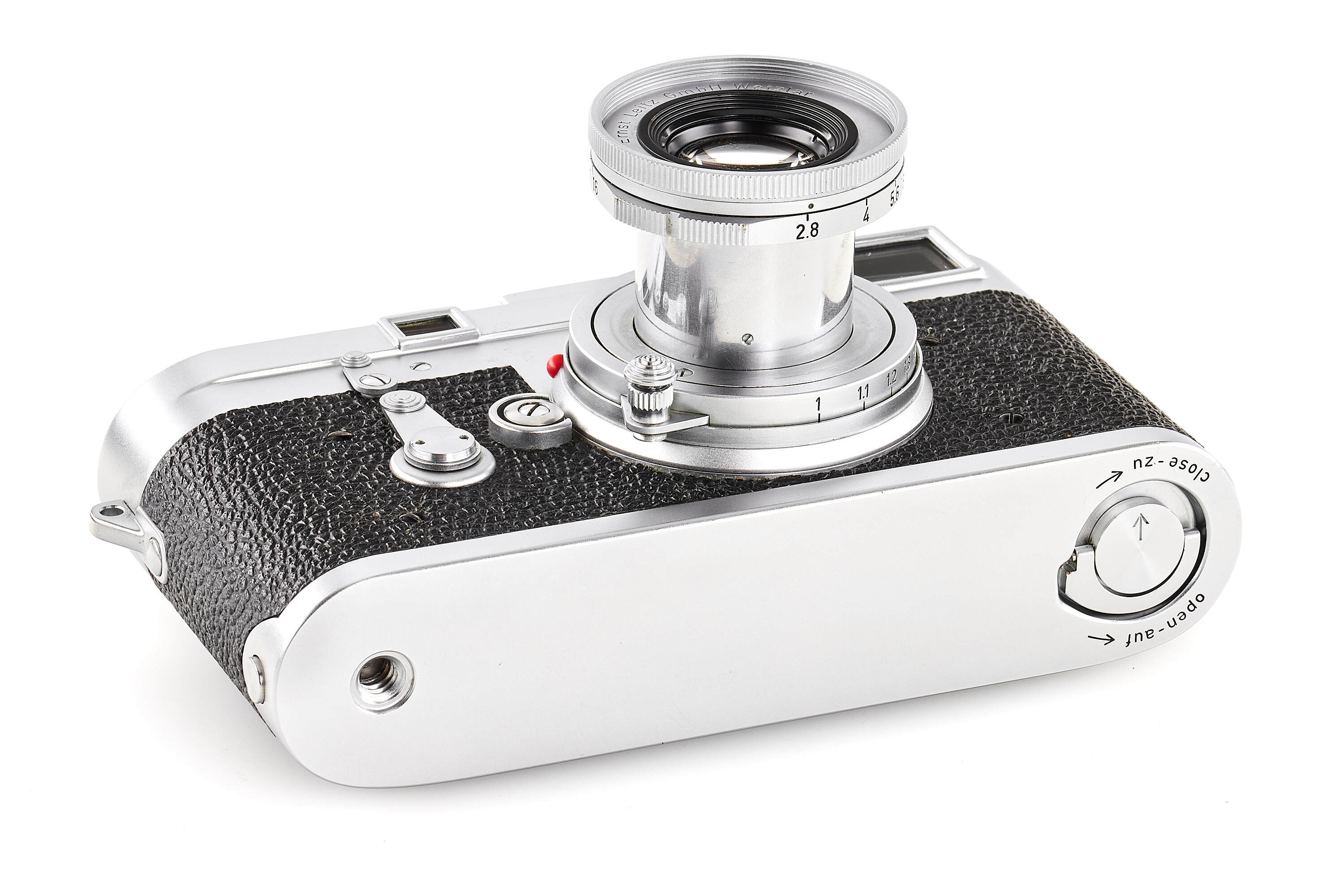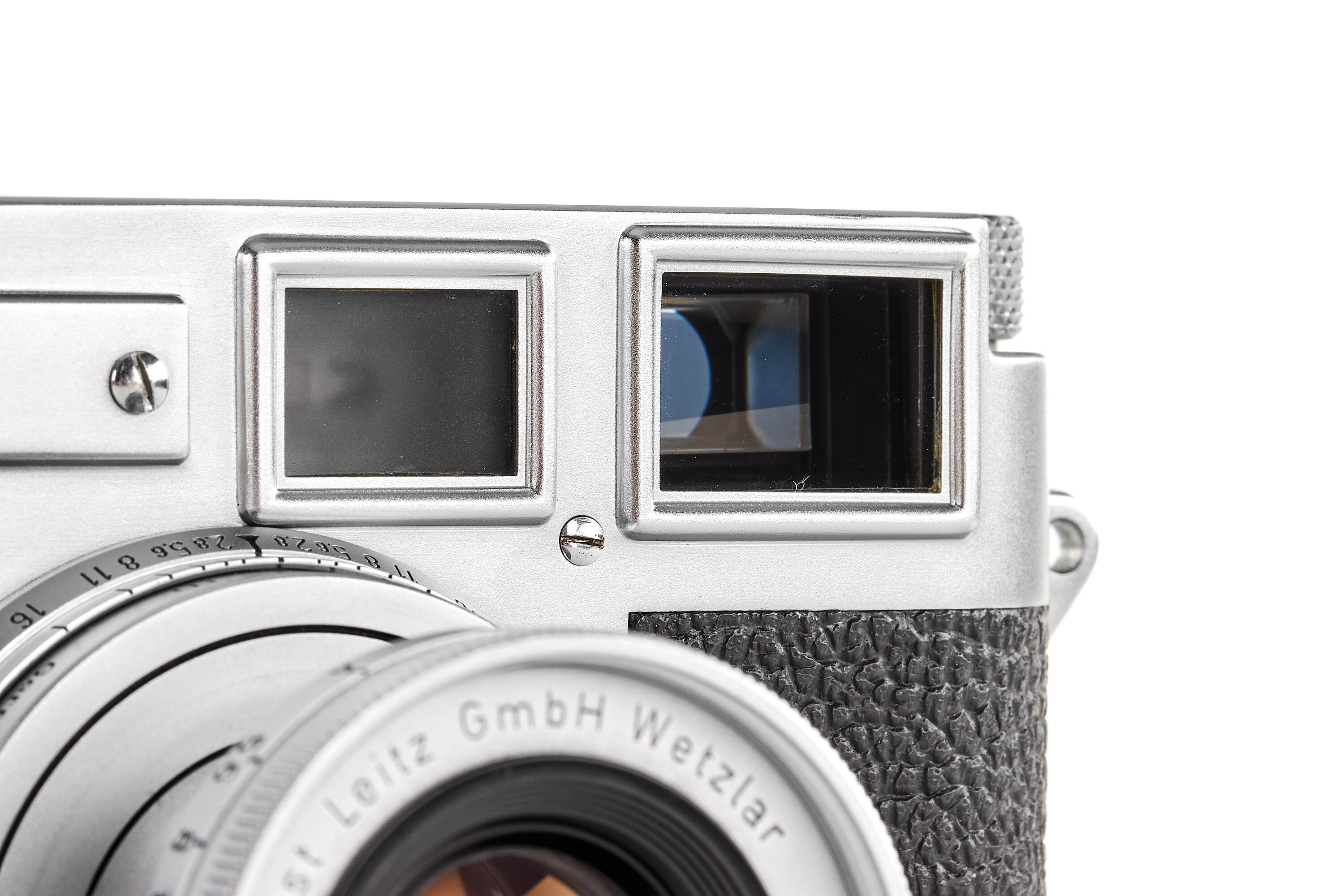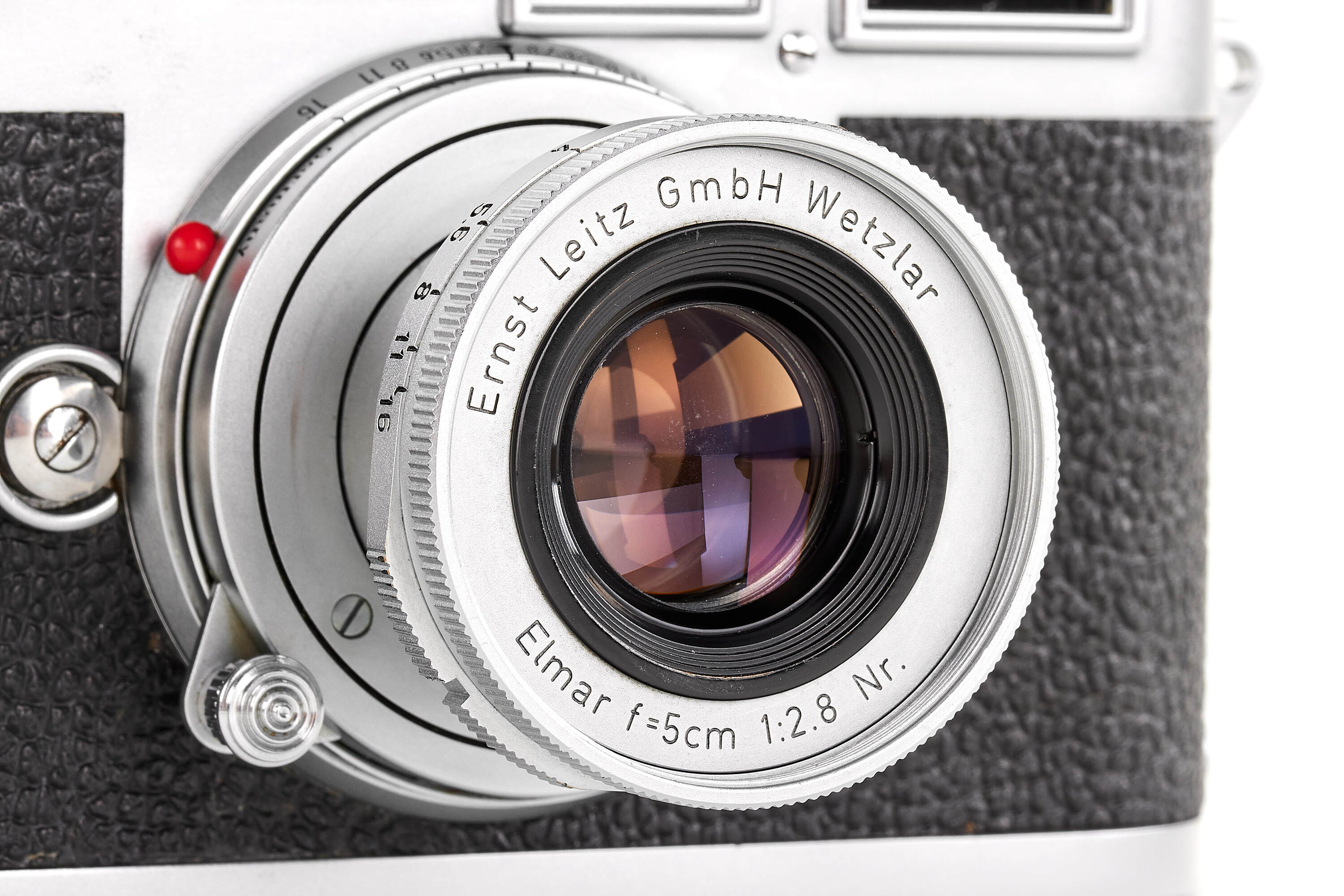 An early prototype Leica M3, produced as a sample for the chrome finish, engraved on the top plate and inside the base plate with "Chrom-Muster 2". Interestingly, this example shows no flash contact symbols engraved, an uncommon and noteworthy feature. The camera is in beautiful, near-mint condition, and comes with a matching unnumbered Elmar 2.8/5cm lens.