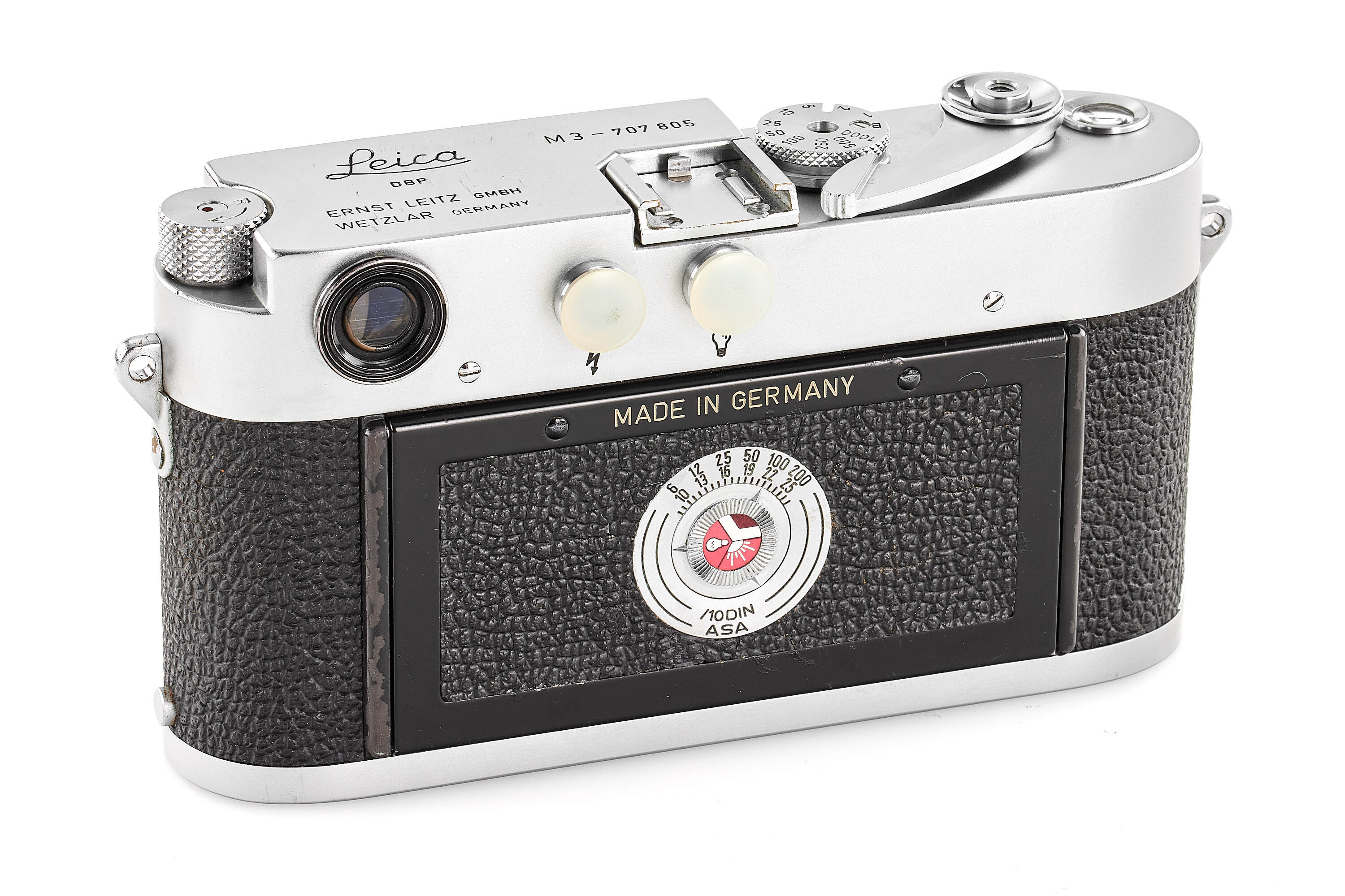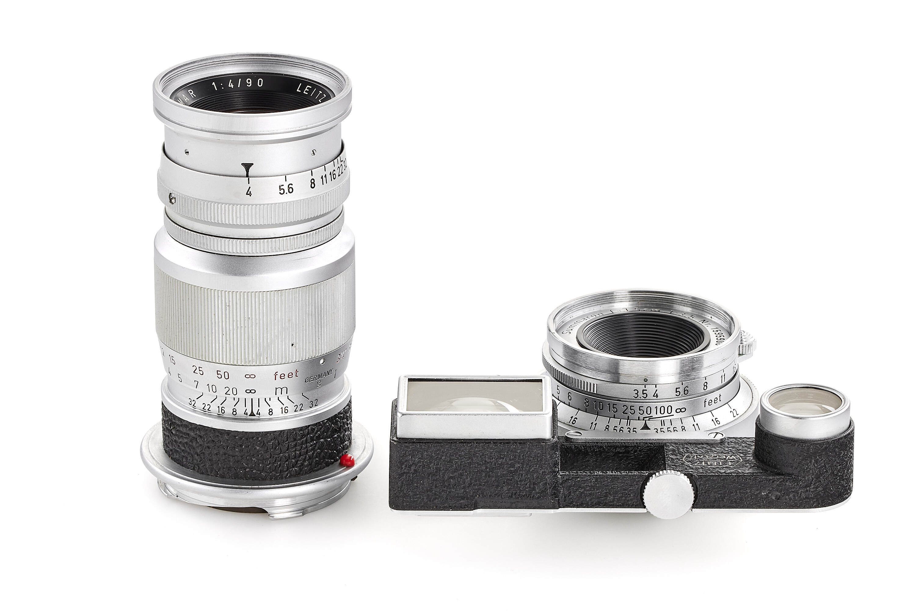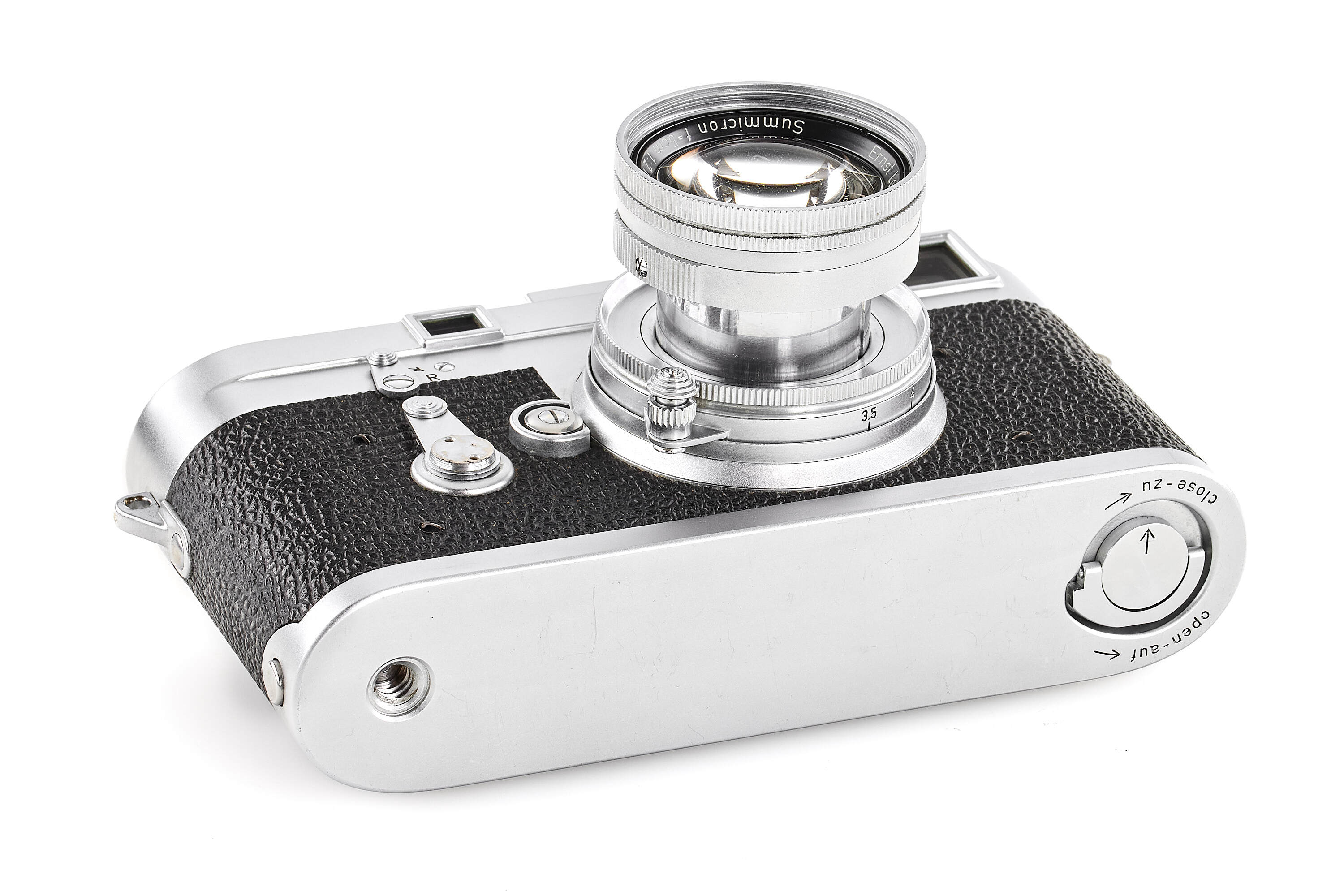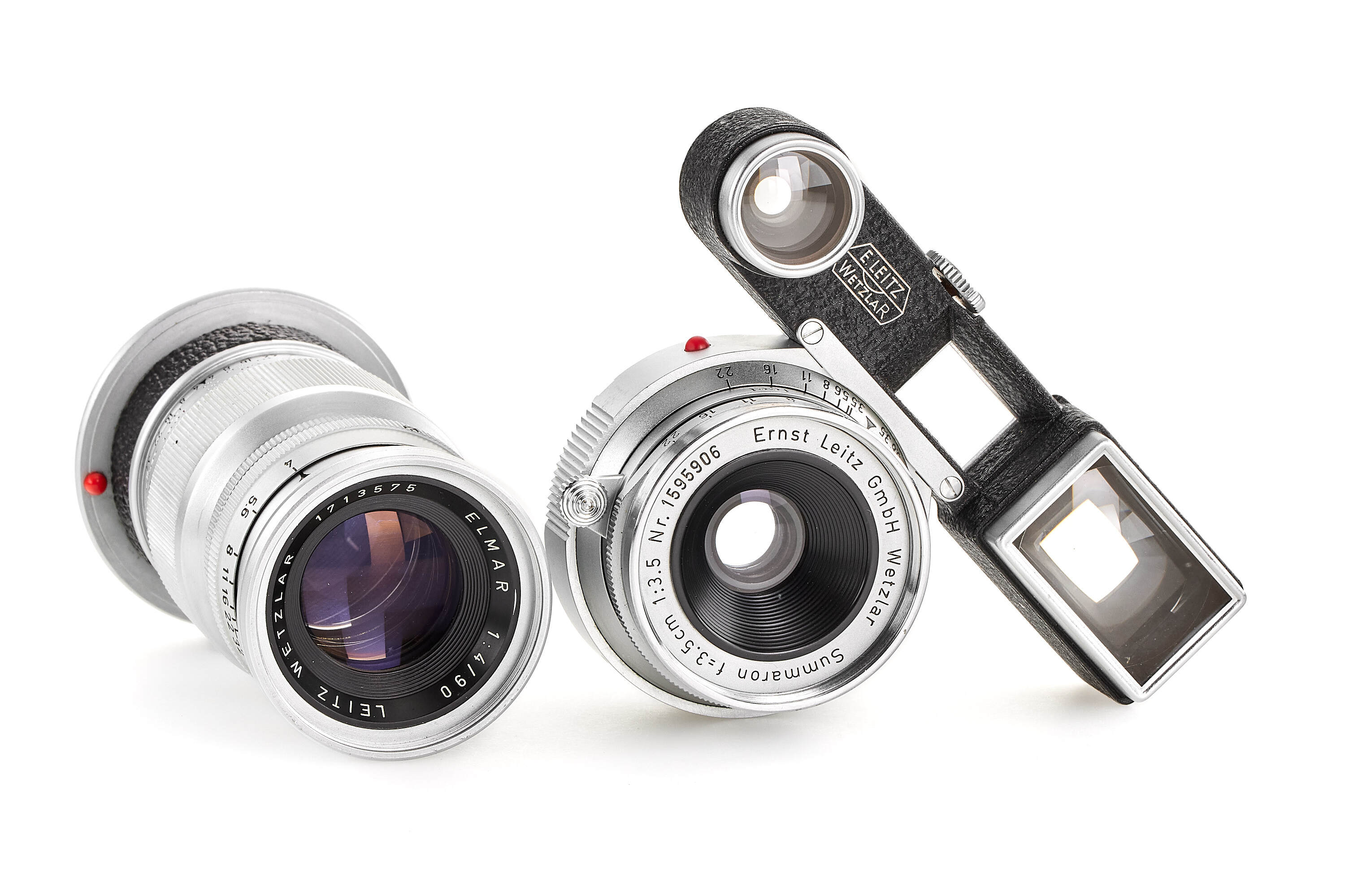 A very early Leica M3 showing all the original features, like the double stroke film advance, glass press-film, speed progression with 1/5th sec, etc., in almost mint condition, only showing a few light signs of use, note the back door with a very unusual 'made in Germany' engraving, with Summaron MW (with goggle for M3) 3.5/3.5cm no.1595906 feet scale with good optics only showing a few light cleaning marks (front lens cap), goggle showing traces of removed fungus, with matching early collapsible Summicron 2/5cm no.1155494 in feet scale, optics showing a few light cleaning marks and defects in the coatings, with UV filter (keeper and maker's box), IROOA hood (cap and maker's box) and front lens cap, Elmar 4/90mm no.1713575 (front lens cap), with leather strap and green outfit case (cond. B+), note the original English Royal Air Force tag.
