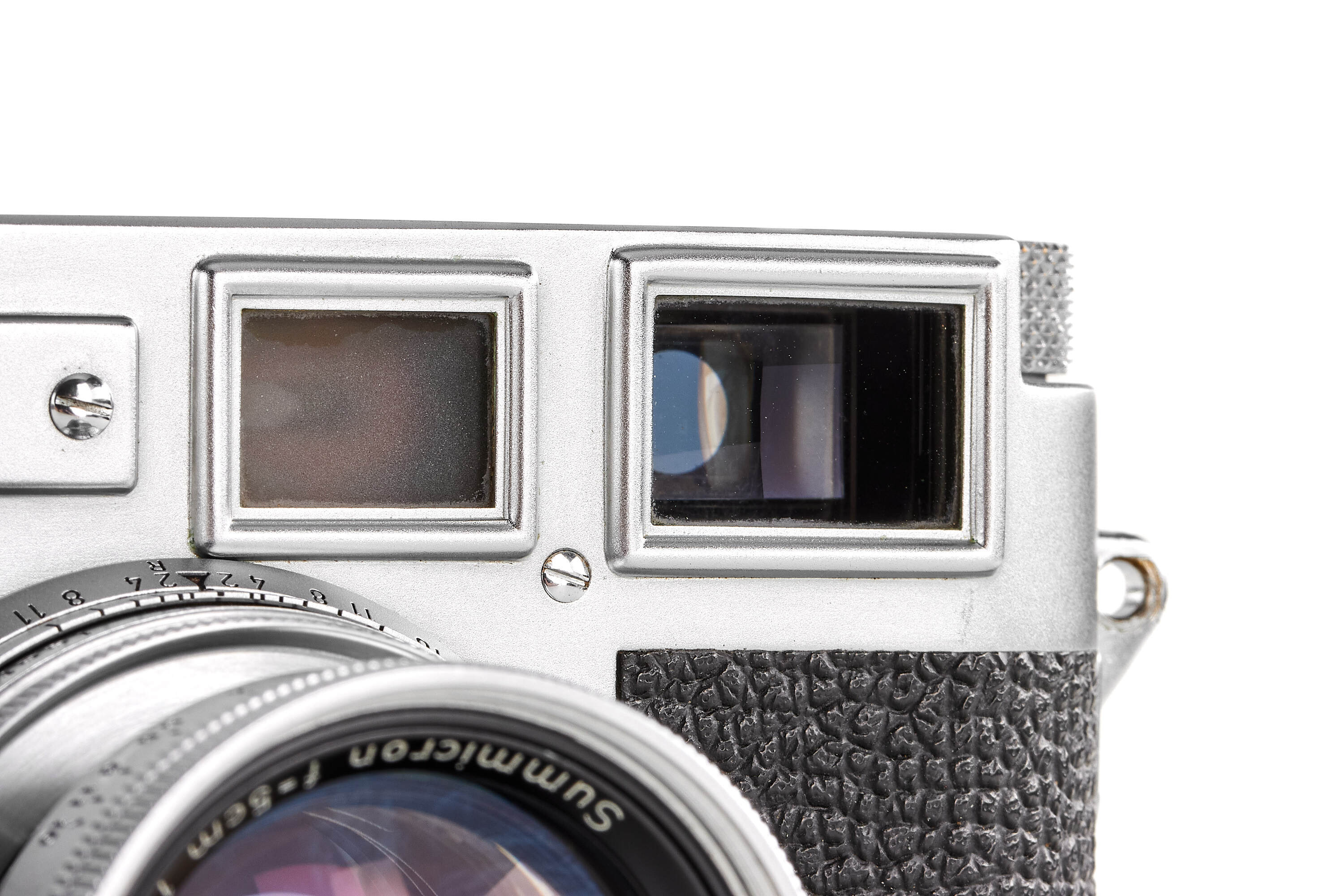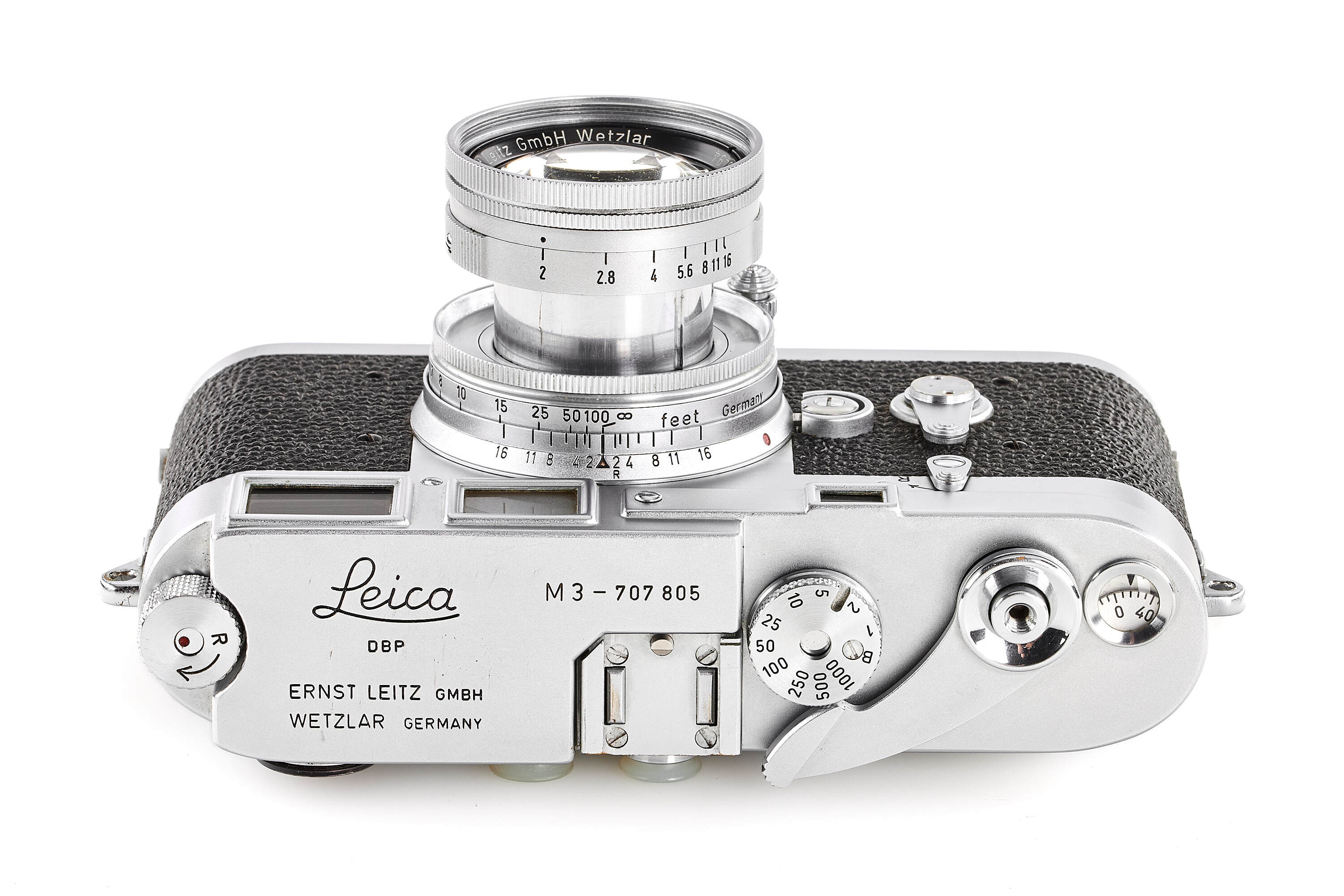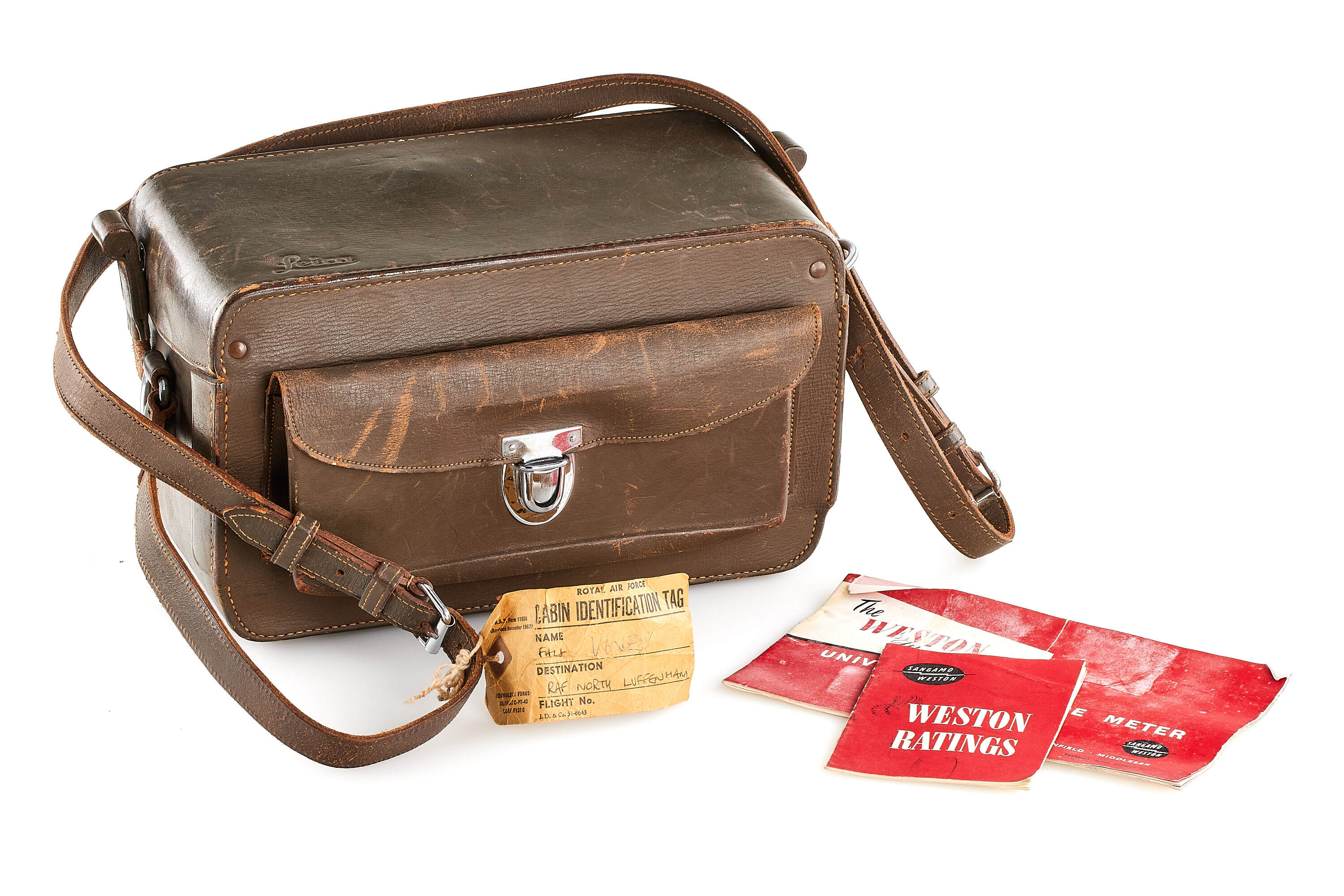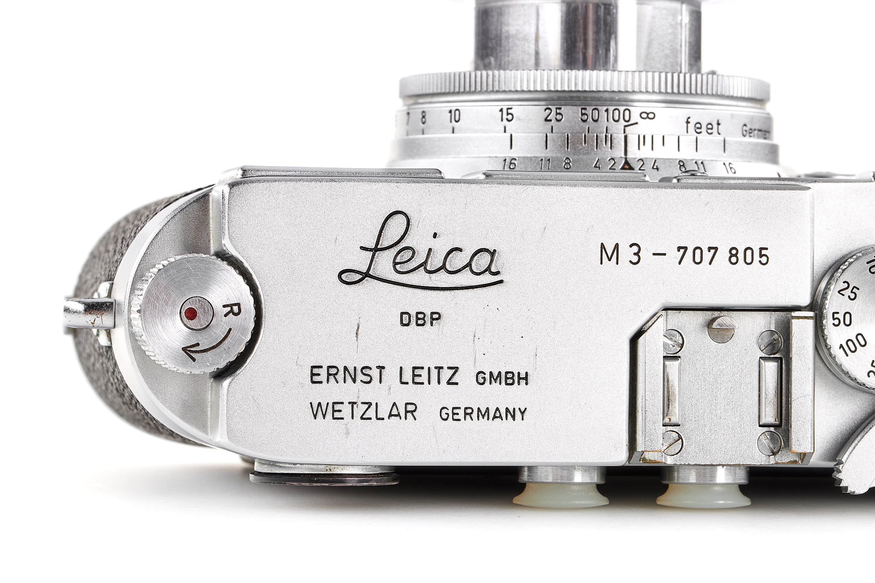 A very early Leica M3 showing all the original features, like the double stroke film advance, glass press-film, speed progression with 1/5th sec, etc., in almost mint condition, only showing a few light signs of use, note the back door with a very unusual 'made in Germany' engraving, with Summaron MW (with goggle for M3) 3.5/3.5cm no.1595906 feet scale with good optics only showing a few light cleaning marks (front lens cap), goggle showing traces of removed fungus, with matching early collapsible Summicron 2/5cm no.1155494 in feet scale, optics showing a few light cleaning marks and defects in the coatings, with UV filter (keeper and maker's box), IROOA hood (cap and maker's box) and front lens cap, Elmar 4/90mm no.1713575 (front lens cap), with leather strap and green outfit case (cond. B+), note the original English Royal Air Force tag.