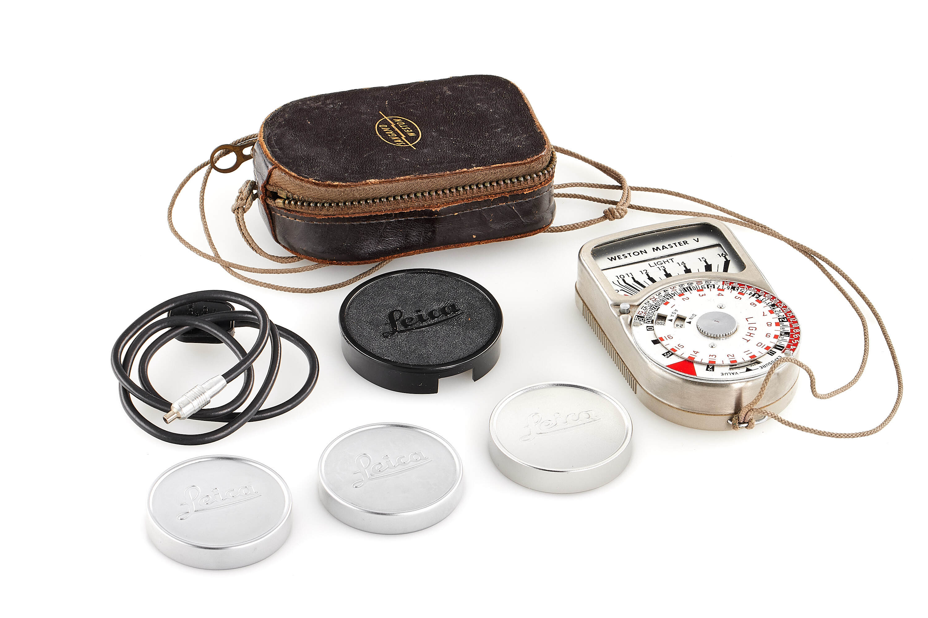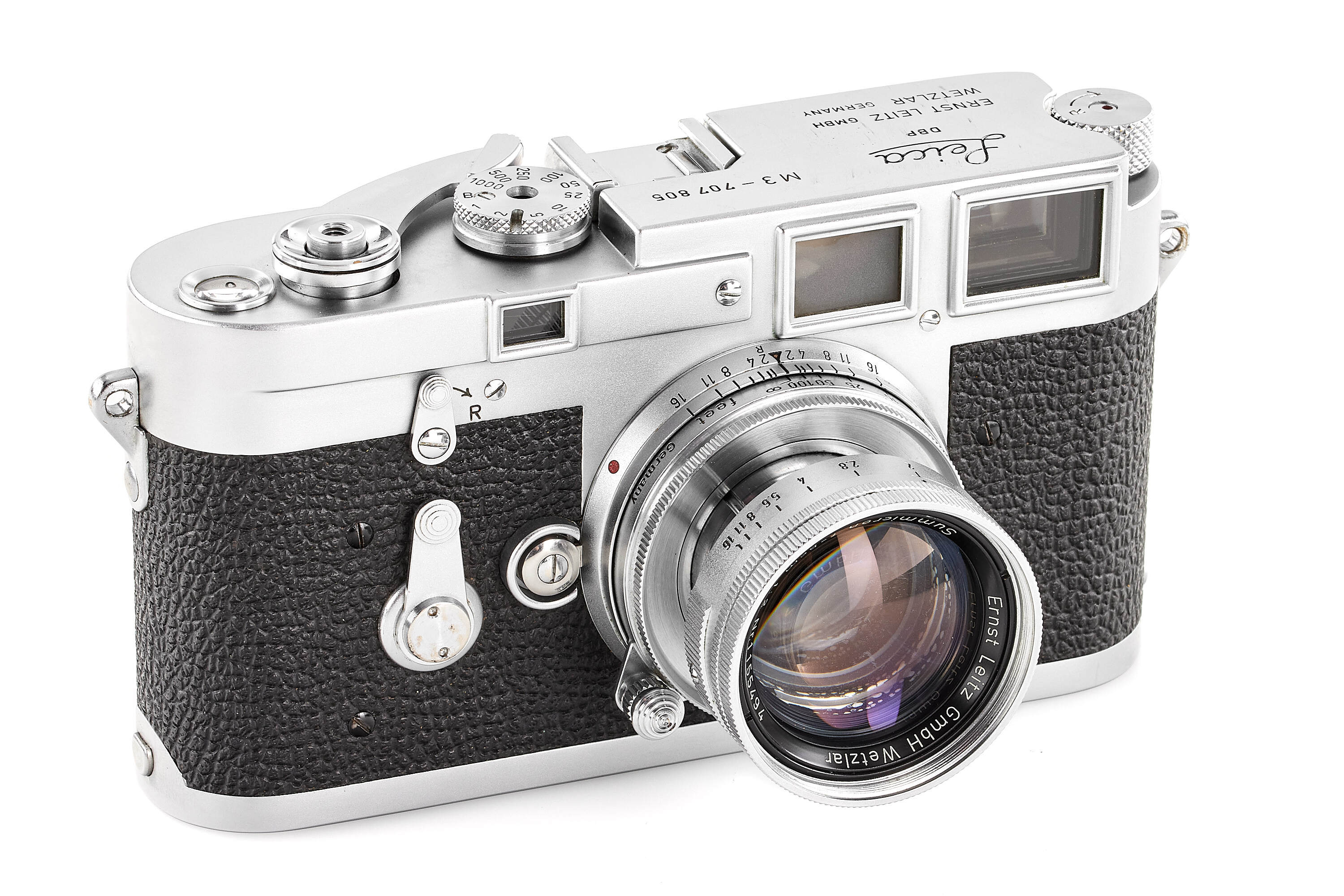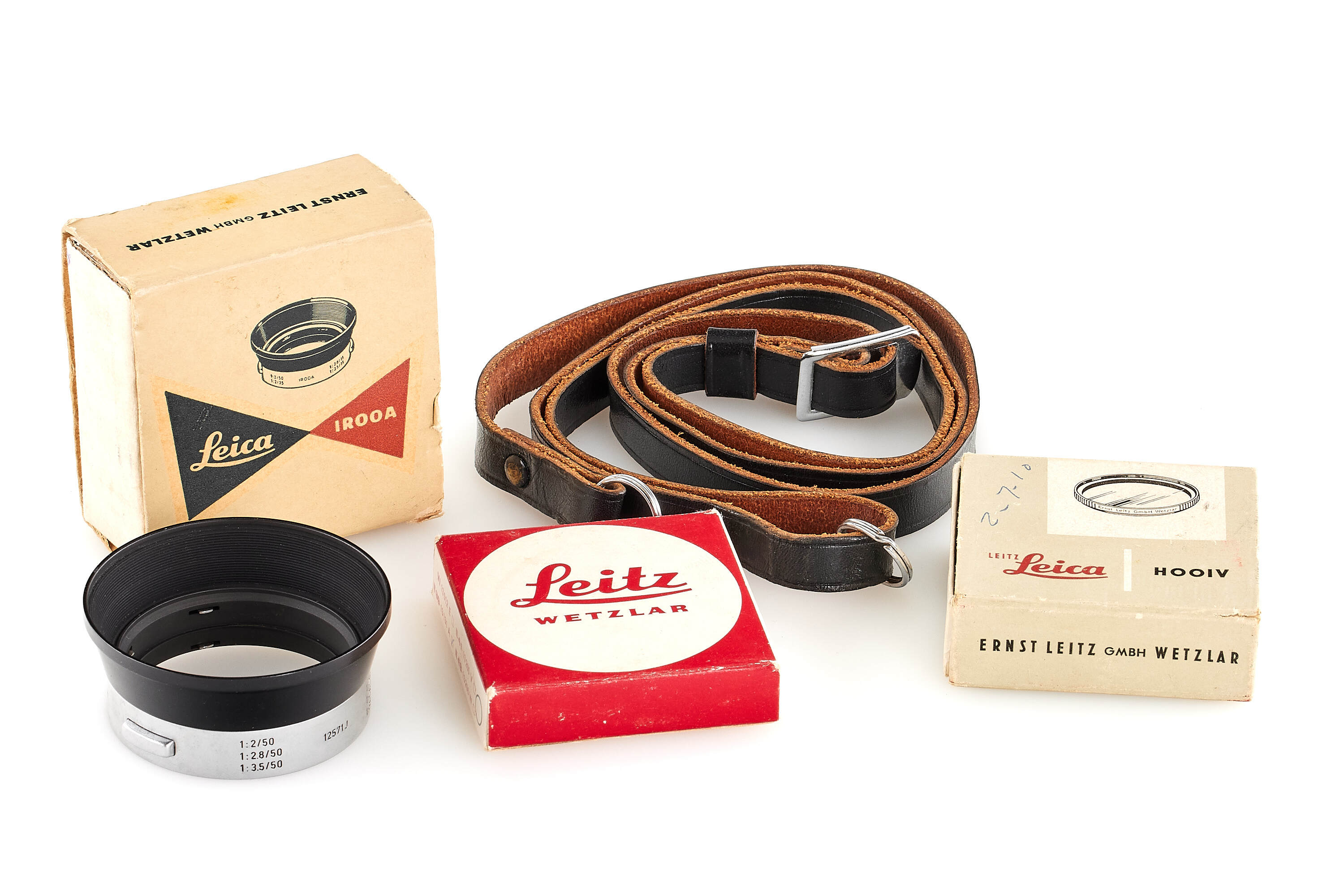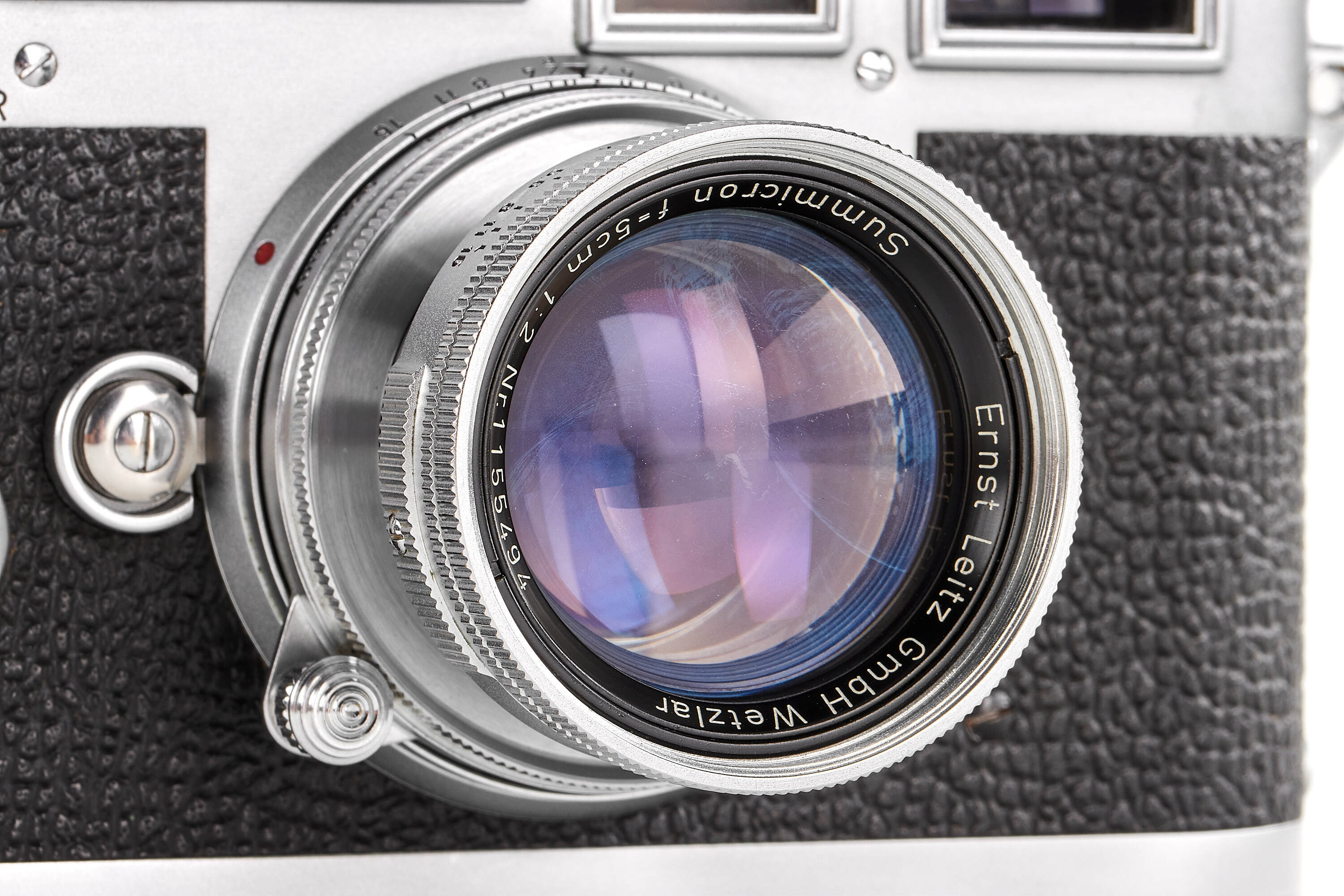 A very early Leica M3 showing all the original features, like the double stroke film advance, glass press-film, speed progression with 1/5th sec, etc., in almost mint condition, only showing a few light signs of use, note the back door with a very unusual 'made in Germany' engraving, with Summaron MW (with goggle for M3) 3.5/3.5cm no.1595906 feet scale with good optics only showing a few light cleaning marks (front lens cap), goggle showing traces of removed fungus, with matching early collapsible Summicron 2/5cm no.1155494 in feet scale, optics showing a few light cleaning marks and defects in the coatings, with UV filter (keeper and maker's box), IROOA hood (cap and maker's box) and front lens cap, Elmar 4/90mm no.1713575 (front lens cap), with leather strap and green outfit case (cond. B+), note the original English Royal Air Force tag.