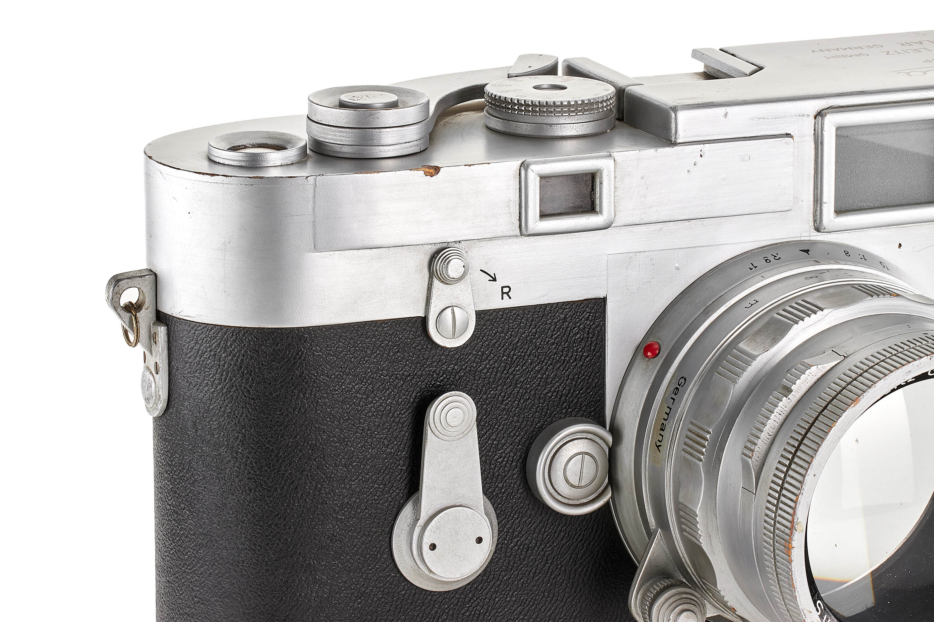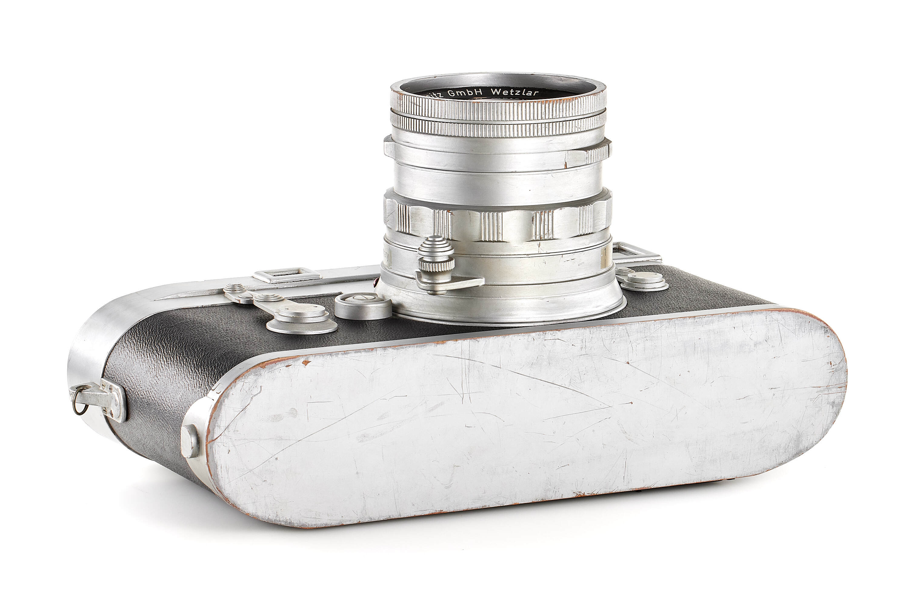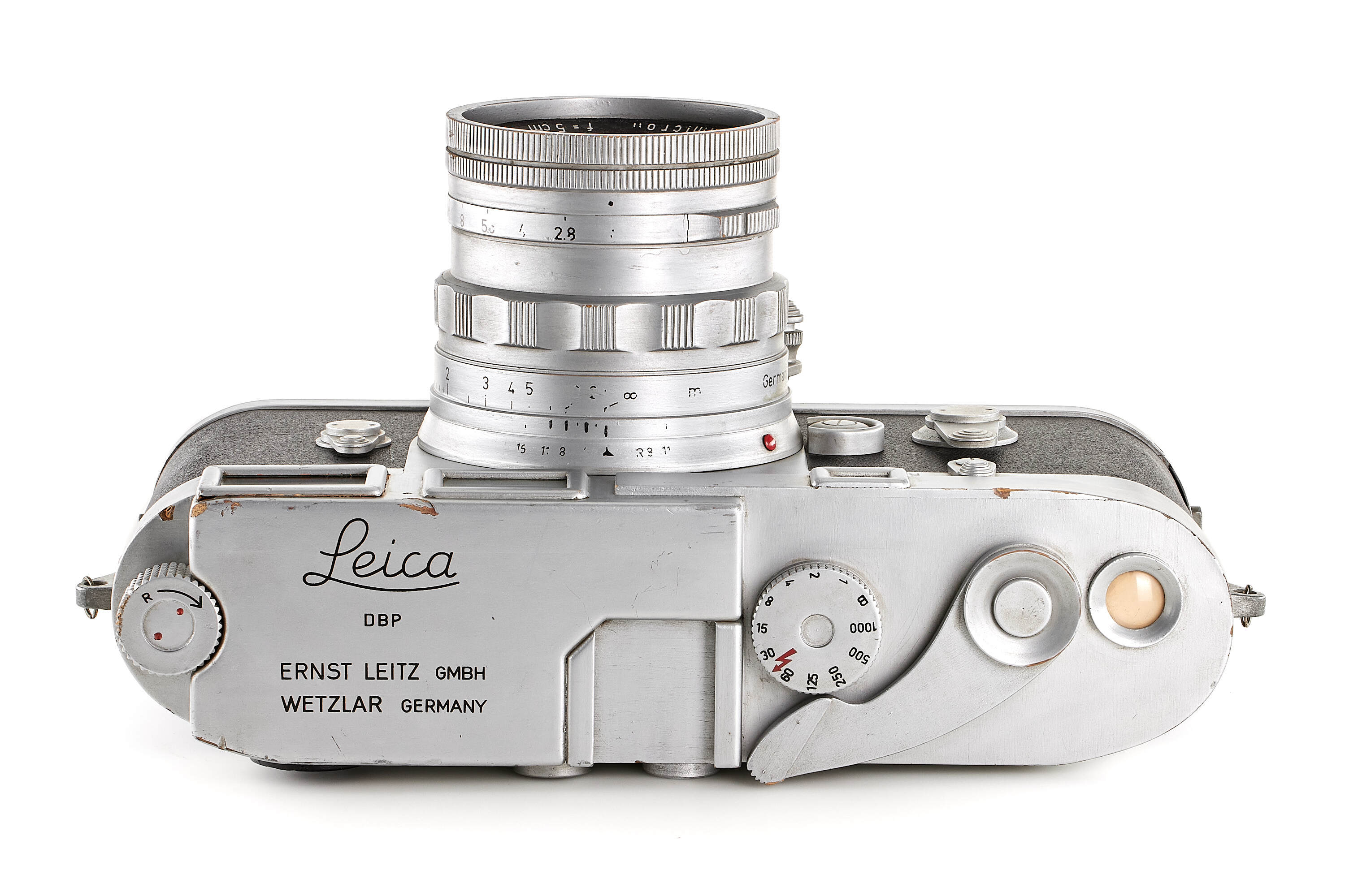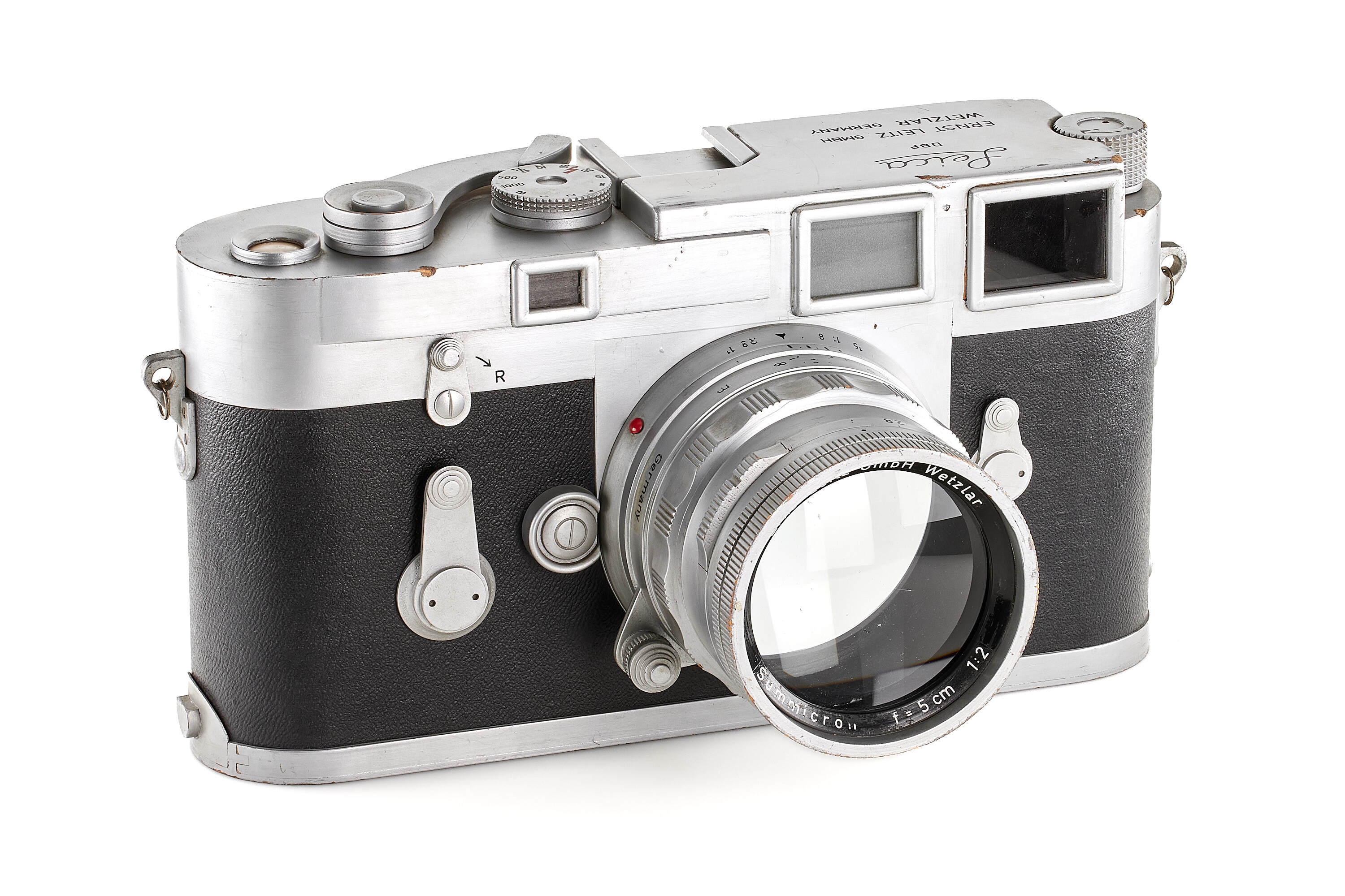 Very rare and attractive original giant display model of a chrome Leica M3 without serial number, transitional version with frame selector, early strap lugs and later speed progression, together with unnumbered rigid Summicron 2/5cm, meter scale, in good condition, ca. 61 x 31 x 32 cm, giant wooden display models of Leica cameras were occasionally officially produced by Leitz since approximately the late 1920s. Examples of Leica camera models IA (A), III (F), IIIf as well as M3 have been reported. Furthermore, several custom-made giant models exist, but the original versions are exceedingly rare. Of the Leica M3 giant models, there even are a number of variations, made at different moments during the long production period of the M3. The first original giant display model of the Leica M3 was made for presentation of the then new camera in April 1954 at Photokina in Cologne.
