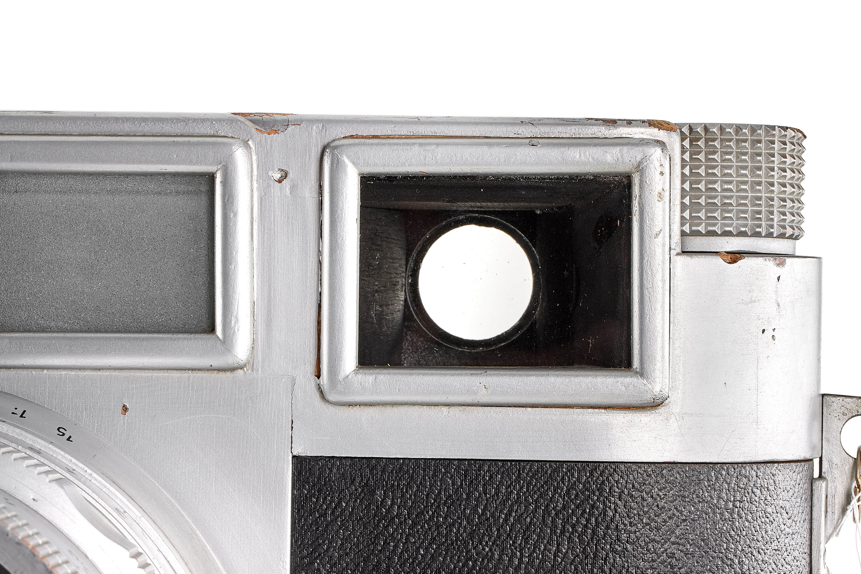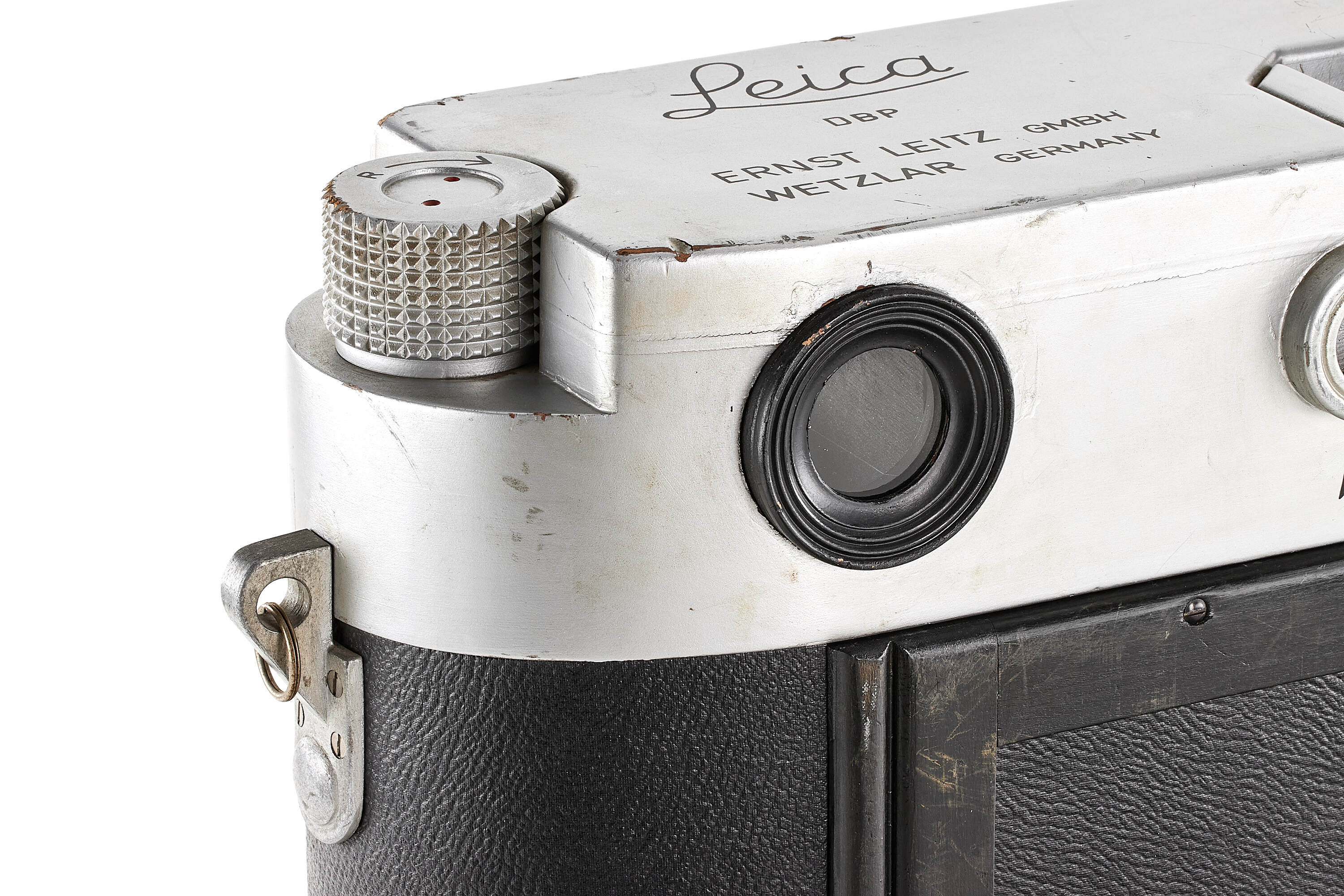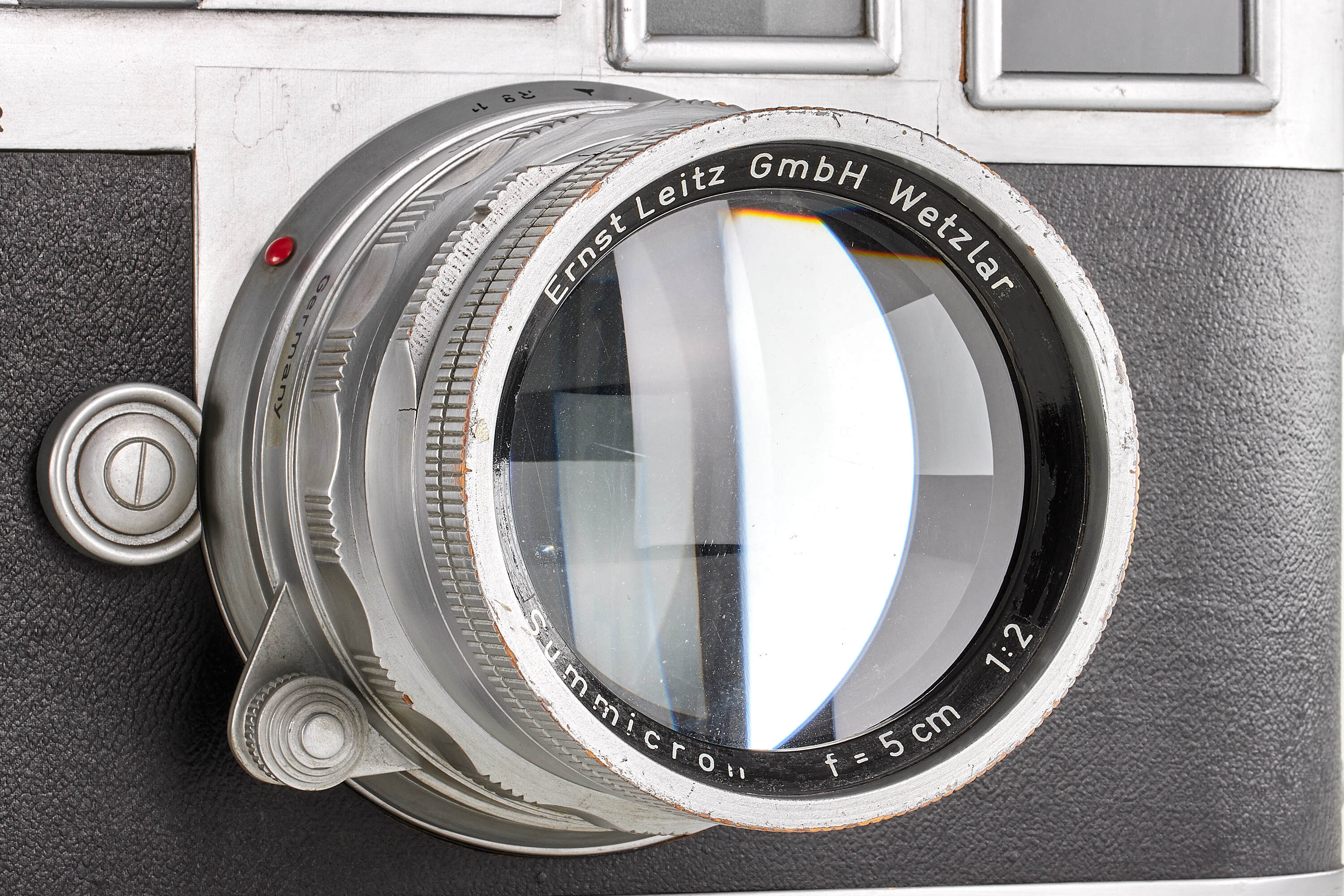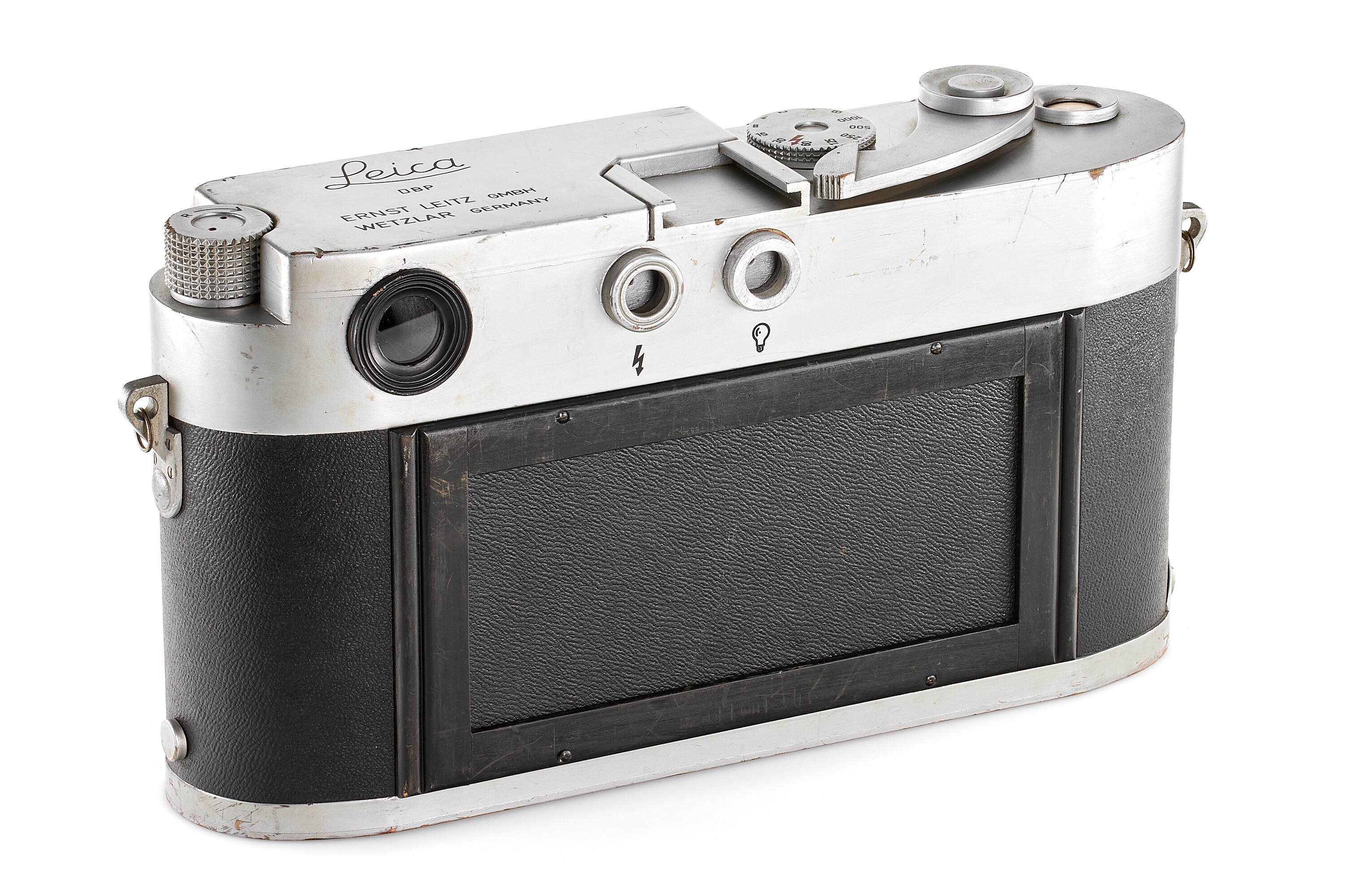 Very rare and attractive original giant display model of a chrome Leica M3 without serial number, transitional version with frame selector, early strap lugs and later speed progression, together with unnumbered rigid Summicron 2/5cm, meter scale, in good condition, ca. 61 x 31 x 32 cm, giant wooden display models of Leica cameras were occasionally officially produced by Leitz since approximately the late 1920s. Examples of Leica camera models IA (A), III (F), IIIf as well as M3 have been reported. Furthermore, several custom-made giant models exist, but the original versions are exceedingly rare. Of the Leica M3 giant models, there even are a number of variations, made at different moments during the long production period of the M3. The first original giant display model of the Leica M3 was made for presentation of the then new camera in April 1954 at Photokina in Cologne.