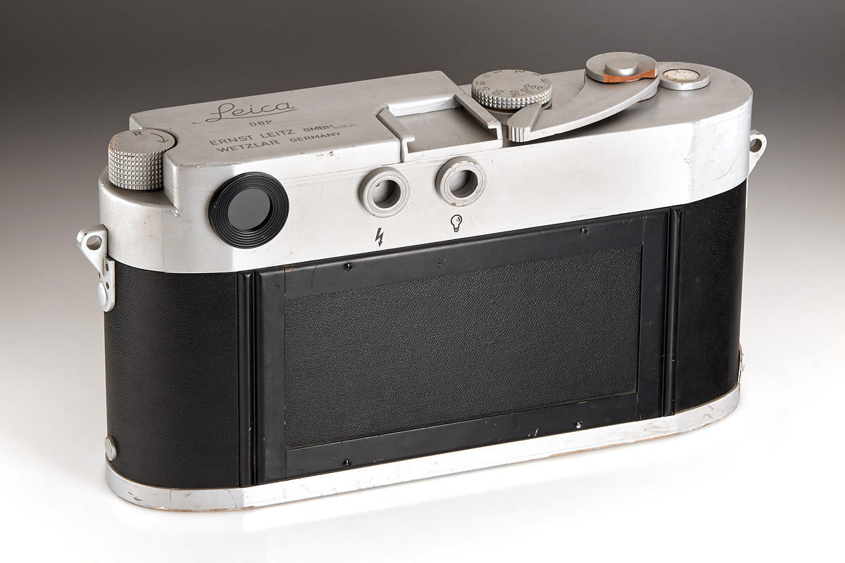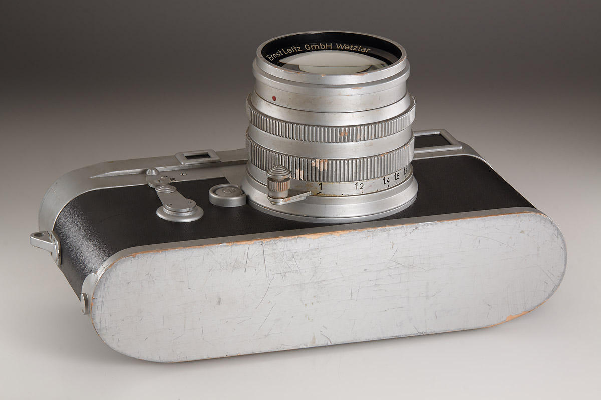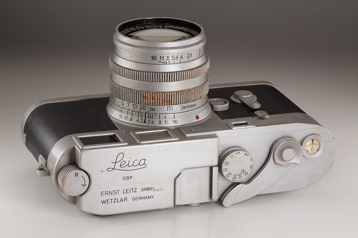 First version original giant display model of Leica M3 with corner in top plate, with 5cm Summarit f/1.5 no. 000000. Very rare and attractive. LITERATURE James L. Lager (ed.), Leica Illustrated History, Vol. III, 1998, p. 321 Giant wooden display models of Leica cameras were occasionally officially produced by Leitz since approximately the late 1920s. Examples of Leica camera models IA (A), III (F), IIIf as well as M3 have been reported. Furthermore, several custom-made giant models exist, but the original versions are exceedingly rare. Of the Leica M3 giant models, there even are a number of variations, made at different moments during the long production period of the M3. The first original giant display model of the Leica M3 was made for presentation of the camera in April 1954 at Photokina in Cologne.