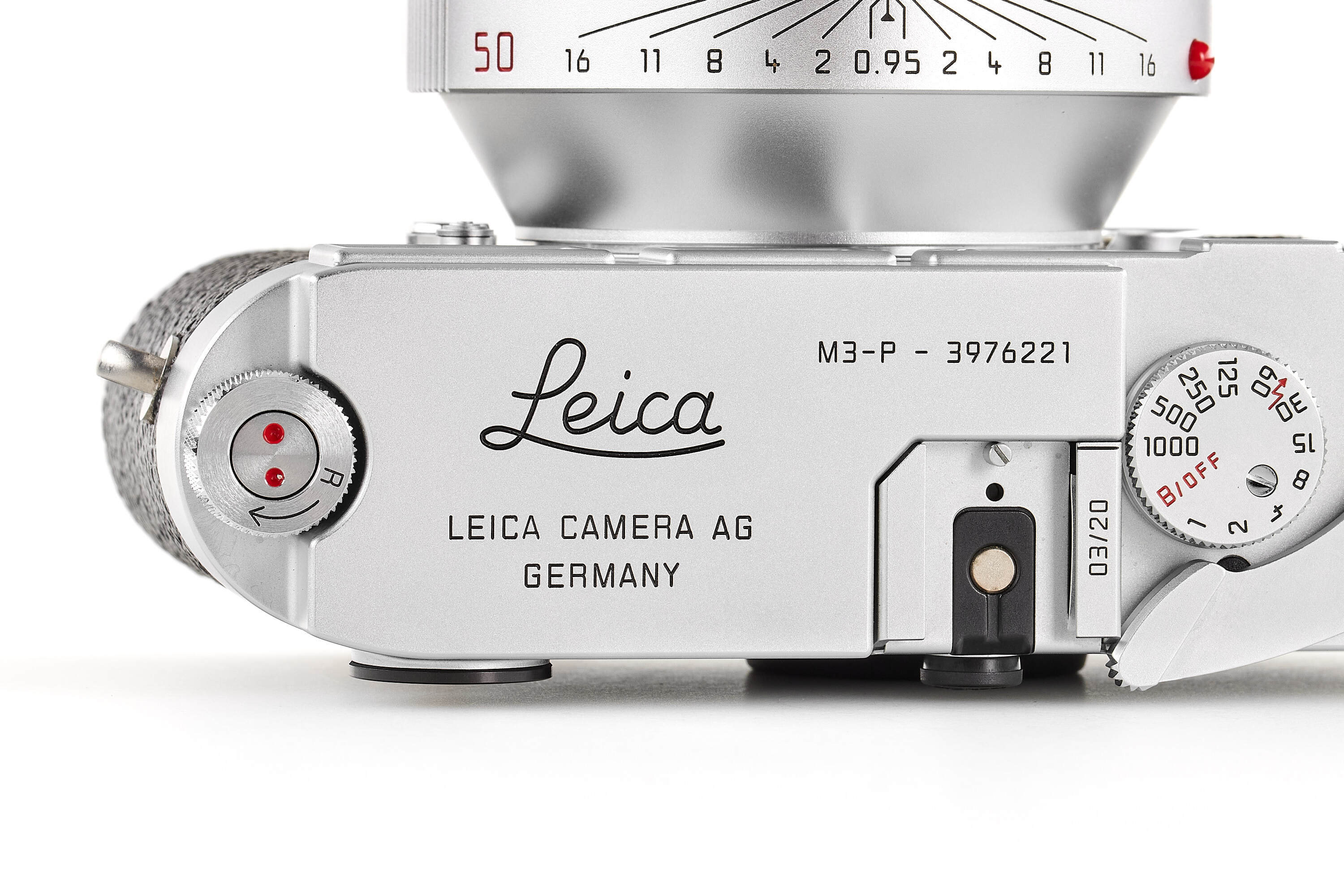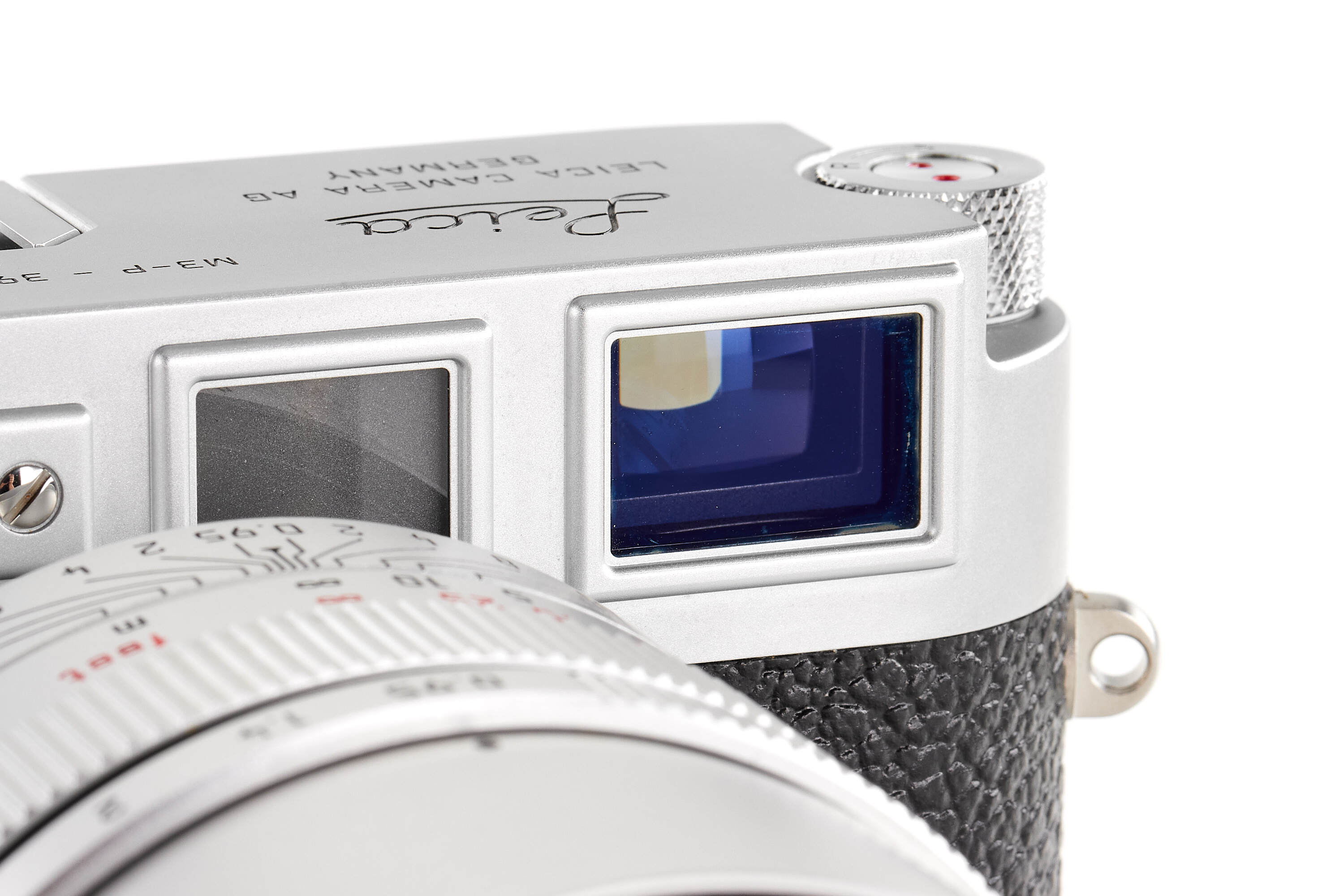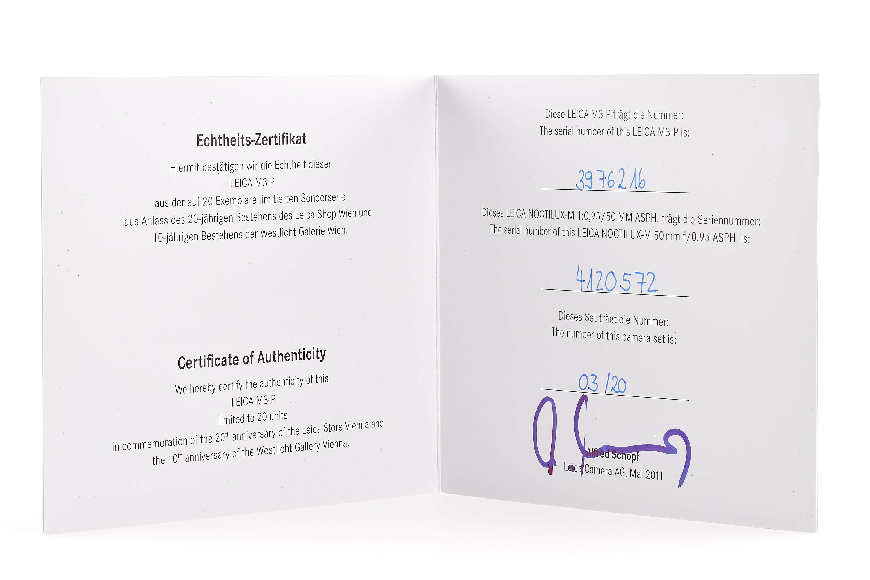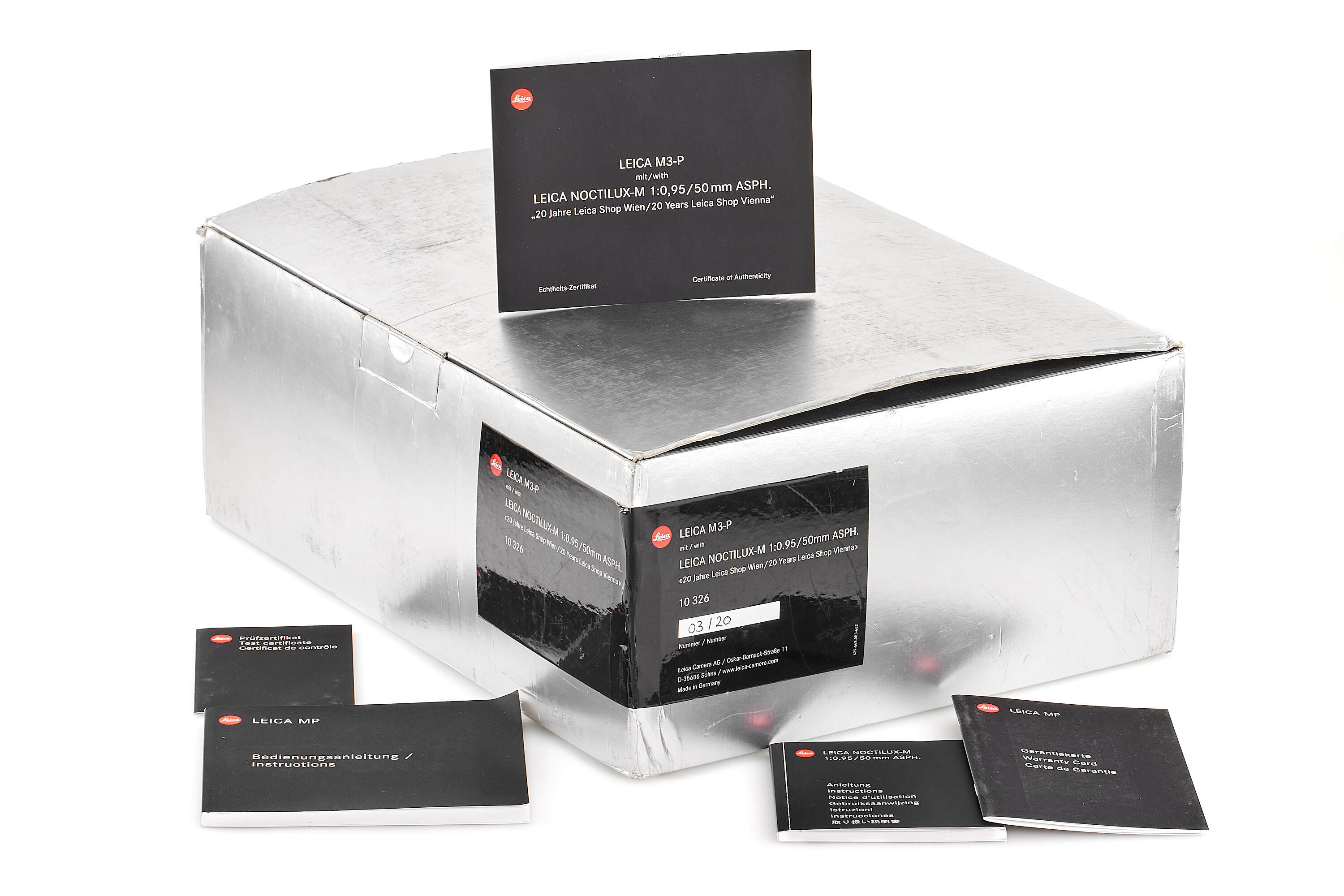 Special Edition film camera M3-P, commemorating the 20th anniversary of the Leica Shop Vienna. Only 20 sets were produced; this example is no. 03/20, with body serial number 3976221.