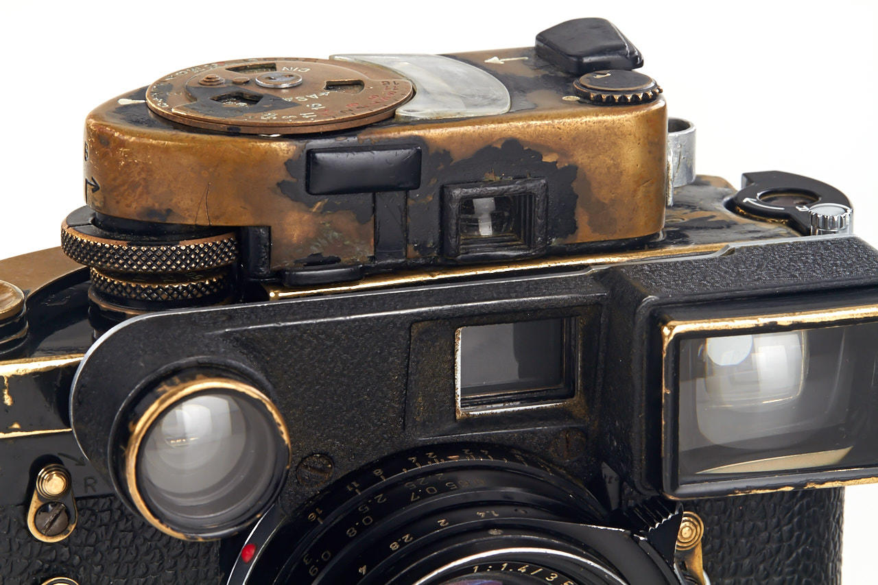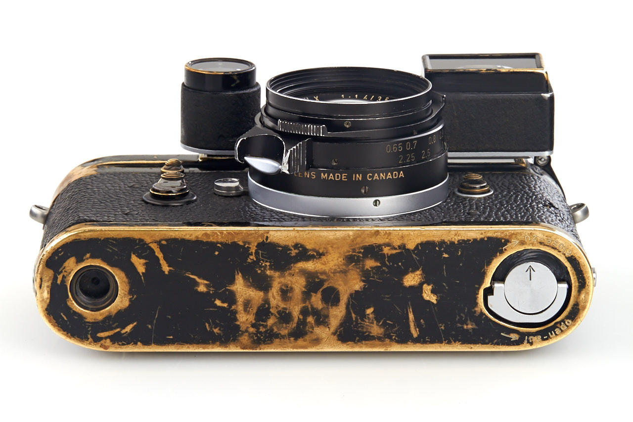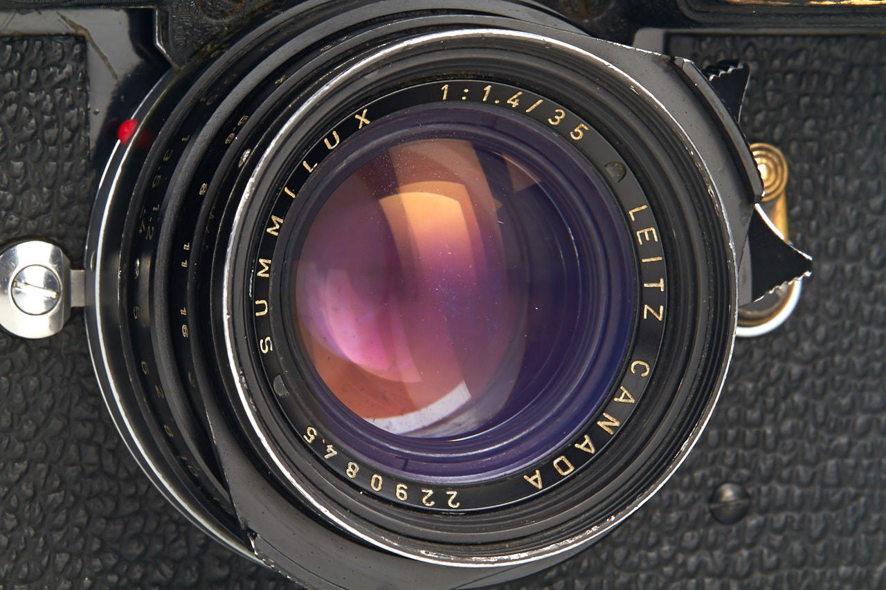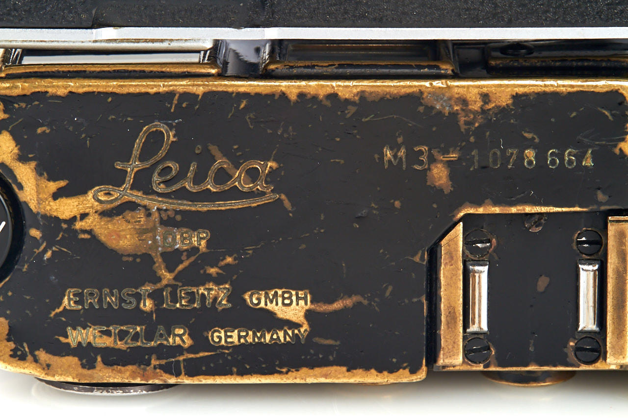 fully original black paint camera with patina of professional use, still in perfect working order, with matching black M3 Summilux 1.4/35mm no.2290845 (cond. B-, minimal cleaning marks, 12504 hood, cap), modern MP rewind lever and black paint Leicameter MR - the outfit has been used by the late Swiss photographer Andre Muelhaupt, who took his famous photograph of Jean-Paul Sartre in the Café Flor in Paris in January 1973 with this camera !