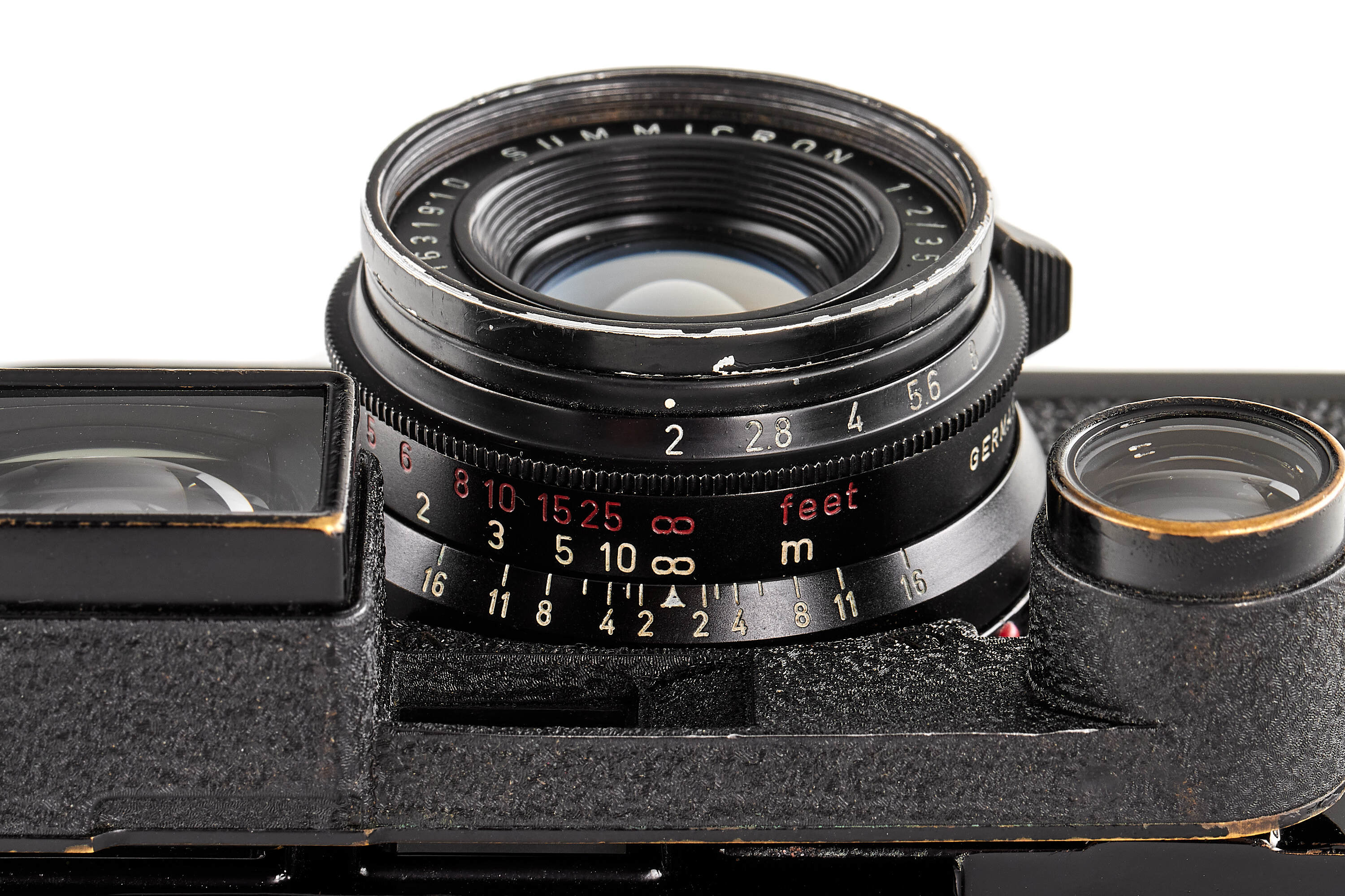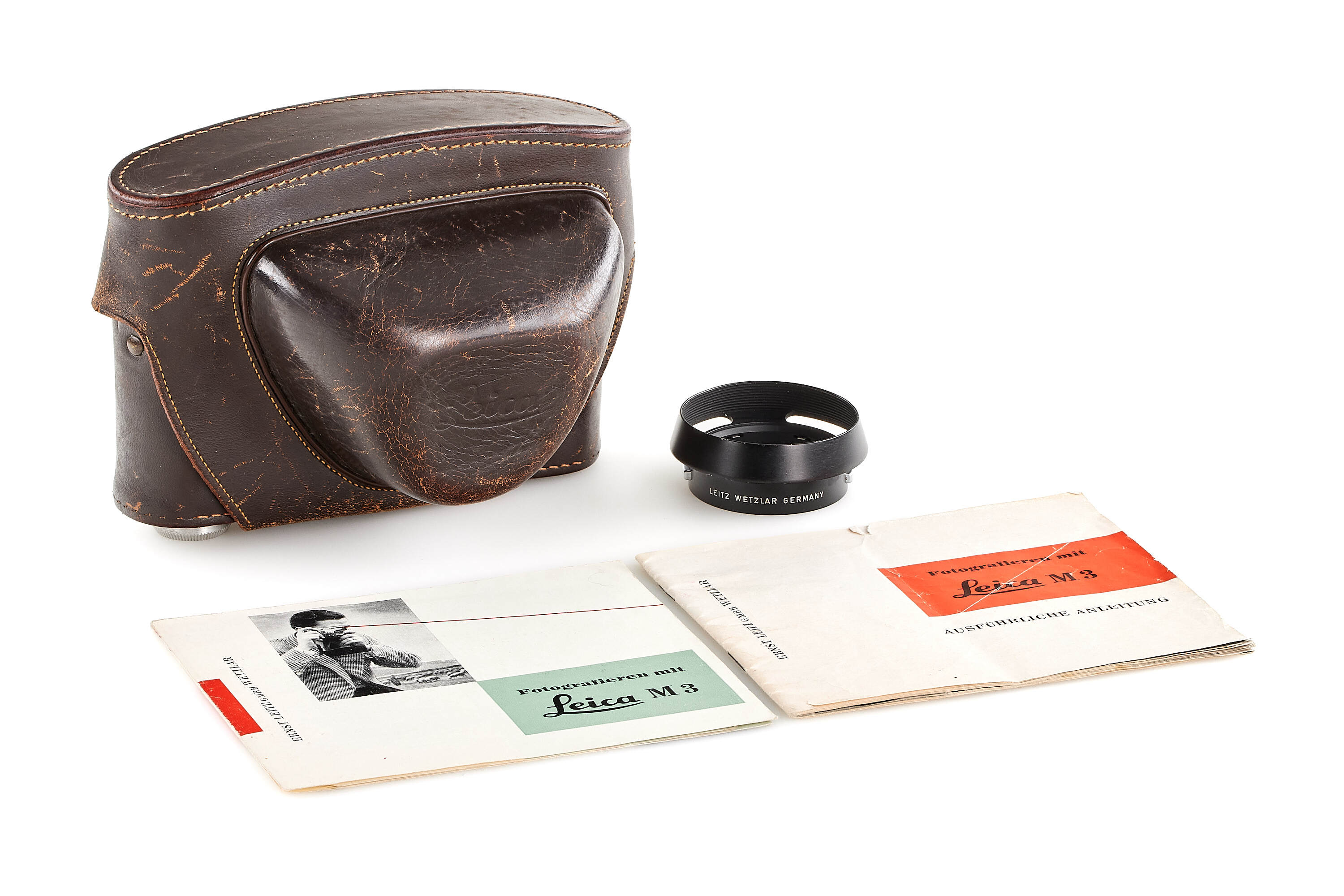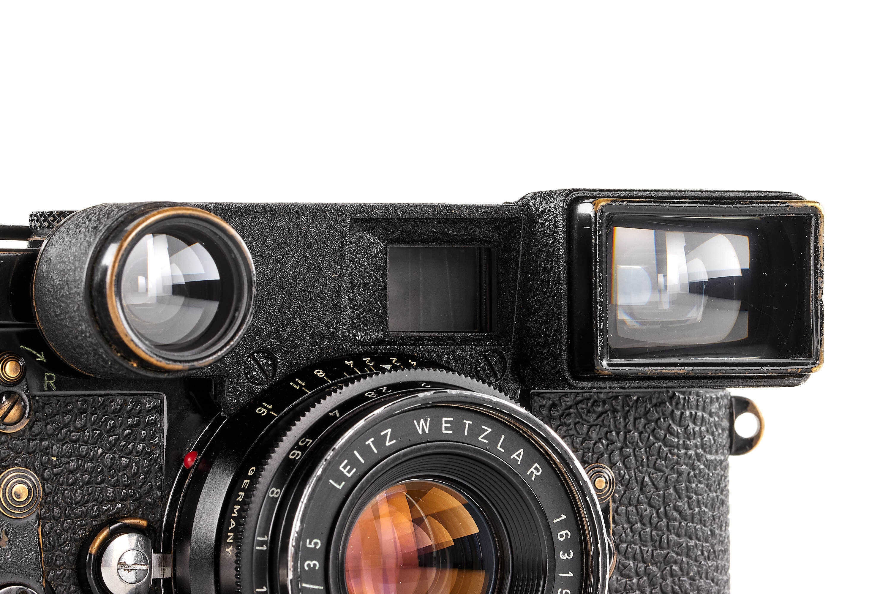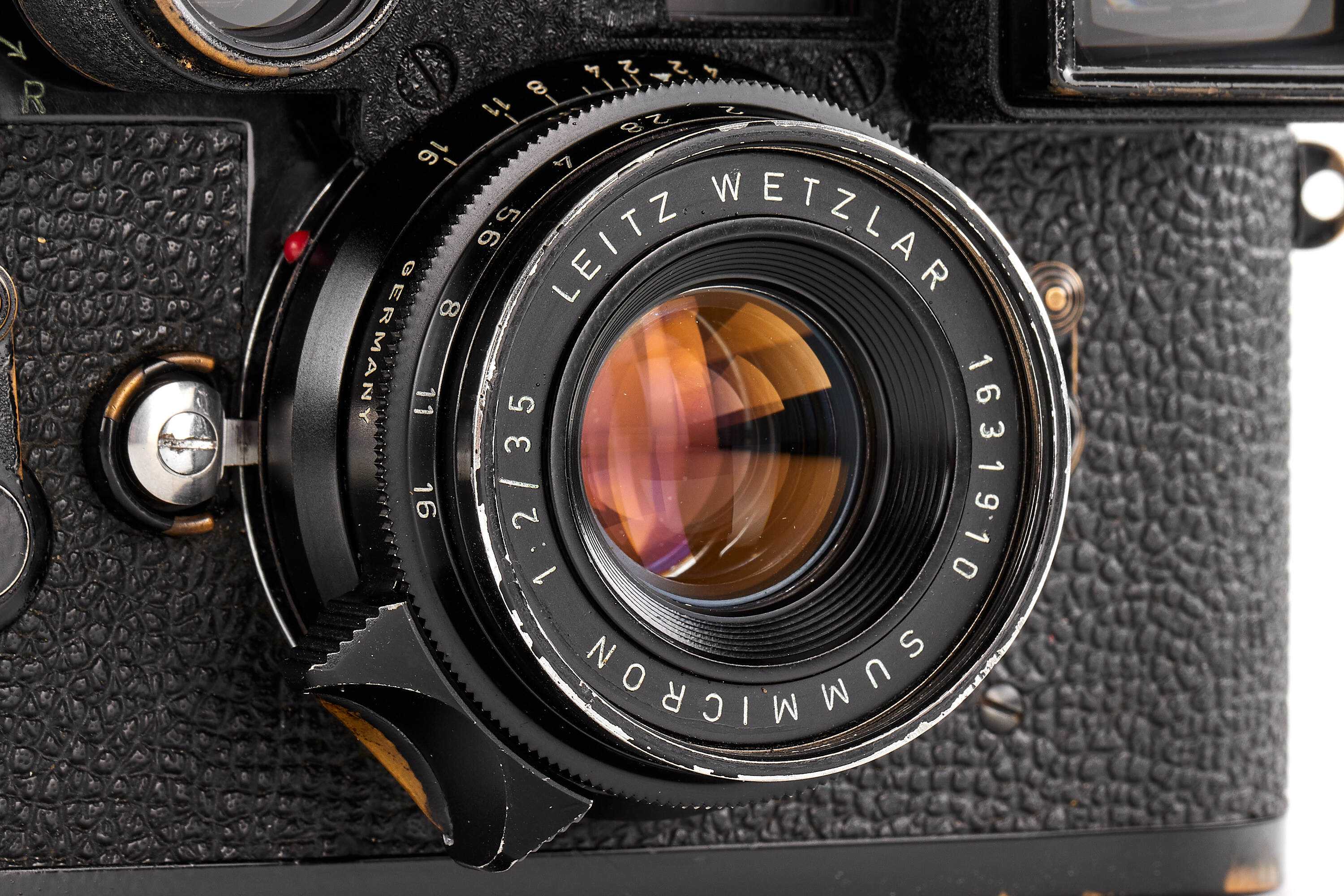 An original M3 black paint from an official batch of 150 cameras issued in 1962, in good condition with a nice patina, a dent on the right side, with sought-after matching black paint Summicron 2/35mm 8-element #1631910, optics showing a few light cleaning marks, both delivered to German Leica retailer Süss in April and May 1963, with hood 12585, eveready case and German instructions.