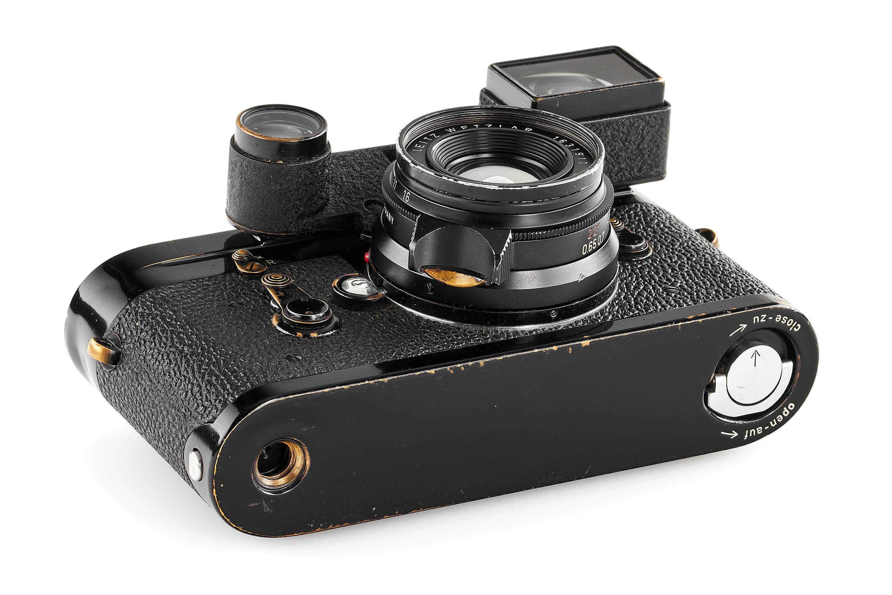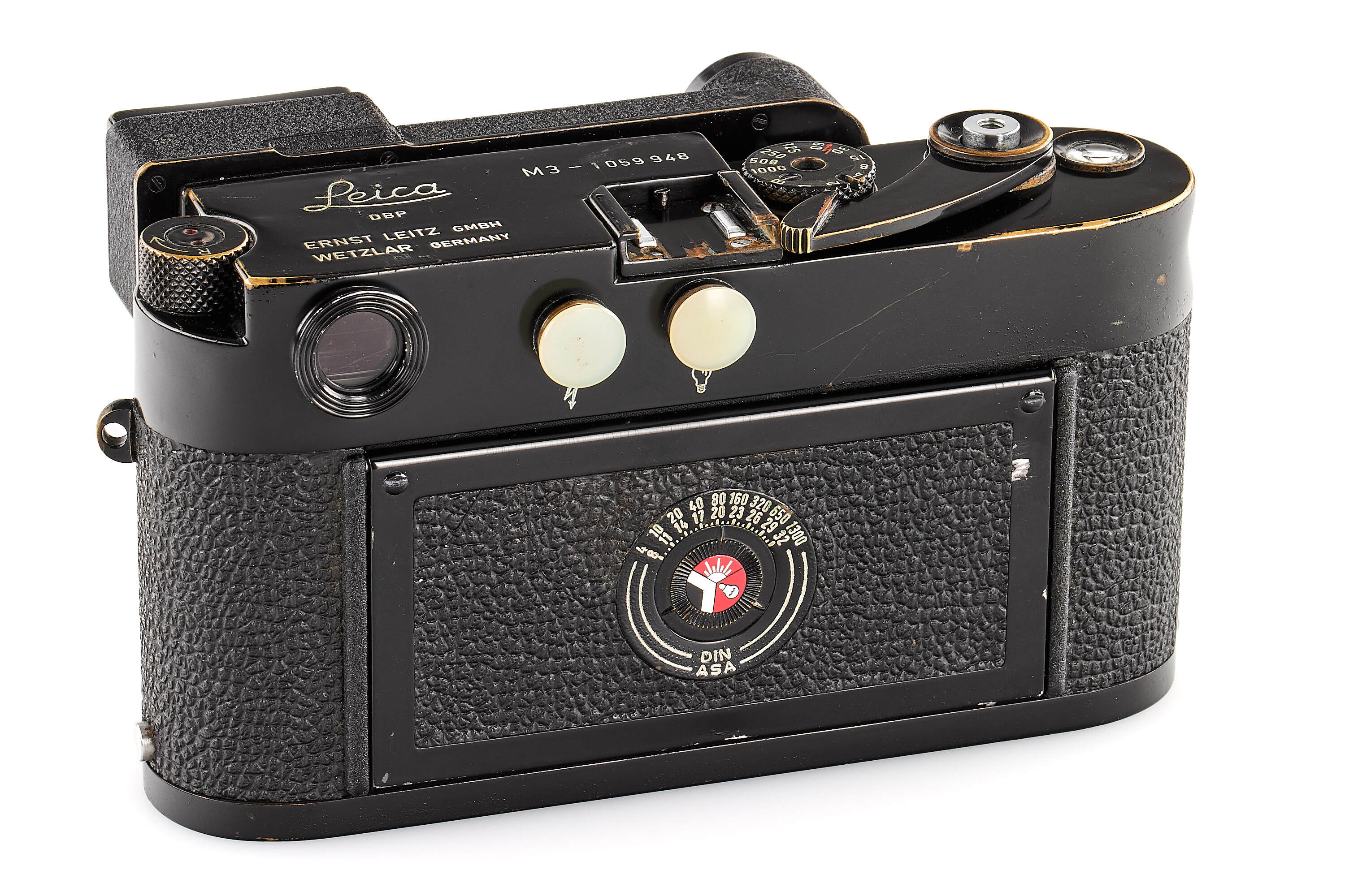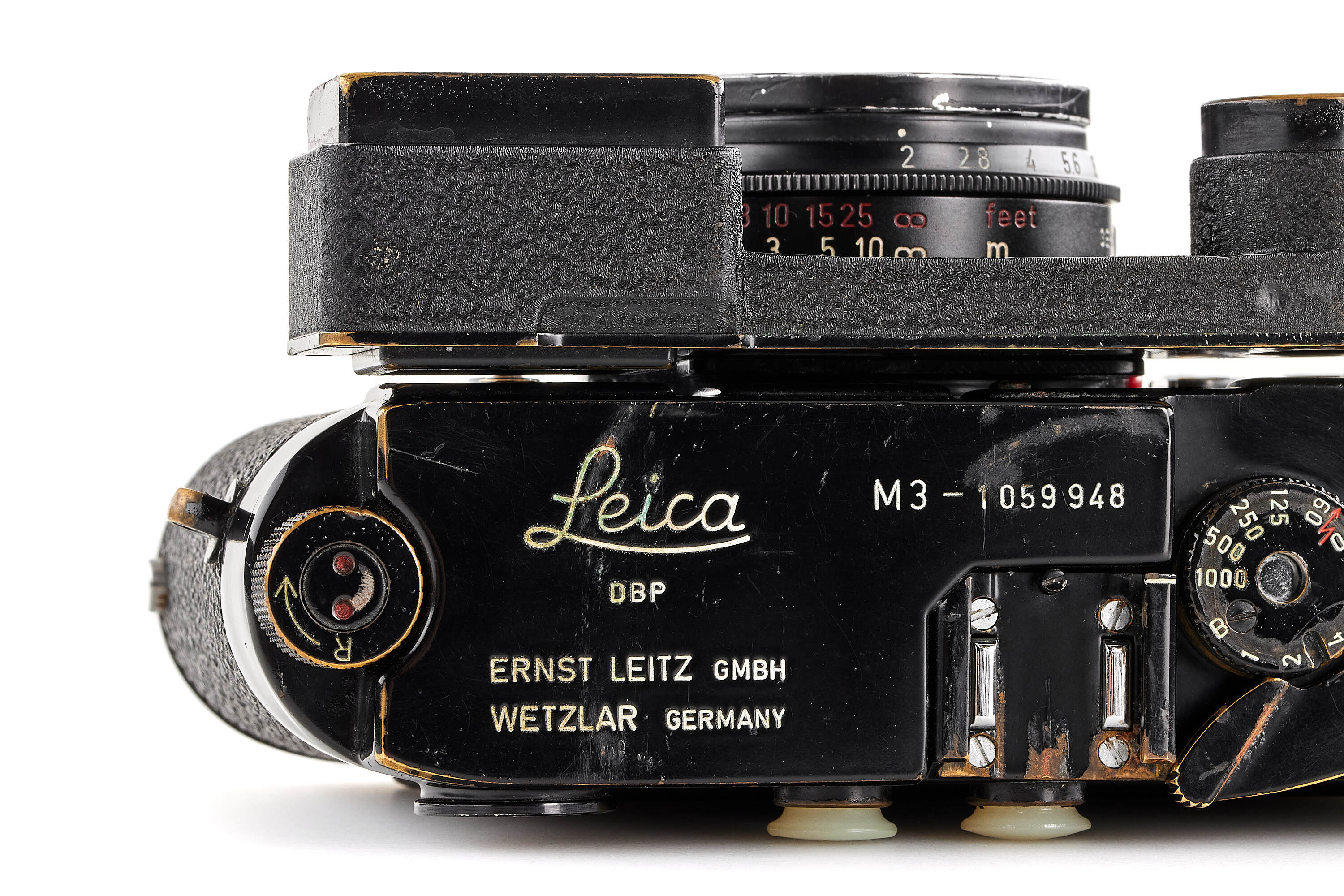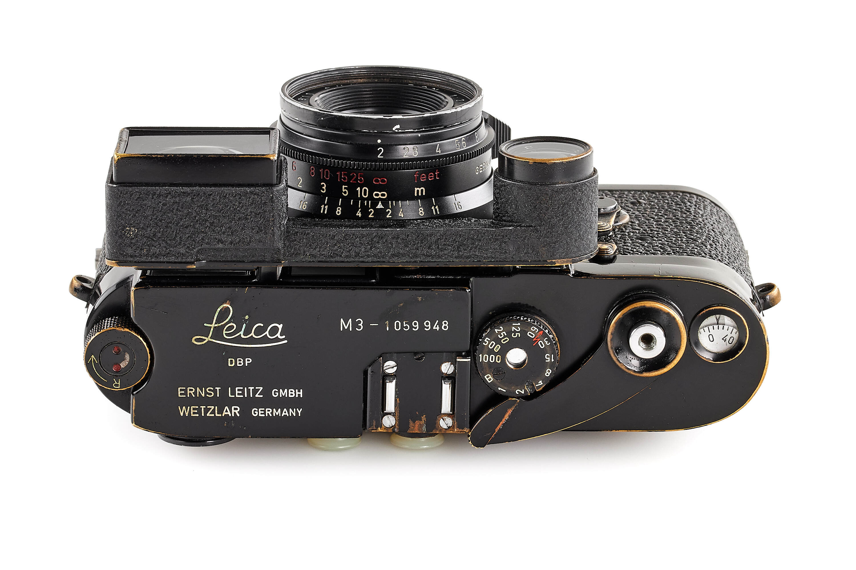 An original M3 black paint from an official batch of 150 cameras issued in 1962, in good condition with a nice patina, a dent on the right side, with sought-after matching black paint Summicron 2/35mm 8-element #1631910, optics showing a few light cleaning marks, both delivered to German Leica retailer Süss in April and May 1963, with hood 12585, eveready case and German instructions.