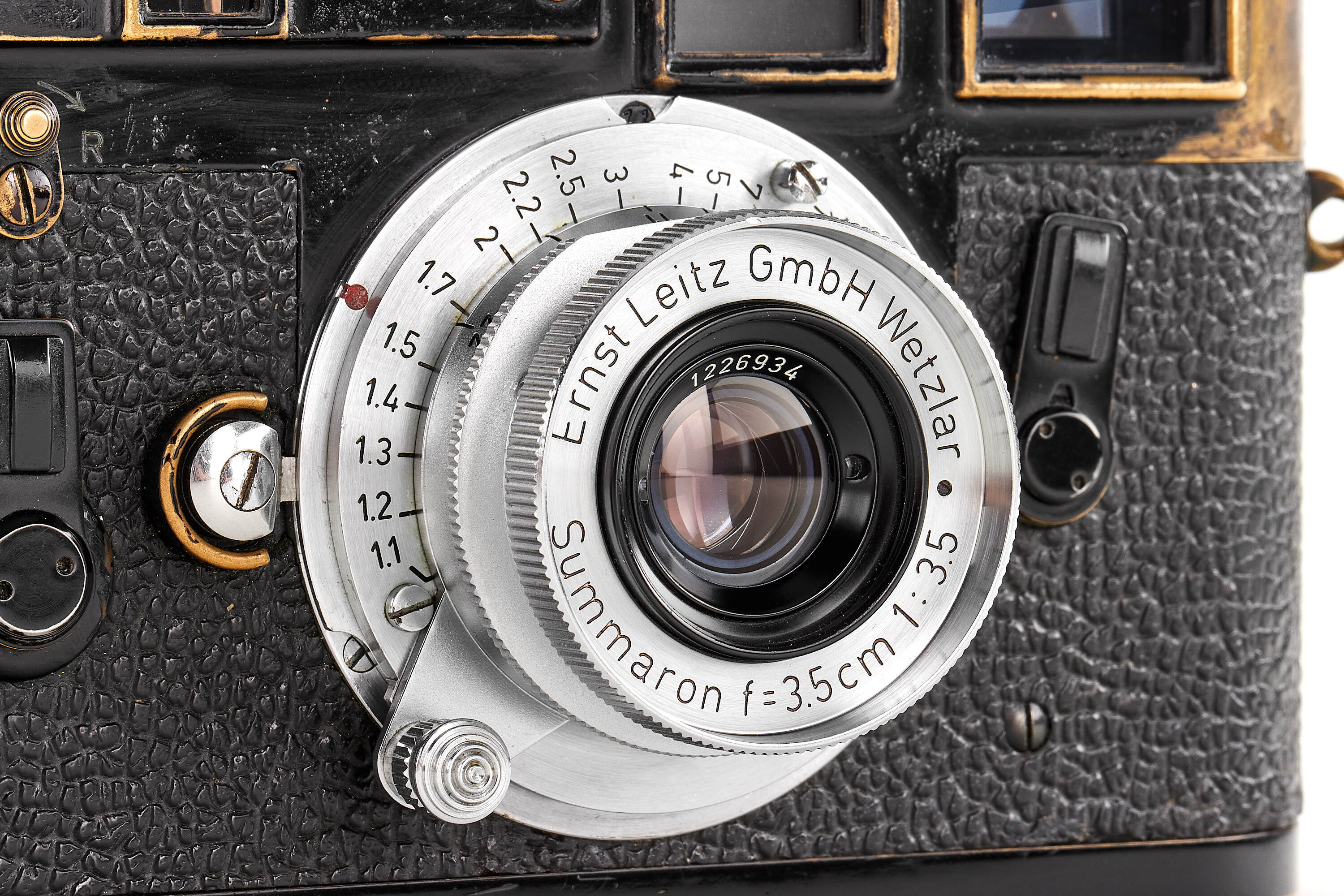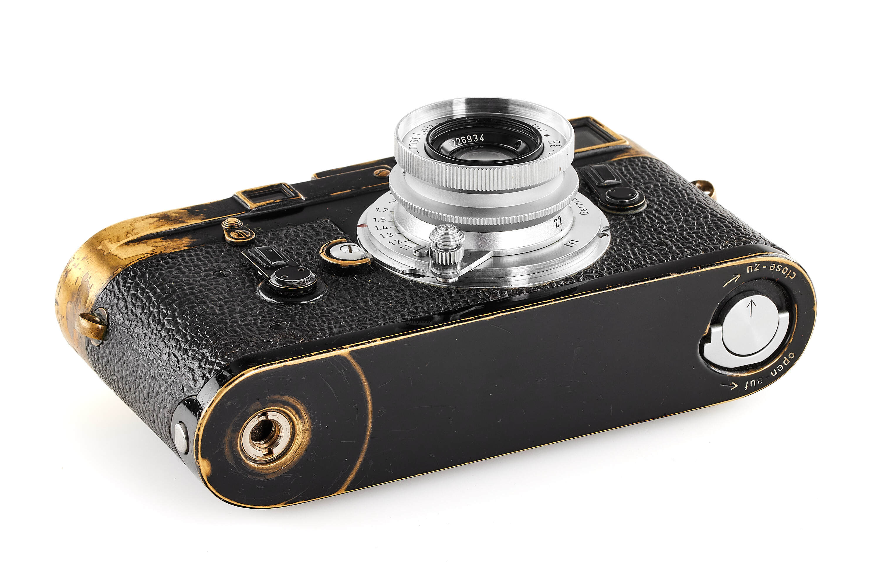 An original Leica M3 black paint with a patina of years of professional use, later self-timer lever and preview lever, with M39 Summaron 3.5/3.5cm no.1226934 with M-adapter. The camera comes from an official batch of 200 black paint cameras issued in 1961.