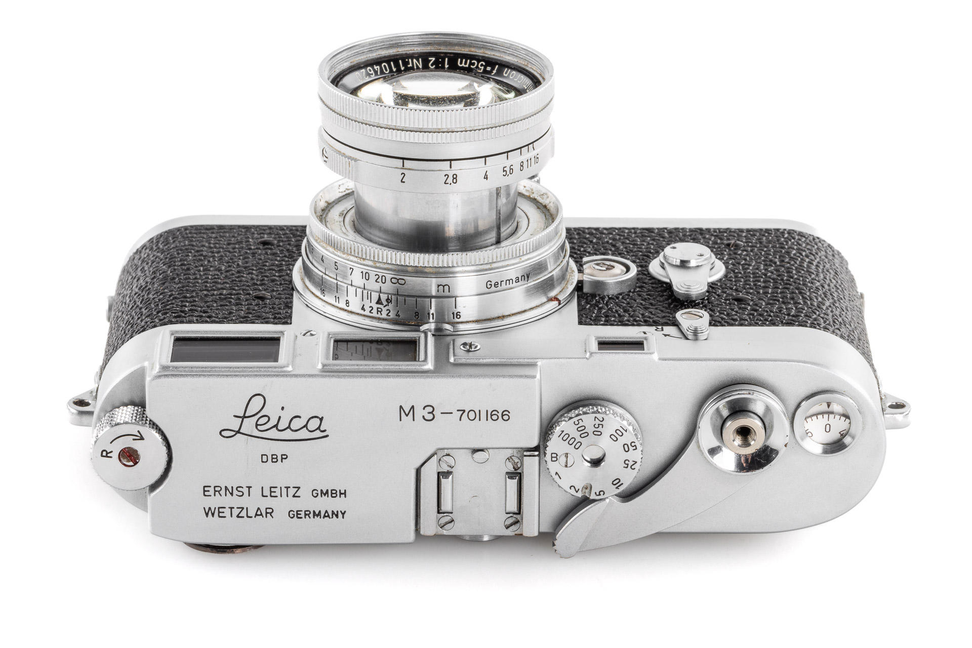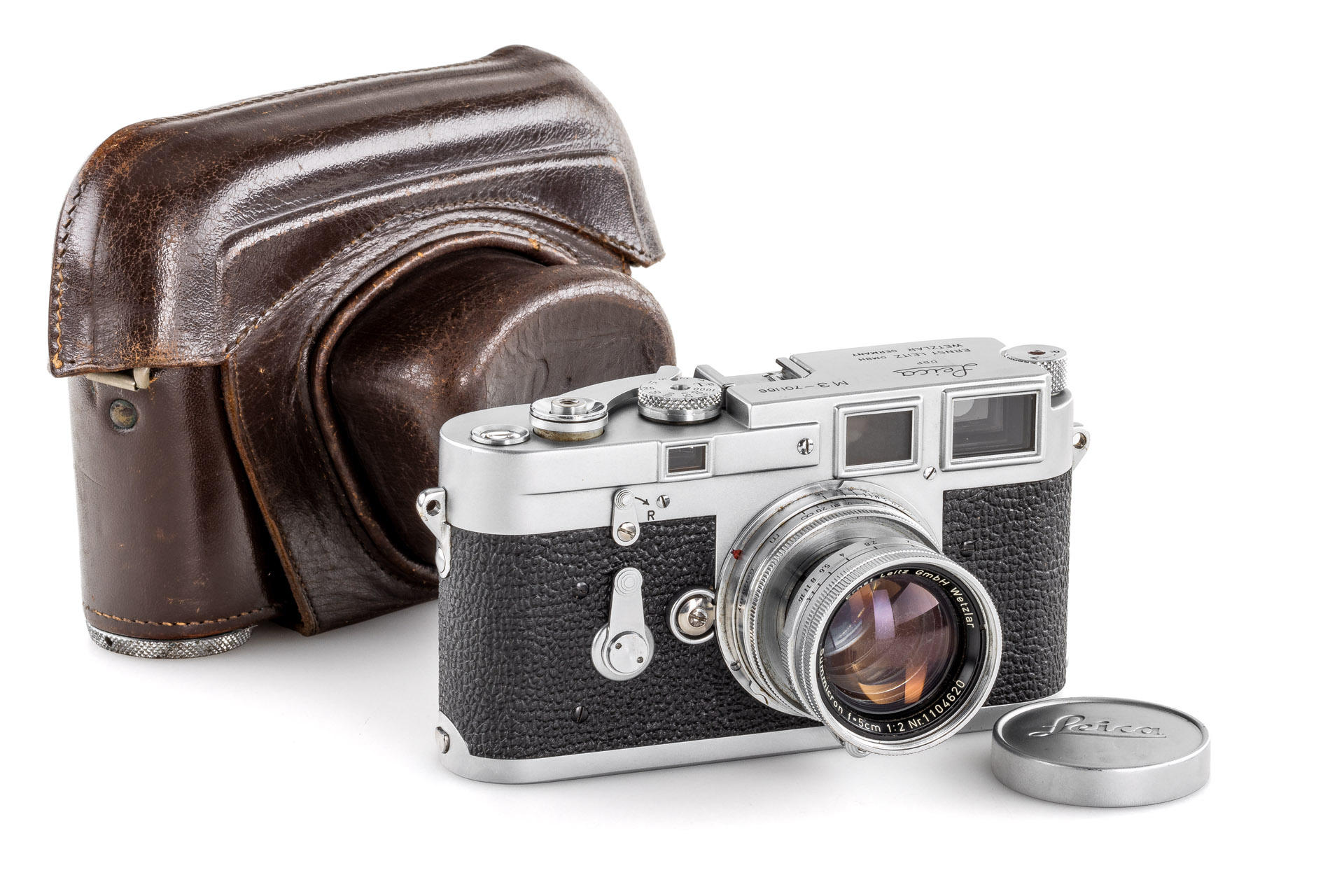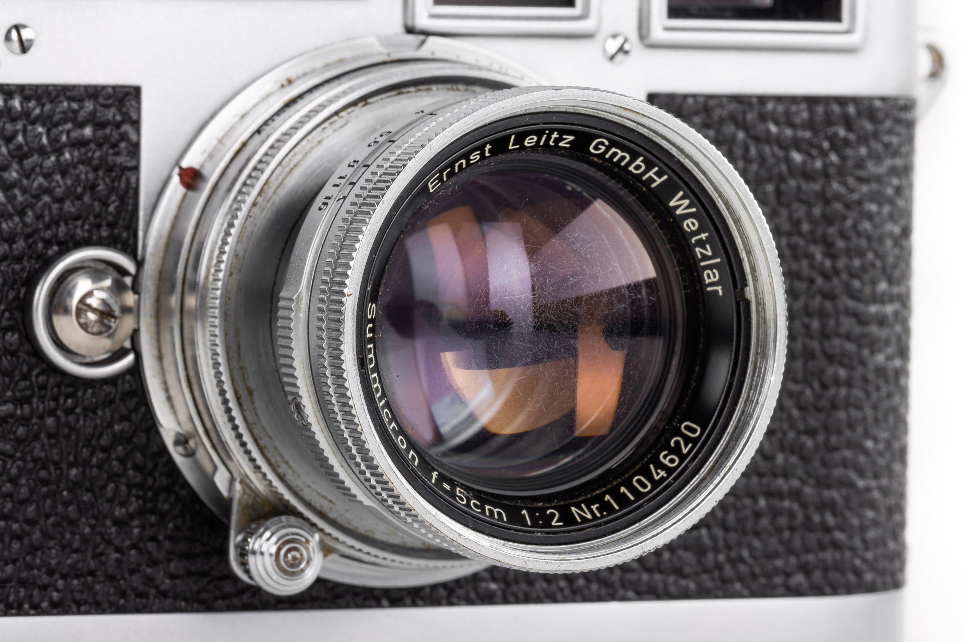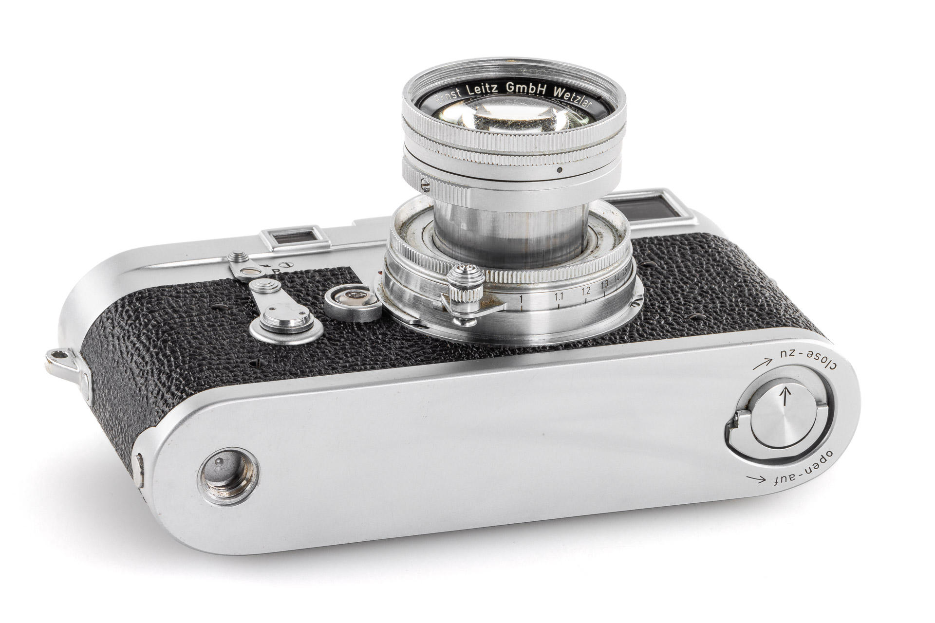 a very early M3 in excellent cosmetic condition and very good working order, with all early features like a shorter winding lever, lack of the 'L' seal, early-type back door with ceramic pressure plate etc., worth mentioning is a different style of the M3 engraving, the camera has been delivered on 25.03.1954 to New York, included in the lot is an early collapsible Summicron 2/5cm no.1104620 (M39 with an M-adapter, some cleaning marks on the front element), lens cap, leather case