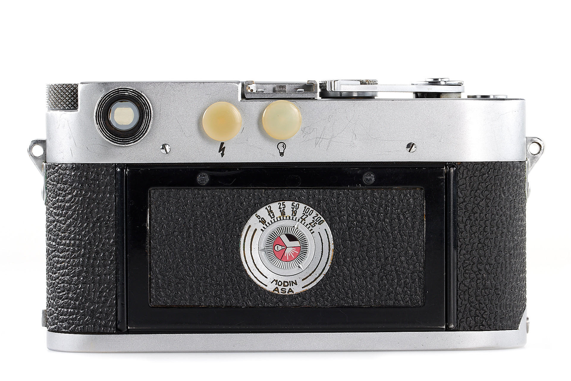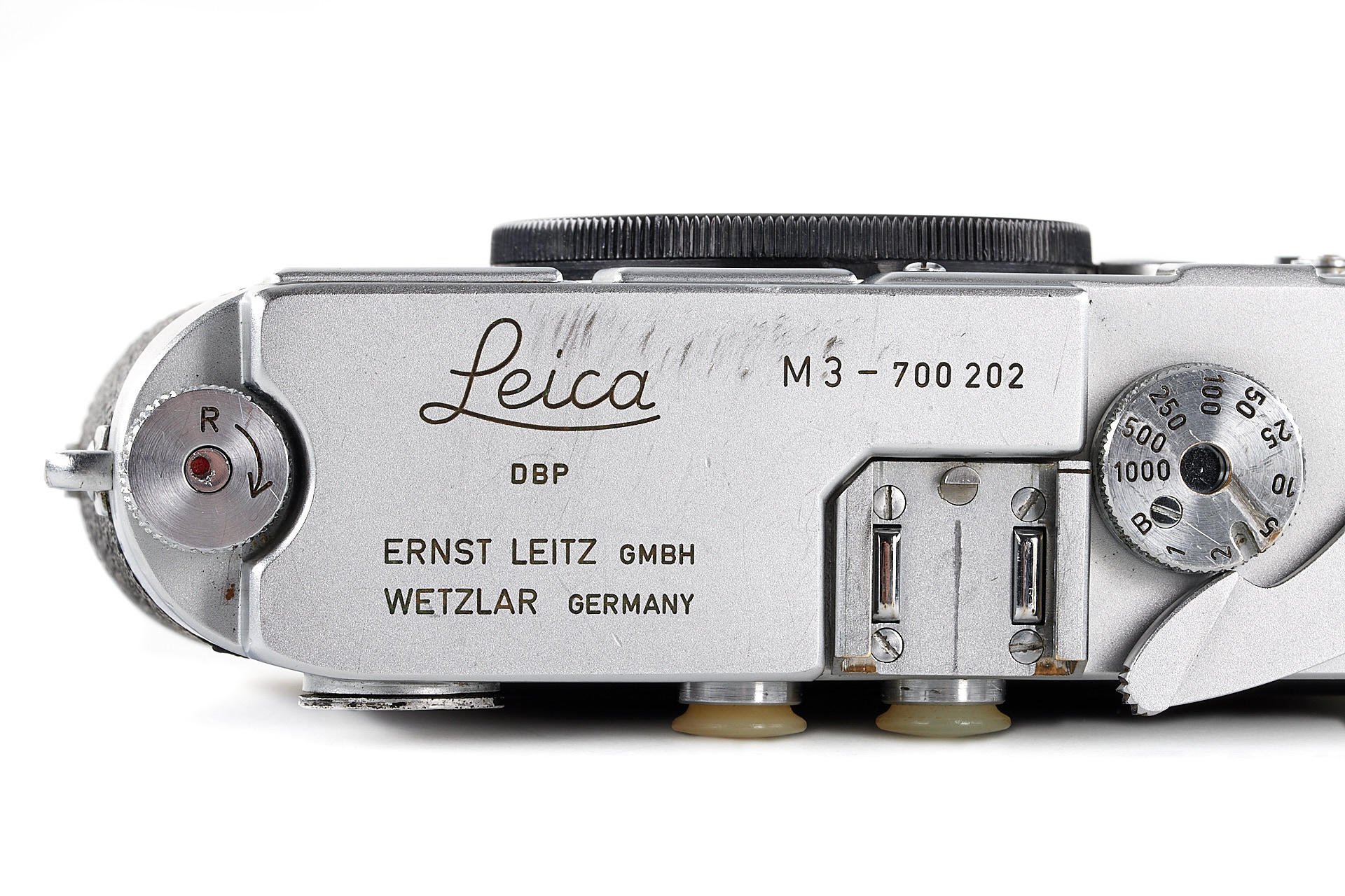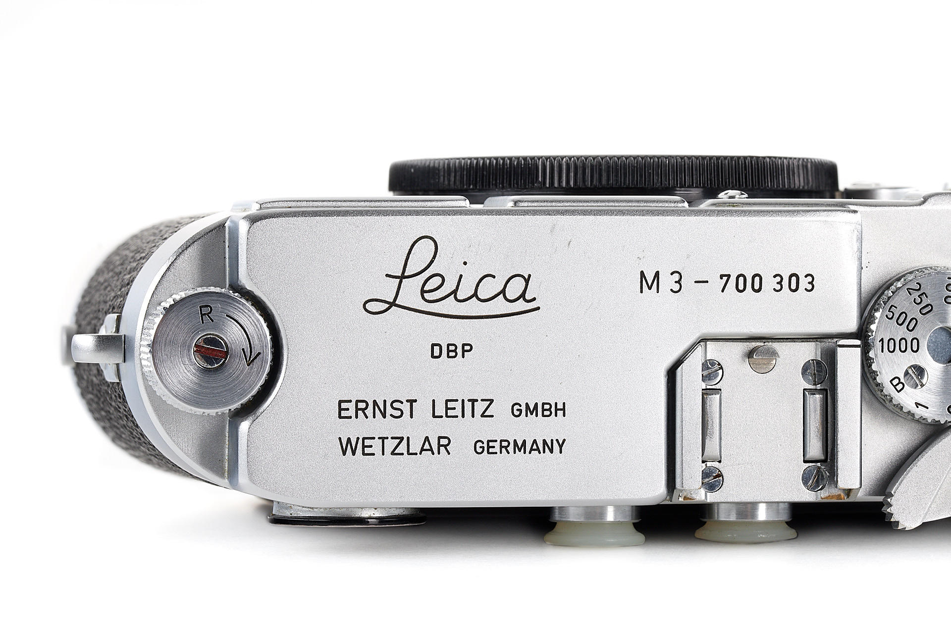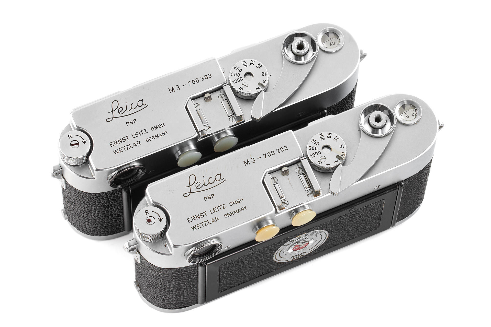 A beautiful pair of very early M3 cameras, with special serial numbers 700202 and 700303. Both cameras are in original, unmodified condition, with all distinctive early features, like the double stroke film advance, long strap lugs, early back etc. The 700202 is in condition B/A and was initially delivered to Düsseldorf on 20.03.1954, the 700303 is in condition A/B and was delivered to Köln on 26.05.1954.