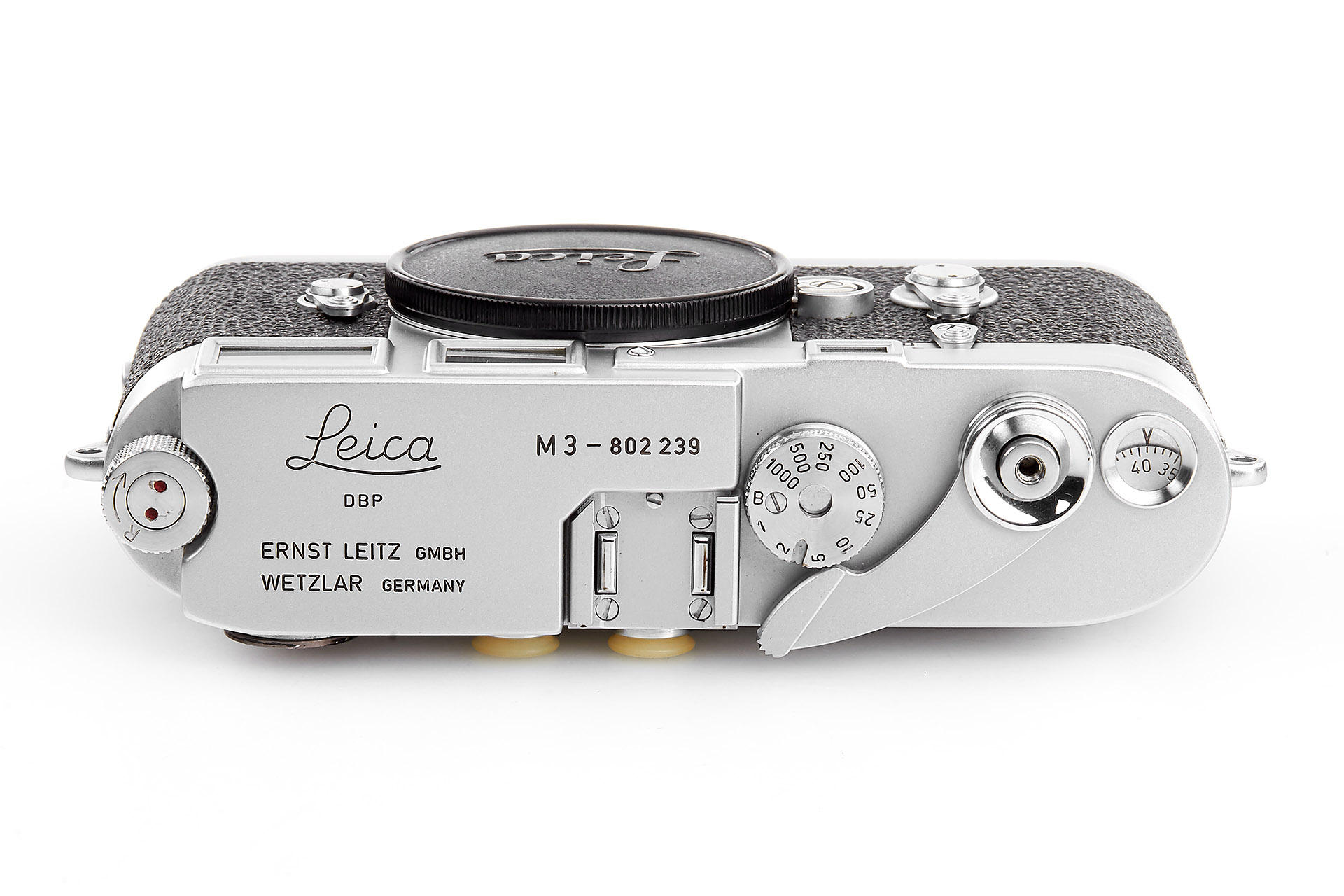 classic double stroke camera in beautiful, almost perfect cosmetic condition and in very good working order, only tiny signs of use visible on back door and eyepiece, good contrasty rangefinder, with matching body cap