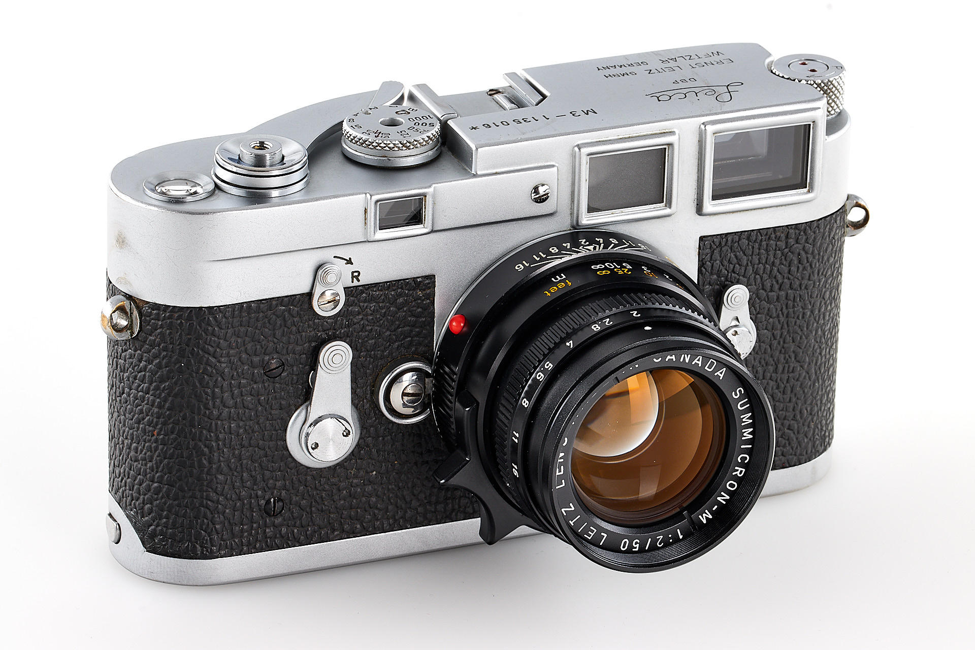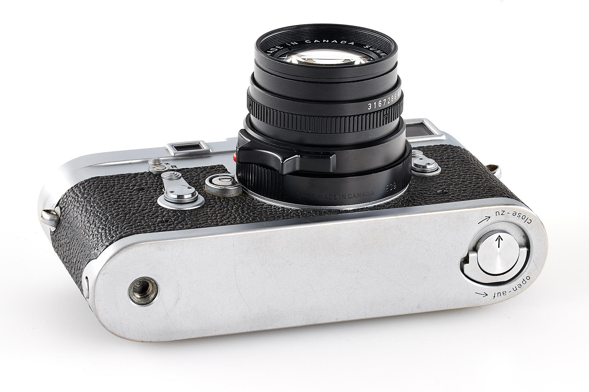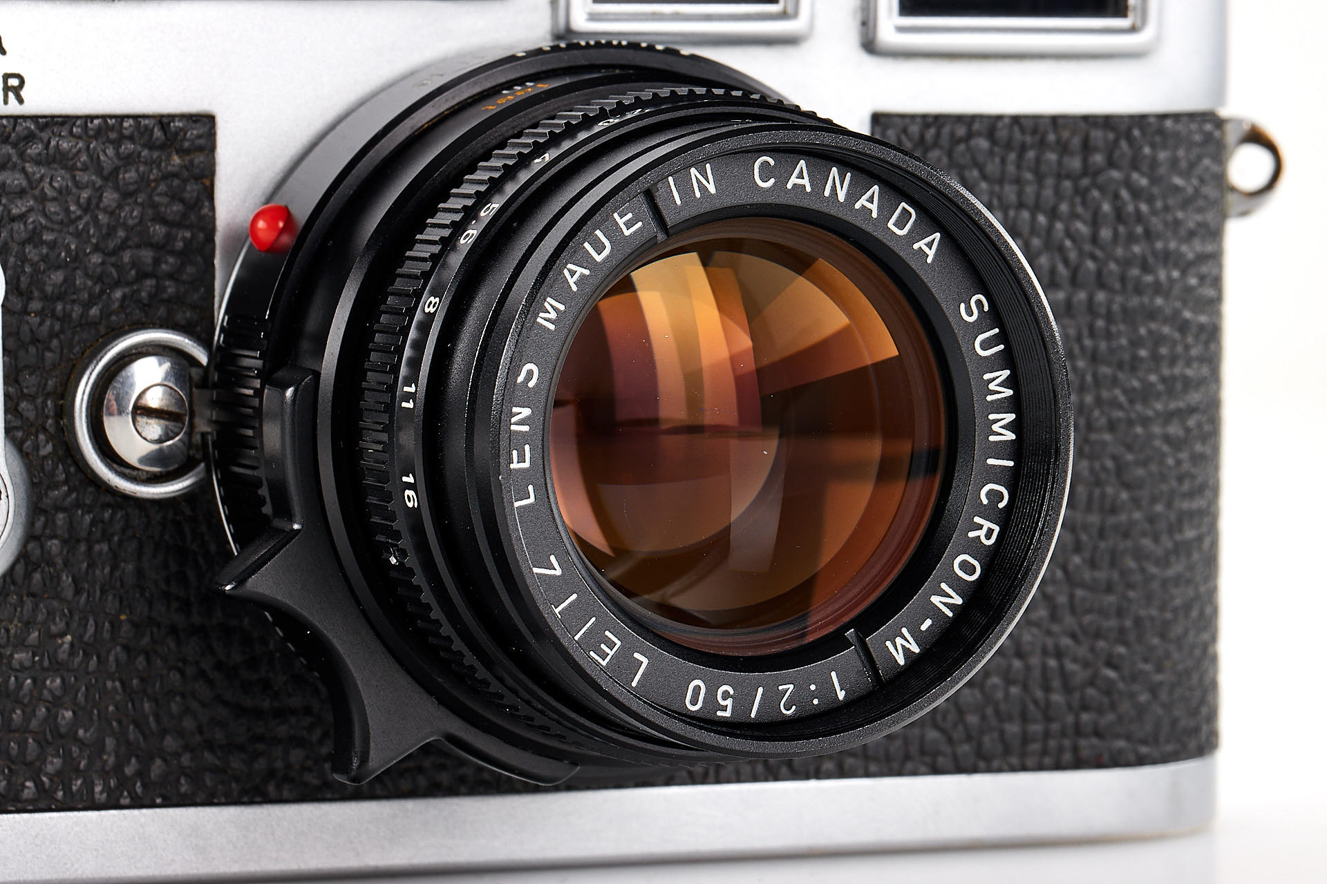 quite rare single stroke body assembled by ELCAN in Canada, in very good condition and working order - from a batch of 100 cameras (nos.1135001-1135100) finished in Midland in 1965, with mint Summicron 2/50mm no.3167288* (Cond. A-) also made in Canada, clean and clear lenses, with 12538 hood and front cap, it is interesting to note that both camera and lens have a serial number with a '*', denoting a duplicate delivery