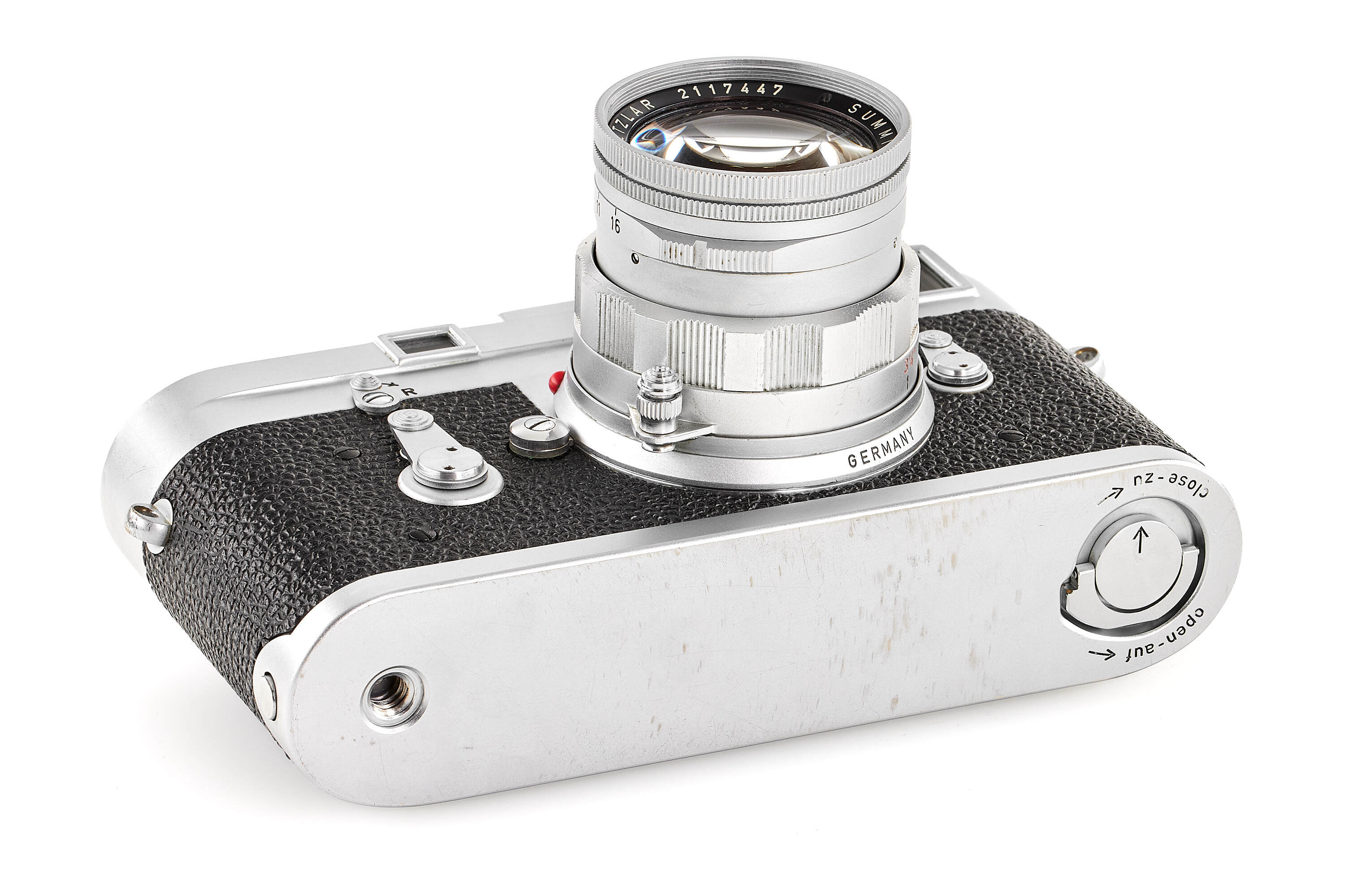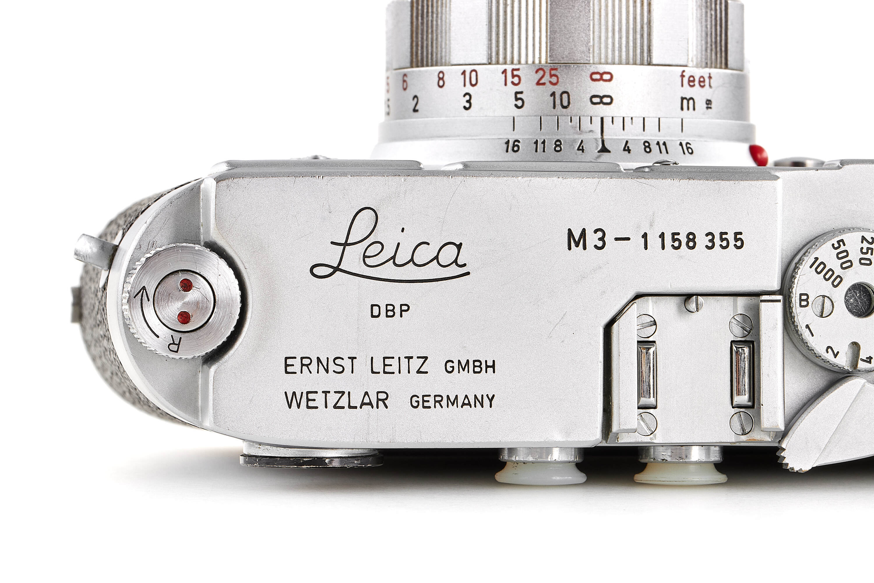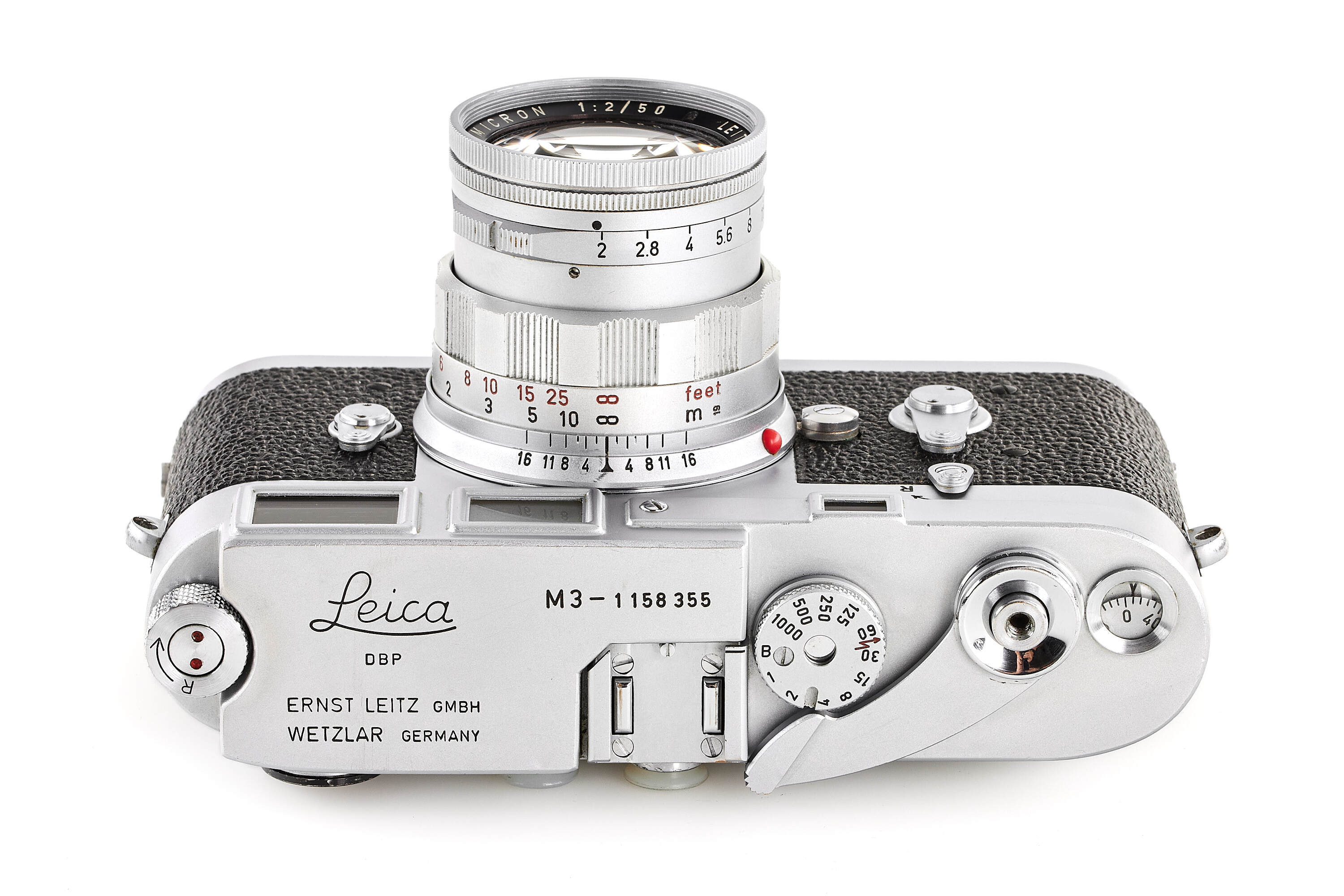 Extremely late body from the last batch of the M3 general production (nos.1157601 to 1158995), in very good condition, note the absence of lens lock release guard, late delivered to Munich on 147.04.1968, together with Summicron rigid 2/50mm no.2117447, good optics only showing a few cleaning marks on the front element, with front lens cap.