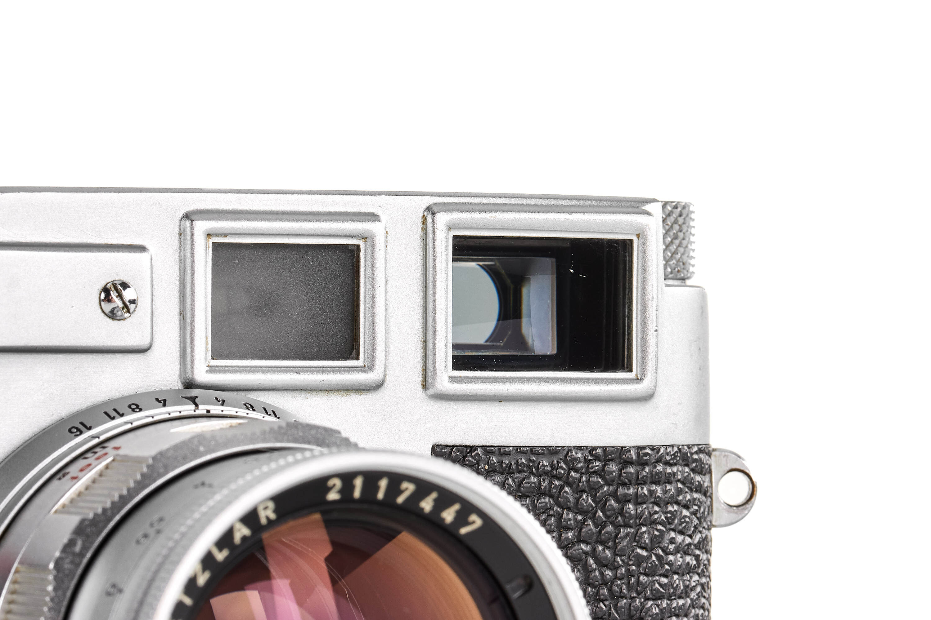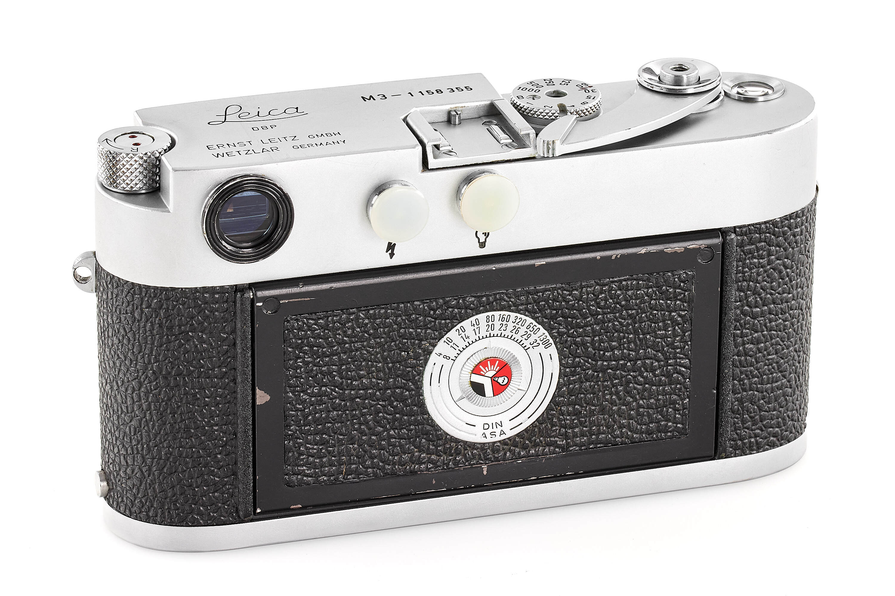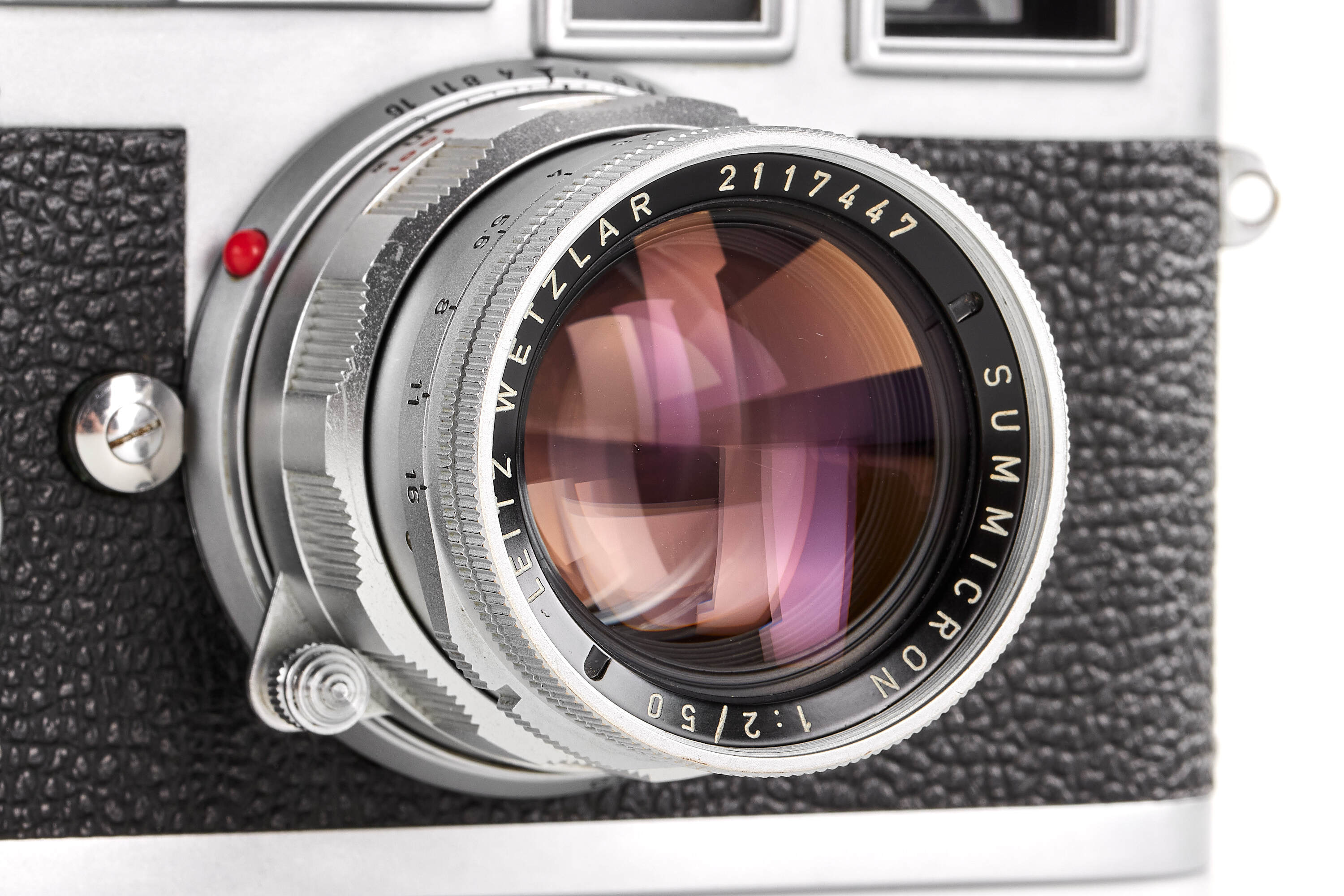 Extremely late body from the last batch of the M3 general production (nos.1157601 to 1158995), in very good condition, note the absence of lens lock release guard, late delivered to Munich on 147.04.1968, together with Summicron rigid 2/50mm no.2117447, good optics only showing a few cleaning marks on the front element, with front lens cap.