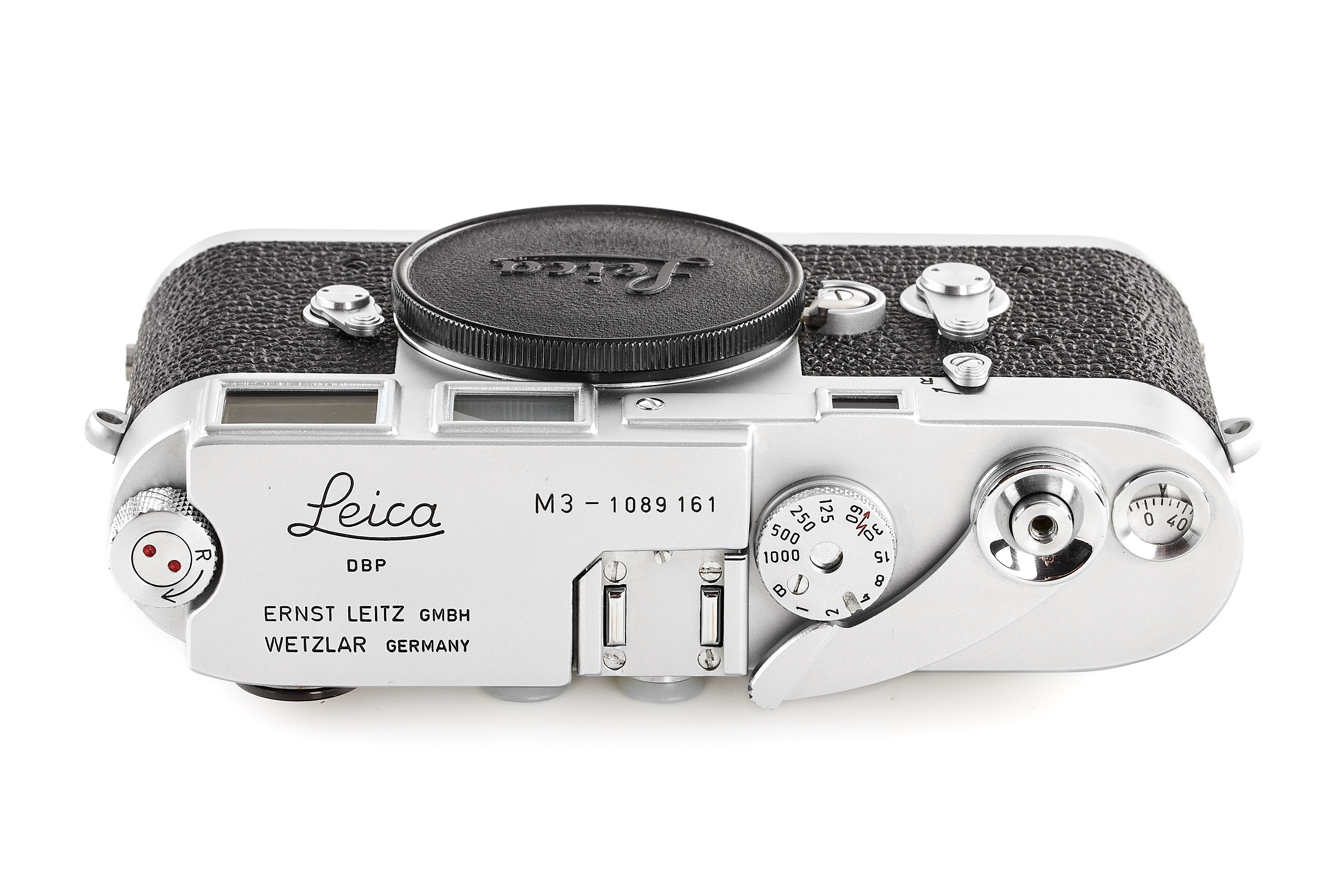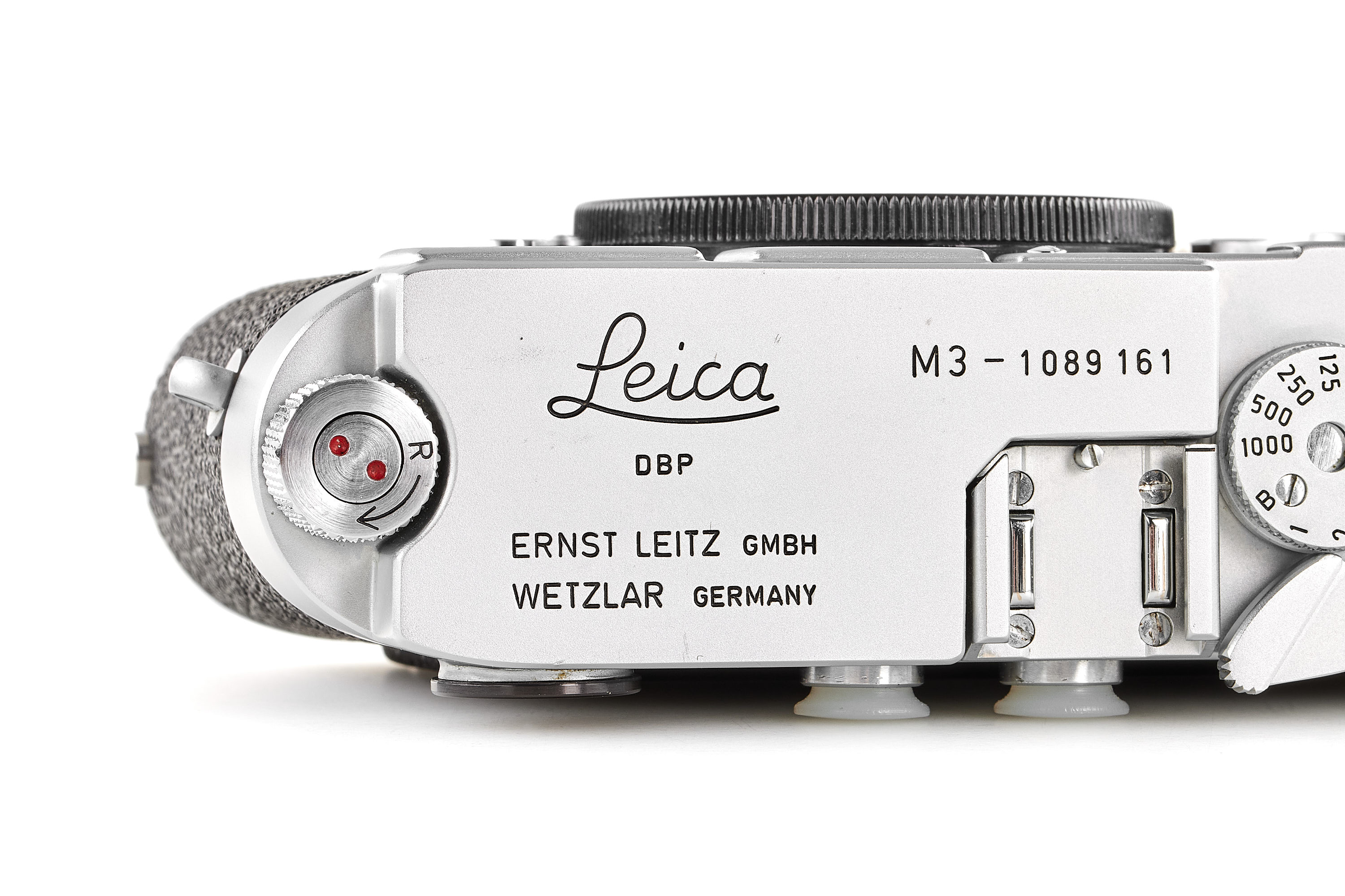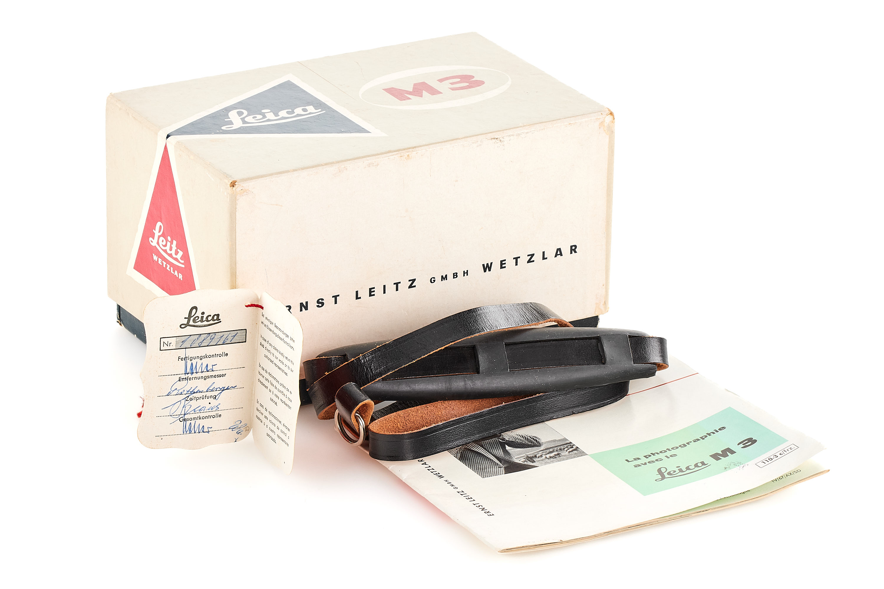 A Beautiful classic single-stroke Leica M3 in almost mint condition and in working order, with only a few light signs of use, with body cap, French instructions, original control tag, leather strap and maker's box, delivered to Tiranty (Paris) on 14.05.1964.