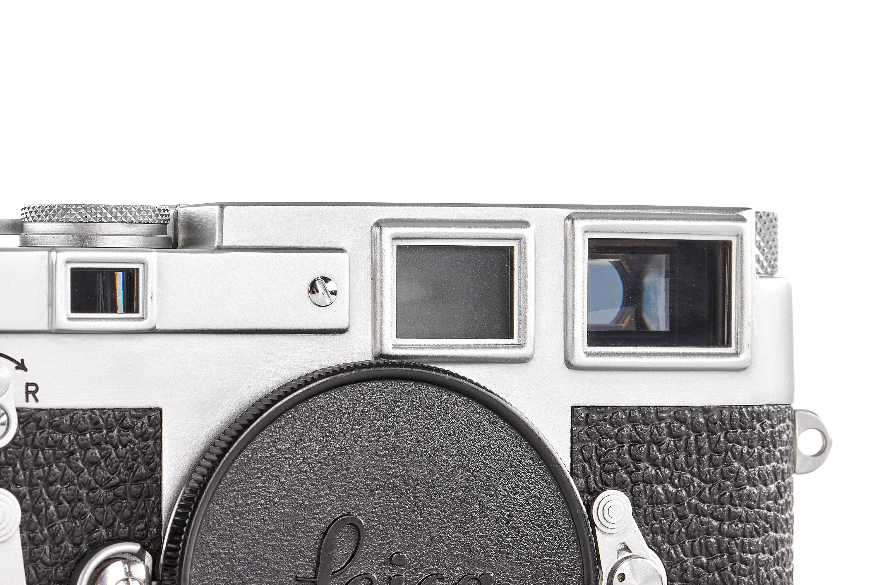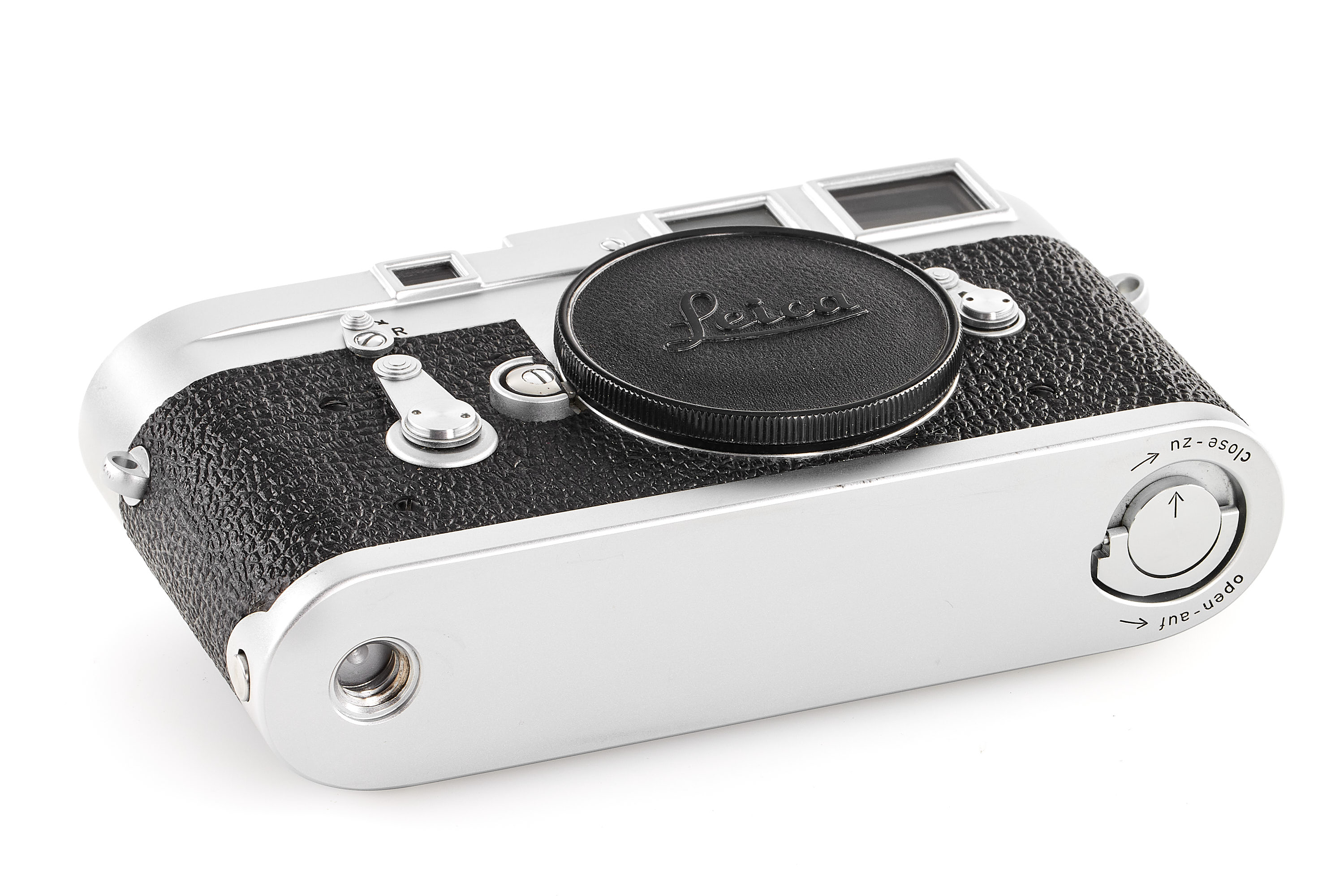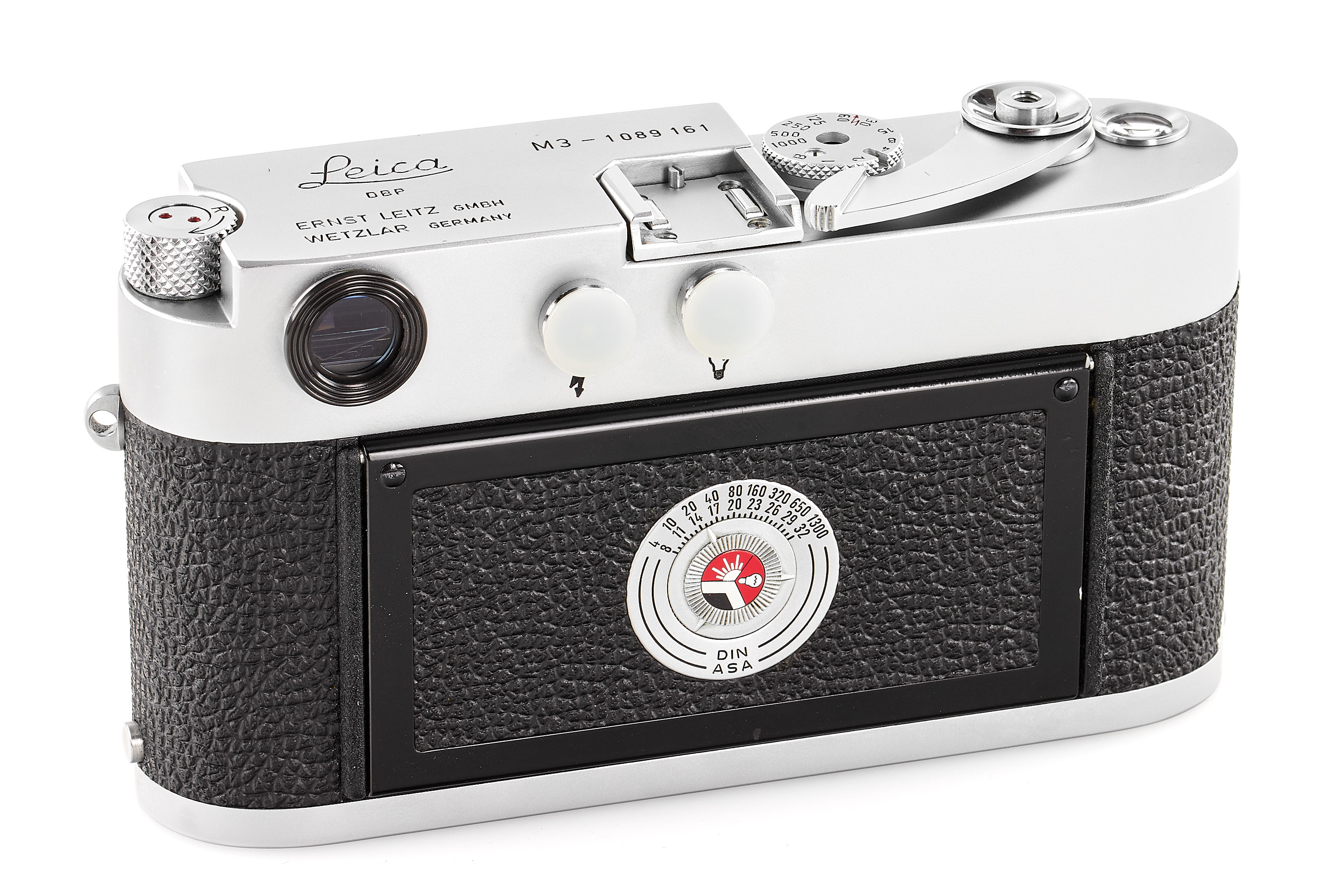 A Beautiful classic single-stroke Leica M3 in almost mint condition and in working order, with only a few light signs of use, with body cap, French instructions, original control tag, leather strap and maker's box, delivered to Tiranty (Paris) on 14.05.1964.