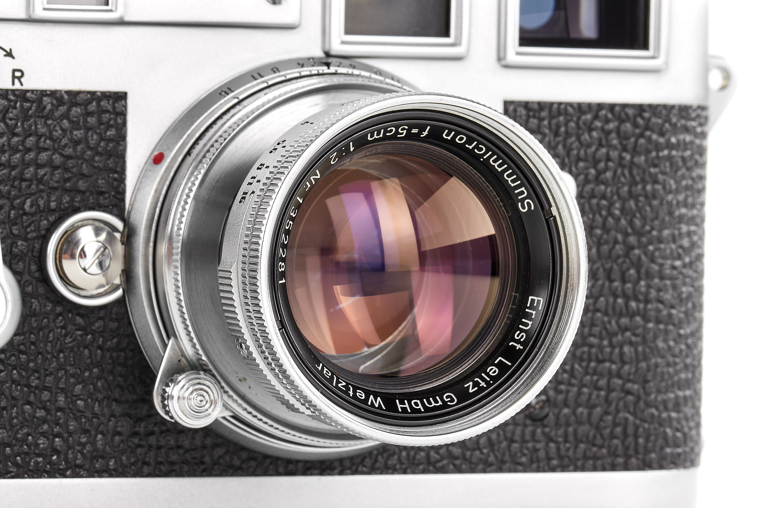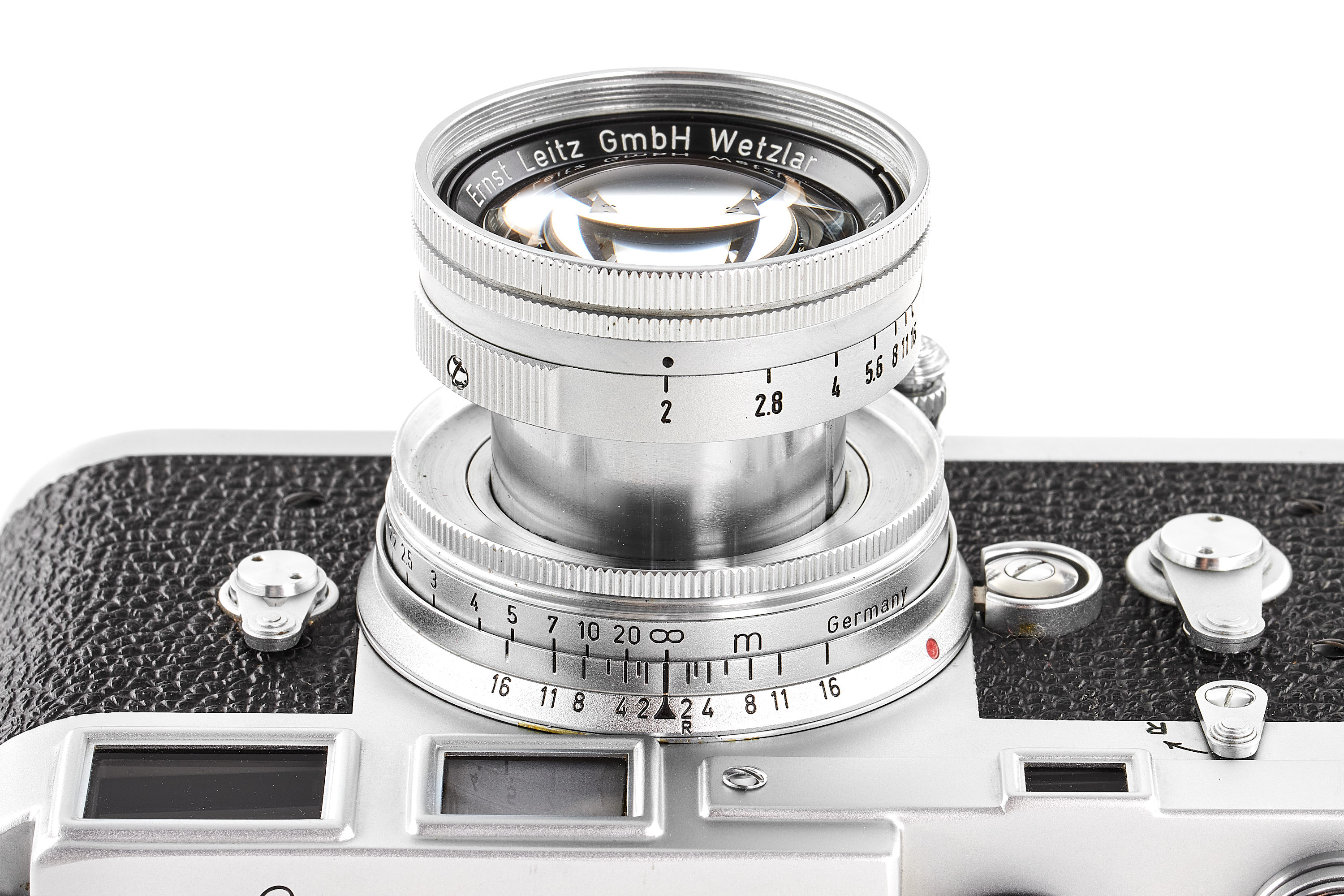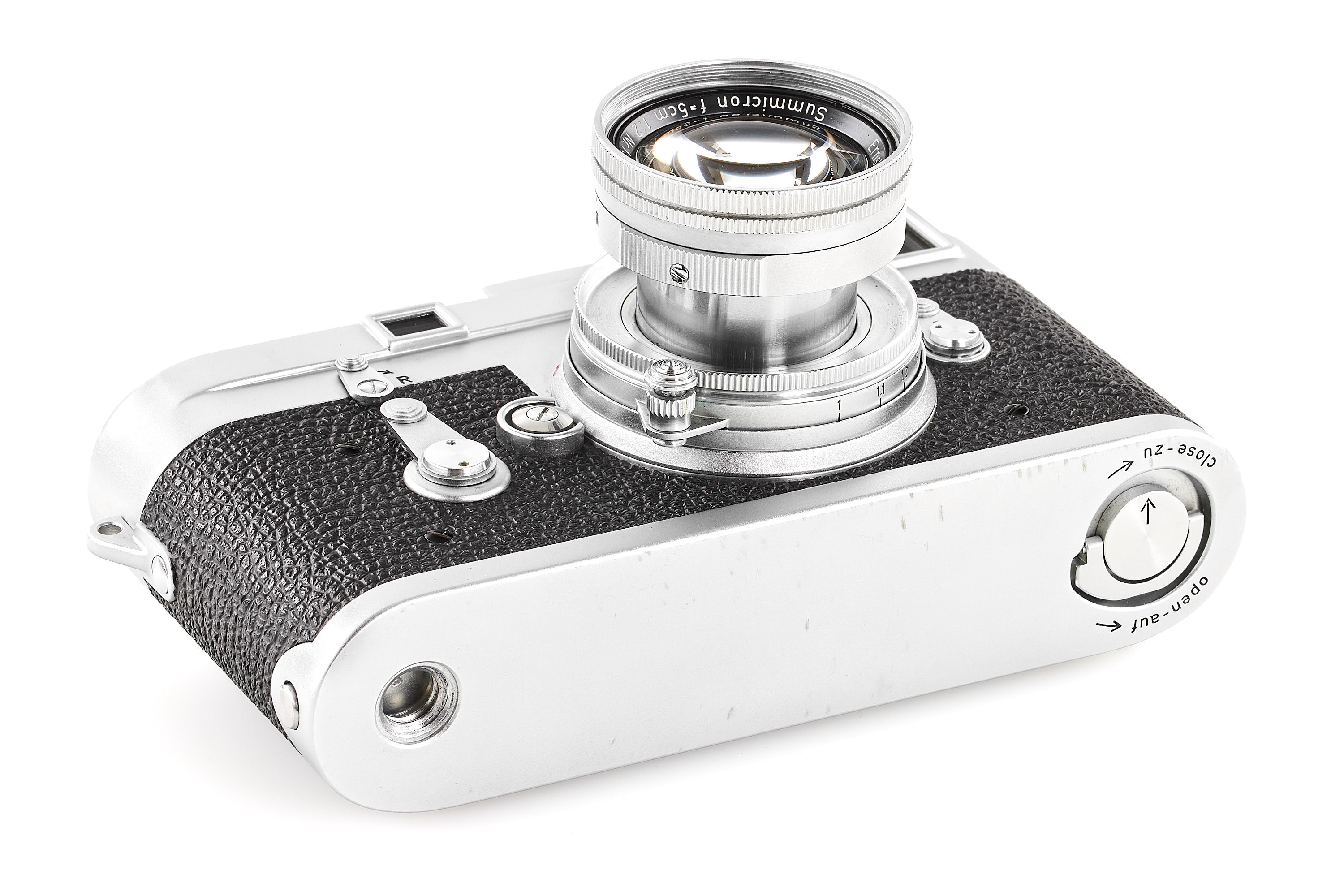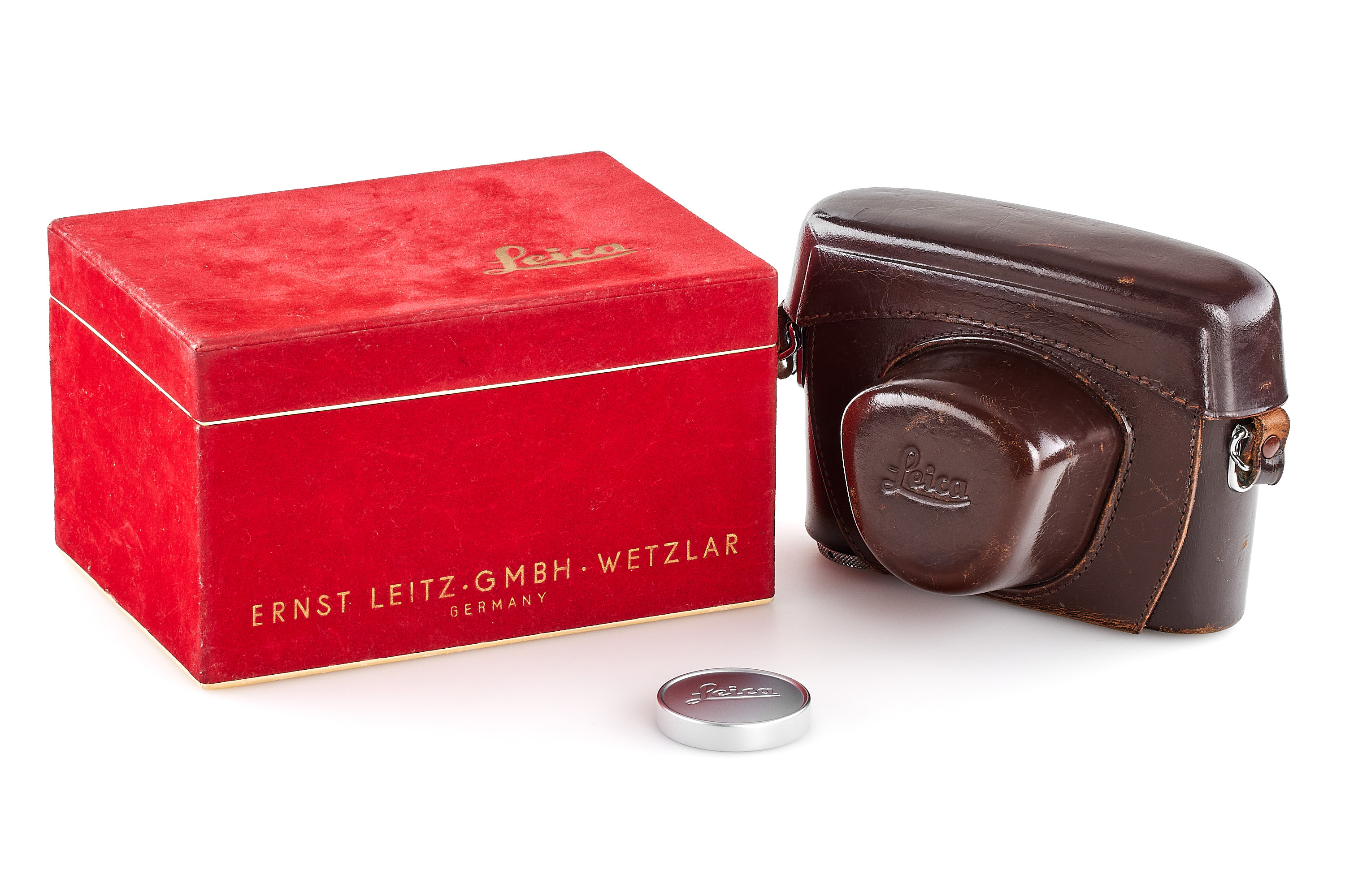 Beautiful dual stroke version in almost mint condition and working order, transitional version with some early features such as early strap lugs, speed progression with 1/5th sec, glass press film plate, etc, with matching Summicron 2/5cm no.1352281 with meter scale, clean and clear optics, with front lens cap, leather case and red maker's box (different serial numbers), delivered together to Vienna on 11.07.1956.