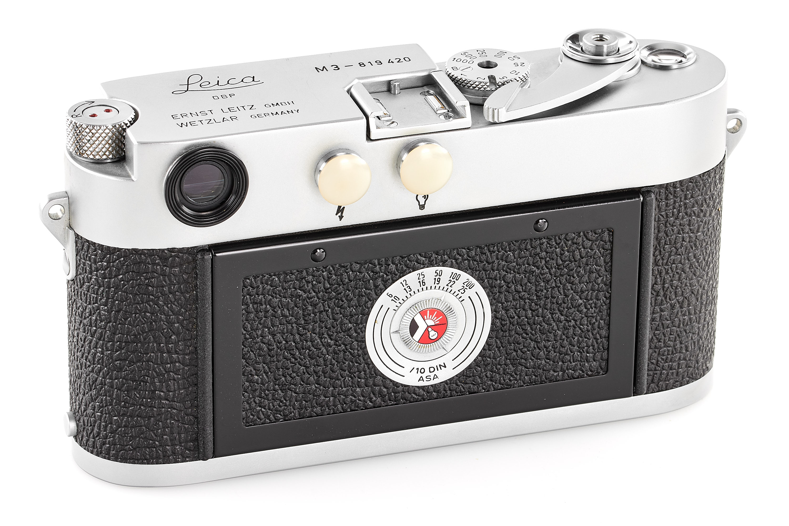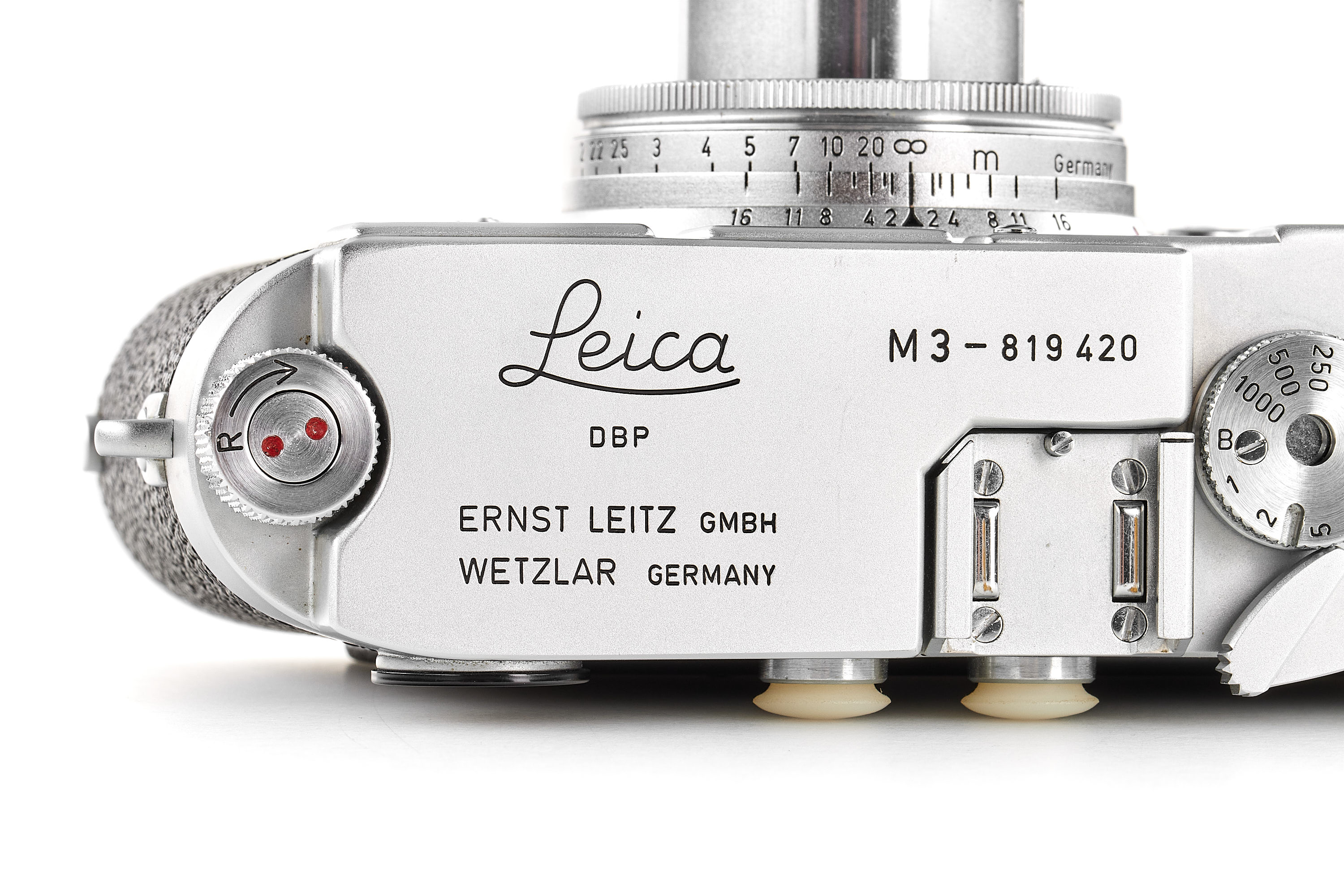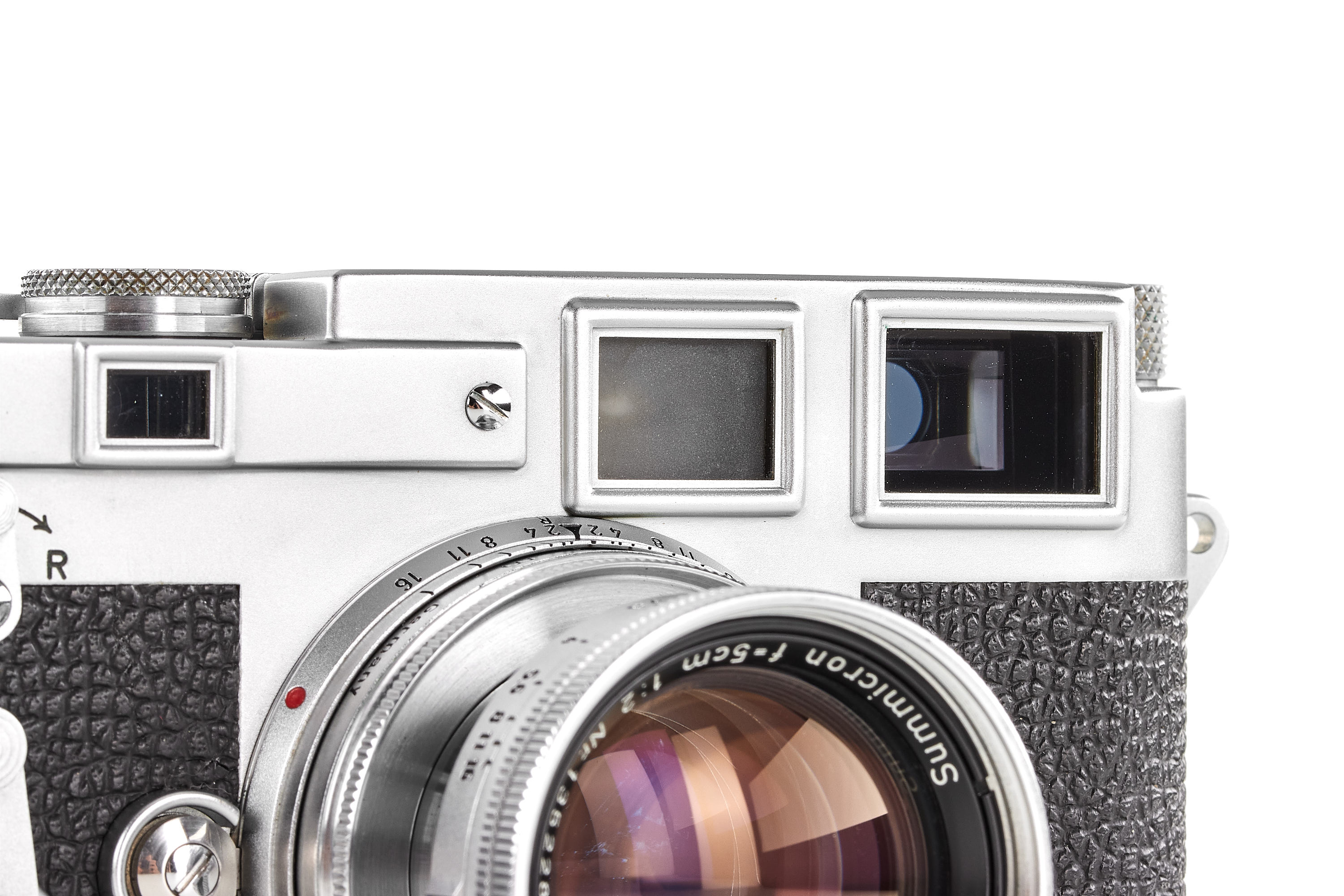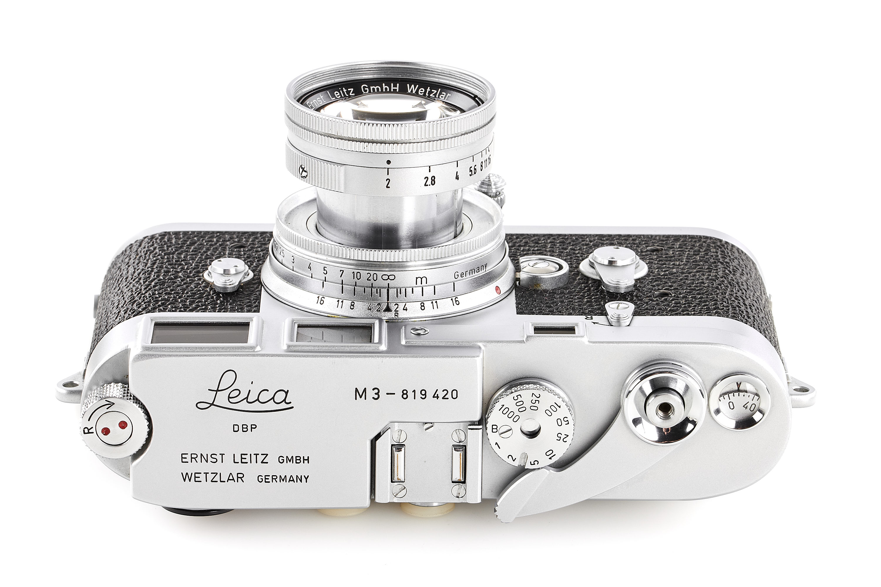 Beautiful dual stroke version in almost mint condition and working order, transitional version with some early features such as early strap lugs, speed progression with 1/5th sec, glass press film plate, etc, with matching Summicron 2/5cm no.1352281 with meter scale, clean and clear optics, with front lens cap, leather case and red maker's box (different serial numbers), delivered together to Vienna on 11.07.1956.