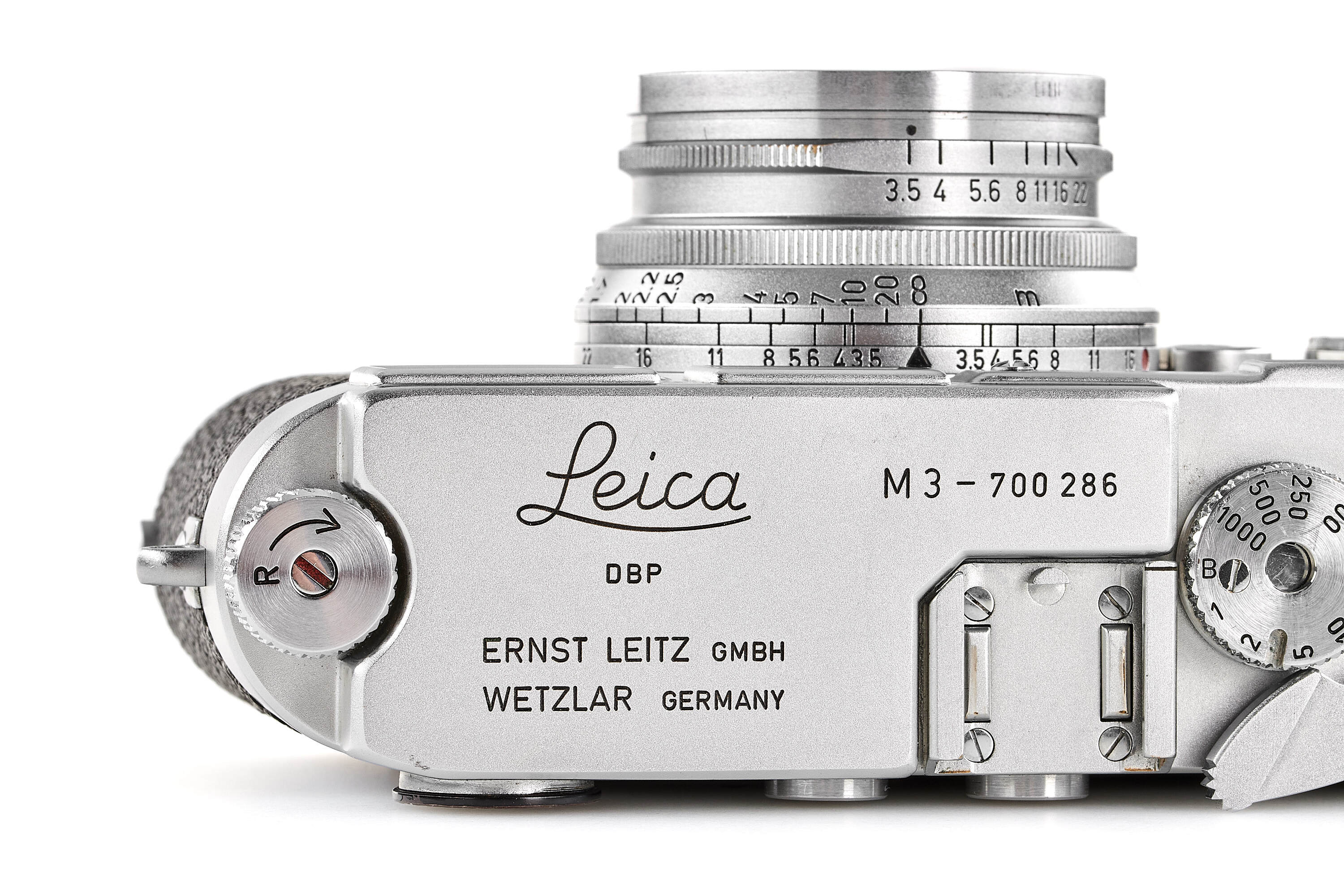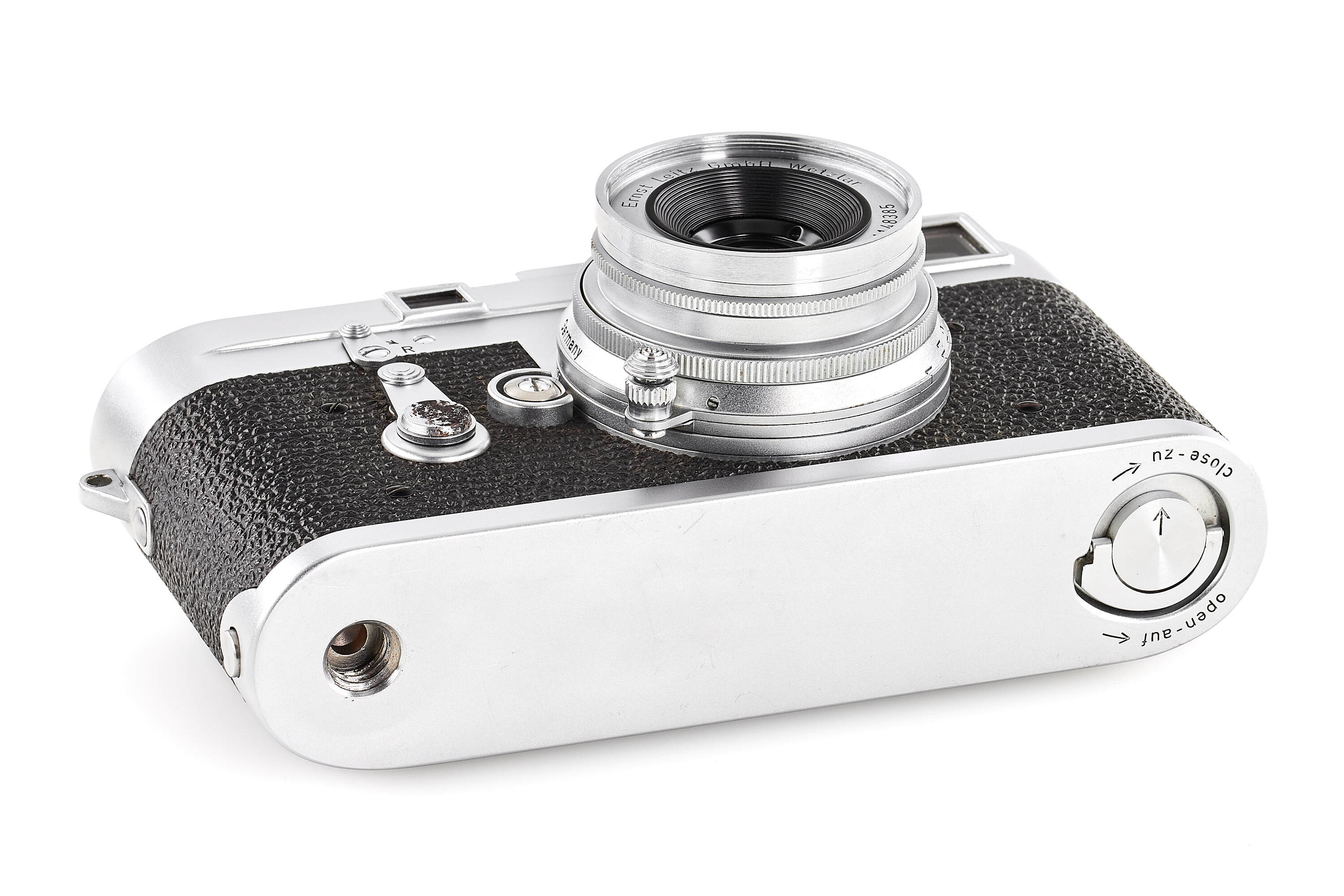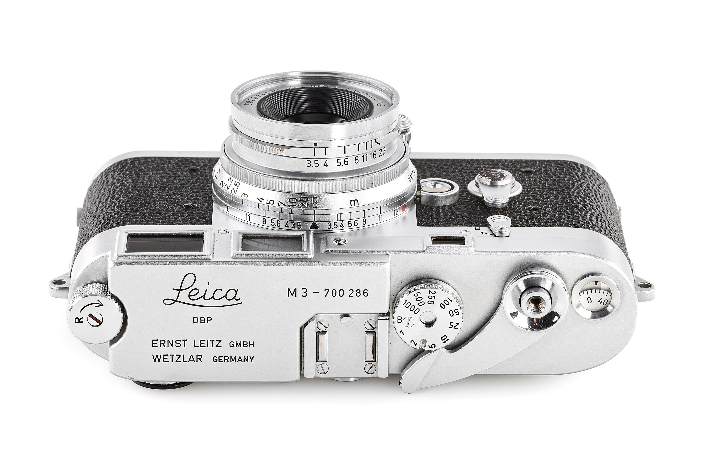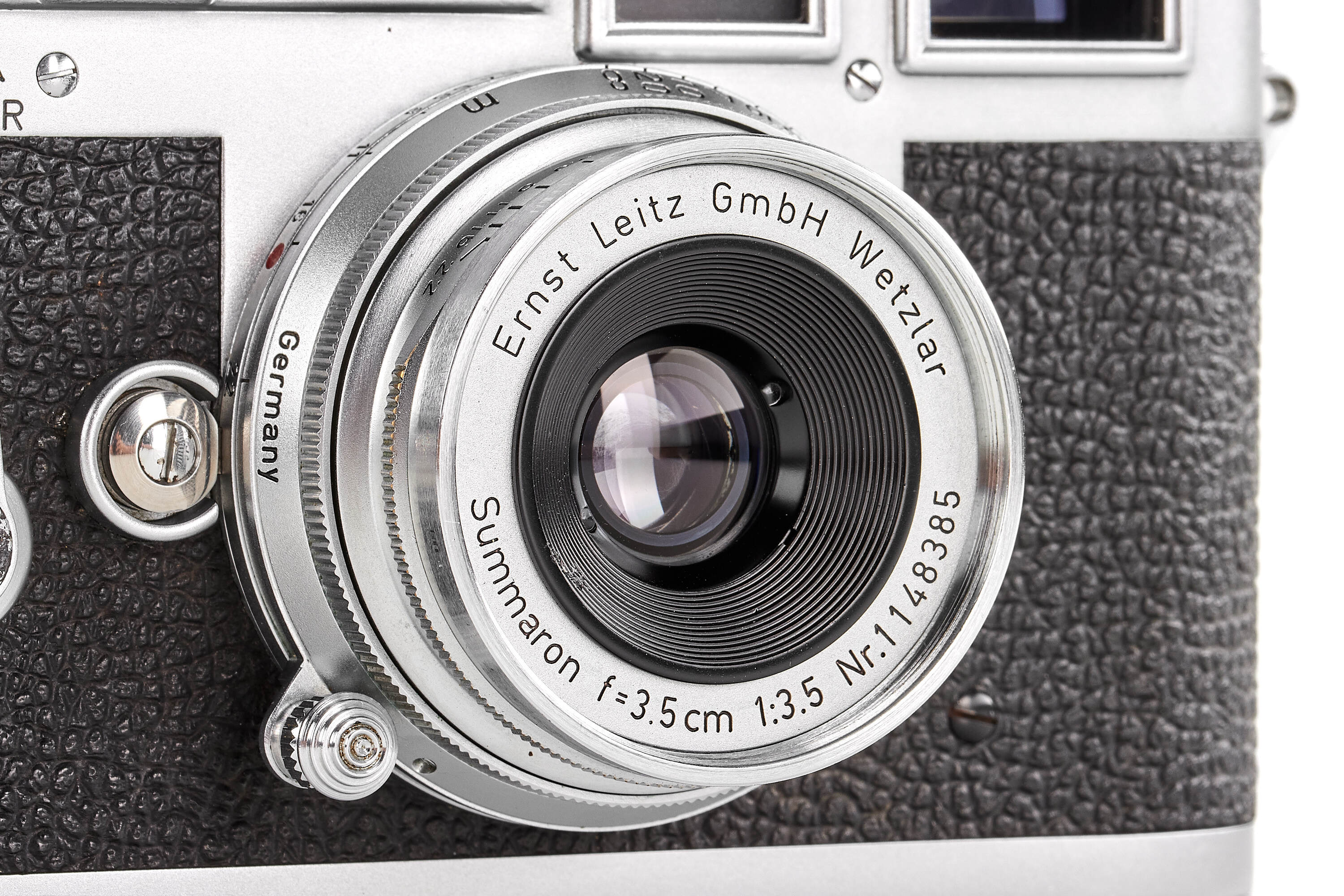 Rare extremely early M3, in beautiful original, near-mint condition, note the features such as no frame selector, early speed progression, no black wax seal, 200 ISO index, etc., delivered to retailer Bauer, Düsseldorf, on 20.03.1954, together with matching very early Summaron 3.5/3.5cm no.1148385 in original M-mount (production starts with no.1148001), in meter scale, designed to be used on M3 cameras with external finder, very good optics, delivered to the same place on 30.04.1954, with SBLOO finder (leather case), UVa filter and both caps, with leather eveready case.