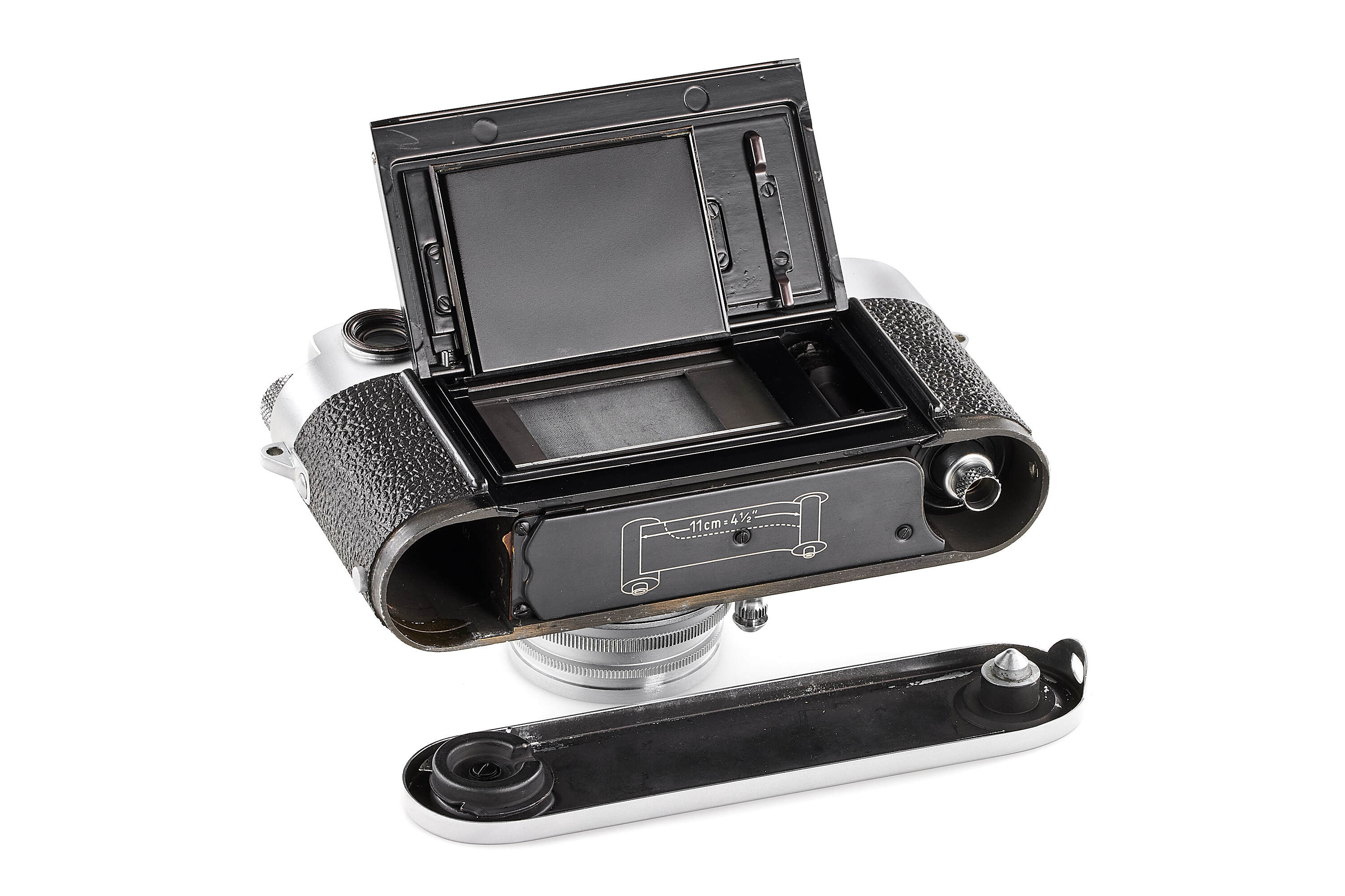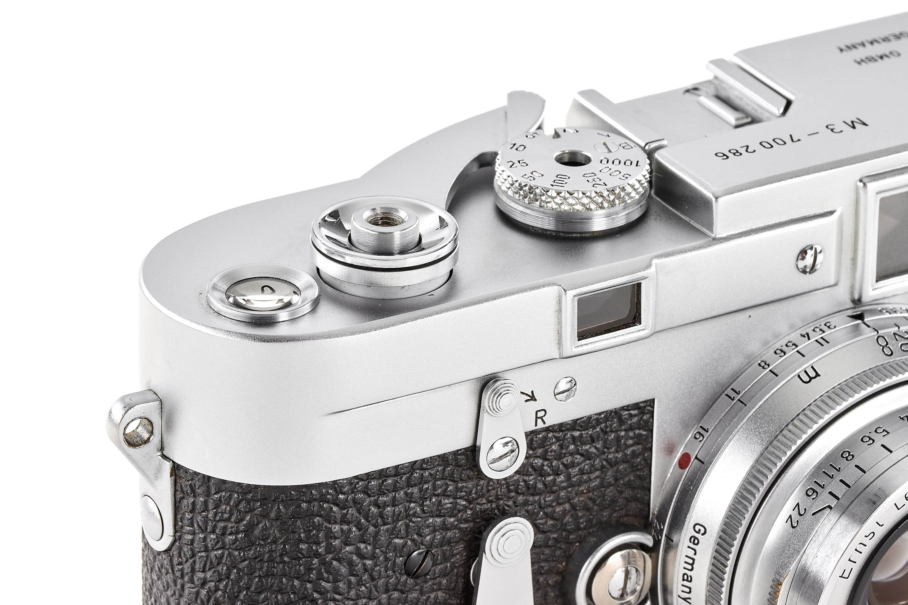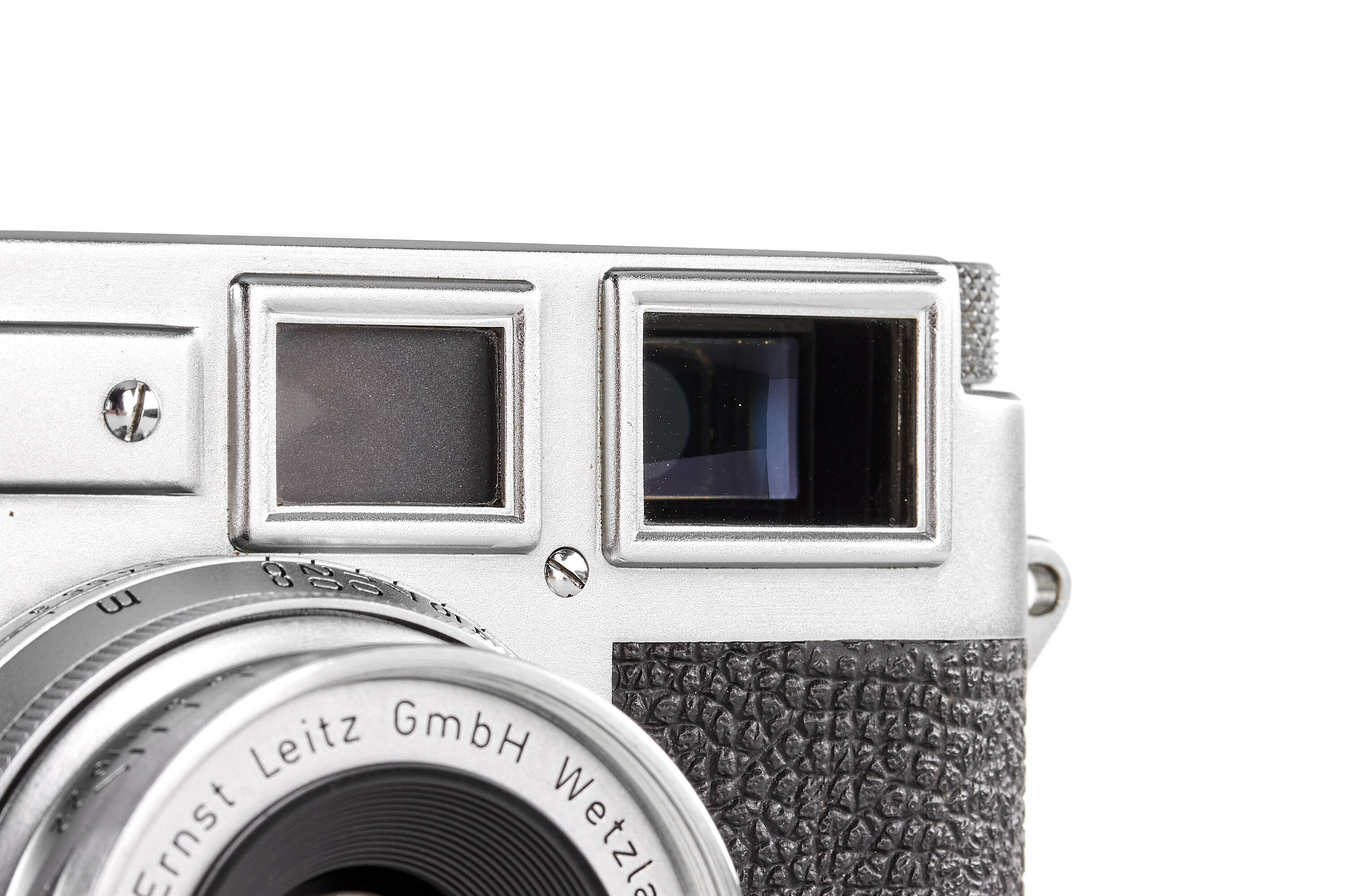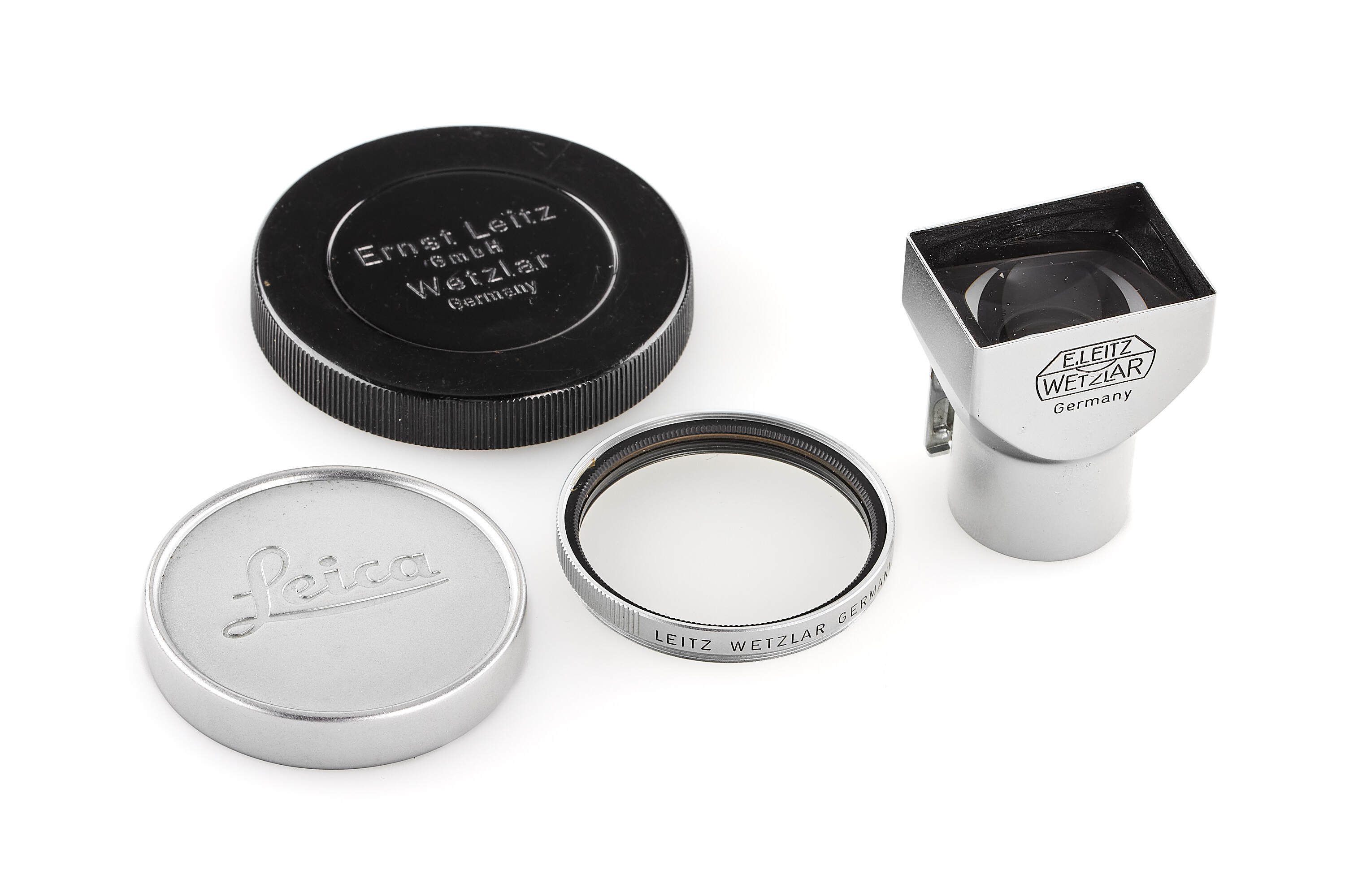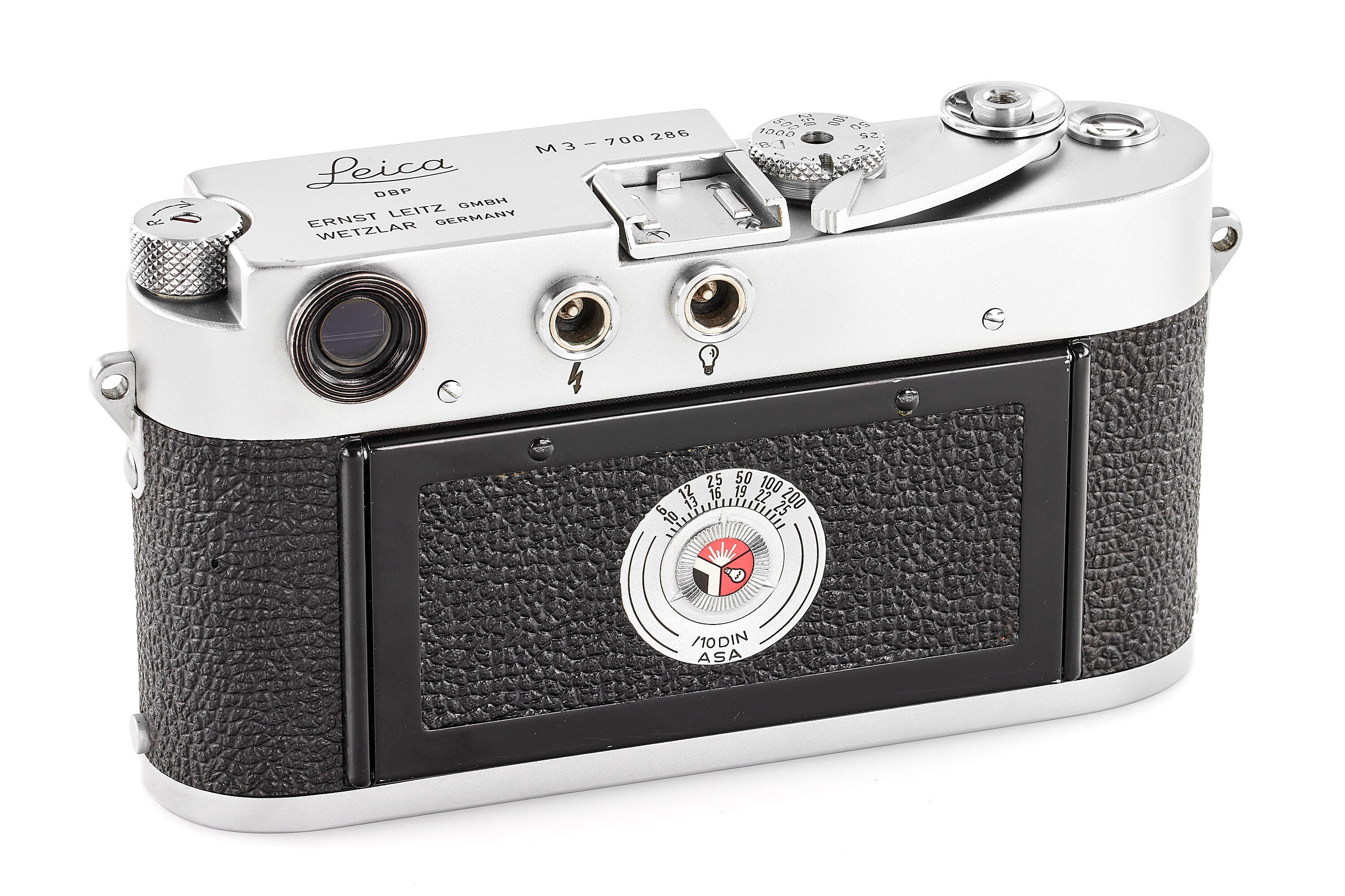Rare extremely early M3, in beautiful original, near-mint condition, note the features such as no frame selector, early speed progression, no black wax seal, 200 ISO index, etc., delivered to retailer Bauer, Düsseldorf, on 20.03.1954, together with matching very early Summaron 3.5/3.5cm no.1148385 in original M-mount (production starts with no.1148001), in meter scale, designed to be used on M3 cameras with external finder, very good optics, delivered to the same place on 30.04.1954, with SBLOO finder (leather case), UVa filter and both caps, with leather eveready case.