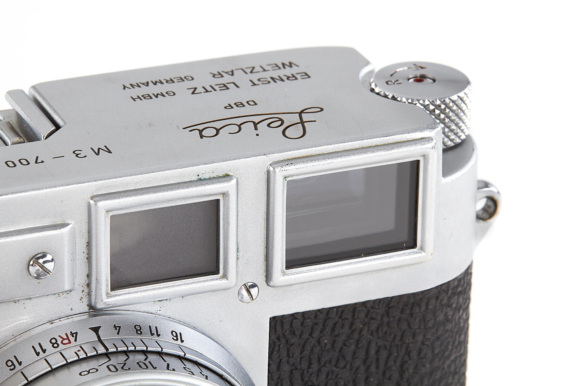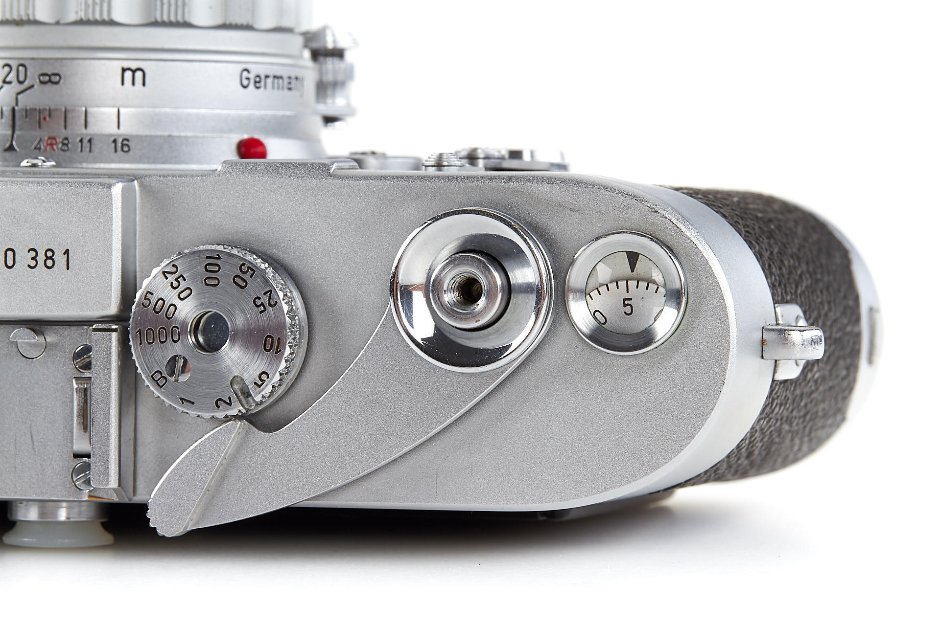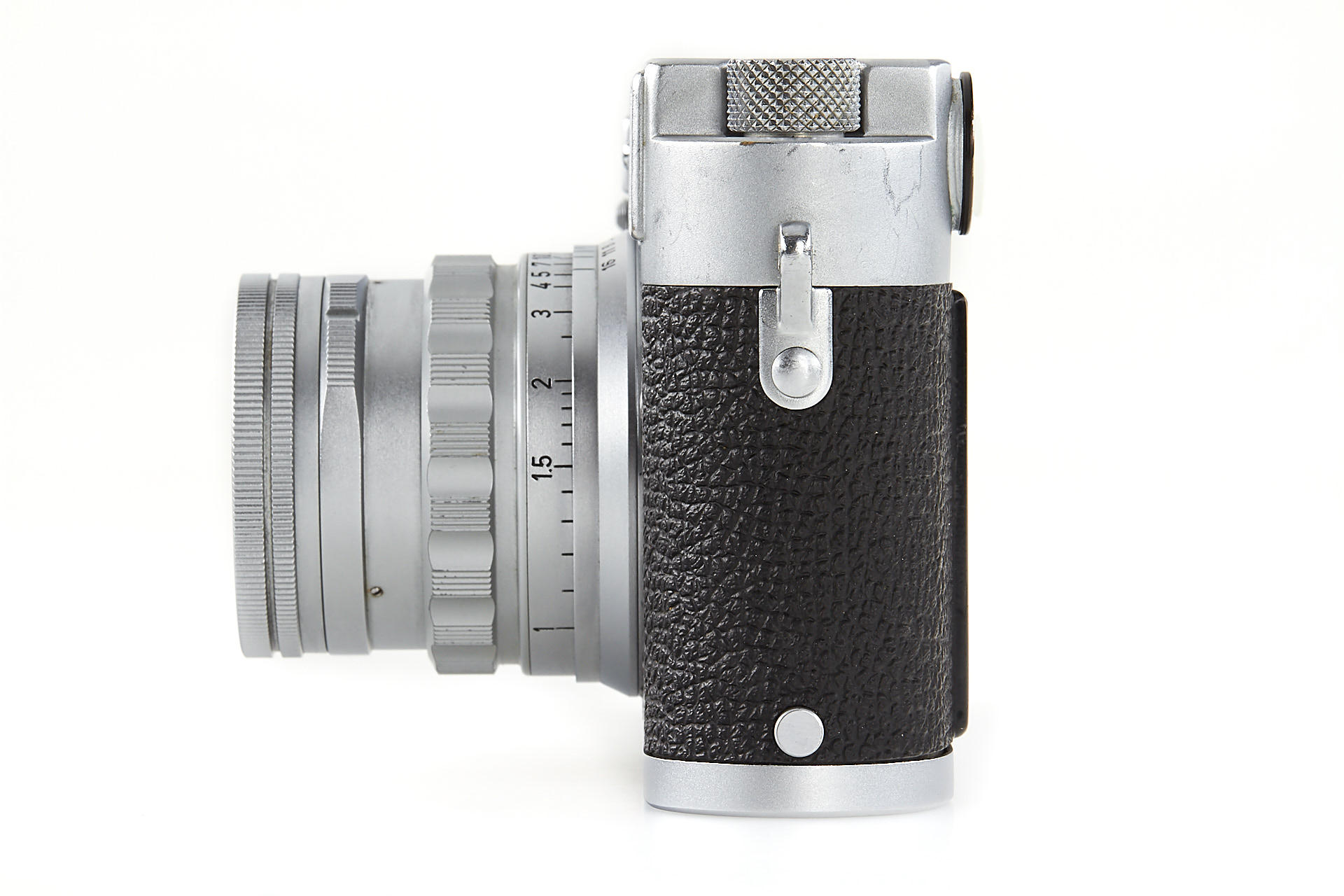a very early M3 in with all original features like the early back door, longer rewind lever, no L seal etc., in very good condition, with very early rigid Summicron 2/5cm no.1400161 (the production started with the number 1400001) in excellent condition with good optics