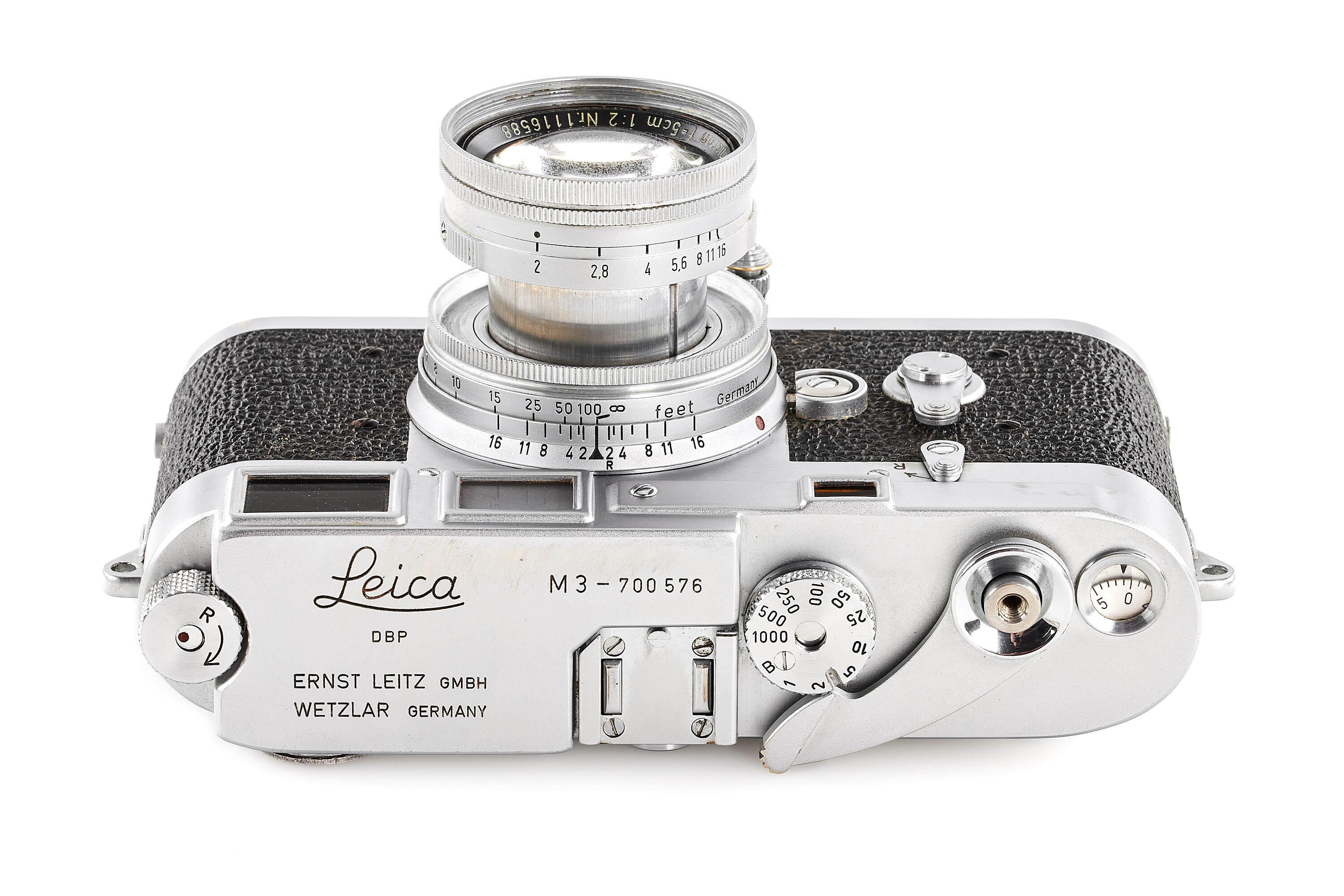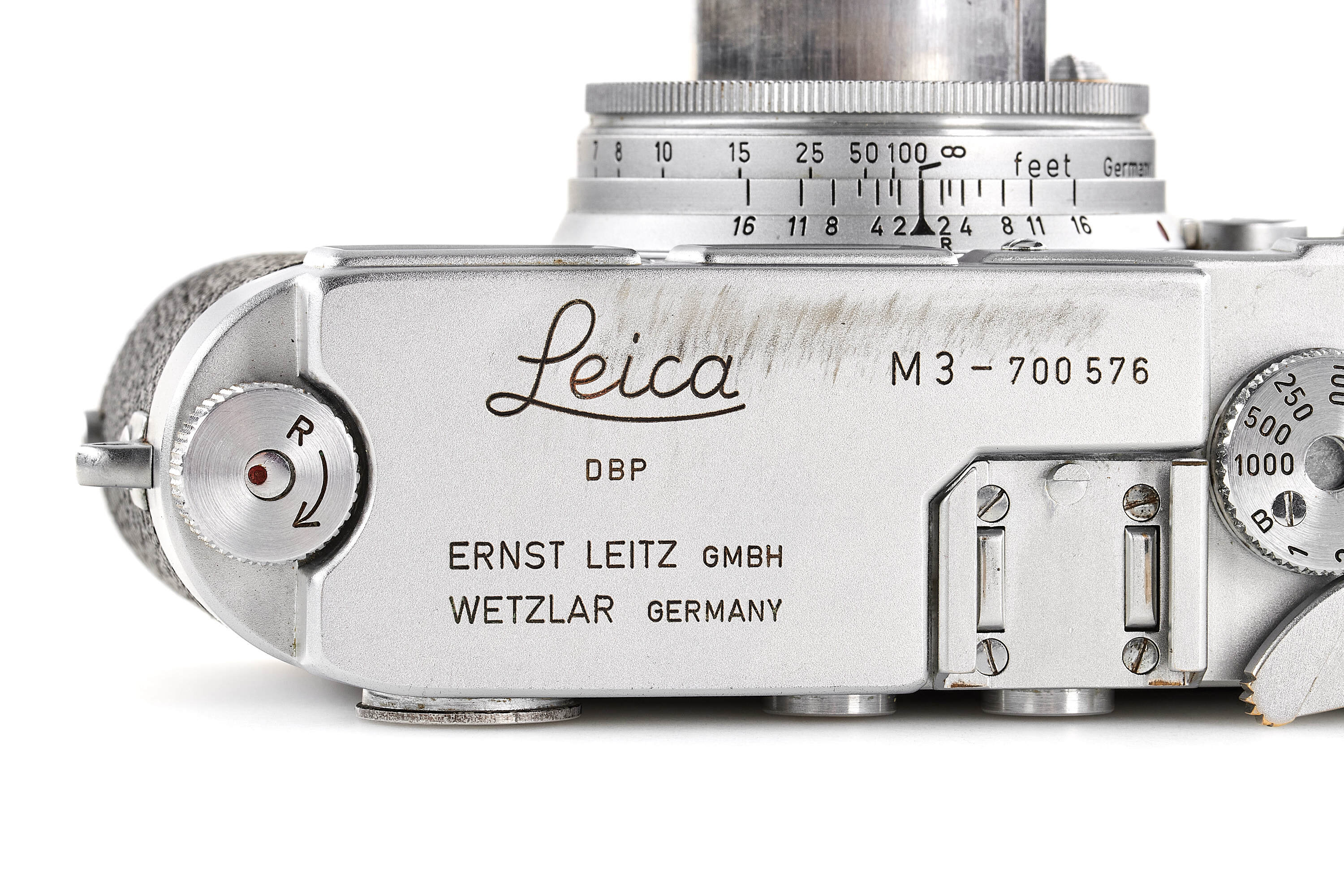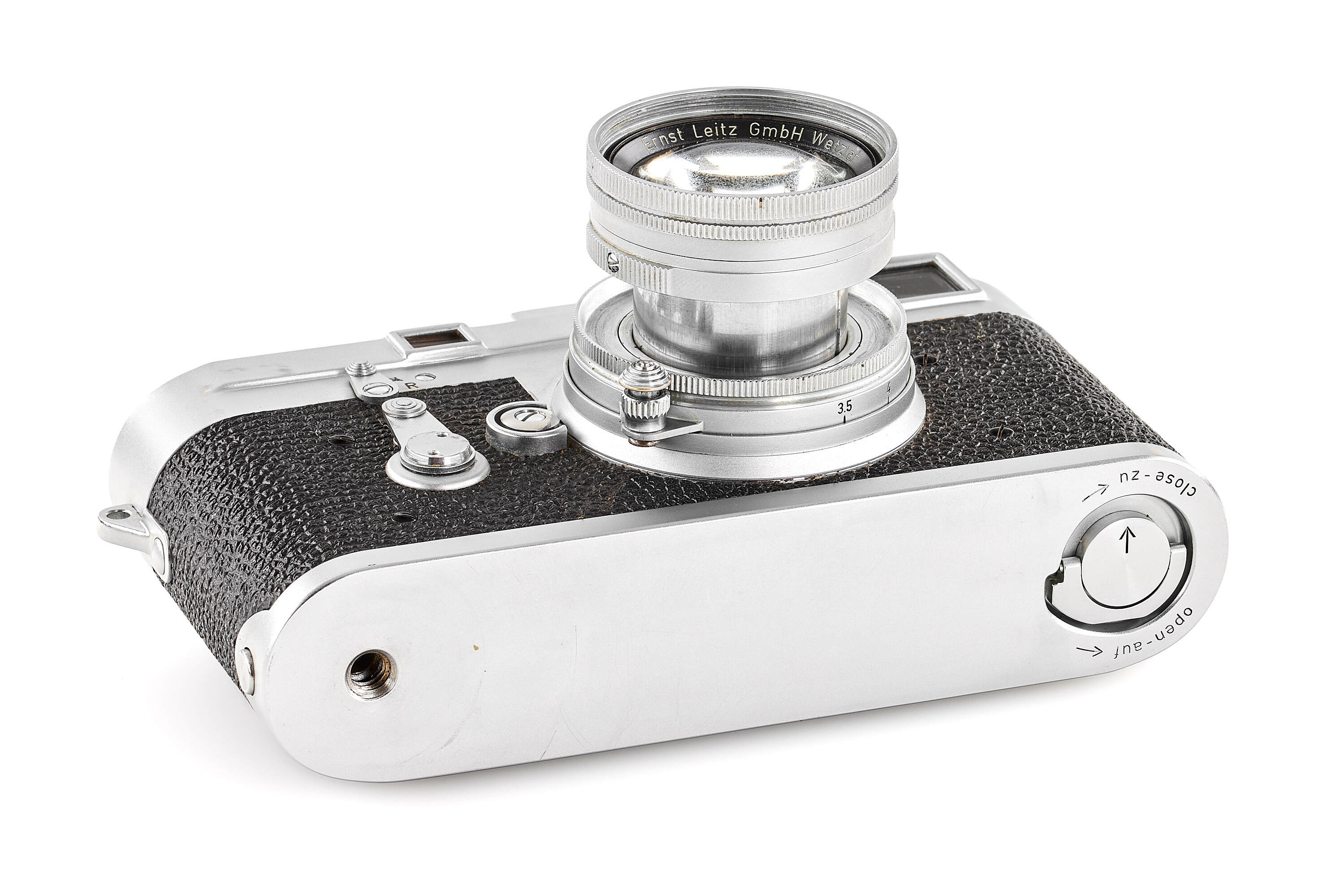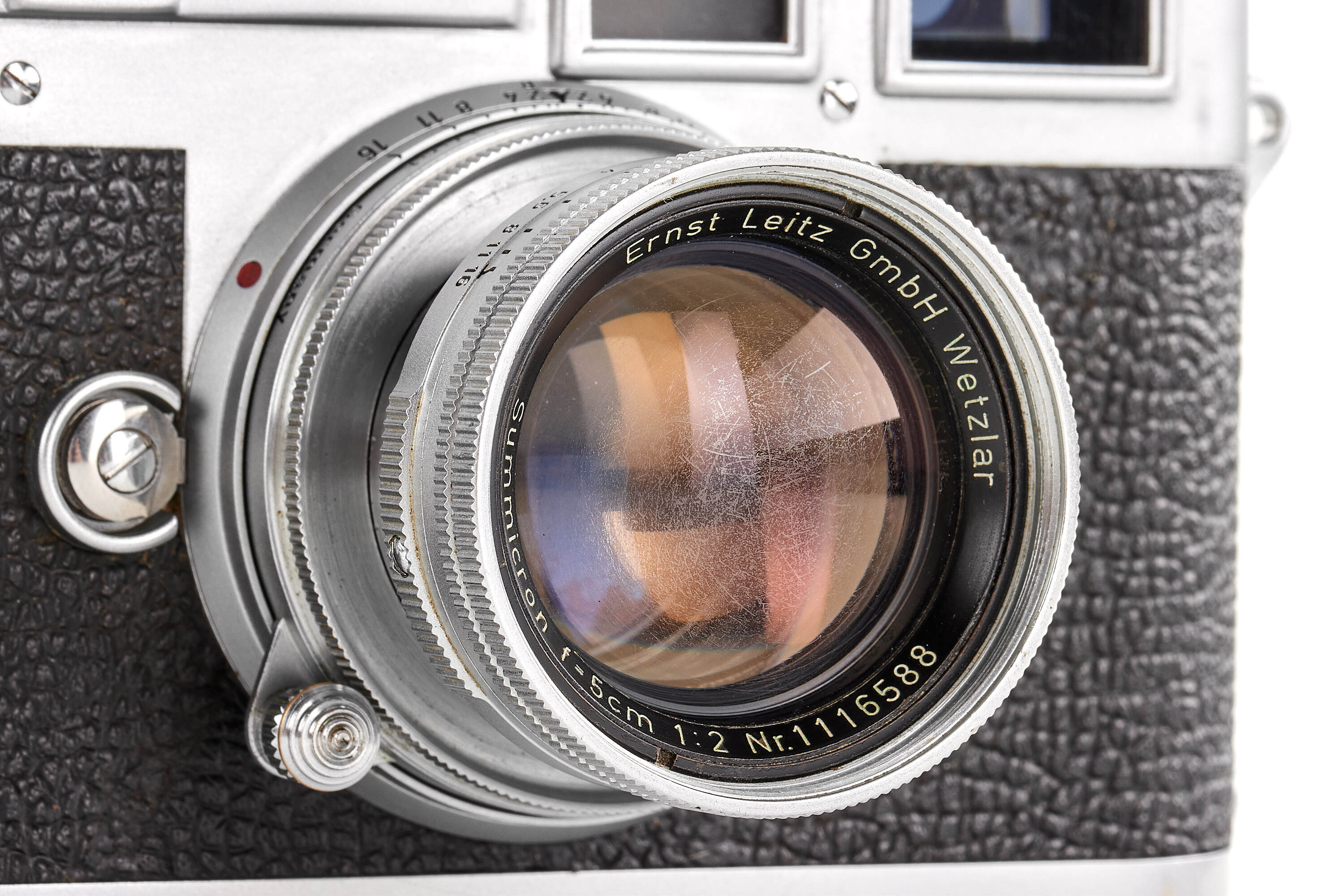 Very early M3 body with a distinctive corner at the front of the top plate (only found on the earliest examples of the Leica M3), with all original features like the early casting type (guss number 455), long strap lugs, no 'L'-seal, early viewfinder and back door, the camera is in very good condition, showing some repair in the vulcanite, with matching very early collapsible Summicron 2/5cm no.1116588 with Thorium glass elements, feet scale version showing cleaning marks on the front element, with eveready case, both camera and lens were delivered to Manca, New York on 12.03.1954.