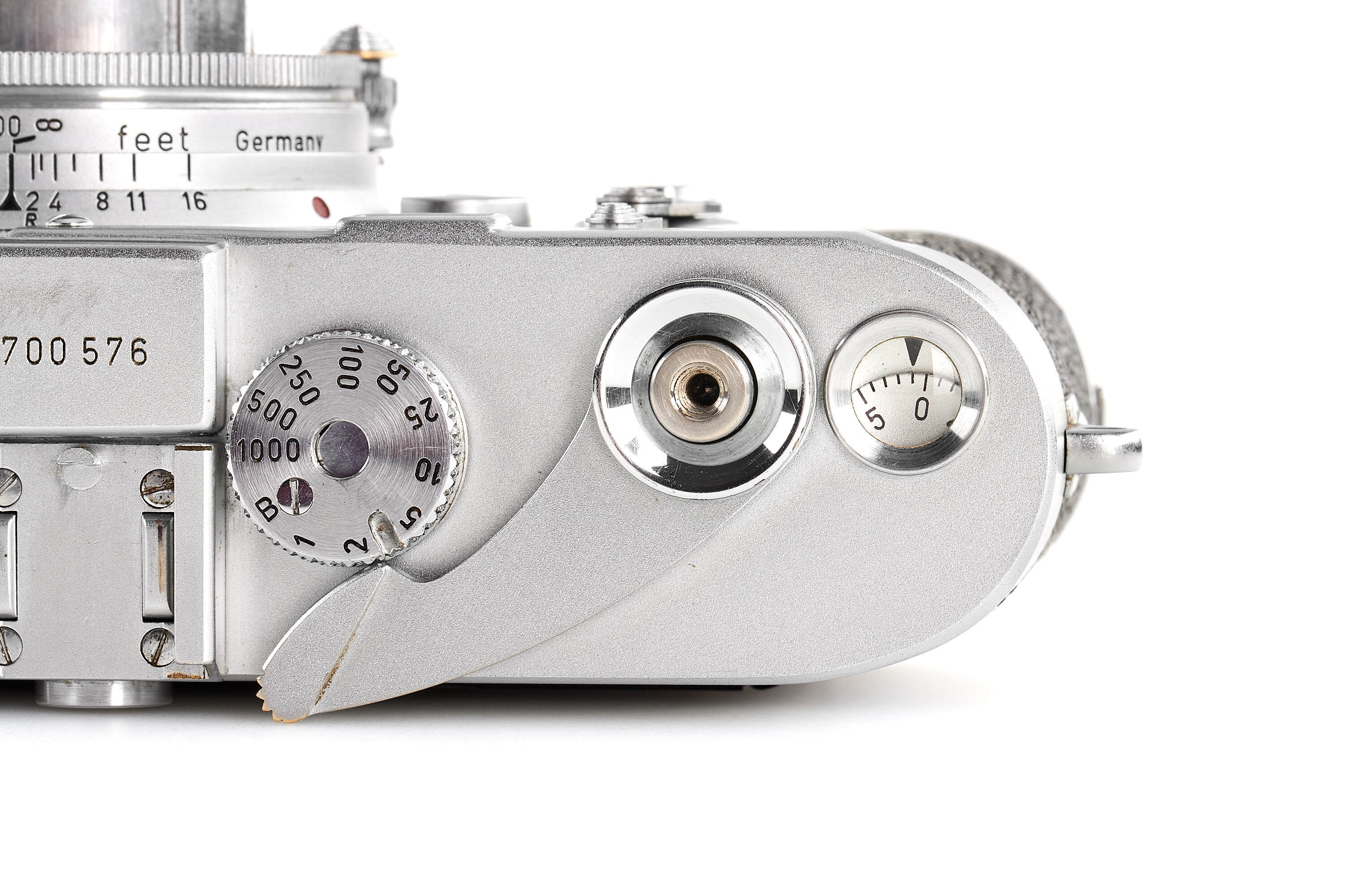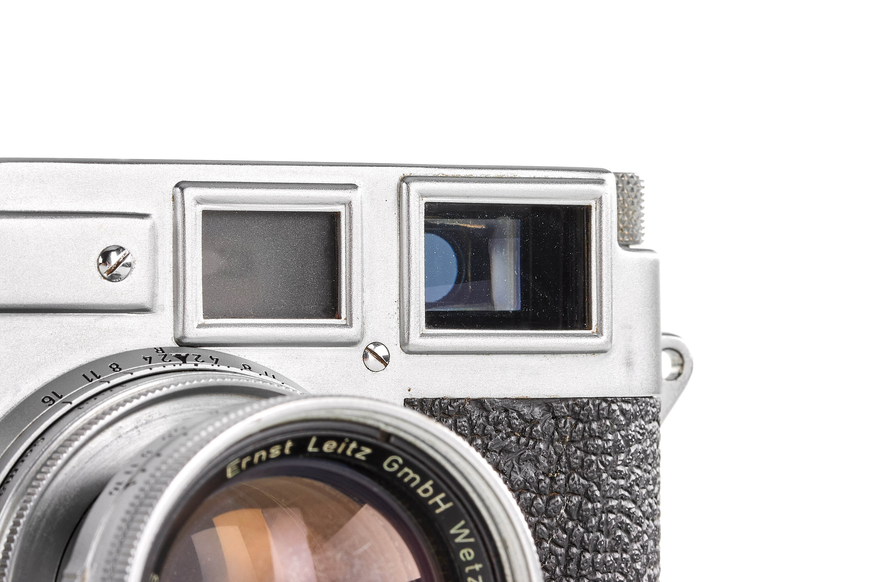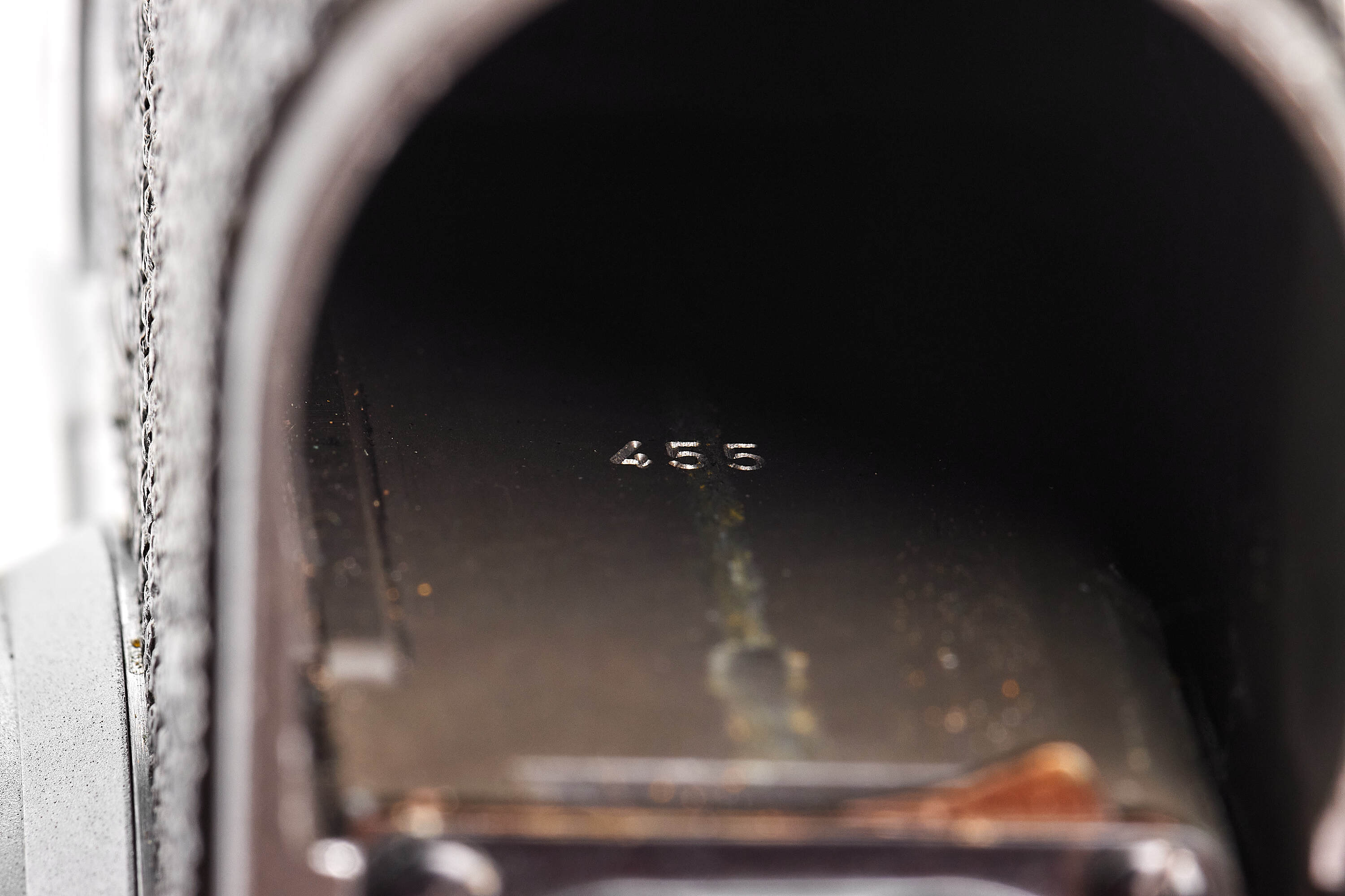 Very early M3 body with a distinctive corner at the front of the top plate (only found on the earliest examples of the Leica M3), with all original features like the early casting type (guss number 455), long strap lugs, no 'L'-seal, early viewfinder and back door, the camera is in very good condition, showing some repair in the vulcanite, with matching very early collapsible Summicron 2/5cm no.1116588 with Thorium glass elements, feet scale version showing cleaning marks on the front element, with eveready case, both camera and lens were delivered to Manca, New York on 12.03.1954.