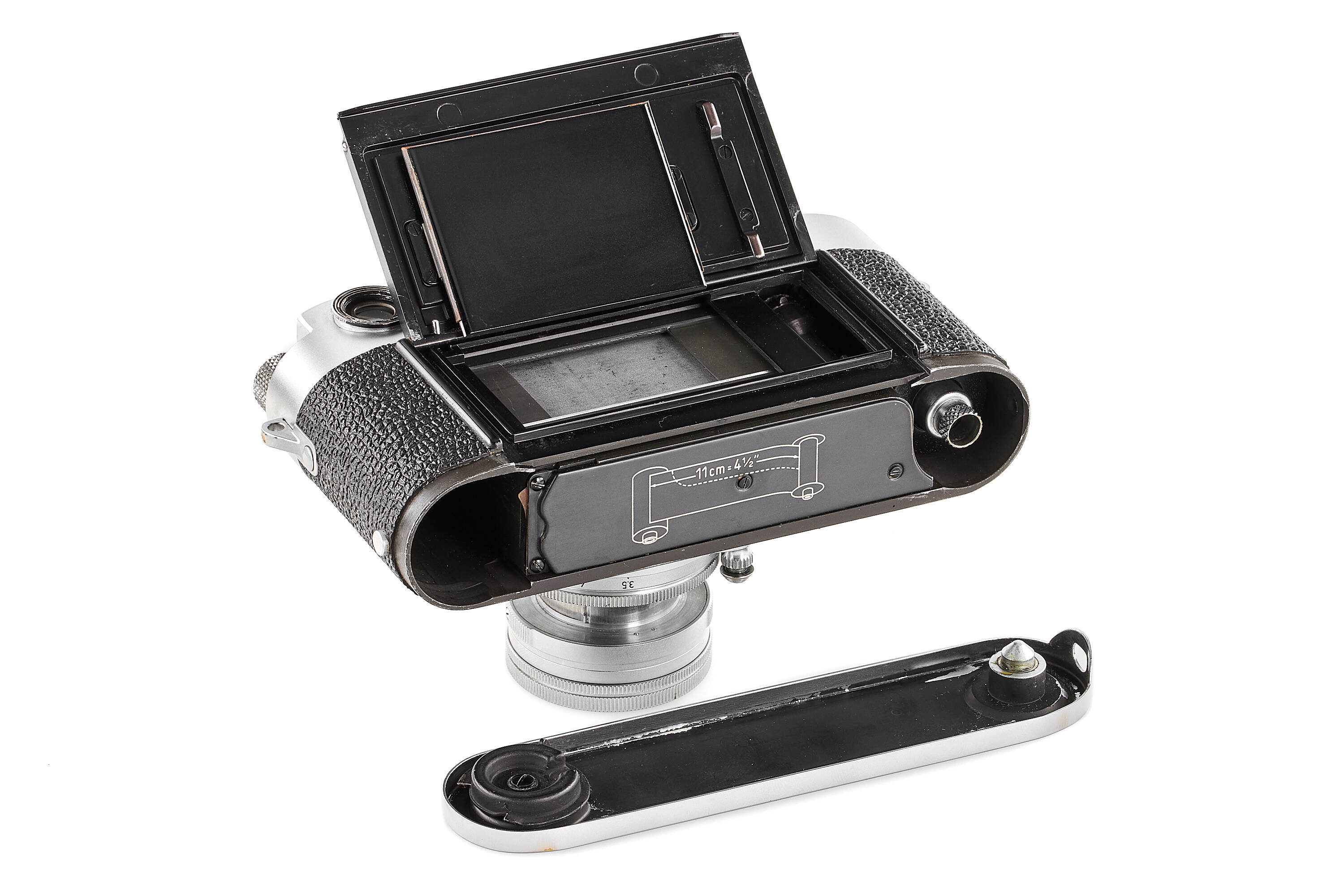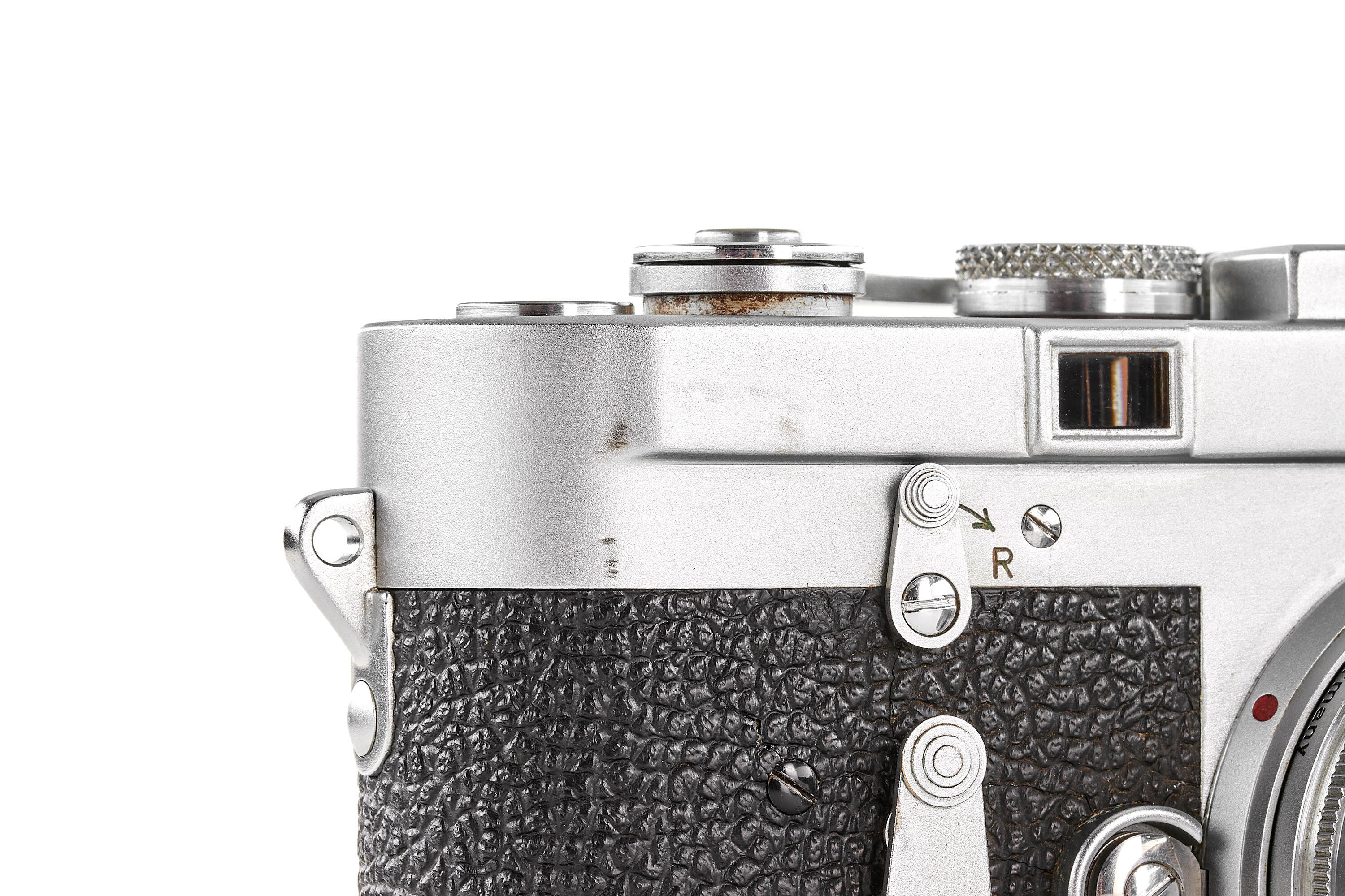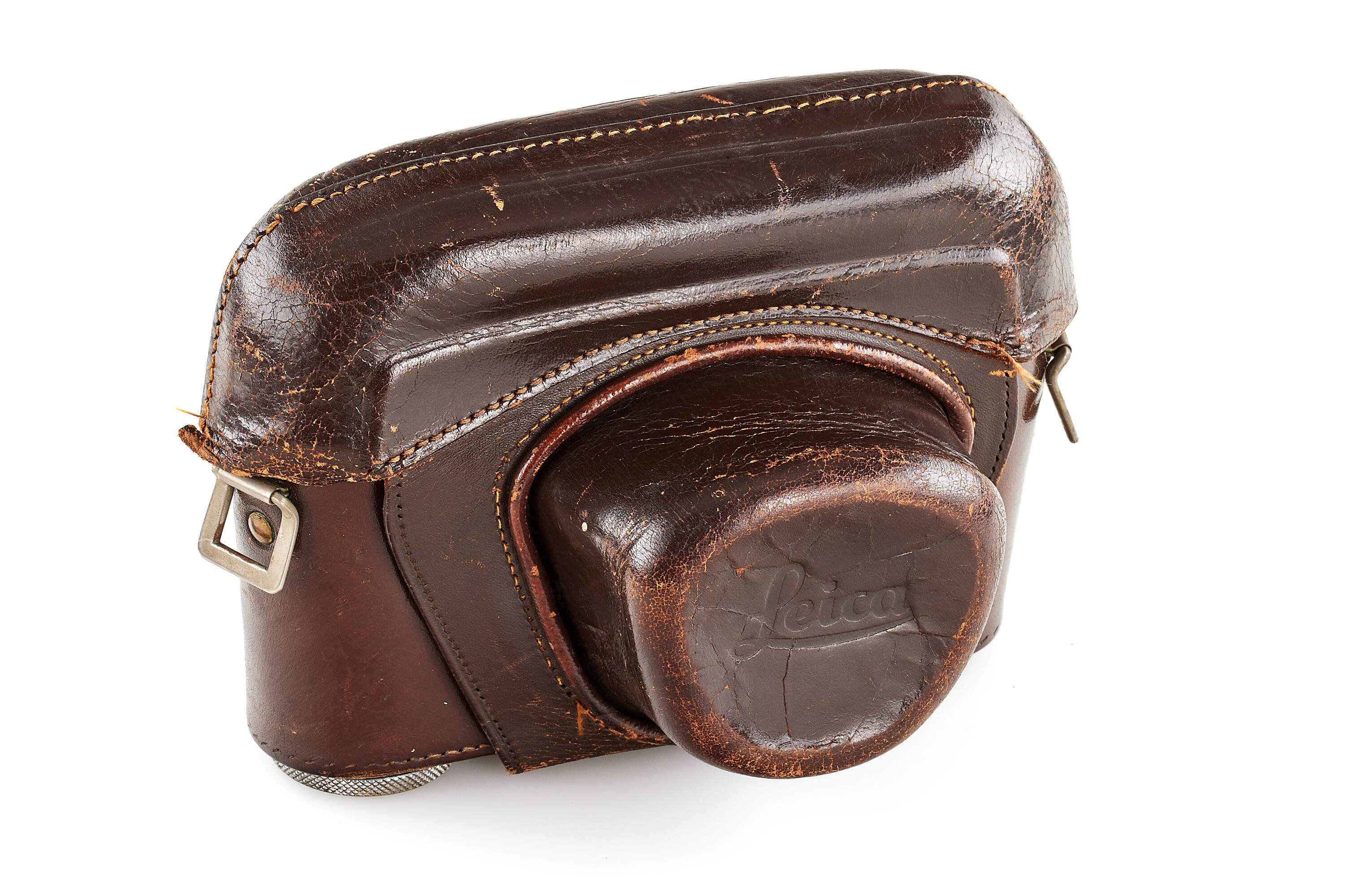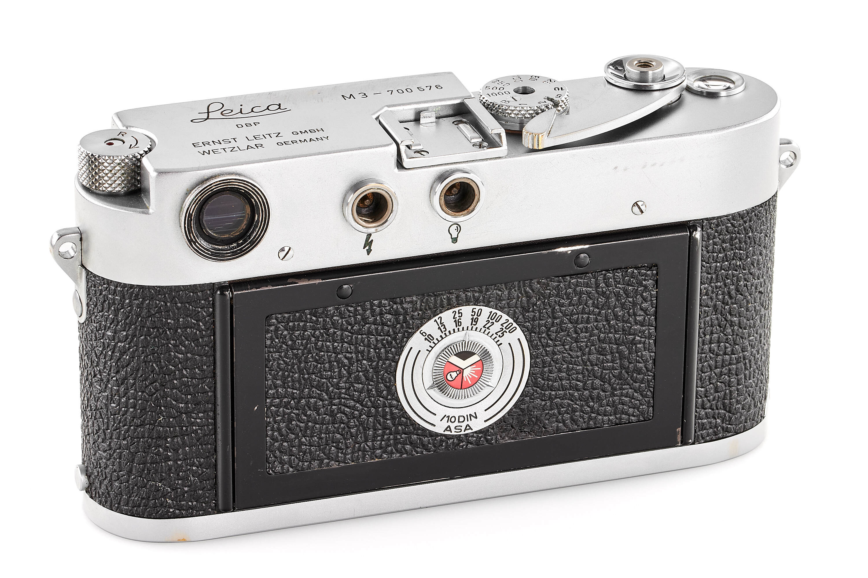 Very early M3 body with a distinctive corner at the front of the top plate (only found on the earliest examples of the Leica M3), with all original features like the early casting type (guss number 455), long strap lugs, no 'L'-seal, early viewfinder and back door, the camera is in very good condition, showing some repair in the vulcanite, with matching very early collapsible Summicron 2/5cm no.1116588 with Thorium glass elements, feet scale version showing cleaning marks on the front element, with eveready case, both camera and lens were delivered to Manca, New York on 12.03.1954.