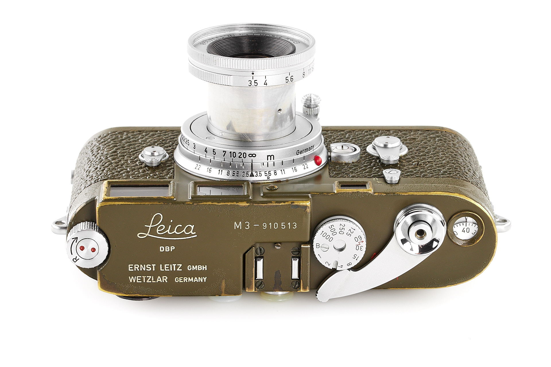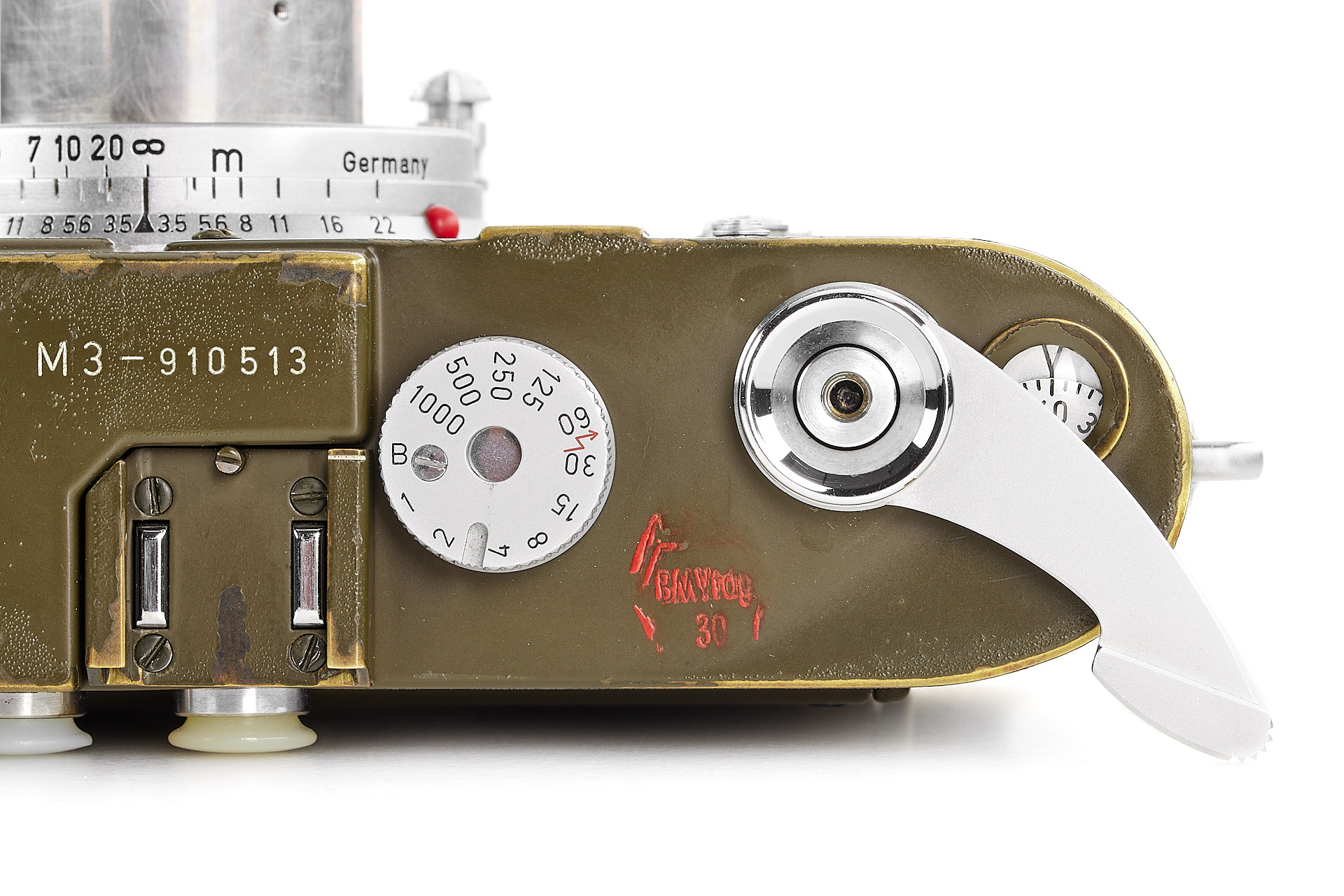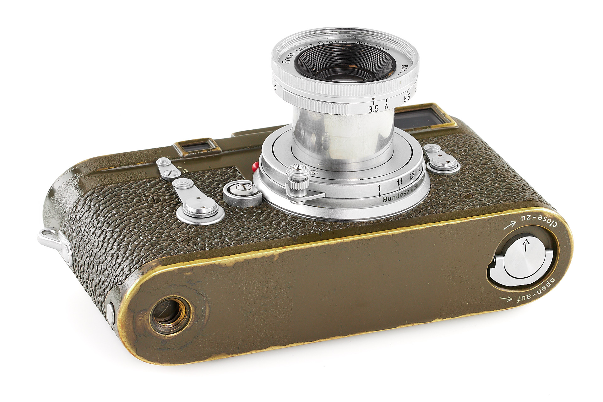 When the West German Army (Bundeswehr) was established after 1955, the Leica M cameras formed a large share of the photographic 35mm cameras ordered for the troops. Rare versions are the Leica M3, M1 and later M4 models in the olive paint finish. Leica Produced less than 300 M3 cameras in this finish. The offered example comes from the earliest small batch delivered to the German army in January 1958 and is the 13th olive green M3 made!