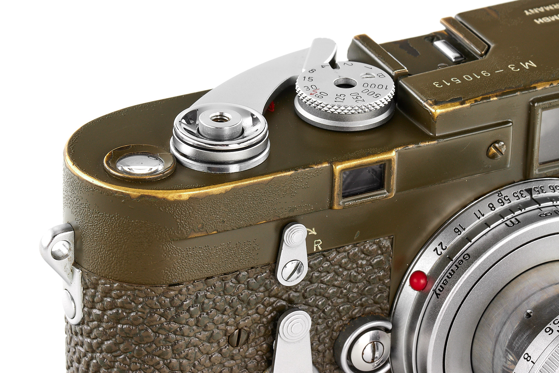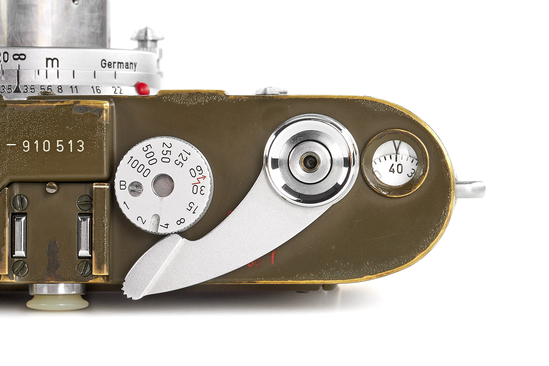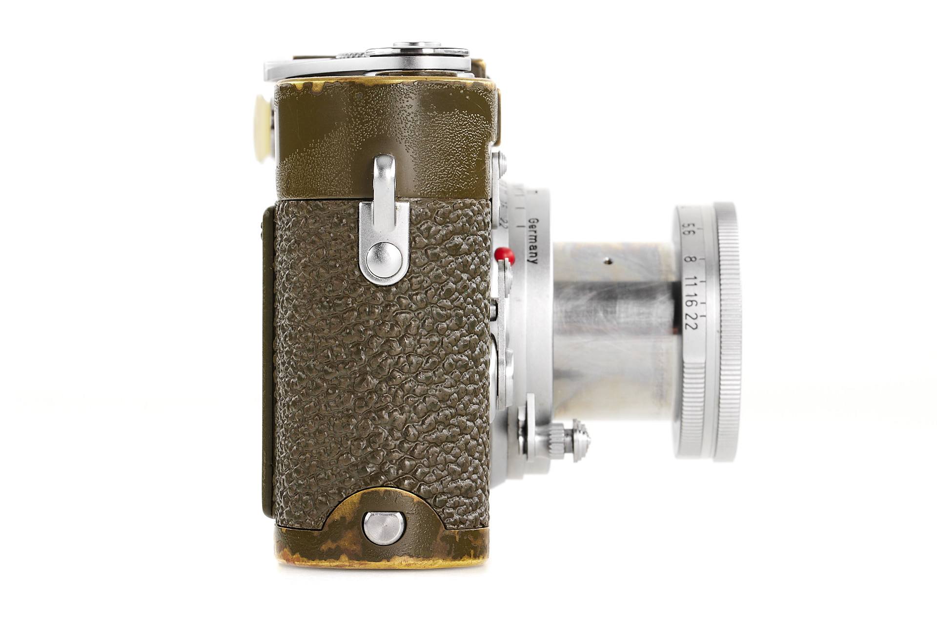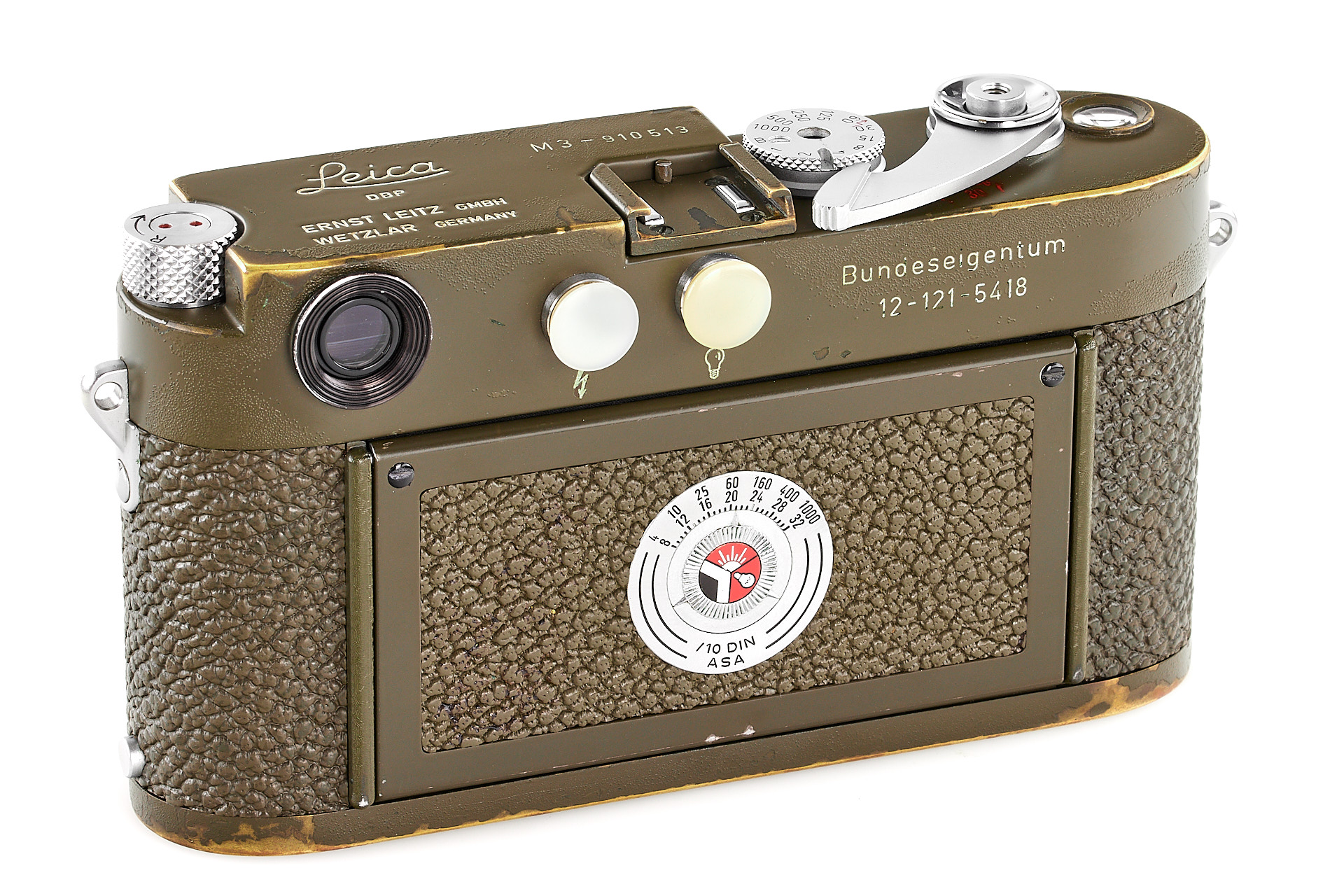 When the West German Army (Bundeswehr) was established after 1955, the Leica M cameras formed a large share of the photographic 35mm cameras ordered for the troops. Rare versions are the Leica M3, M1 and later M4 models in the olive paint finish. Leica Produced less than 300 M3 cameras in this finish. The offered example comes from the earliest small batch delivered to the German army in January 1958 and is the 13th olive green M3 made!