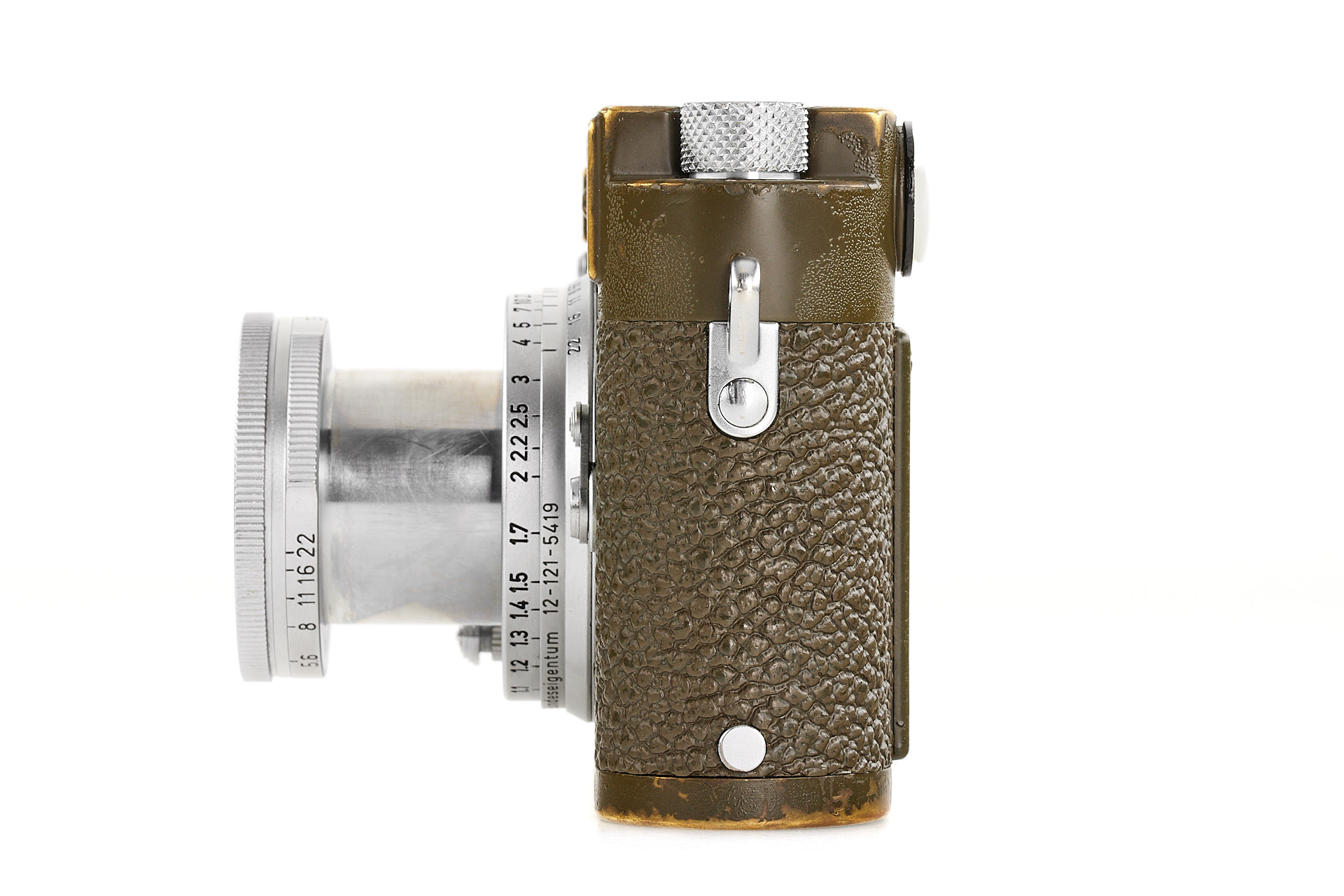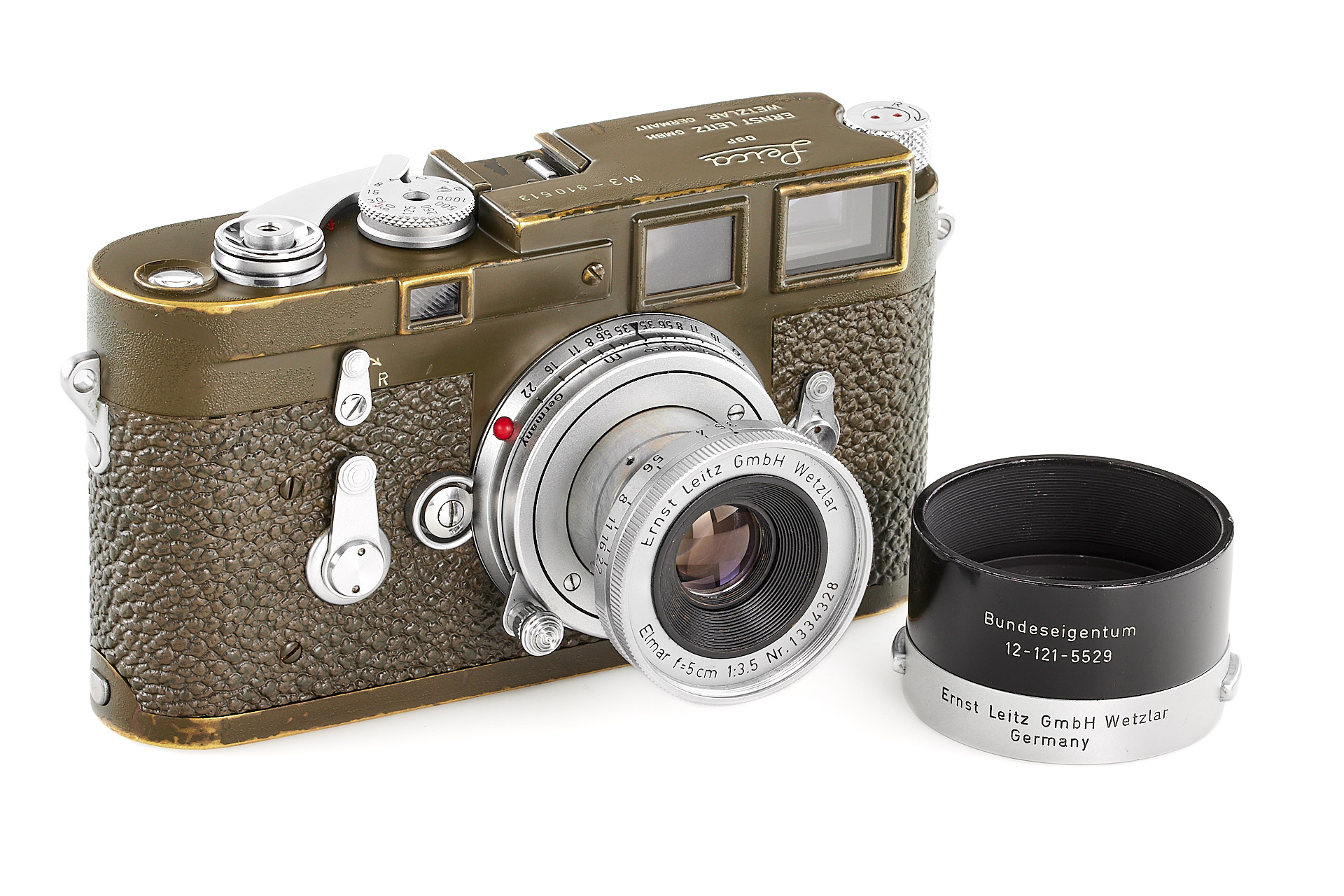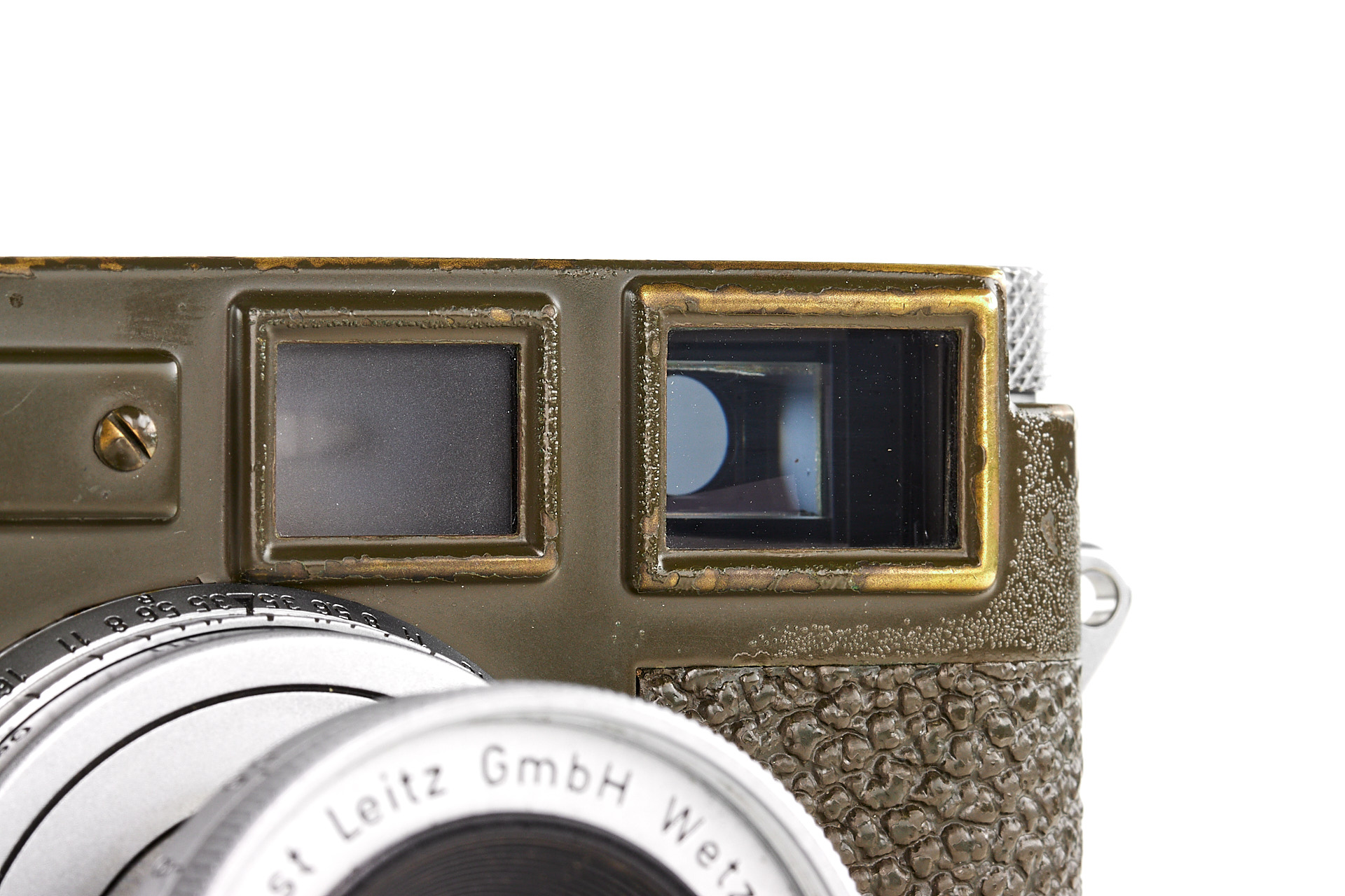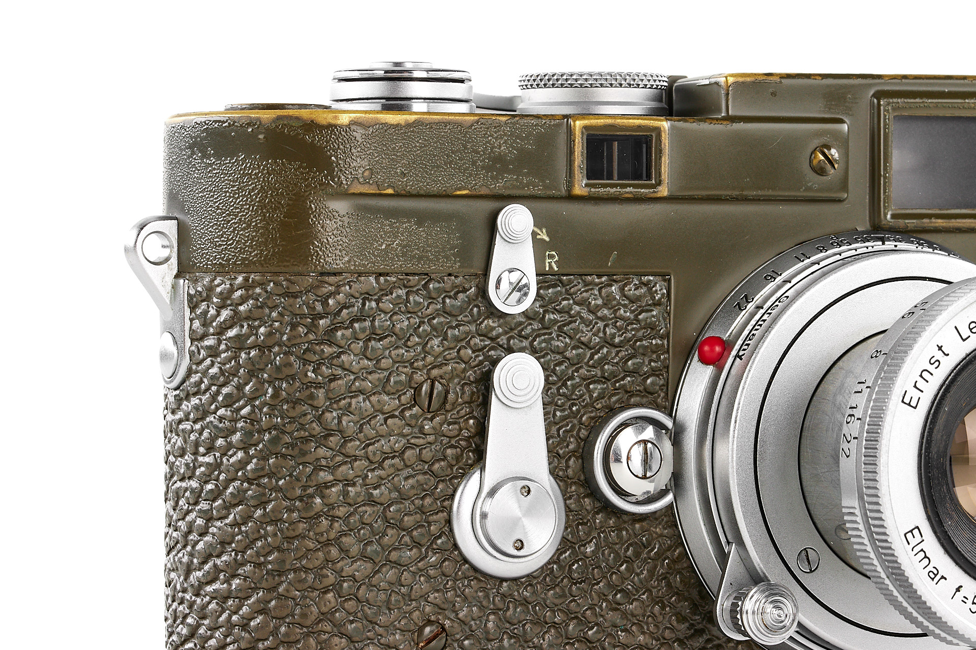 Very rare early version olive paint Leica M3 'Bundeswehr' from the first production batch, with long strap lugs and double stroke advance, in good, original condition and in perfect working order, with beautiful patina and small bubbles appearing in paint. Engraved 'Bundeseigentum 12-121-5418' on the top plate, with matching Elmar 3.5/5cm no.1334328 engraved 'Bundeseigentum 12-121-5419', ITOOY hood engraved 'Bundeseigentum 12-121-5529'.