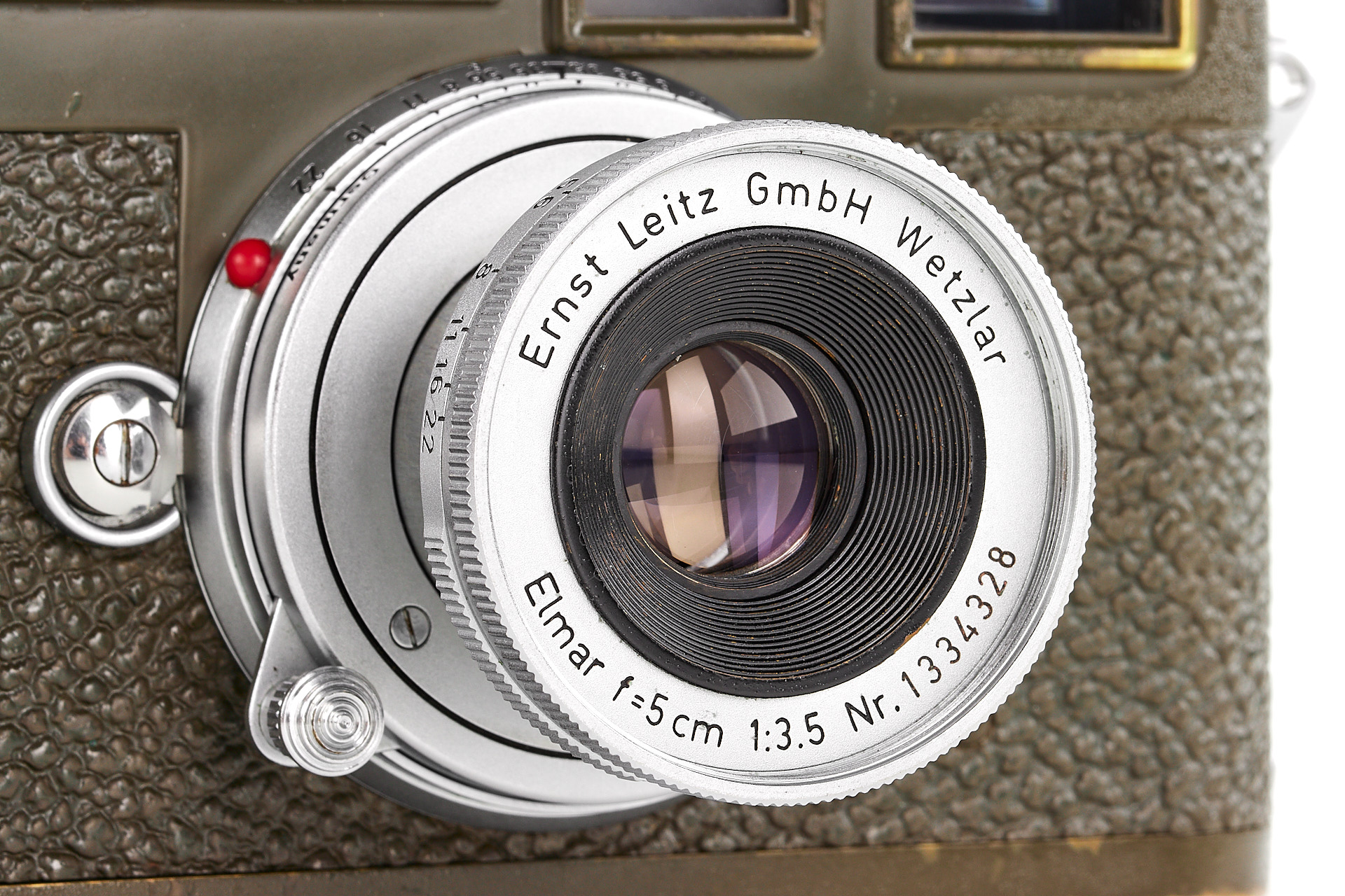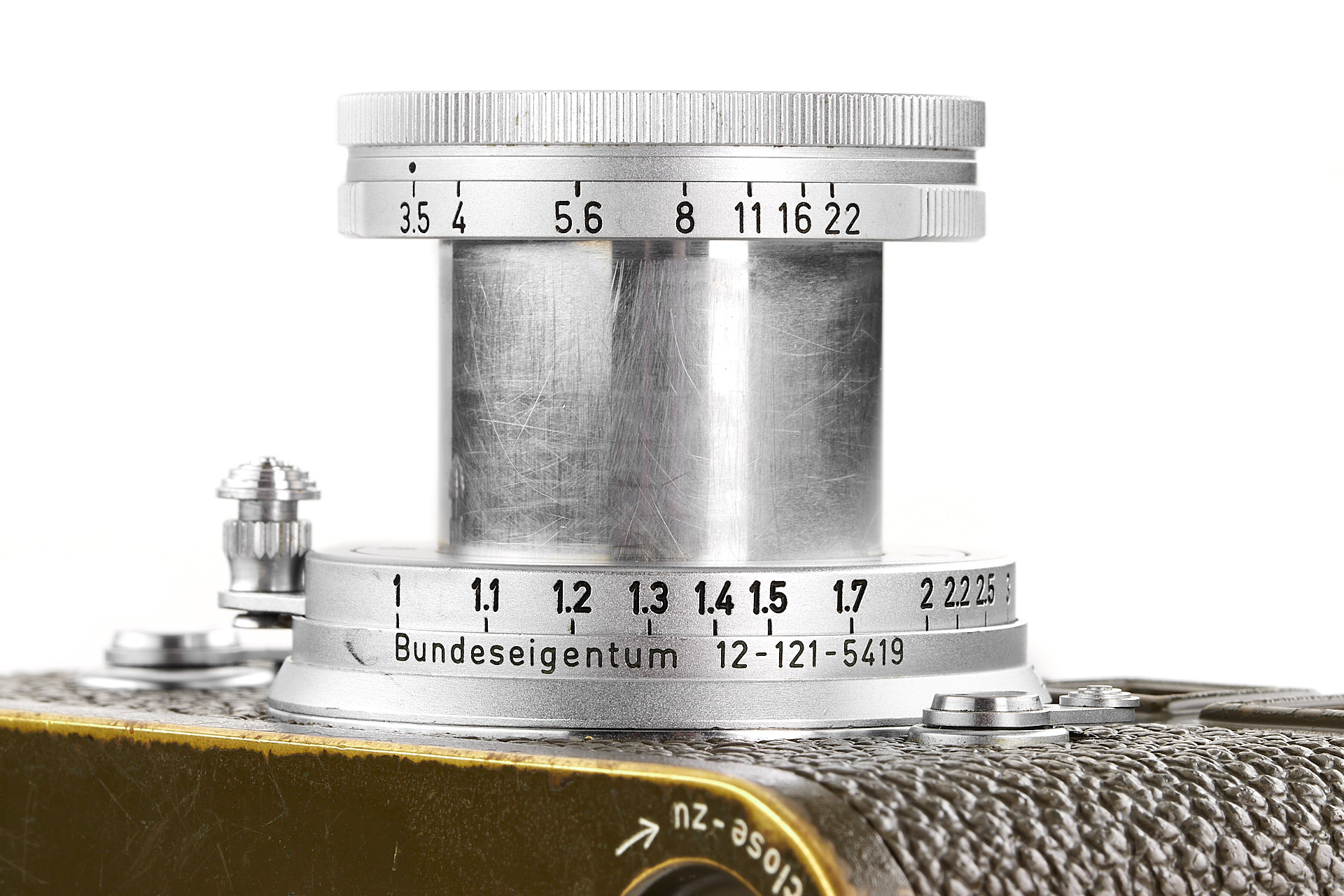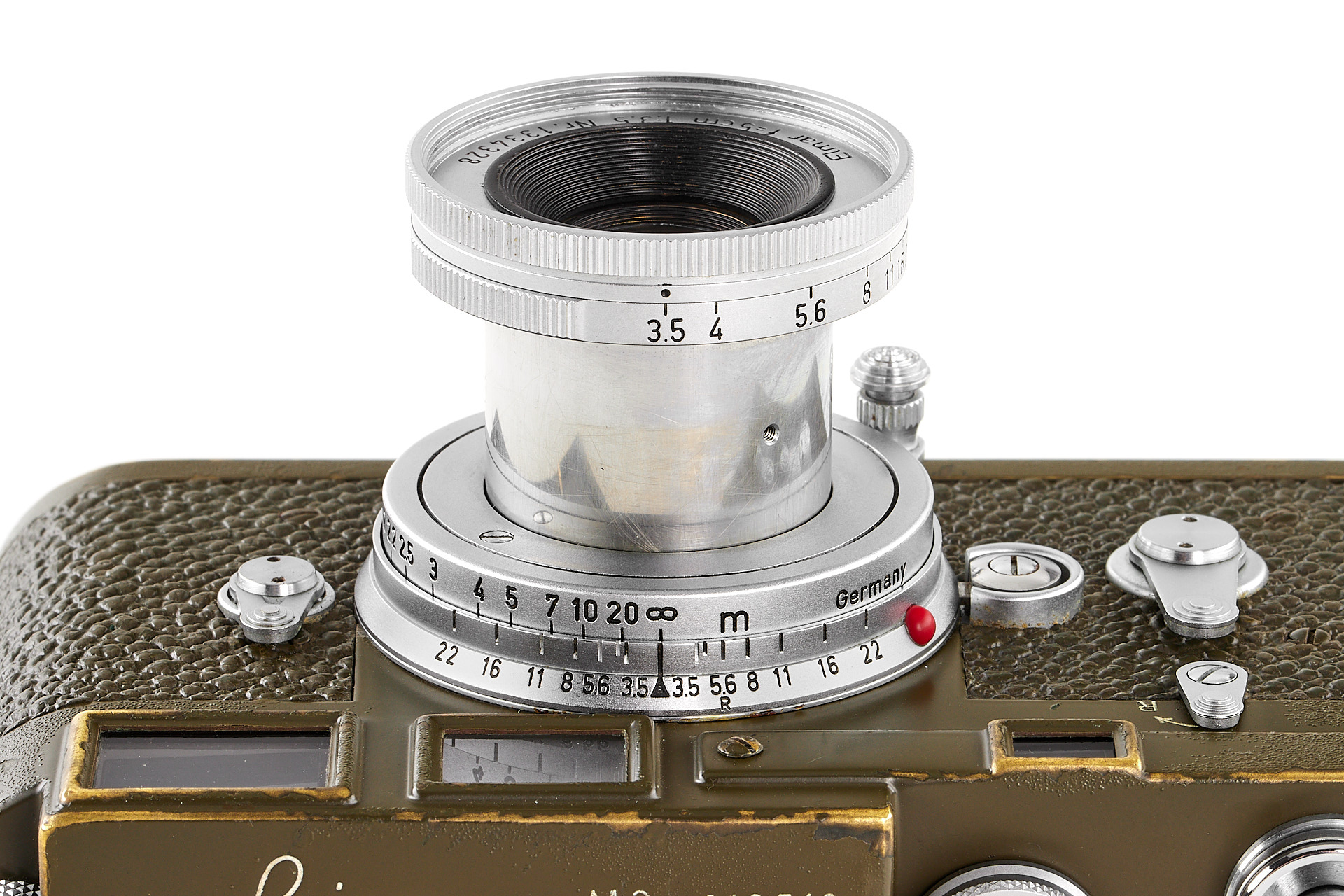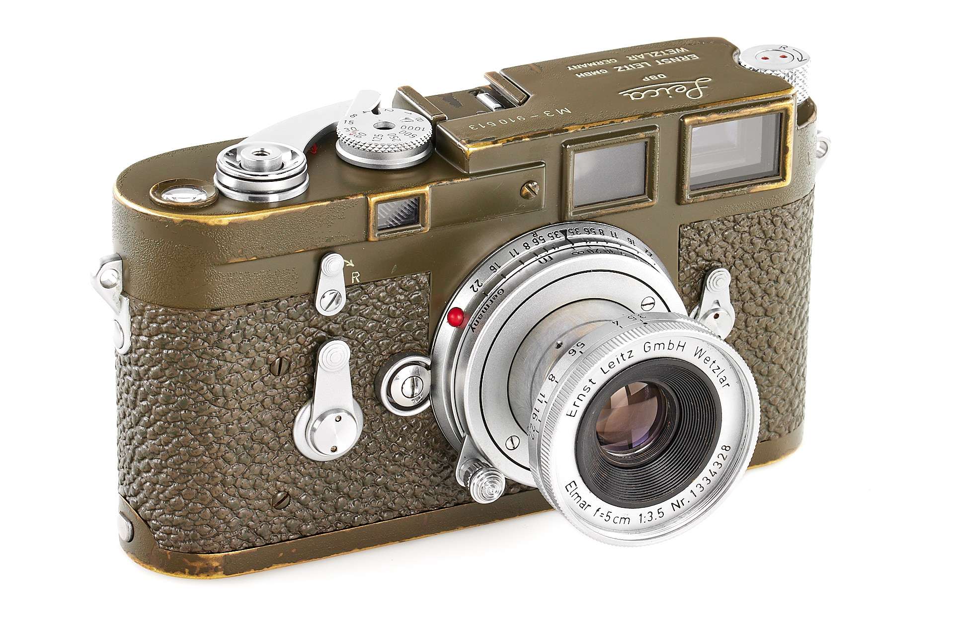 Very rare early version olive paint Leica M3 'Bundeswehr' from the first production batch, with long strap lugs and double stroke advance, in good, original condition and in perfect working order, with beautiful patina and small bubbles appearing in paint. Engraved 'Bundeseigentum 12-121-5418' on the top plate, with matching Elmar 3.5/5cm no.1334328 engraved 'Bundeseigentum 12-121-5419', ITOOY hood engraved 'Bundeseigentum 12-121-5529'.
