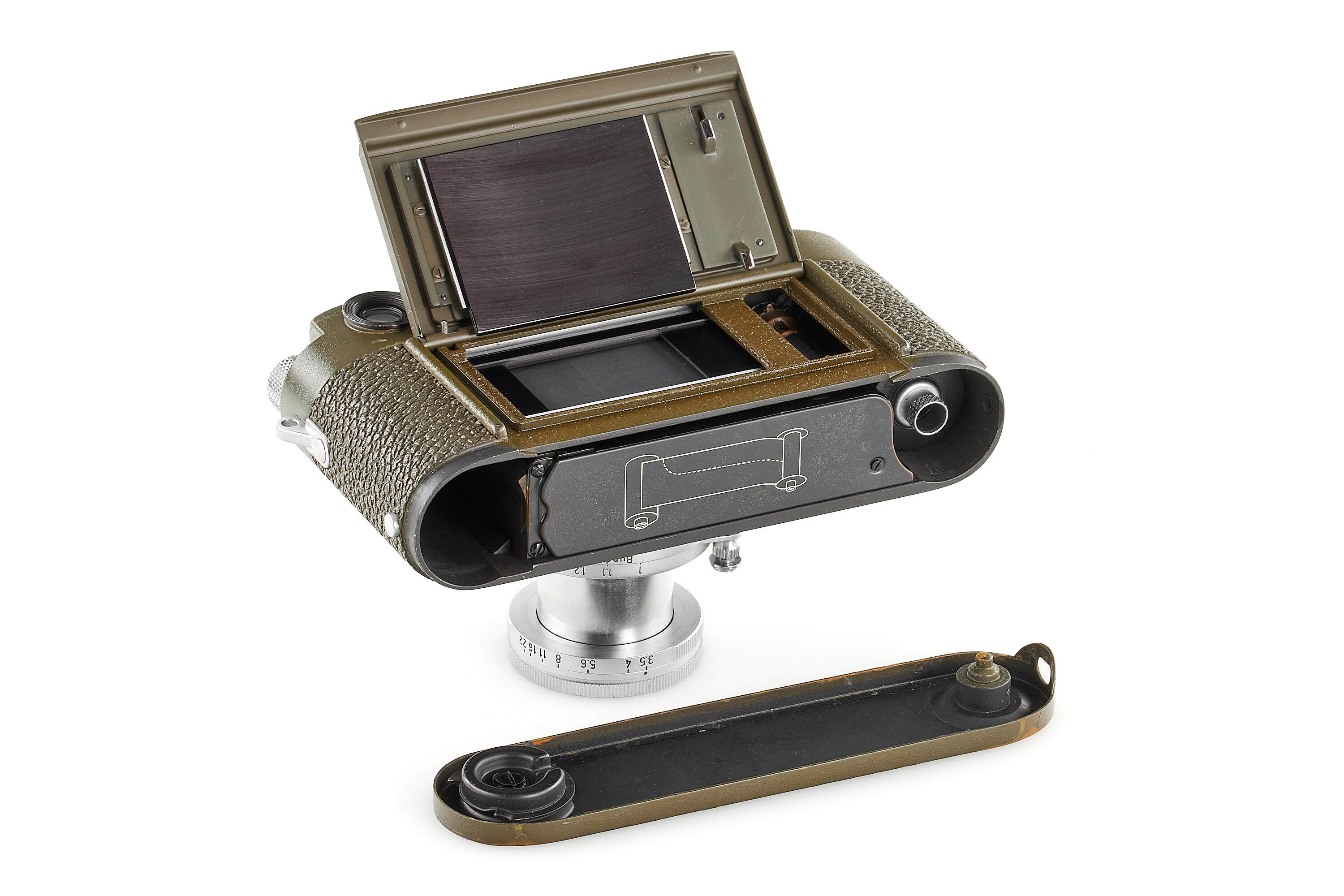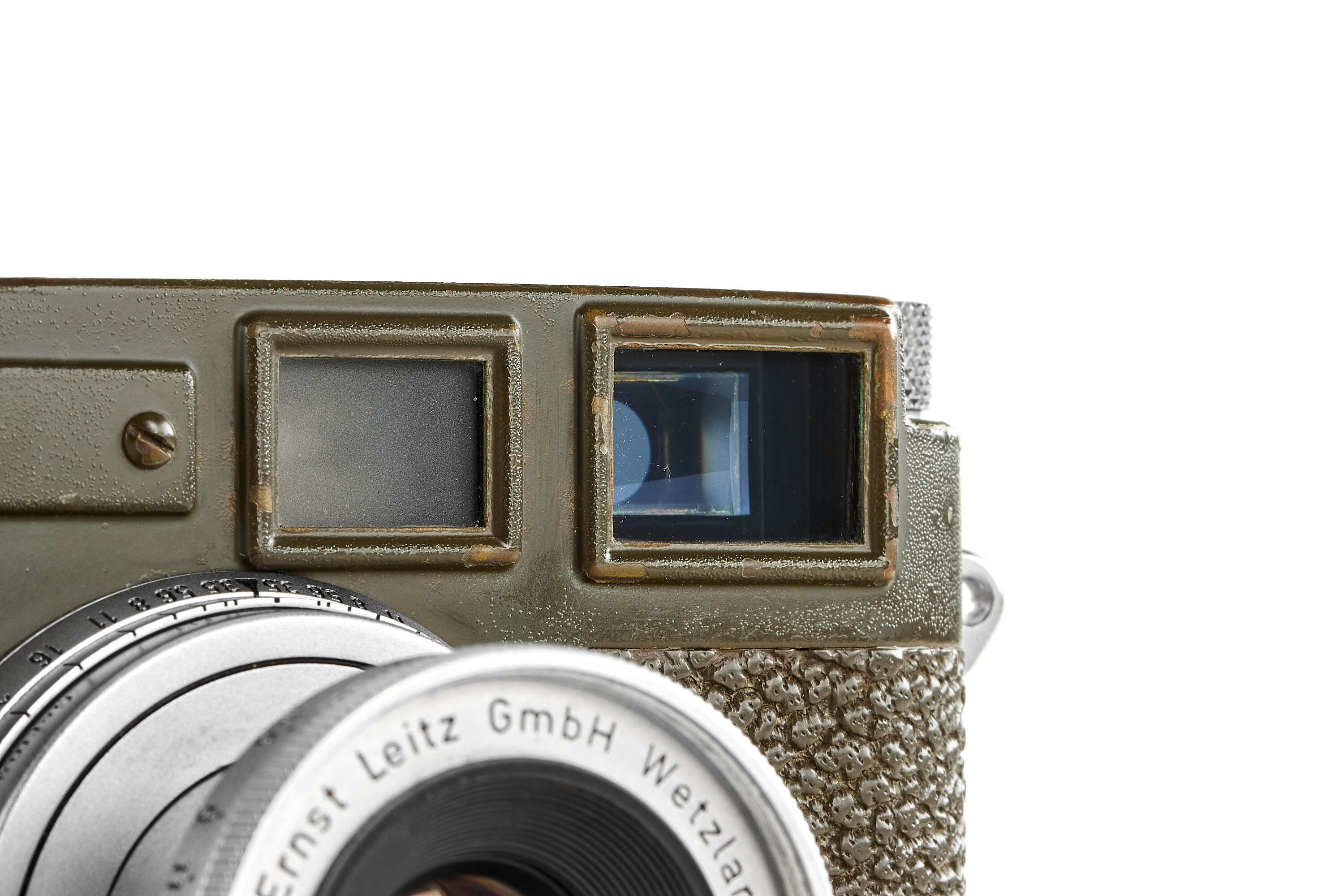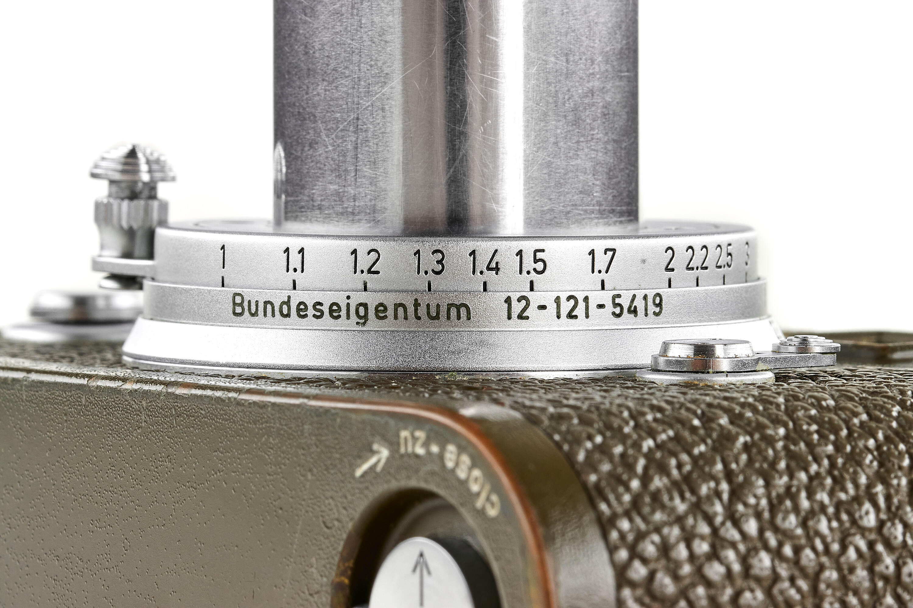 When the West German Army (Bundeswehr) was established after 1955, the Leica M cameras formed a large share of the photographic 35mm cameras ordered for the troops. Rare versions are the Leica M3, M1 and later M4 models in the olive paint finish. Leica produced less than 300 M3 cameras in this finish. The offered example comes from the earliest small batch delivered to the German army in January 1958 and is the 37th olive green M3 made!