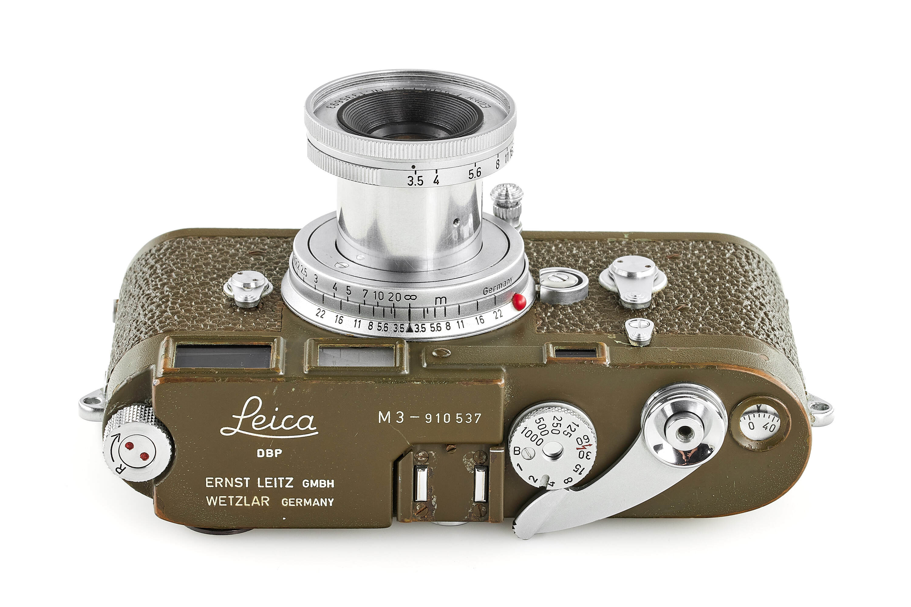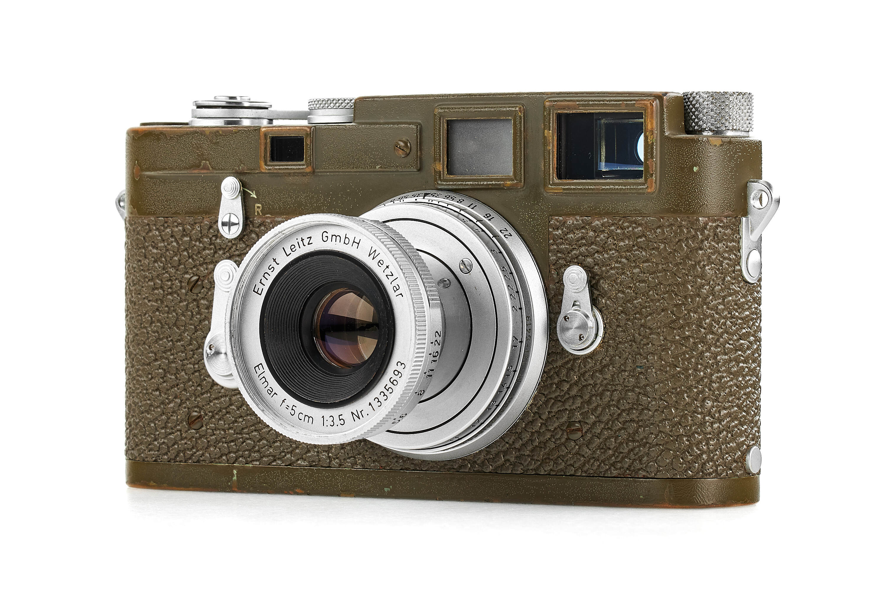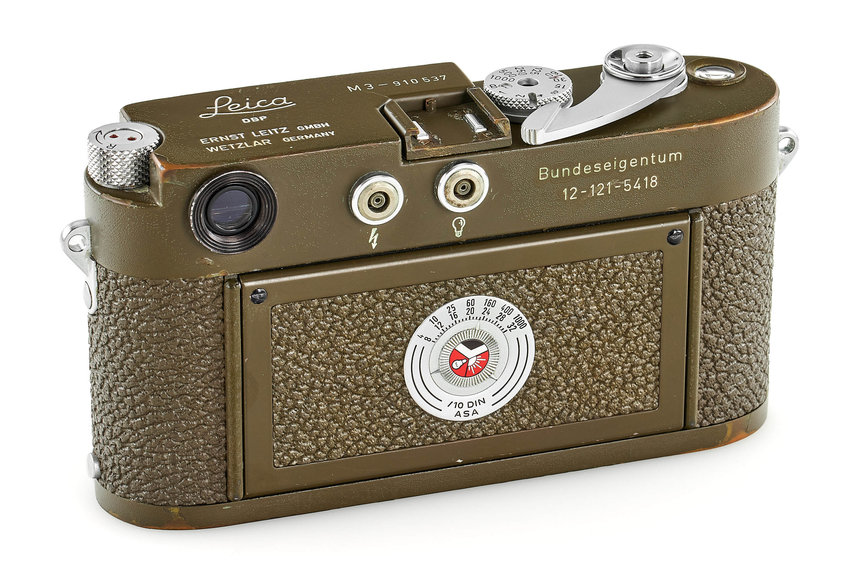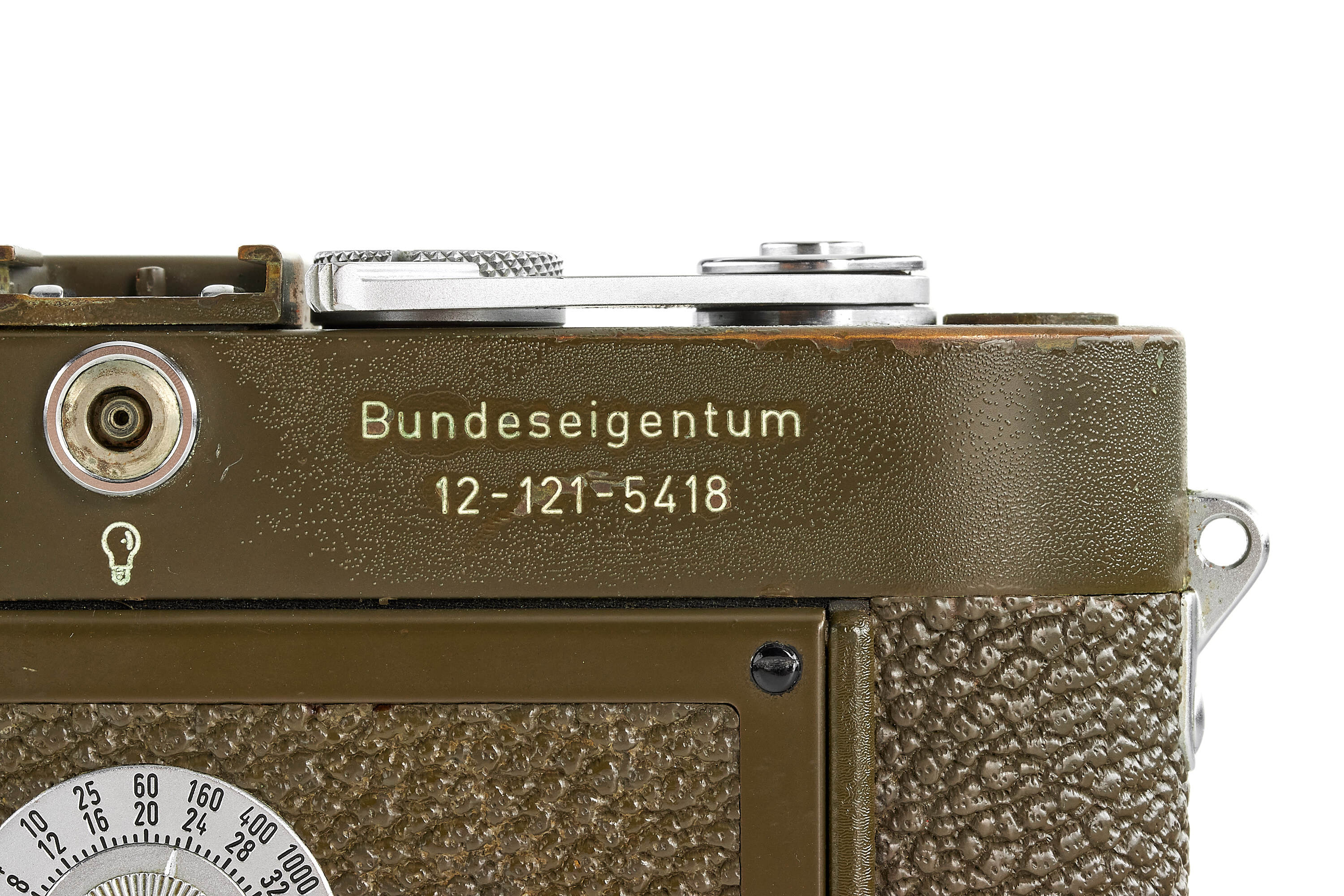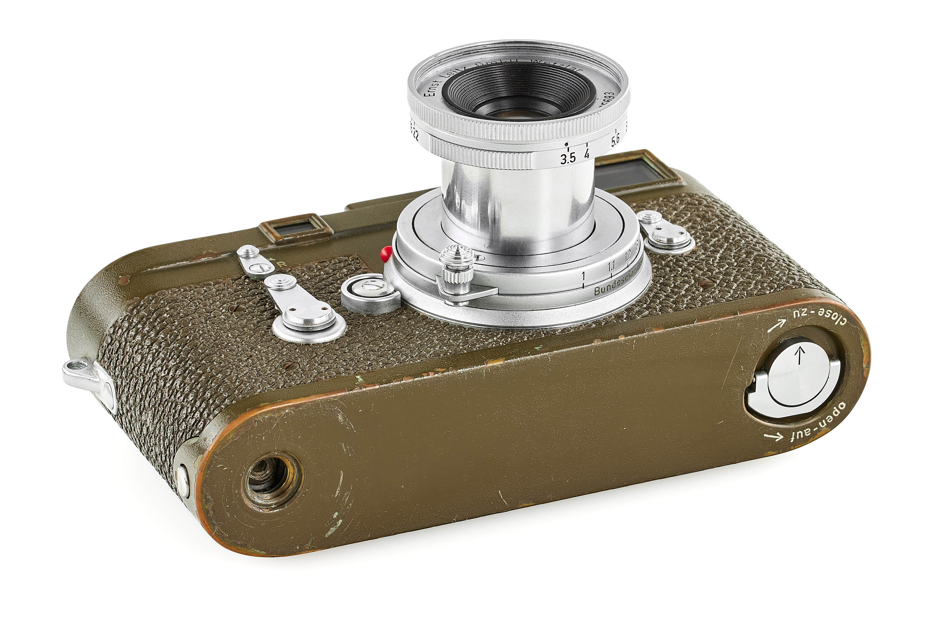 Very rare early version olive paint Leica M3 'Bundeswehr' from the first production batch, with long strap lugs and double stroke advance, in good, original condition, showing a beautiful patina, small bubbles appearing in paint, engraved 'Bundeseigentum 12-121-5418' on the rear of the top plate, together with matching Elmar 3.5/5cm no.1335693 engraved 'Bundeseigentum 12-121-5419' (front lens cap) and Leica-Meter MC no.49780 engraved 'Bundeseigentum 12-121-5603' (including a green leather etui for the meter stamped with 'Bundeseigentum 12-121-5710).