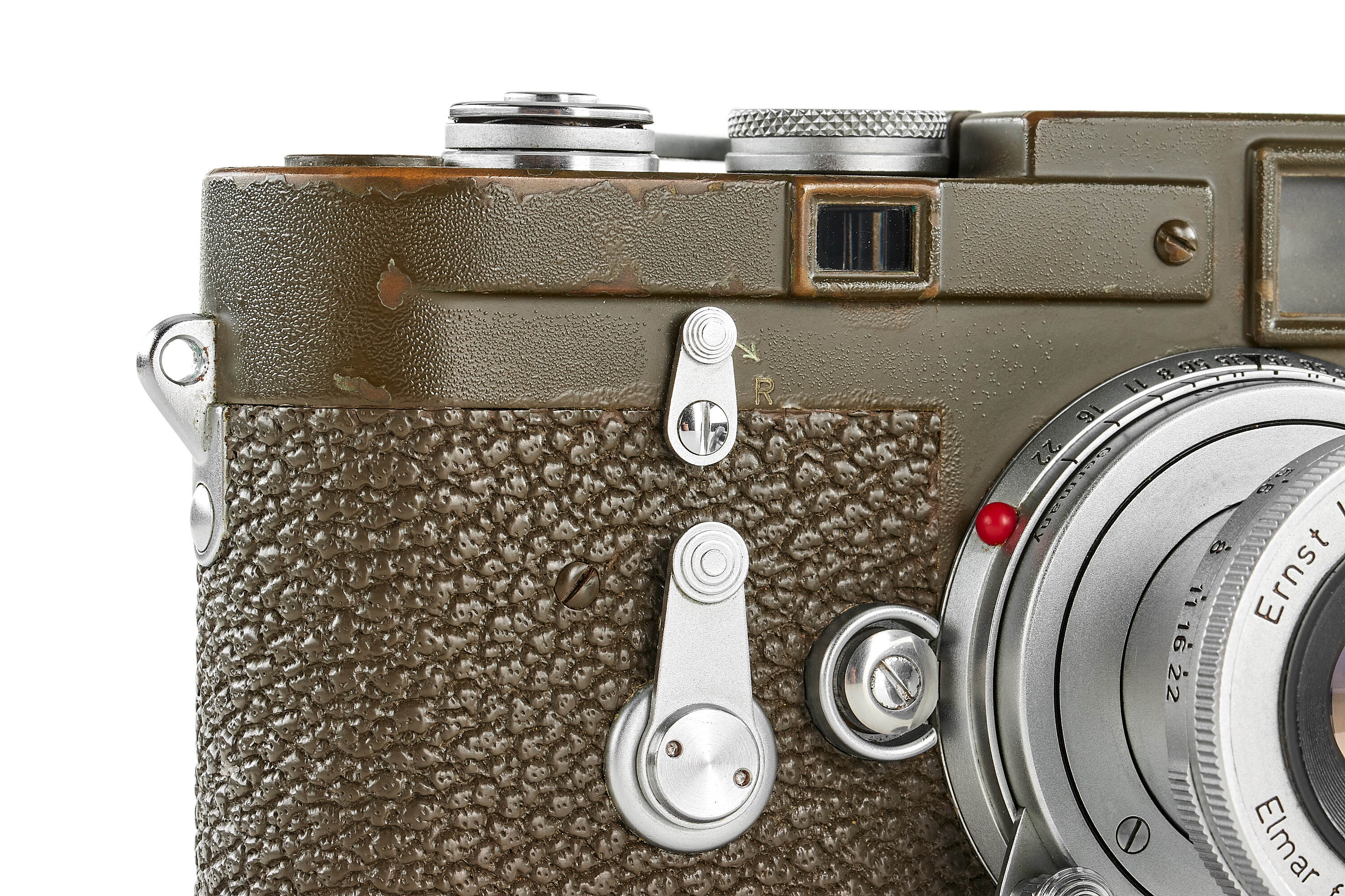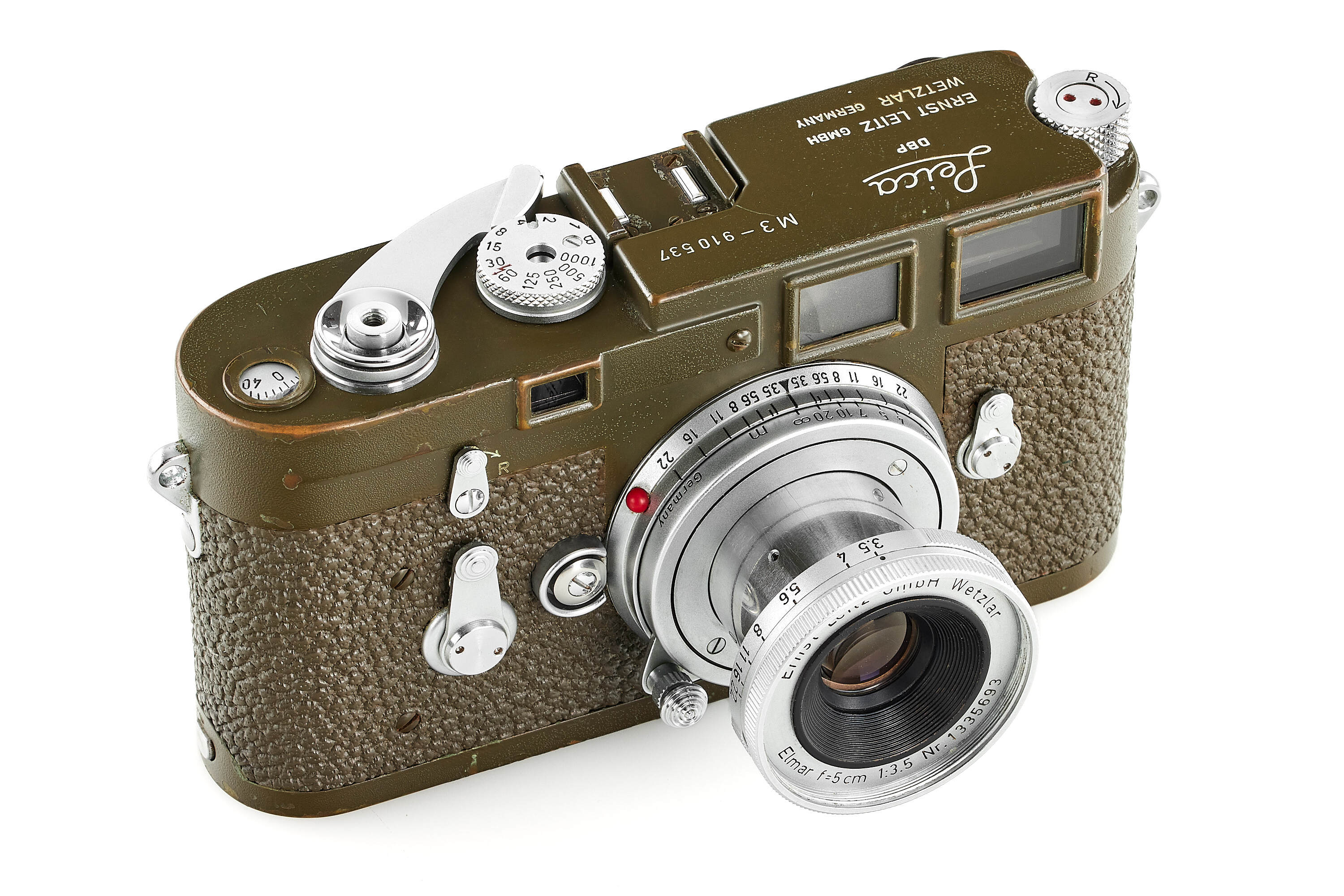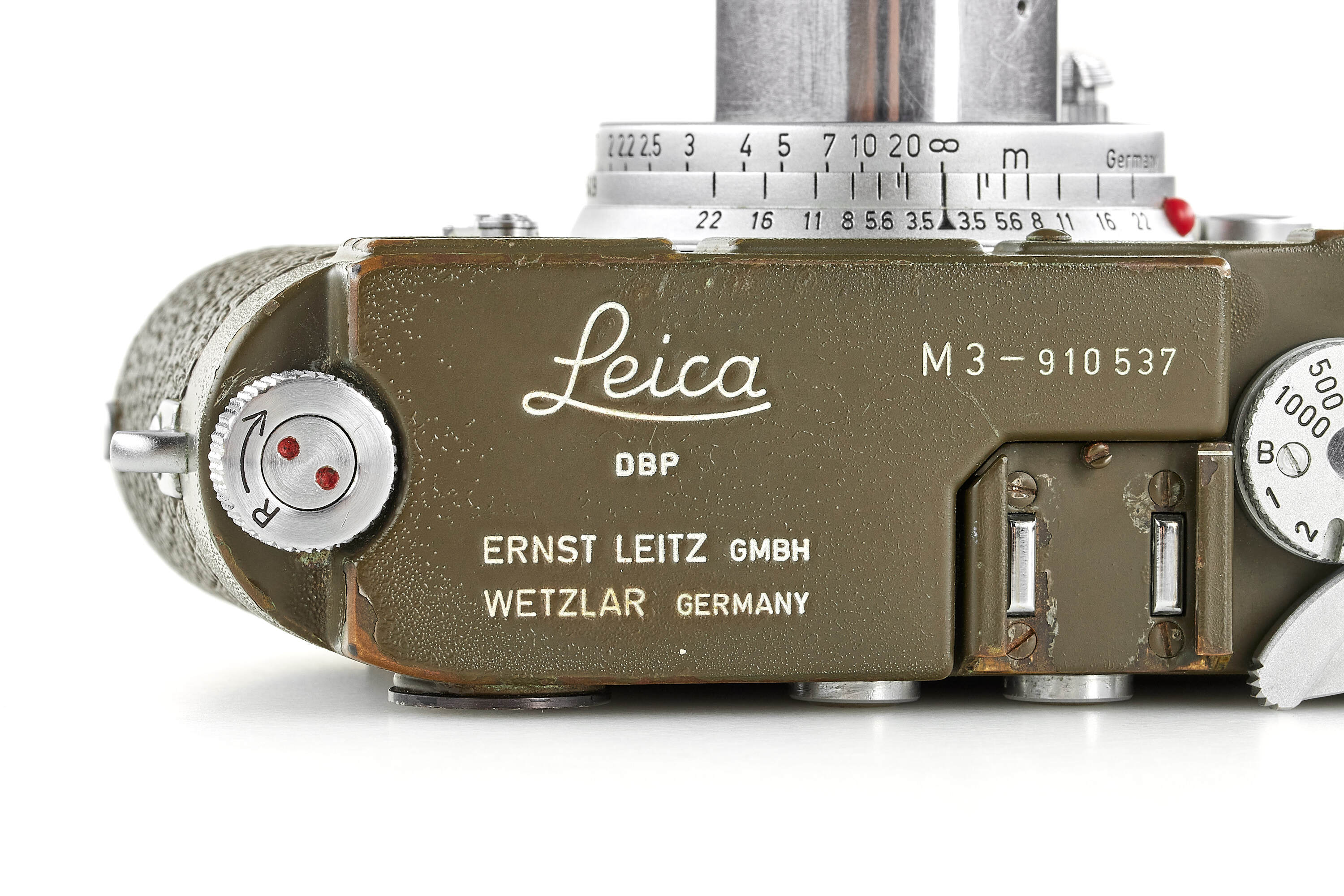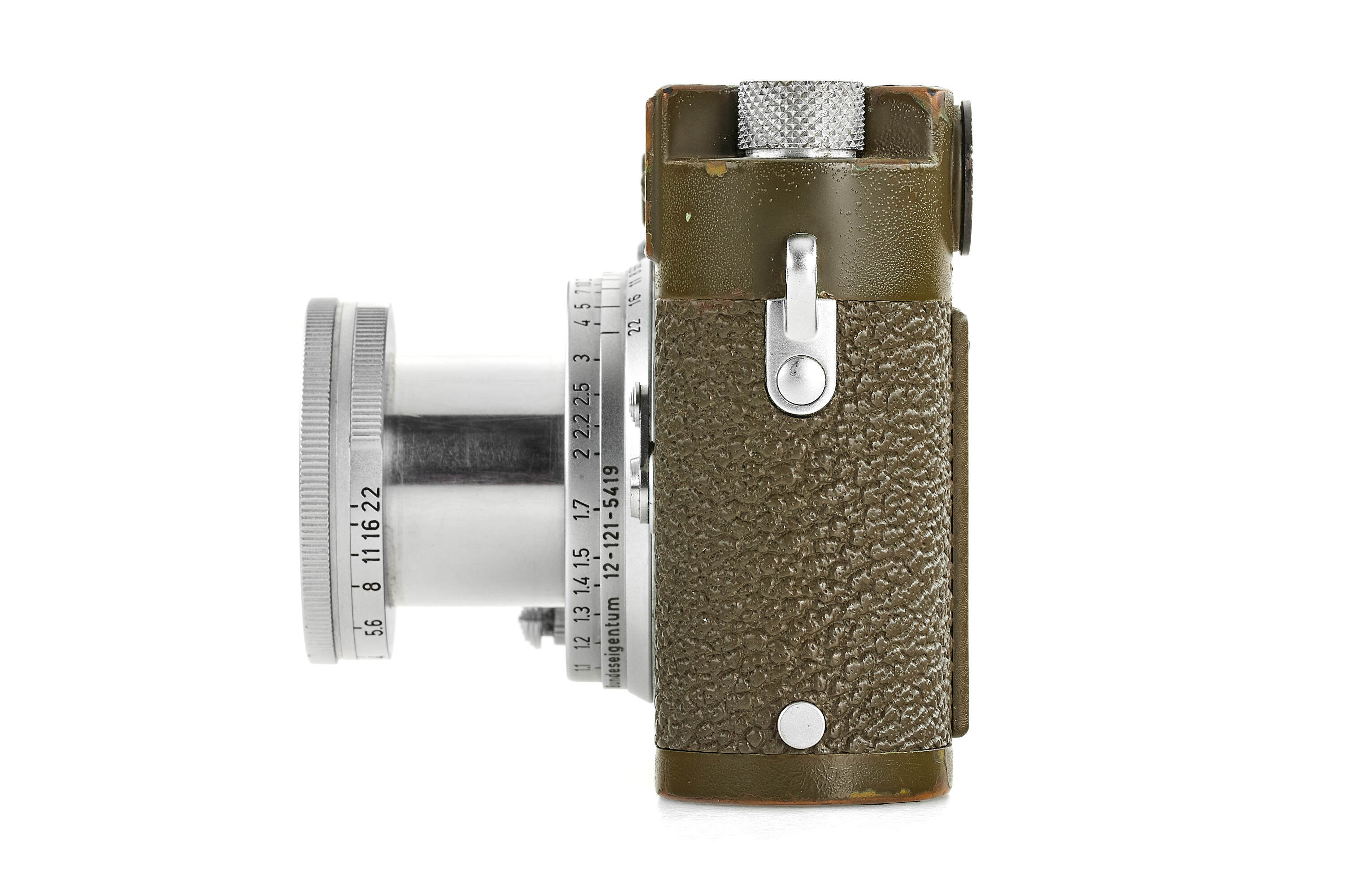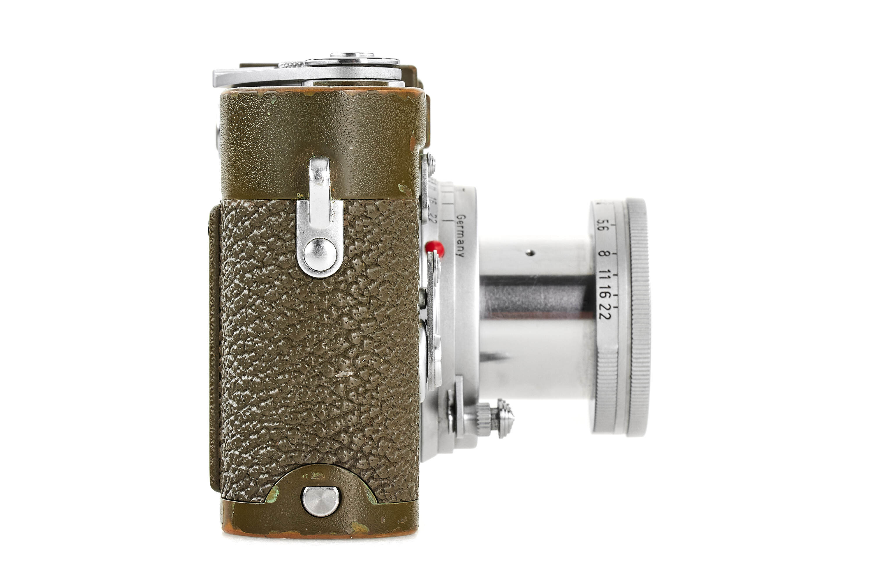 Very rare early version olive paint Leica M3 'Bundeswehr' from the first production batch, with long strap lugs and double stroke advance, in good, original condition, showing a beautiful patina, small bubbles appearing in paint, engraved 'Bundeseigentum 12-121-5418' on the rear of the top plate, together with matching Elmar 3.5/5cm no.1335693 engraved 'Bundeseigentum 12-121-5419' (front lens cap) and Leica-Meter MC no.49780 engraved 'Bundeseigentum 12-121-5603' (including a green leather etui for the meter stamped with 'Bundeseigentum 12-121-5710).