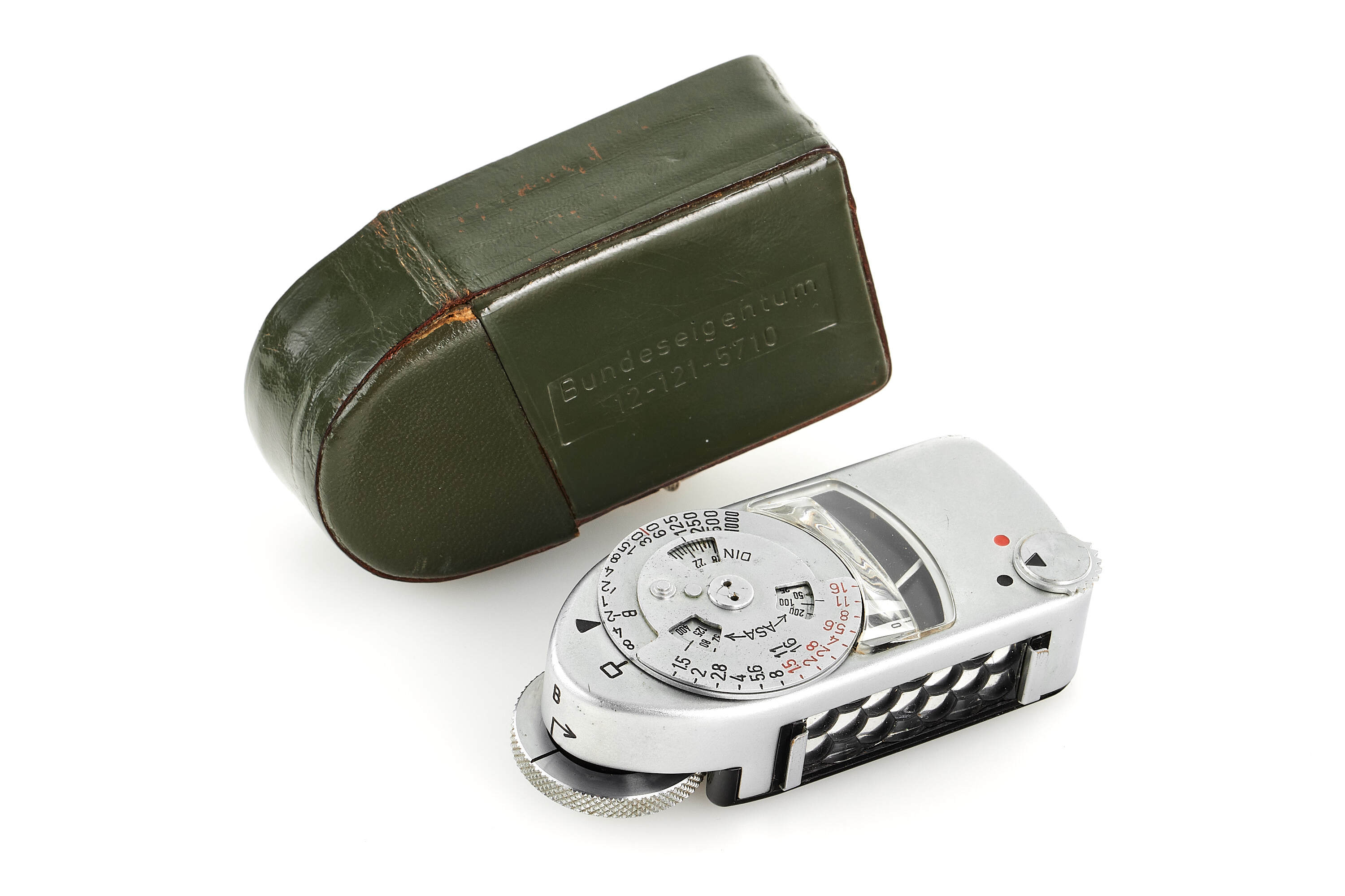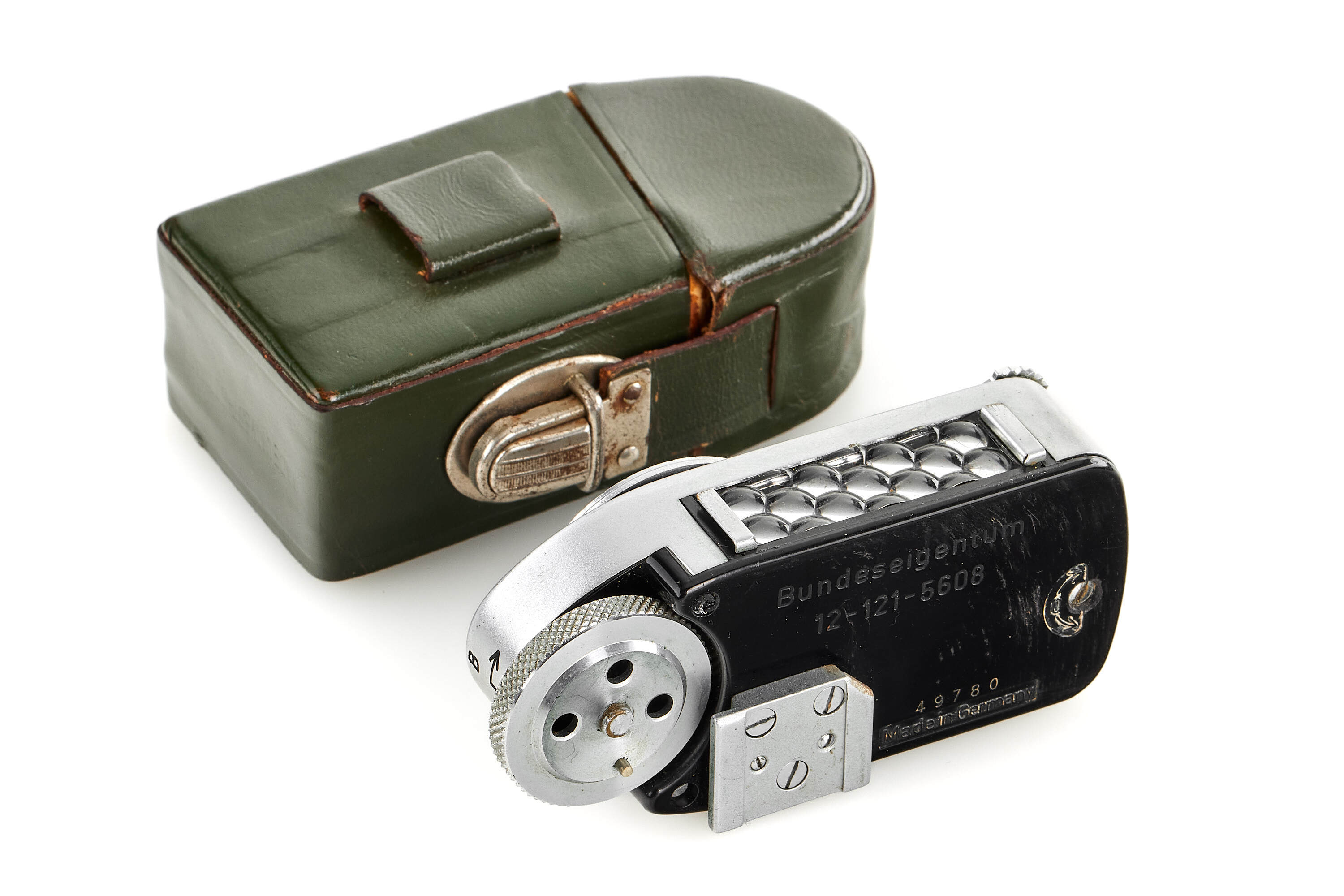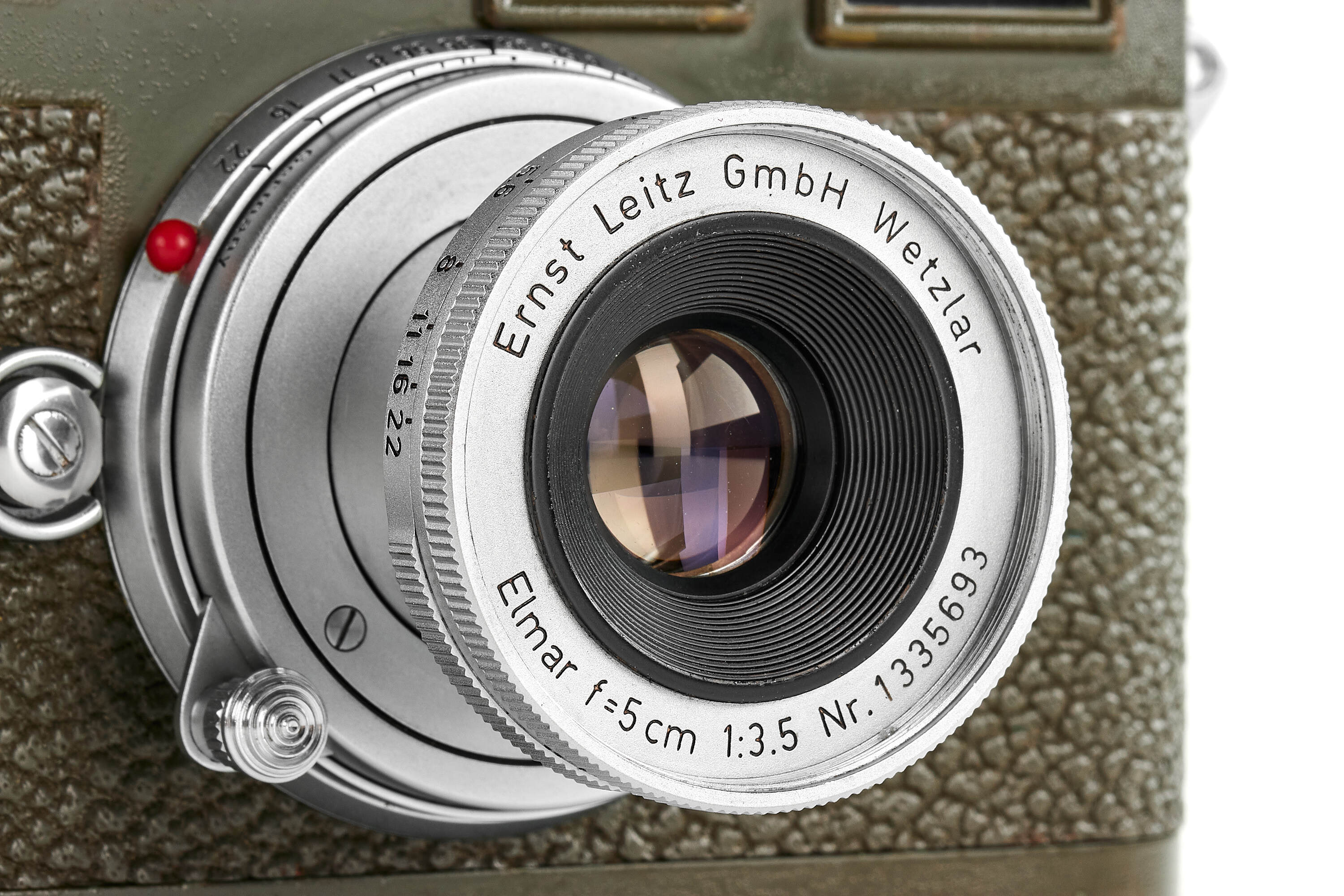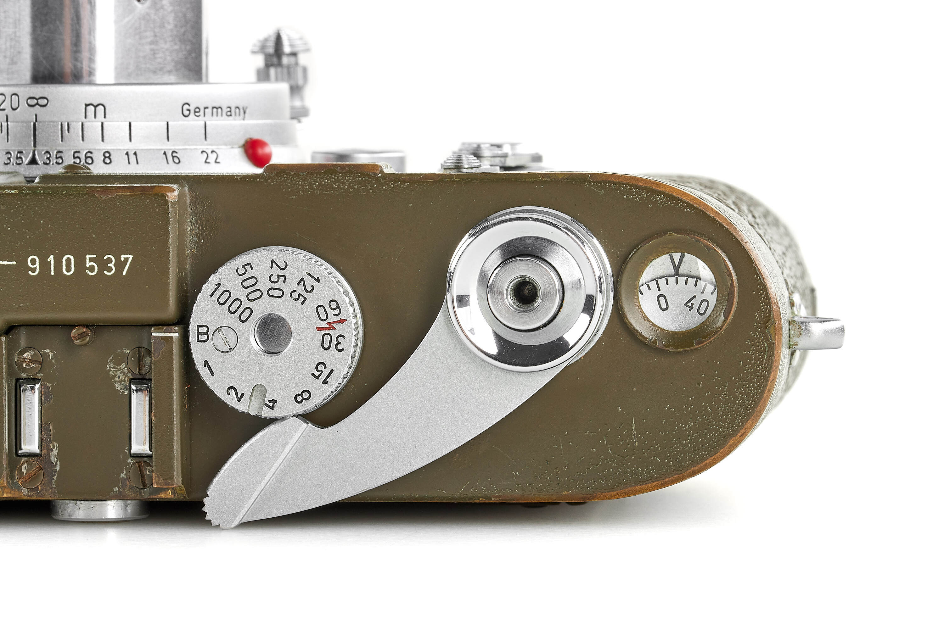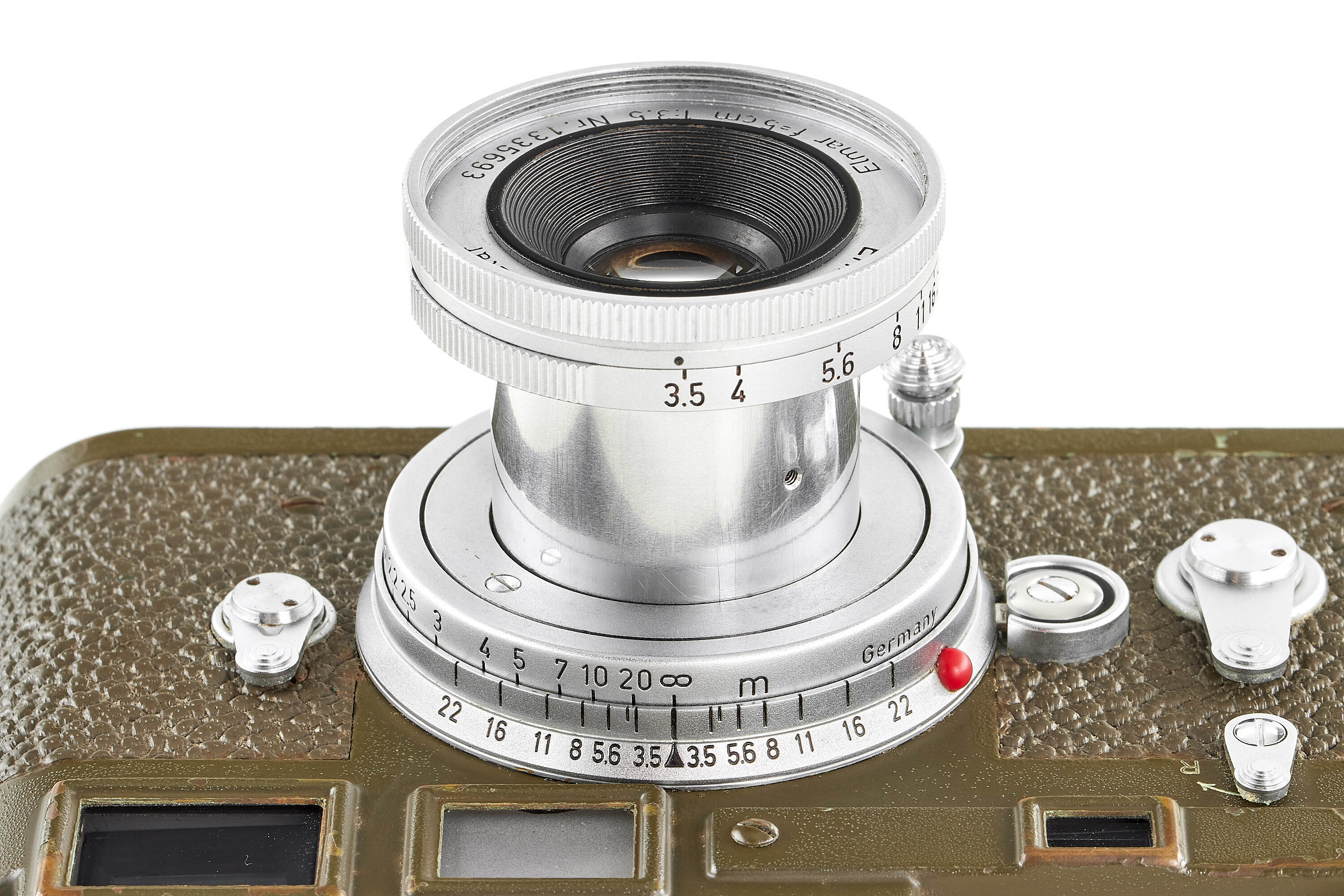 Very rare early version olive paint Leica M3 'Bundeswehr' from the first production batch, with long strap lugs and double stroke advance, in good, original condition, showing a beautiful patina, small bubbles appearing in paint, engraved 'Bundeseigentum 12-121-5418' on the rear of the top plate, together with matching Elmar 3.5/5cm no.1335693 engraved 'Bundeseigentum 12-121-5419' (front lens cap) and Leica-Meter MC no.49780 engraved 'Bundeseigentum 12-121-5603' (including a green leather etui for the meter stamped with 'Bundeseigentum 12-121-5710).