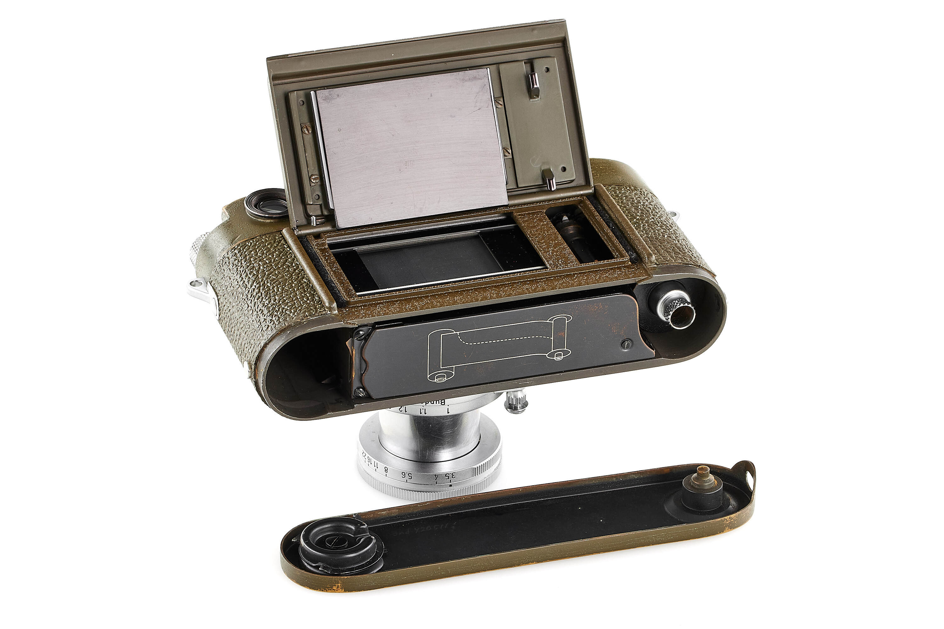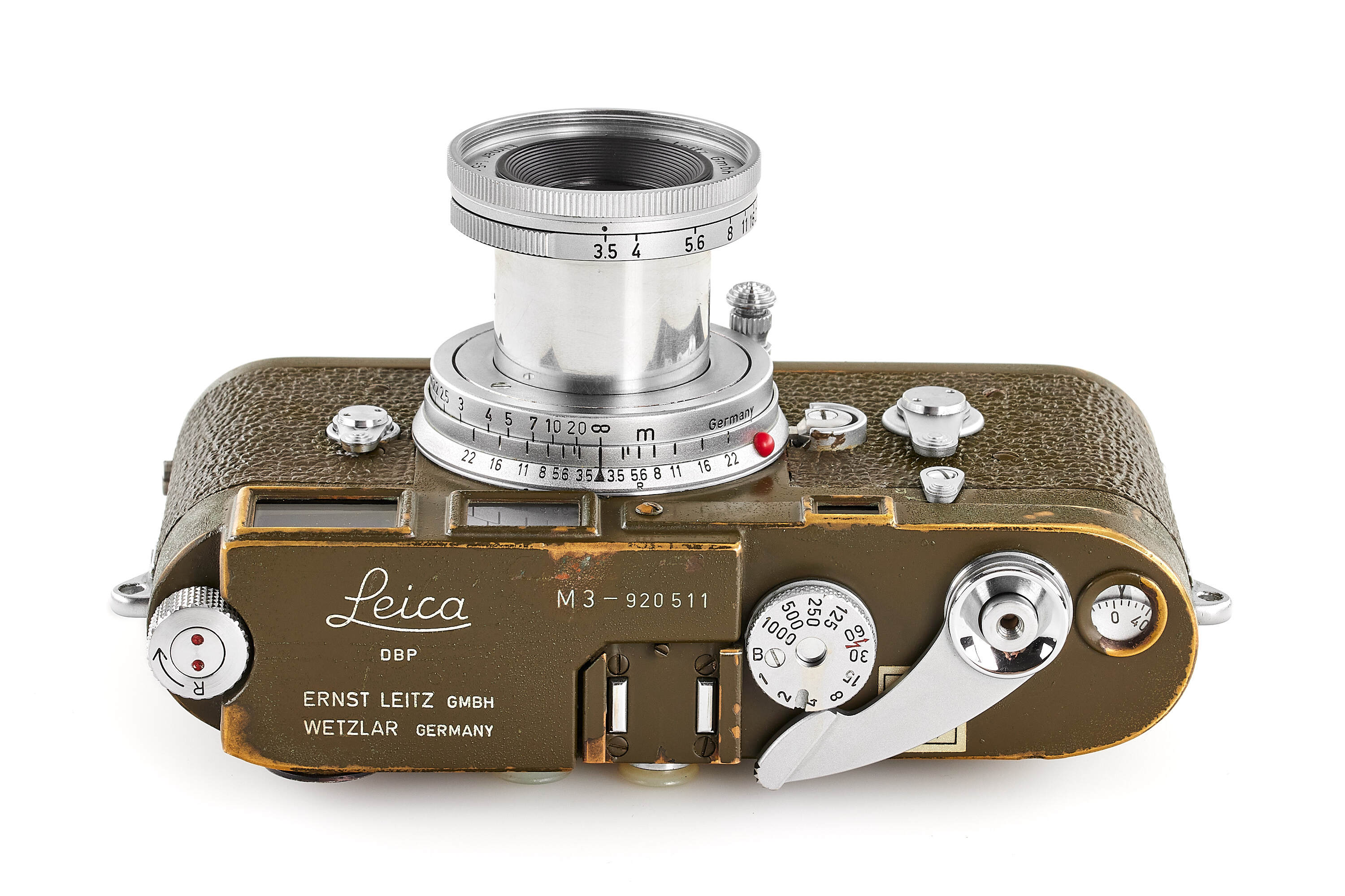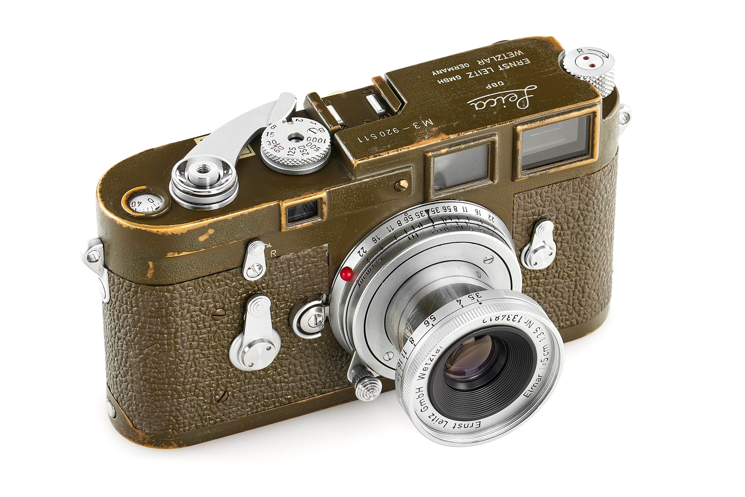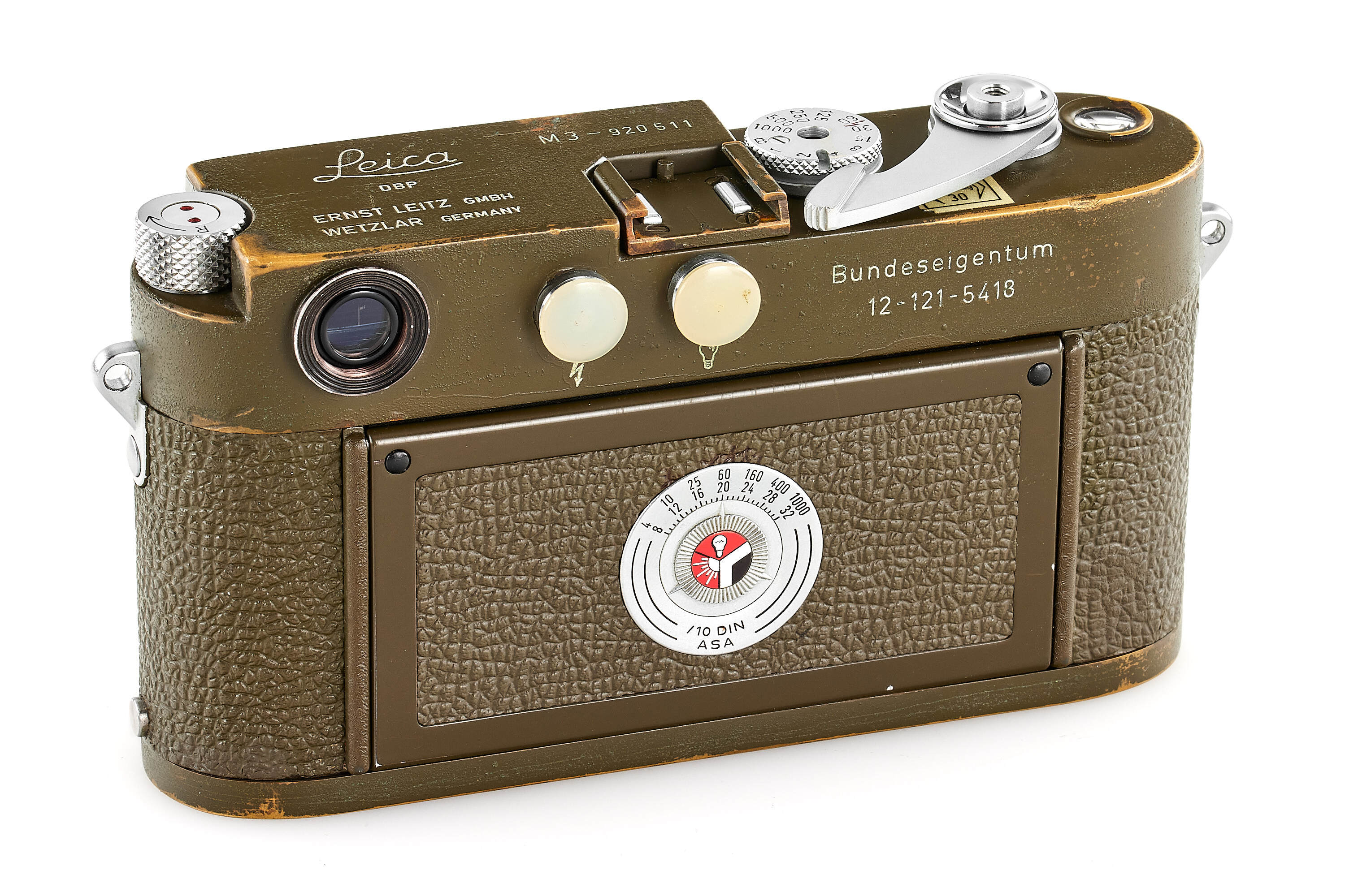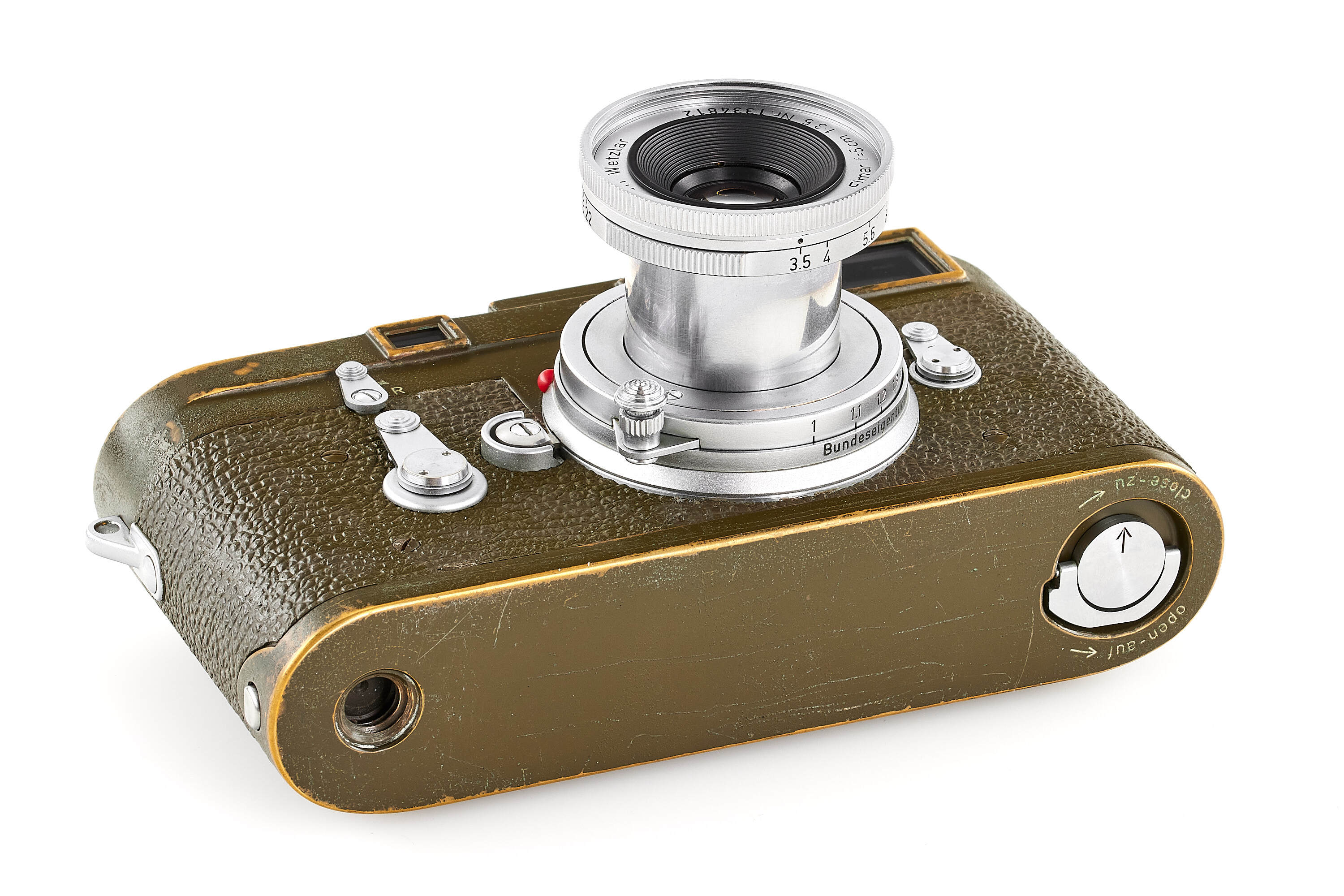 The second version of olive paint Leica M3 'Bundeseigentum' from a small batch with serial numbers 920501-920521. Unique combination of long strap lugs and second version vulcanite pattern, double stroke advance, engraved 'Bundeseigentum 12-121-5418' on the top plate, with special sticker under the winding lever, the camera is in excellent, original condition, with amazing patina, comes with matching 'Bundeseigentum' Elmar 3.5/5cm no.1334812 and original case.