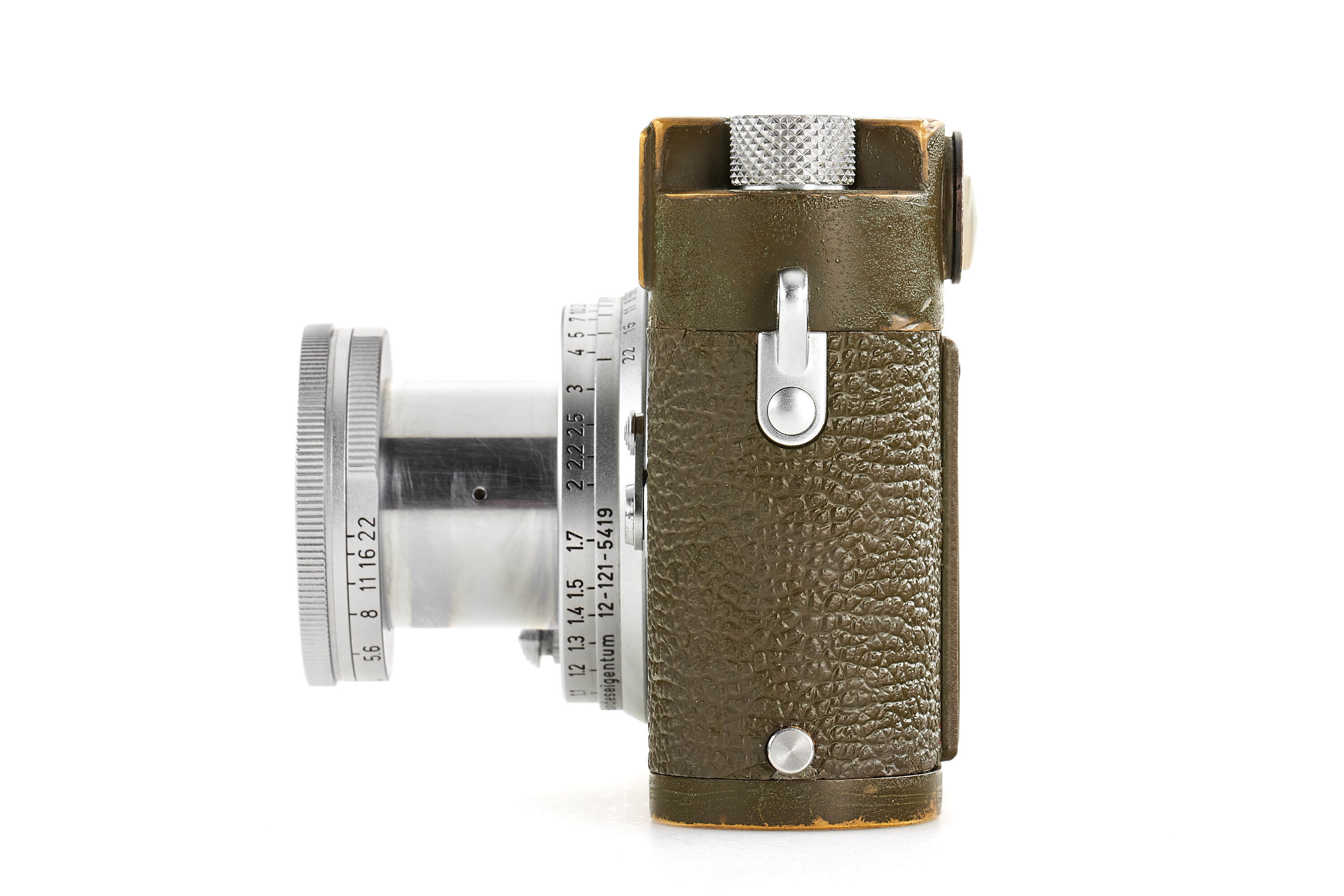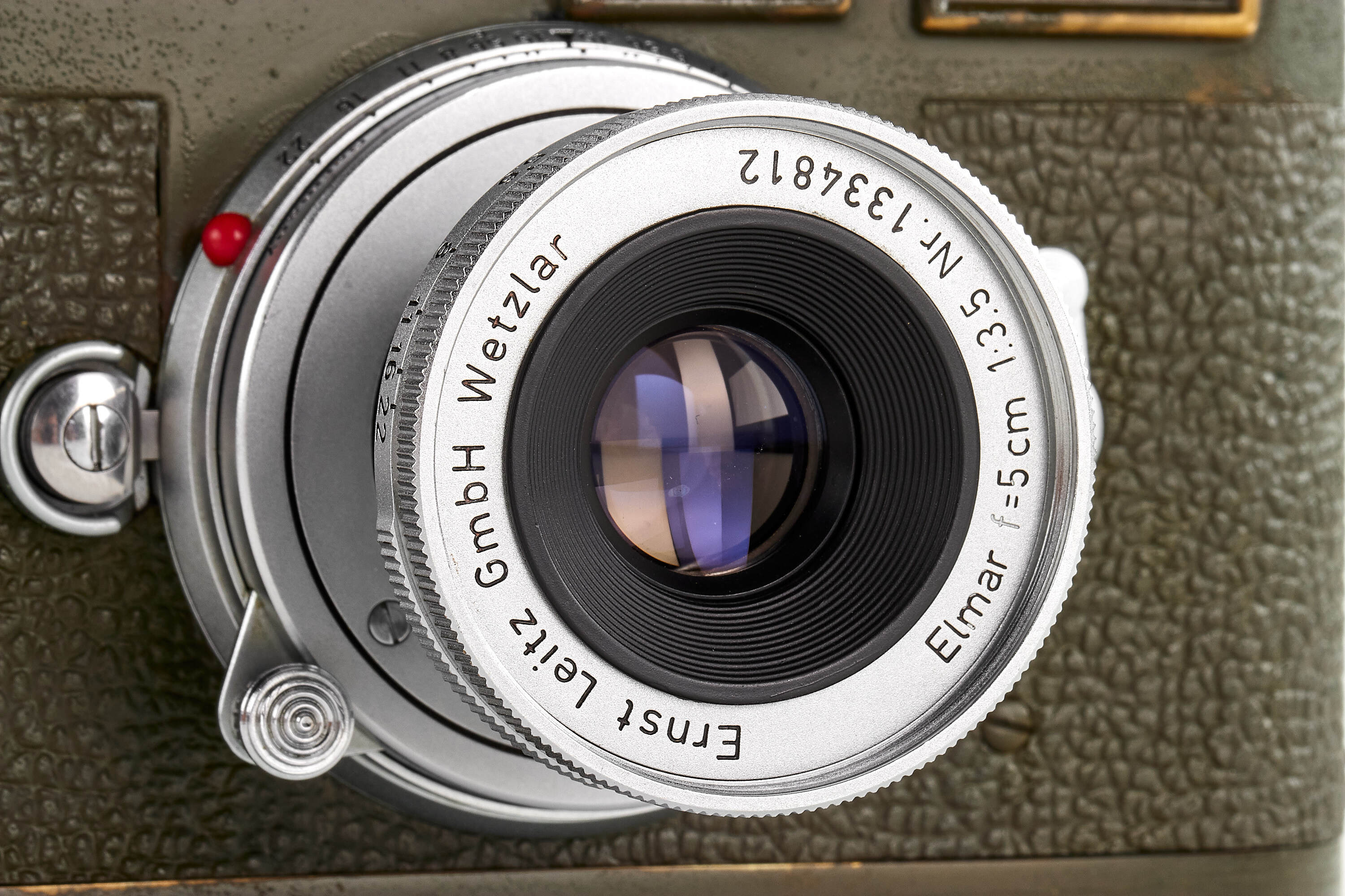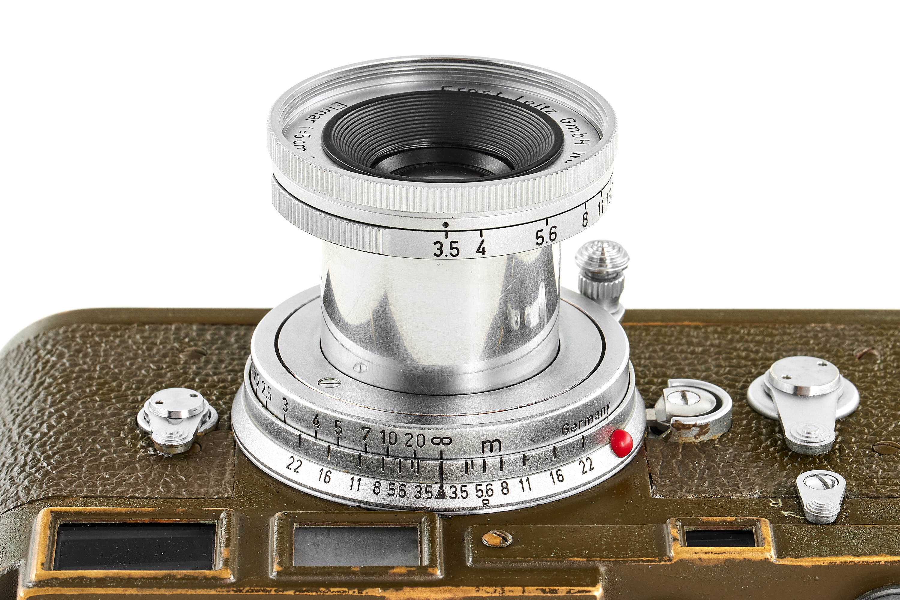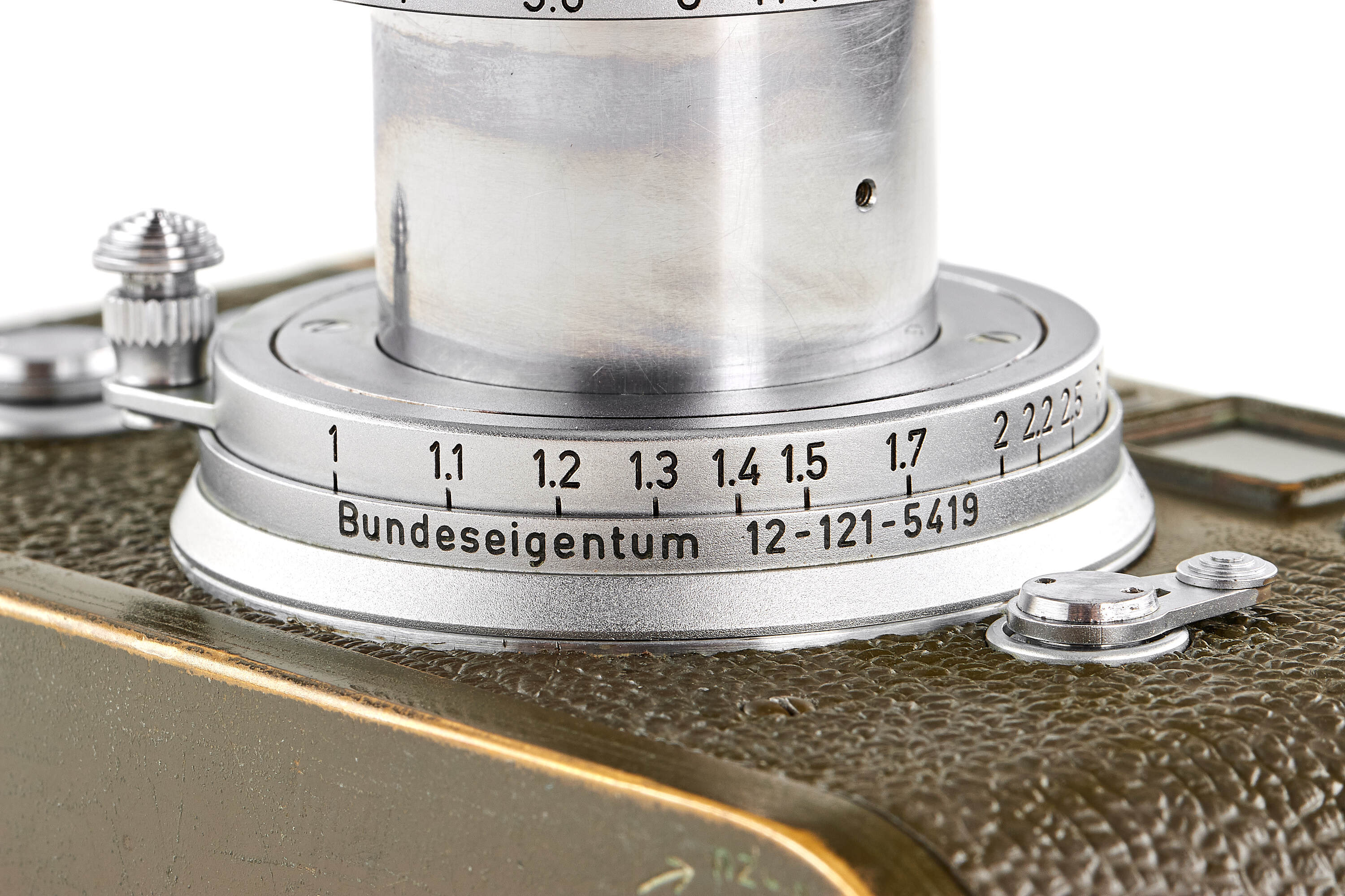 The second version of olive paint Leica M3 'Bundeseigentum' from a small batch with serial numbers 920501-920521. Unique combination of long strap lugs and second version vulcanite pattern, double stroke advance, engraved 'Bundeseigentum 12-121-5418' on the top plate, with special sticker under the winding lever, the camera is in excellent, original condition, with amazing patina, comes with matching 'Bundeseigentum' Elmar 3.5/5cm no.1334812 and original case.