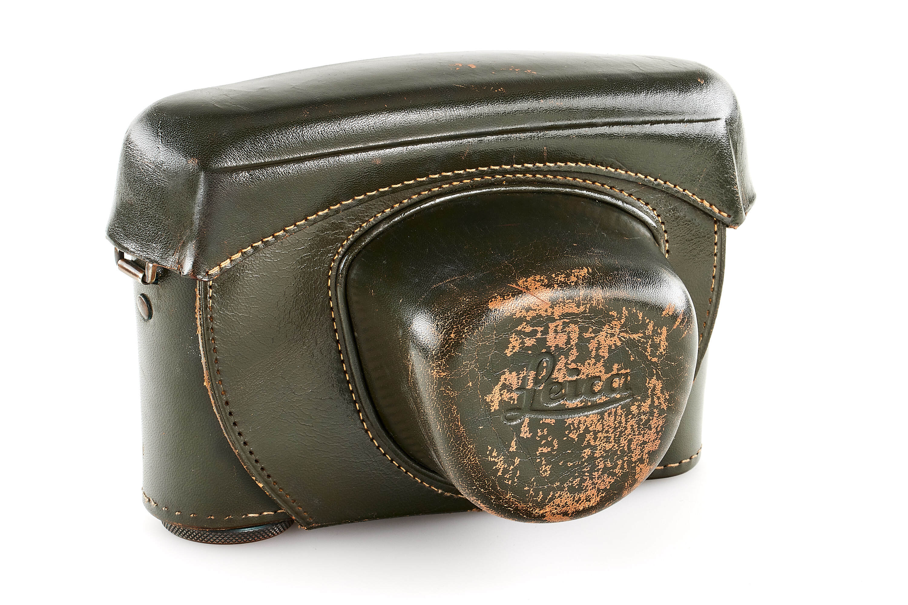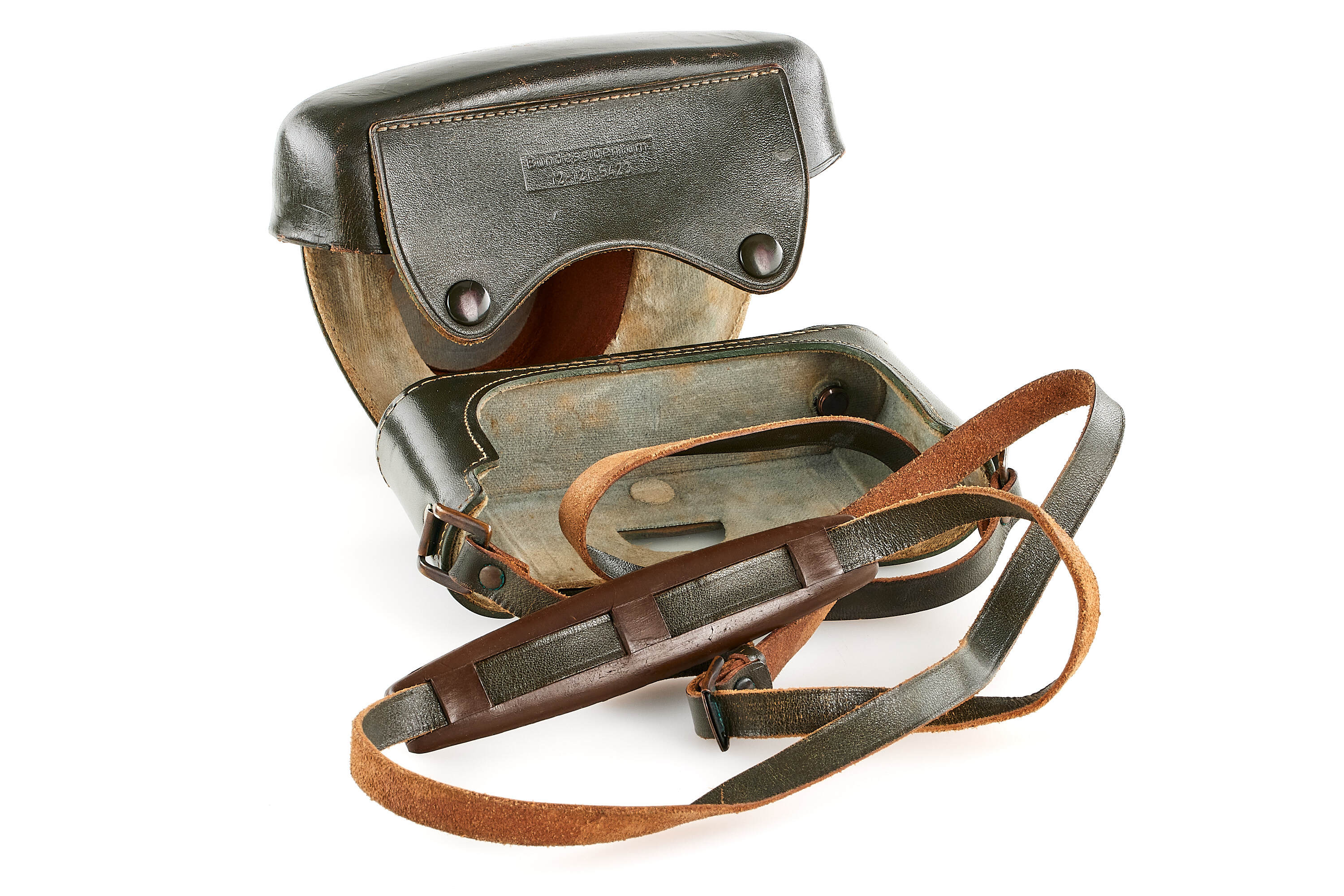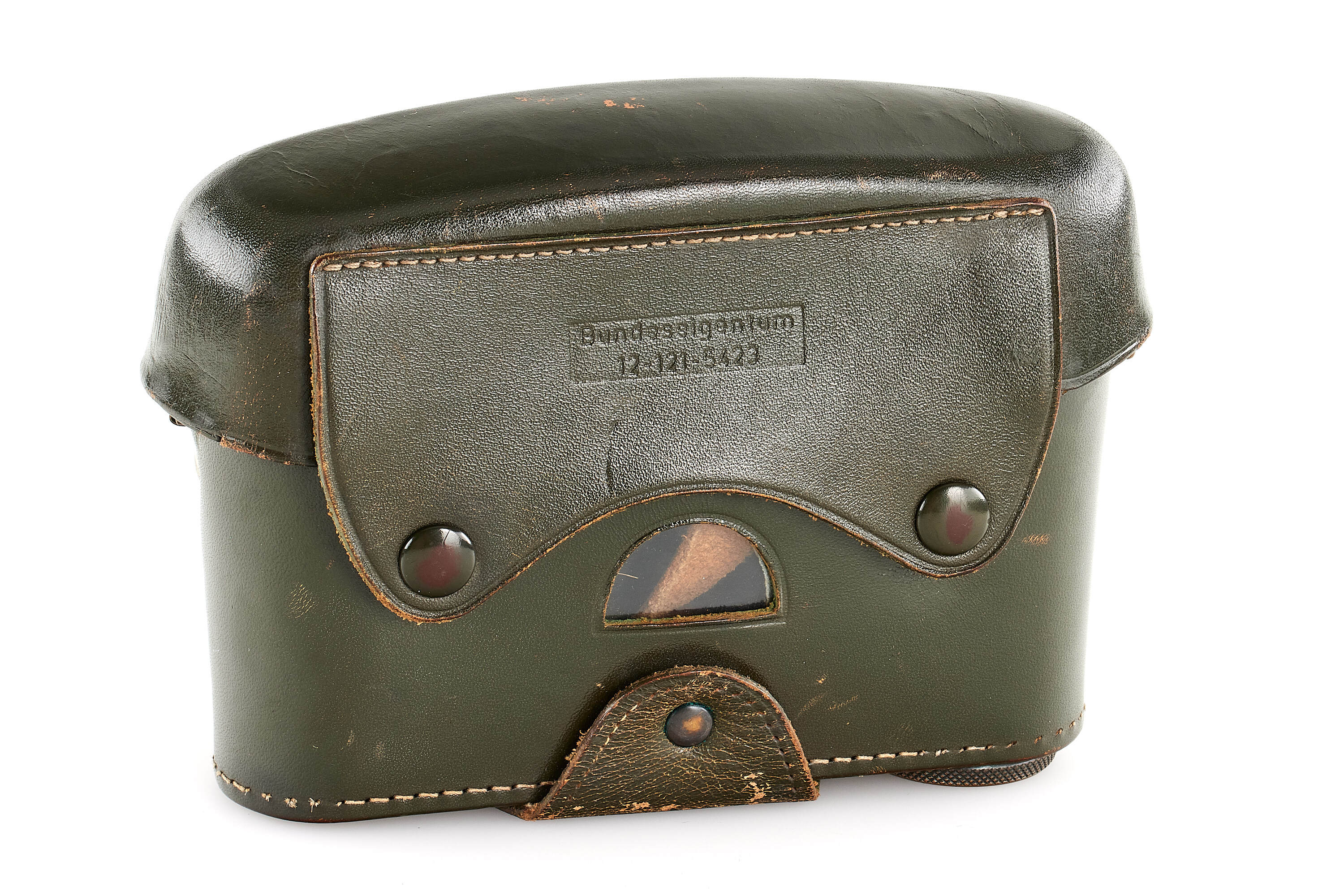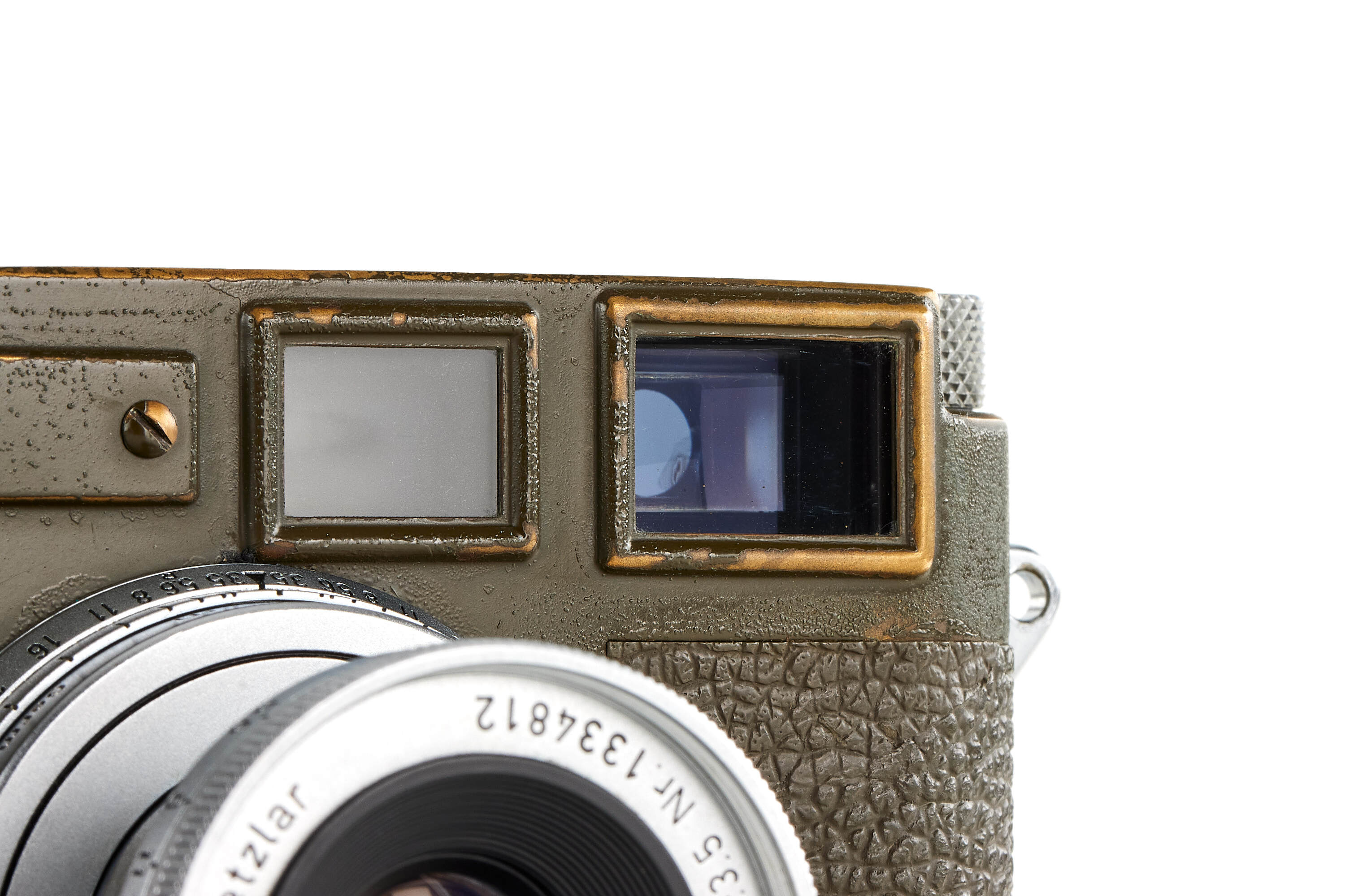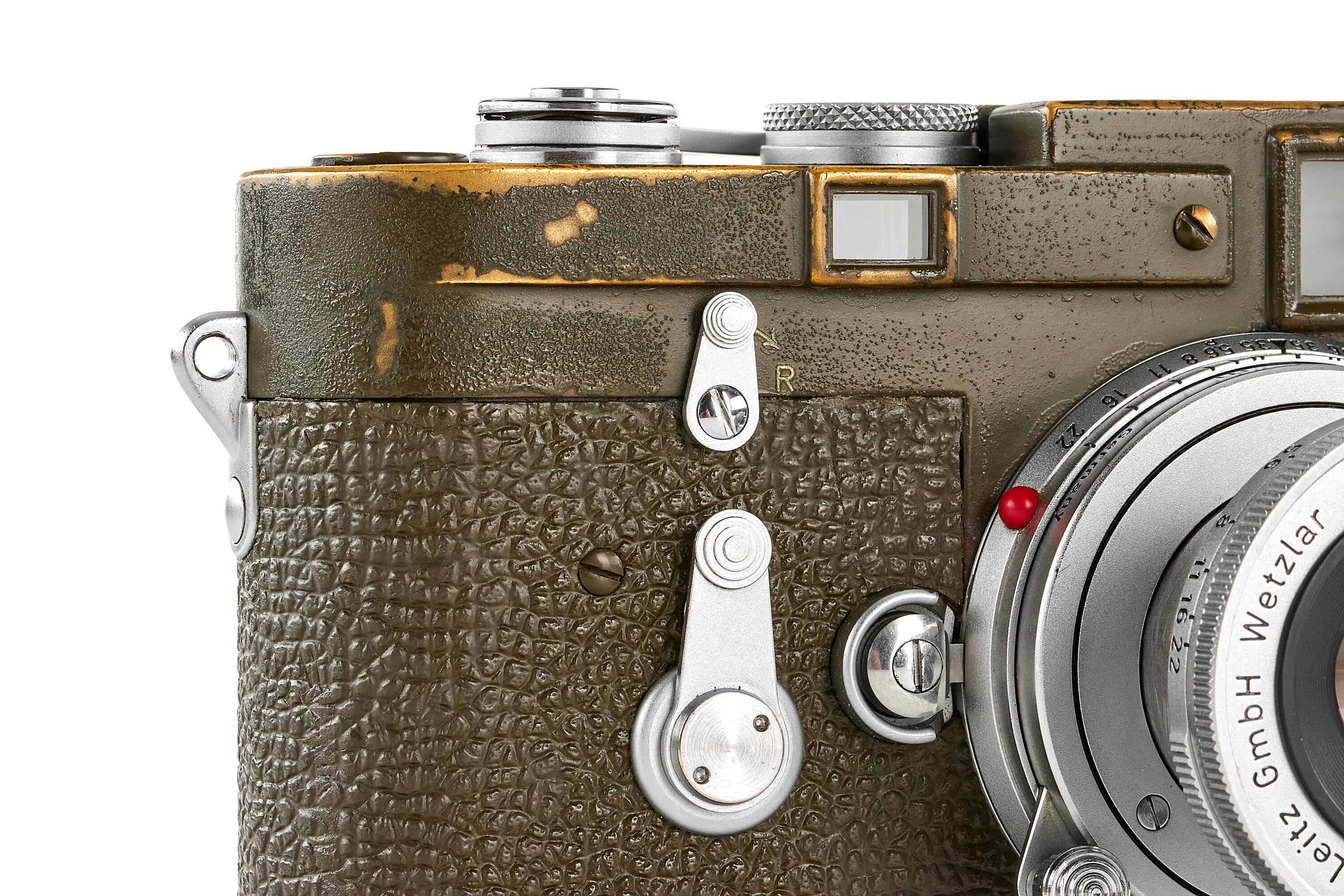 The second version of olive paint Leica M3 'Bundeseigentum' from a small batch with serial numbers 920501-920521. Unique combination of long strap lugs and second version vulcanite pattern, double stroke advance, engraved 'Bundeseigentum 12-121-5418' on the top plate, with special sticker under the winding lever, the camera is in excellent, original condition, with amazing patina, comes with matching 'Bundeseigentum' Elmar 3.5/5cm no.1334812 and original case.