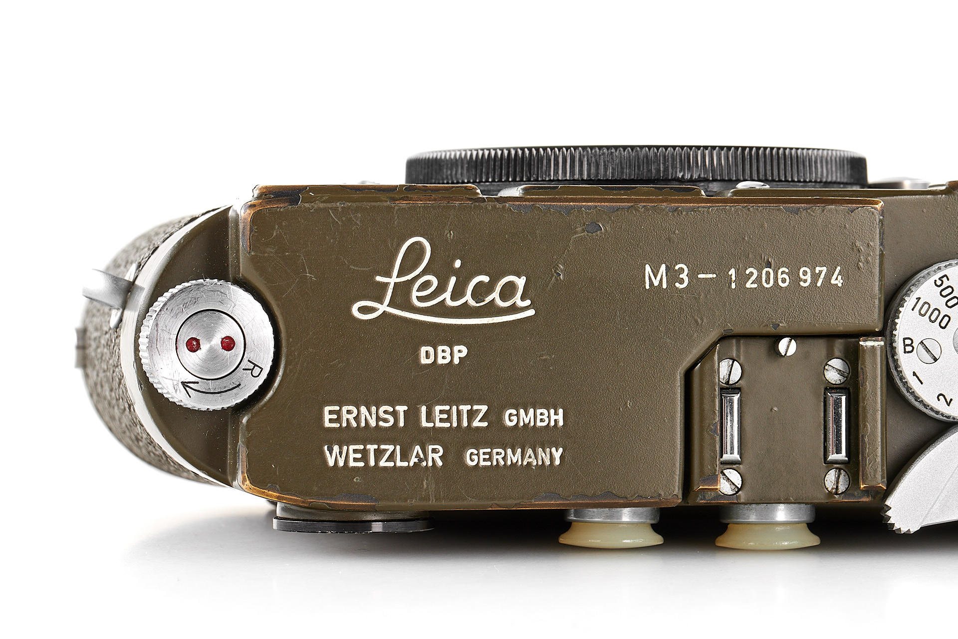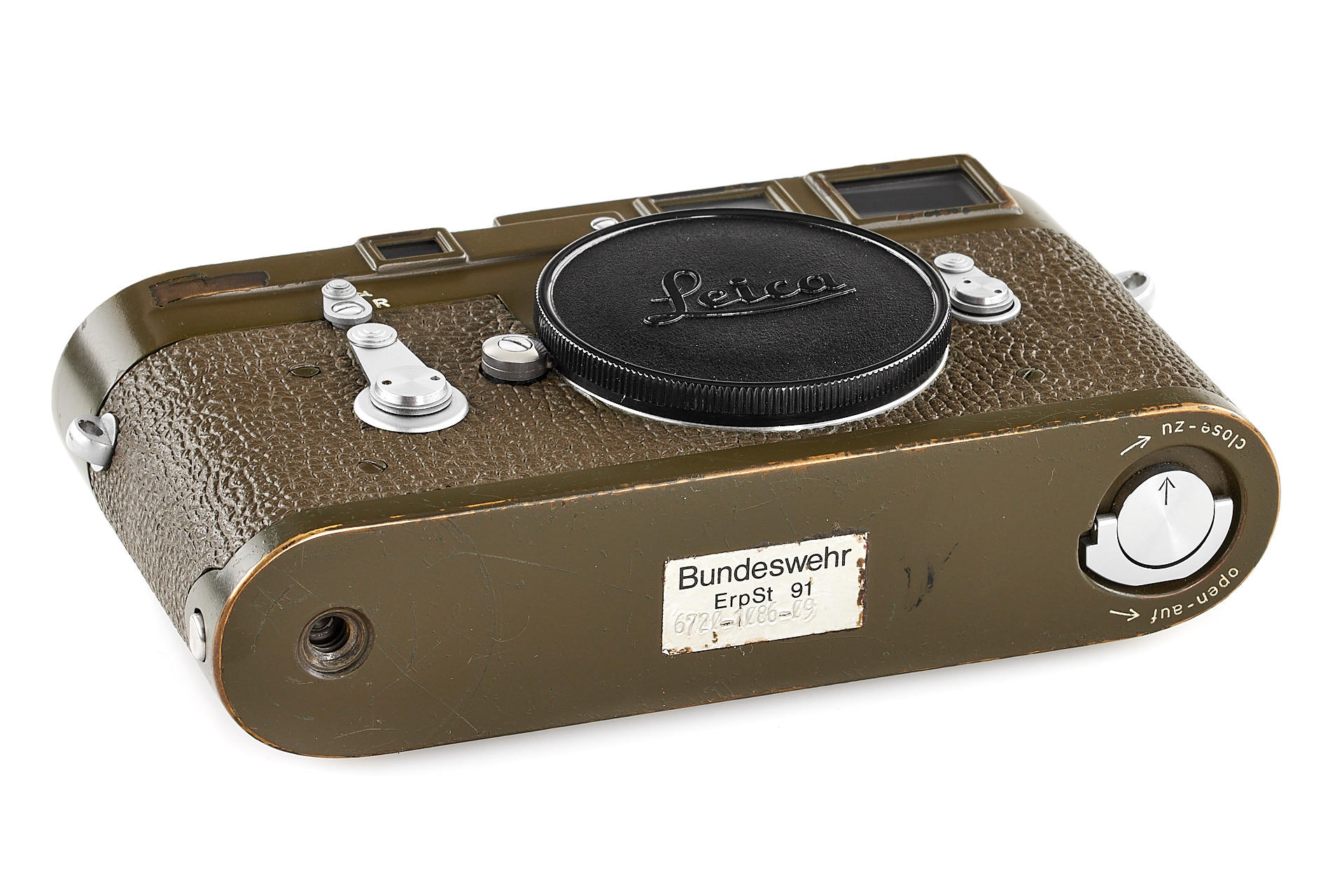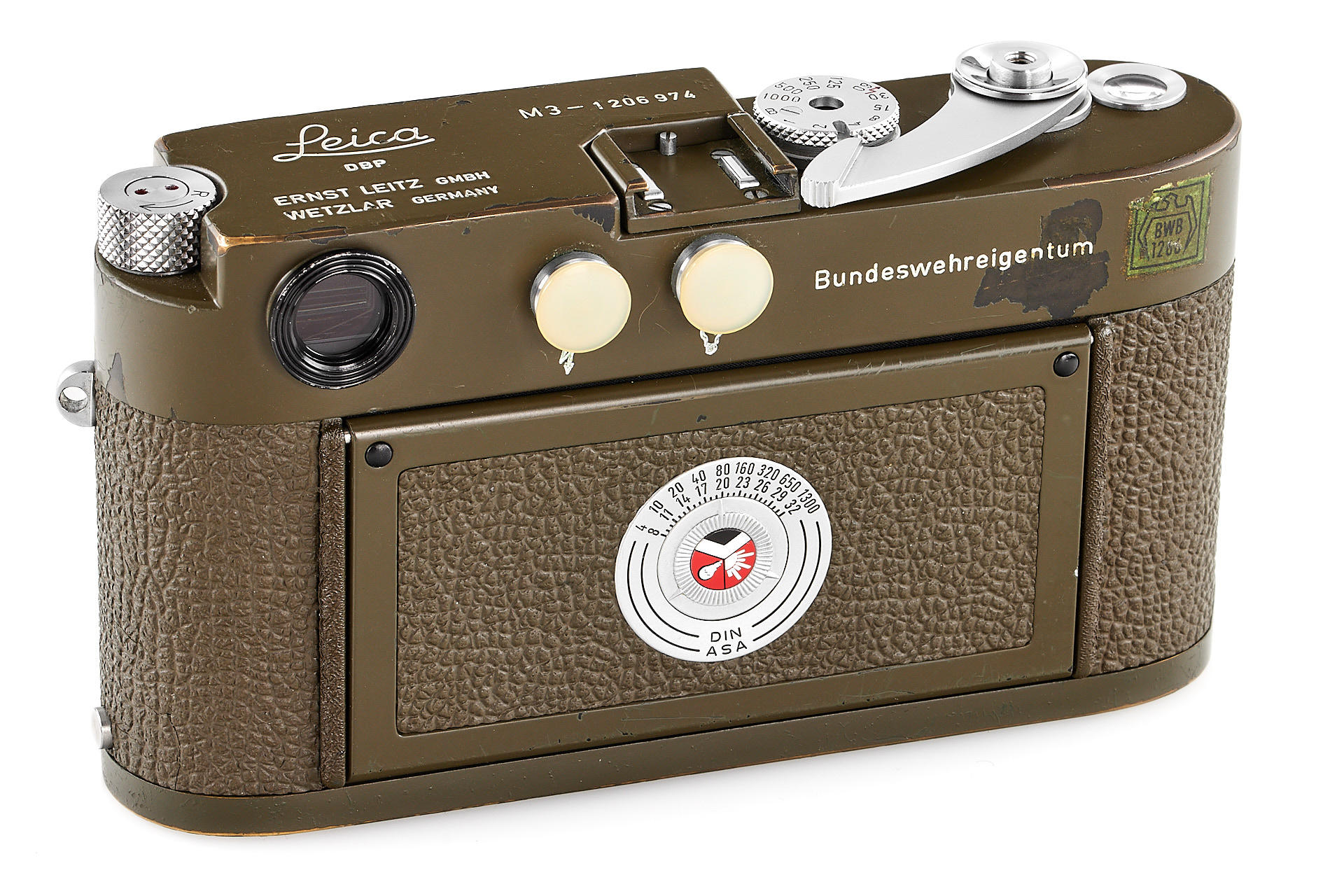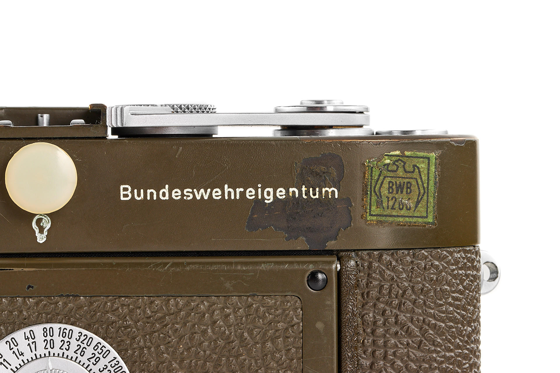 extremely rare one of the last M3 cameras made, ordered by the German army (nos.1206962-1206999) after general production has ceased, engraved 'Bundeswehreigentum', original sticker on the back, and inventory sticker on the base plate, note that these cameras had no lens lock release guard, in very good original condition and working order, with body cap