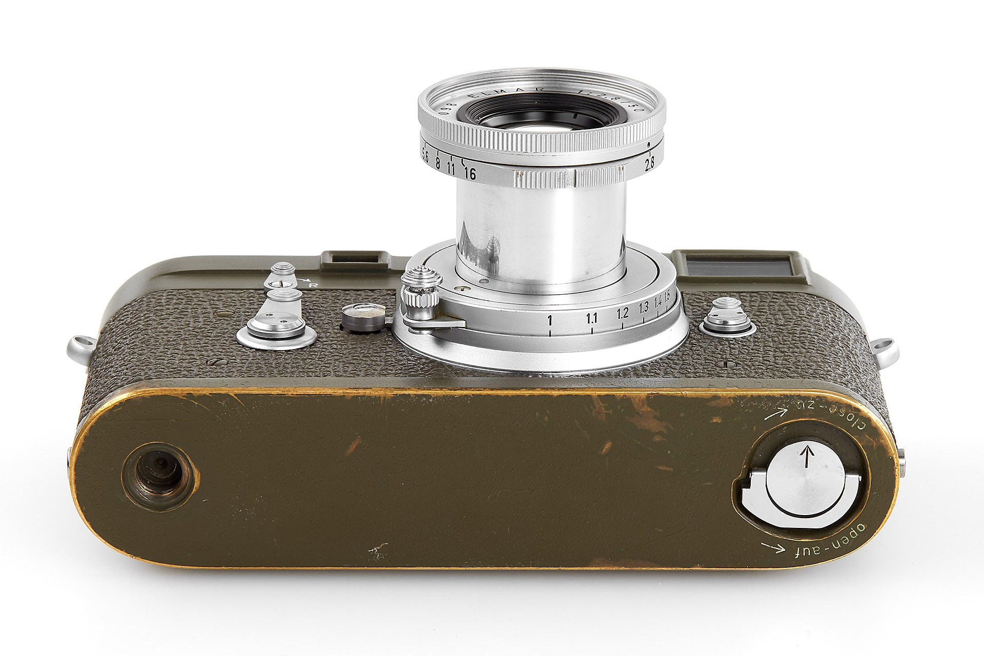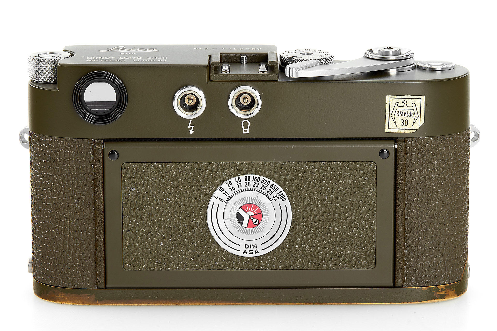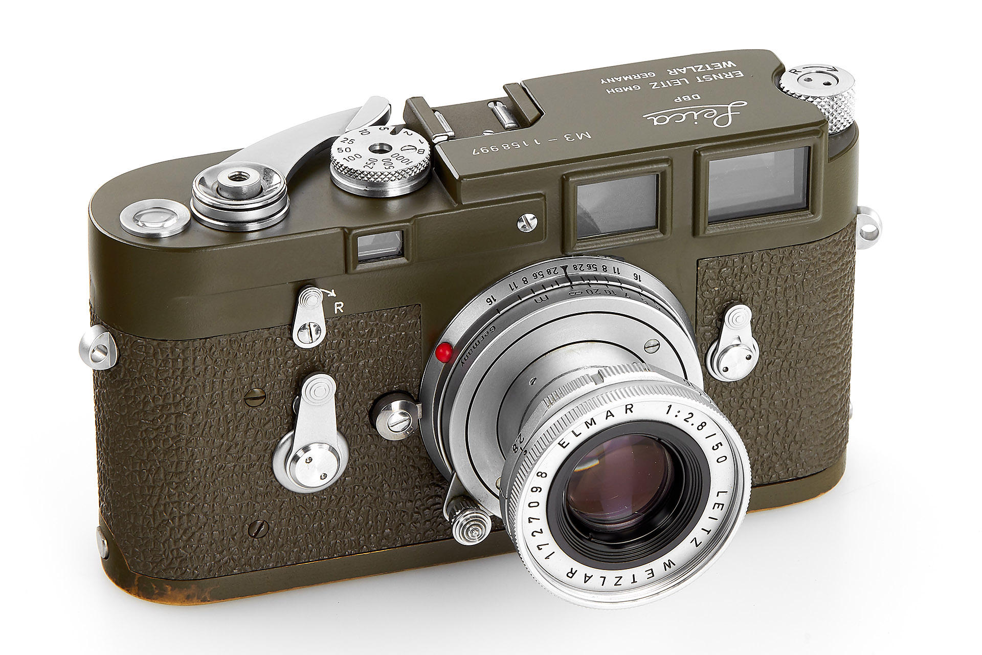 very rare original olive M3, restored on owner's request in 1970's (base plate unrestored, 'Bundeseigentum' - engraving removed during the restoration), with Elmar 2.8/50mm no.1727098, cap, olive outfit case, Leica-Meter MC engraved with 'Bundeseigentum' and inventory number (cond. C), only around 200 of the olive M3 have been made
