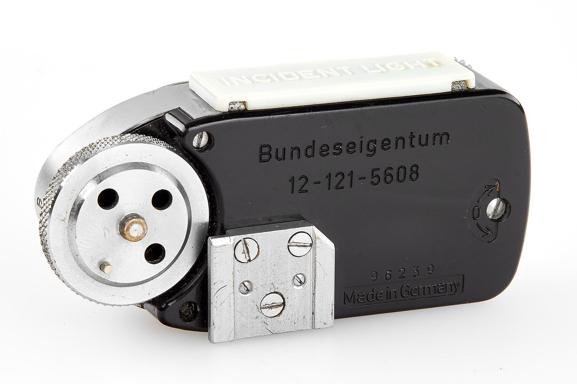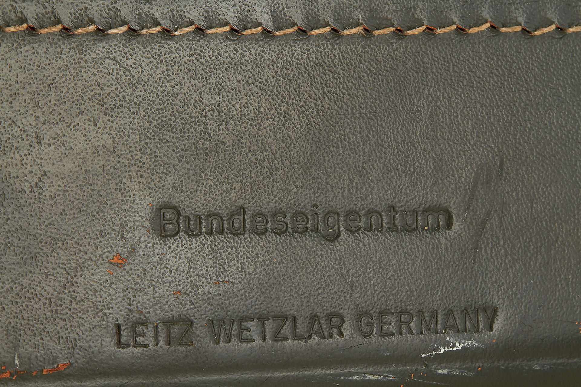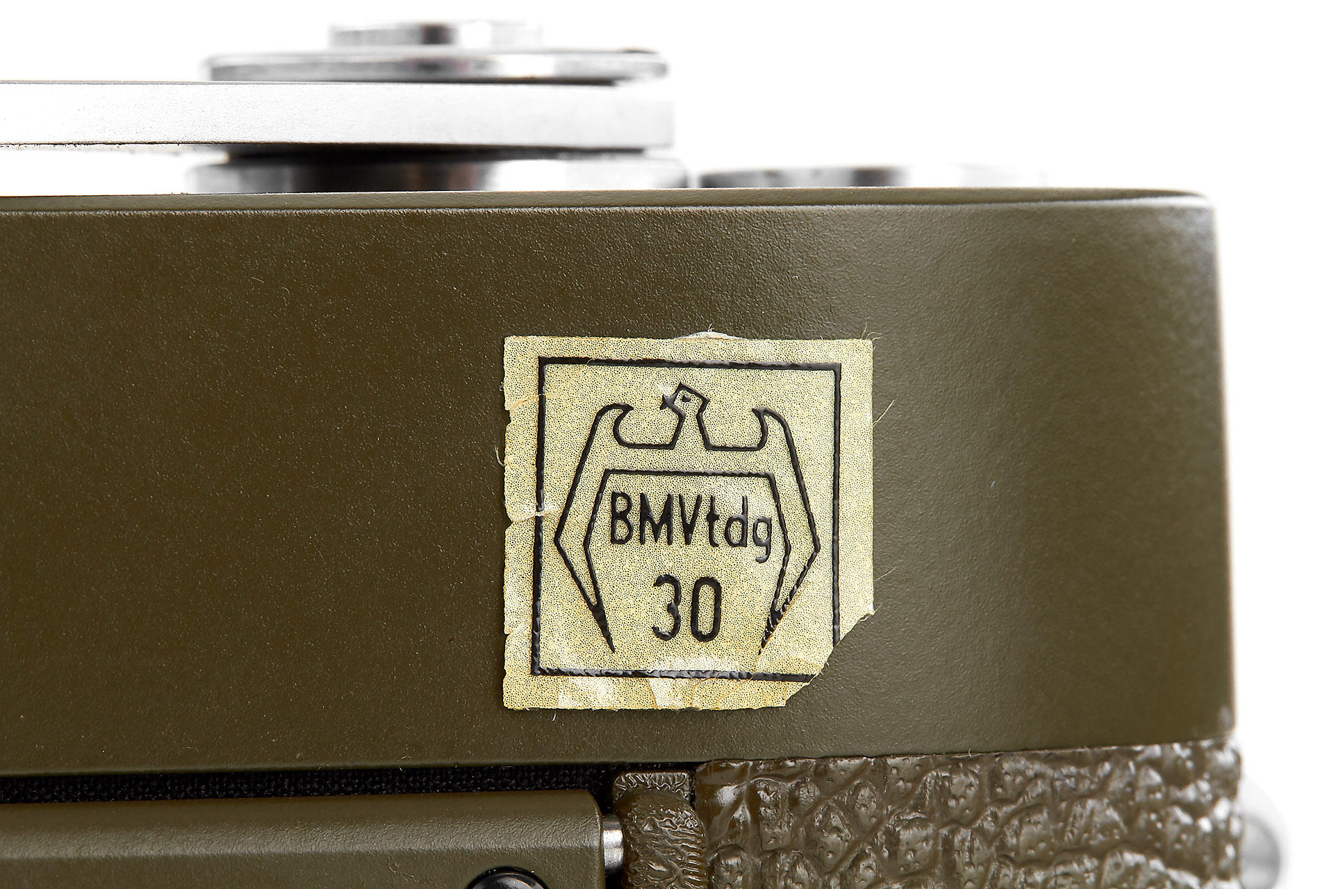 very rare original olive M3, restored on owner's request in 1970's (base plate unrestored, 'Bundeseigentum' - engraving removed during the restoration), with Elmar 2.8/50mm no.1727098, cap, olive outfit case, Leica-Meter MC engraved with 'Bundeseigentum' and inventory number (cond. C), only around 200 of the olive M3 have been made