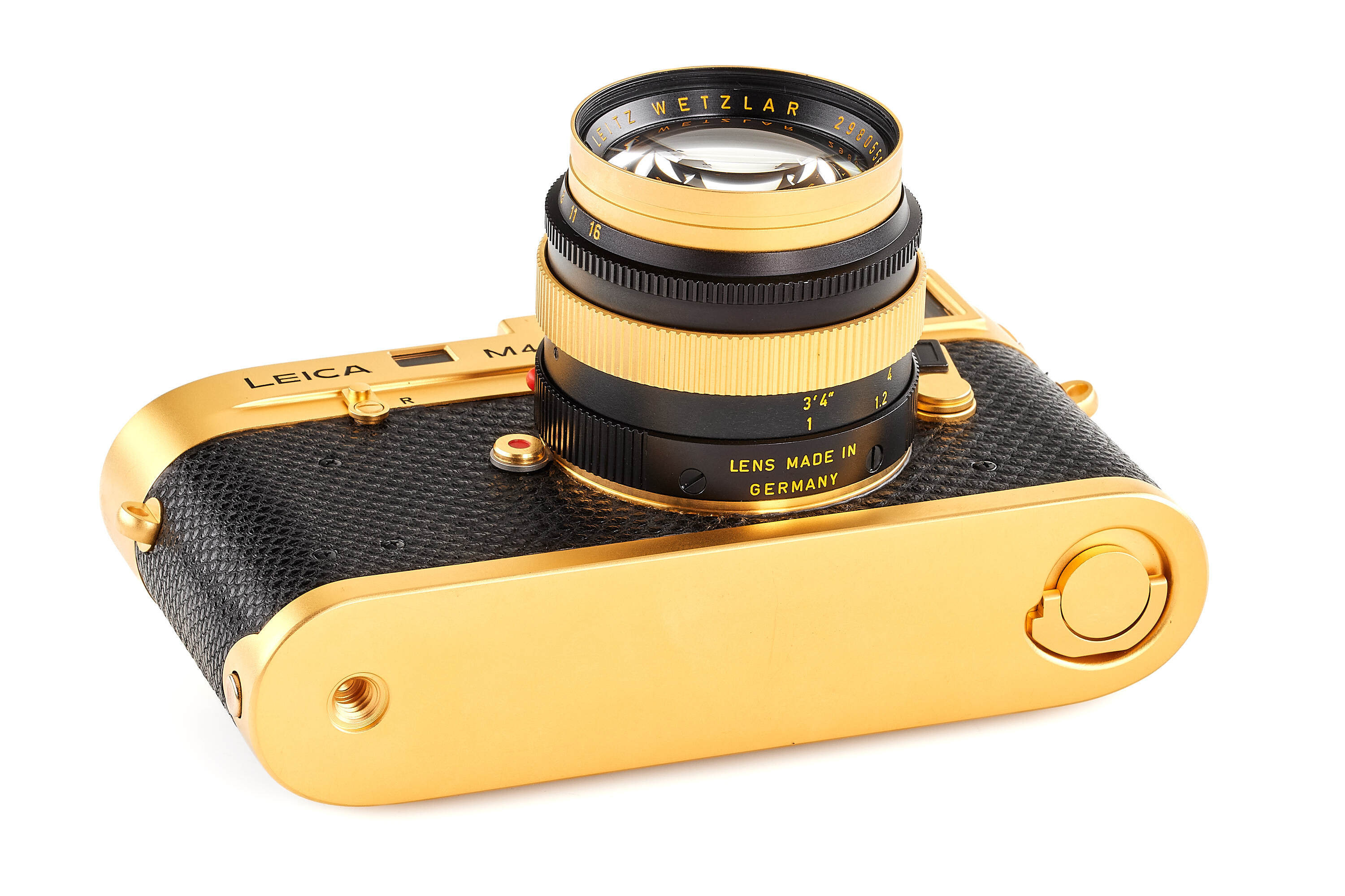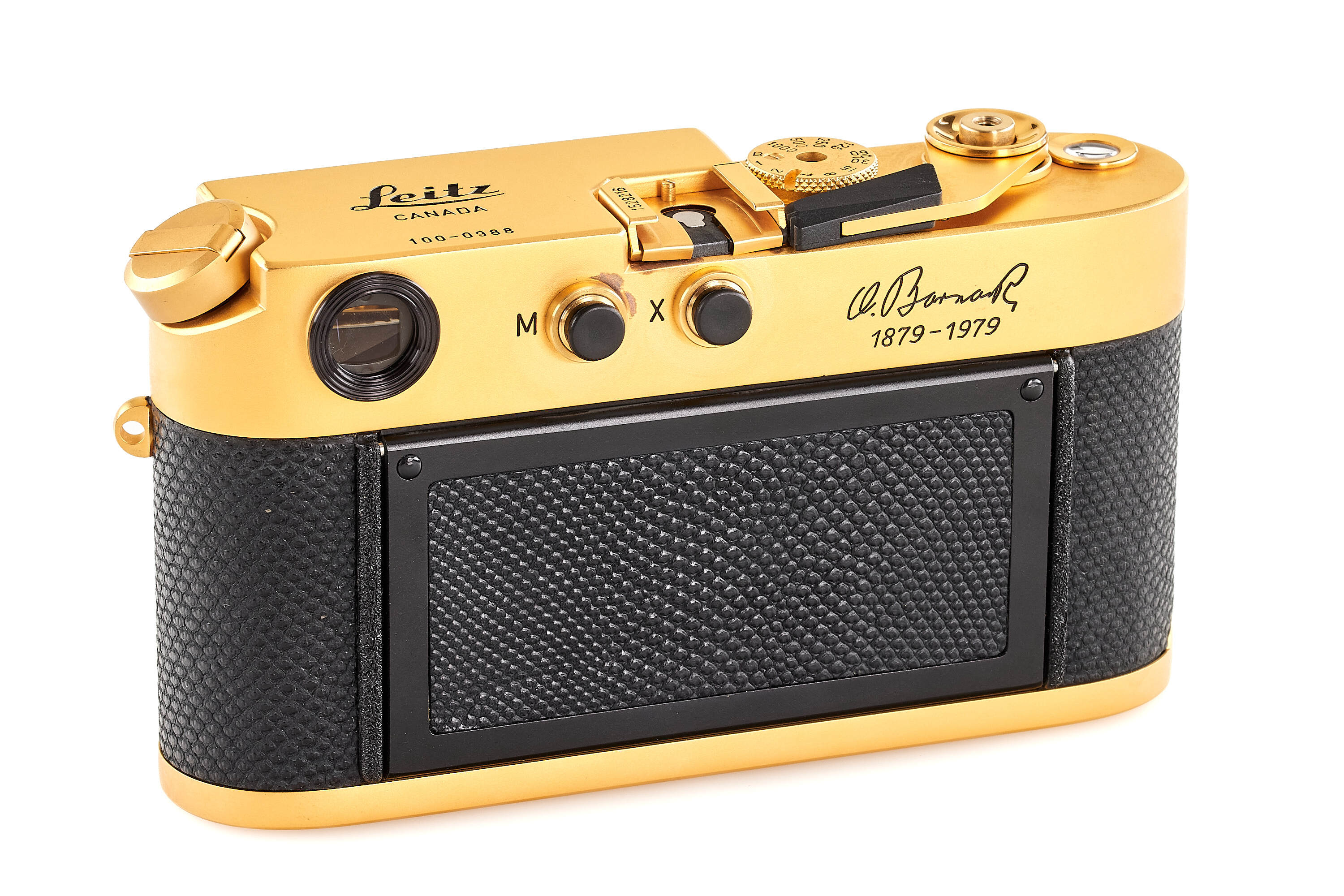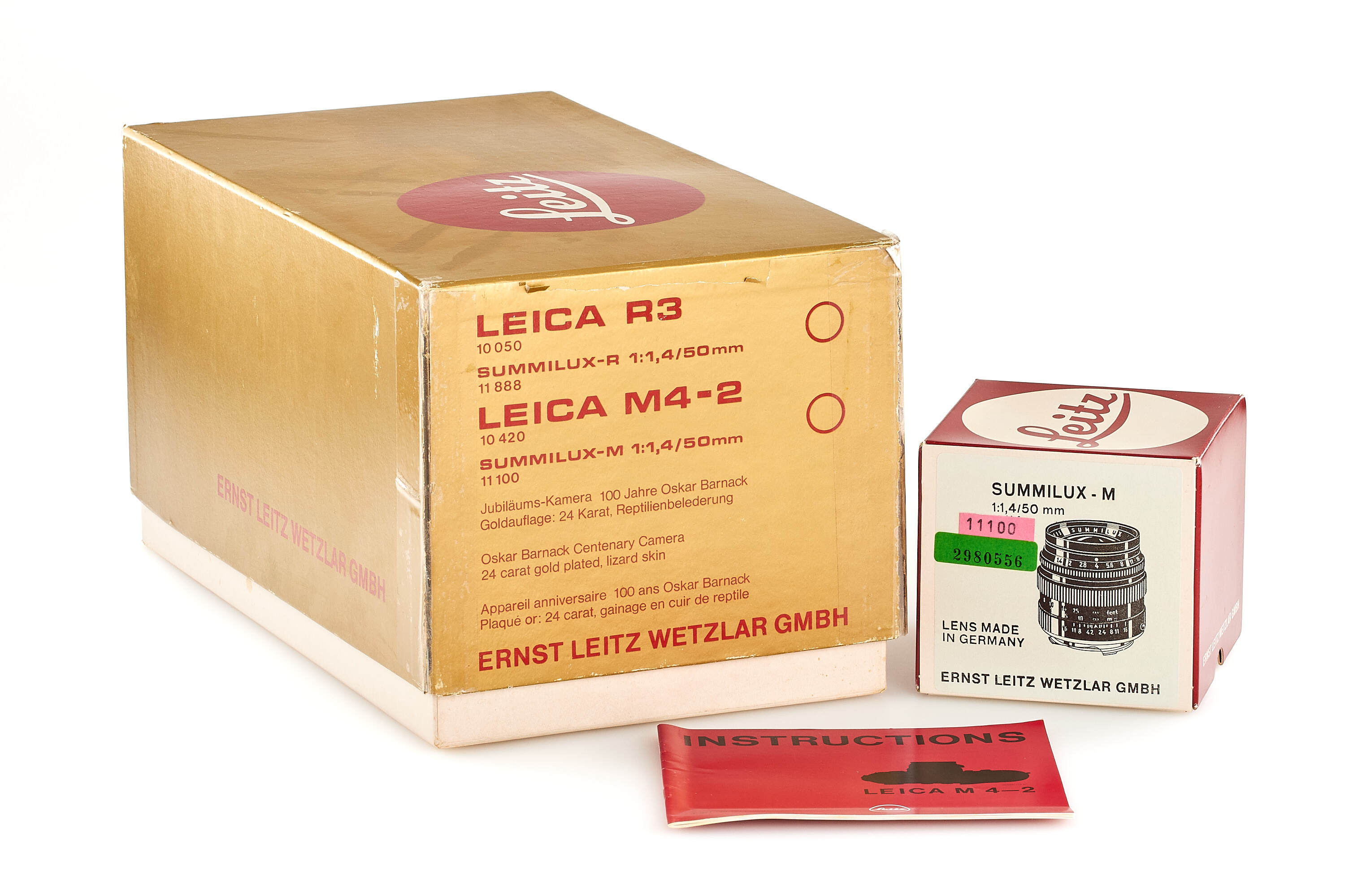 Special gold-plated edition issued for the 100th anniversary of the birth of Oscar Barnack, 1000 pieces produced, body no.1528216 with black reptile skin cover, special number 100-0988 engraved on the top plate, in unused condition, together with gold-plated Summilux 1.4/50mm no.2980556 (clean and clear optics), with strap, instructions, wooden presentation box and maker's boxes.