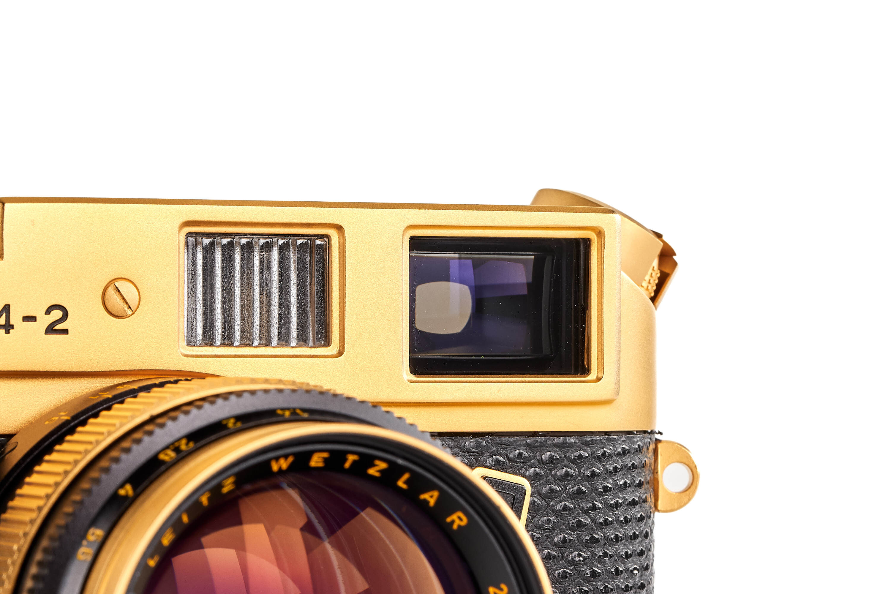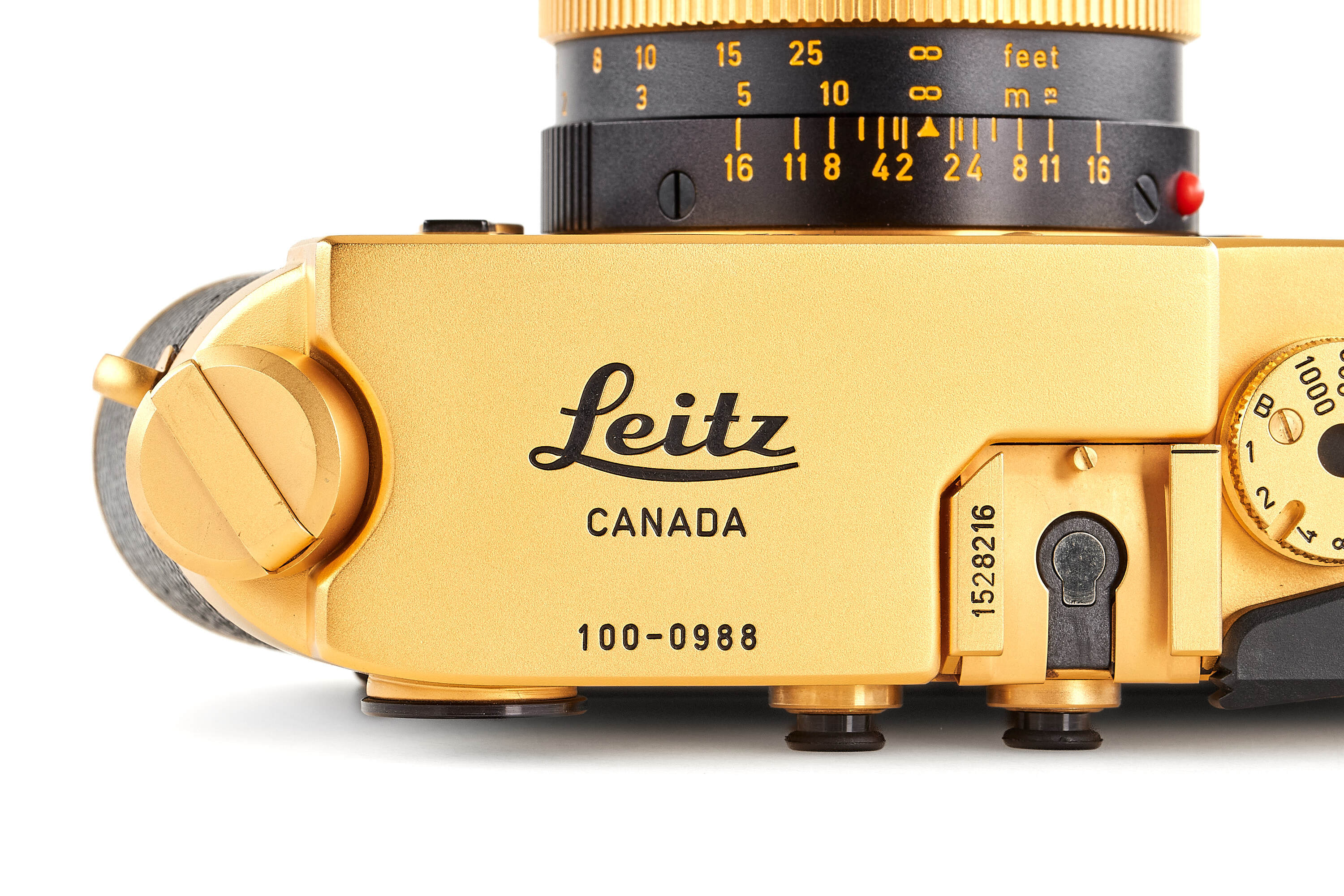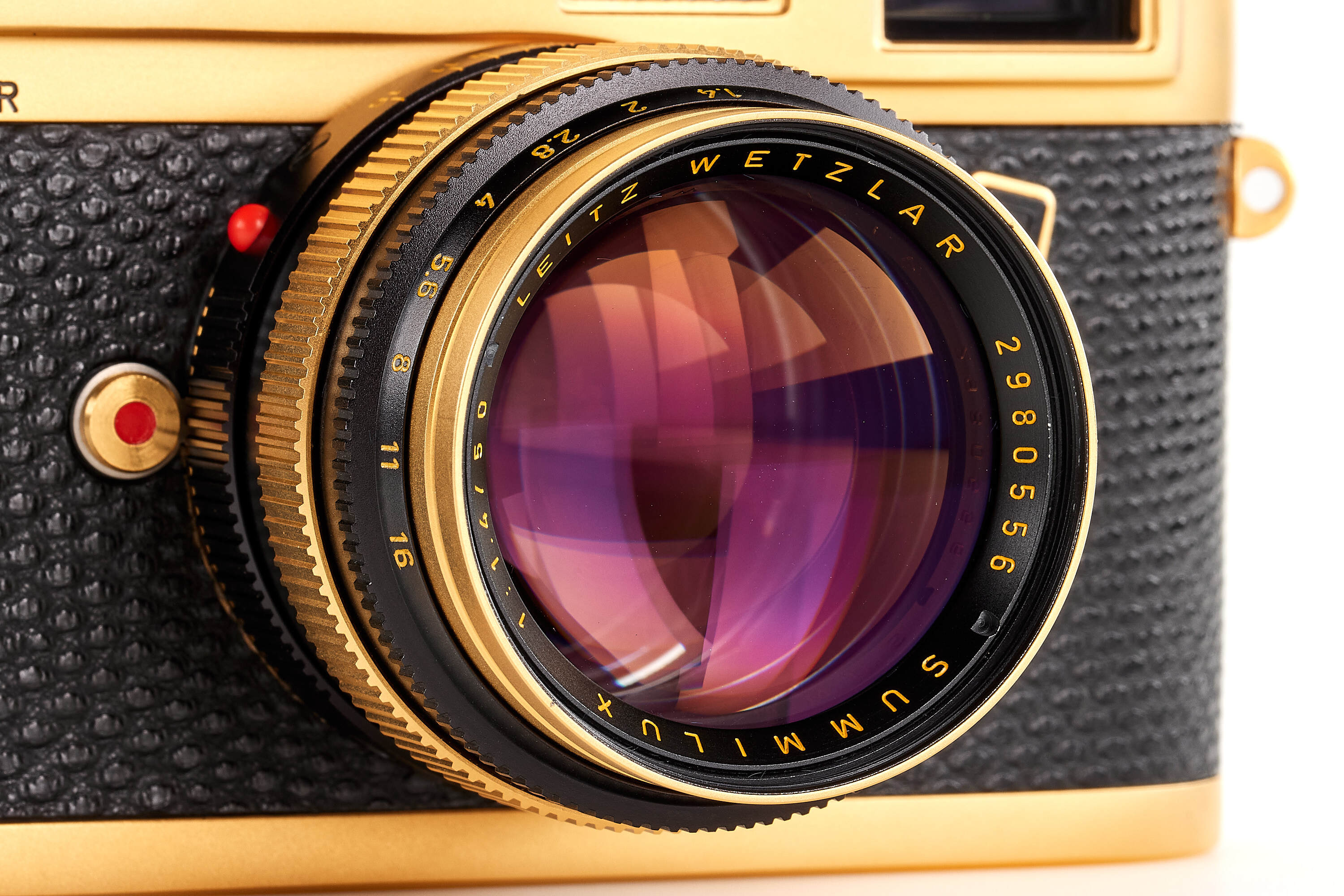 Special gold-plated edition issued for the 100th anniversary of the birth of Oscar Barnack, 1000 pieces produced, body no.1528216 with black reptile skin cover, special number 100-0988 engraved on the top plate, in unused condition, together with gold-plated Summilux 1.4/50mm no.2980556 (clean and clear optics), with strap, instructions, wooden presentation box and maker's boxes.