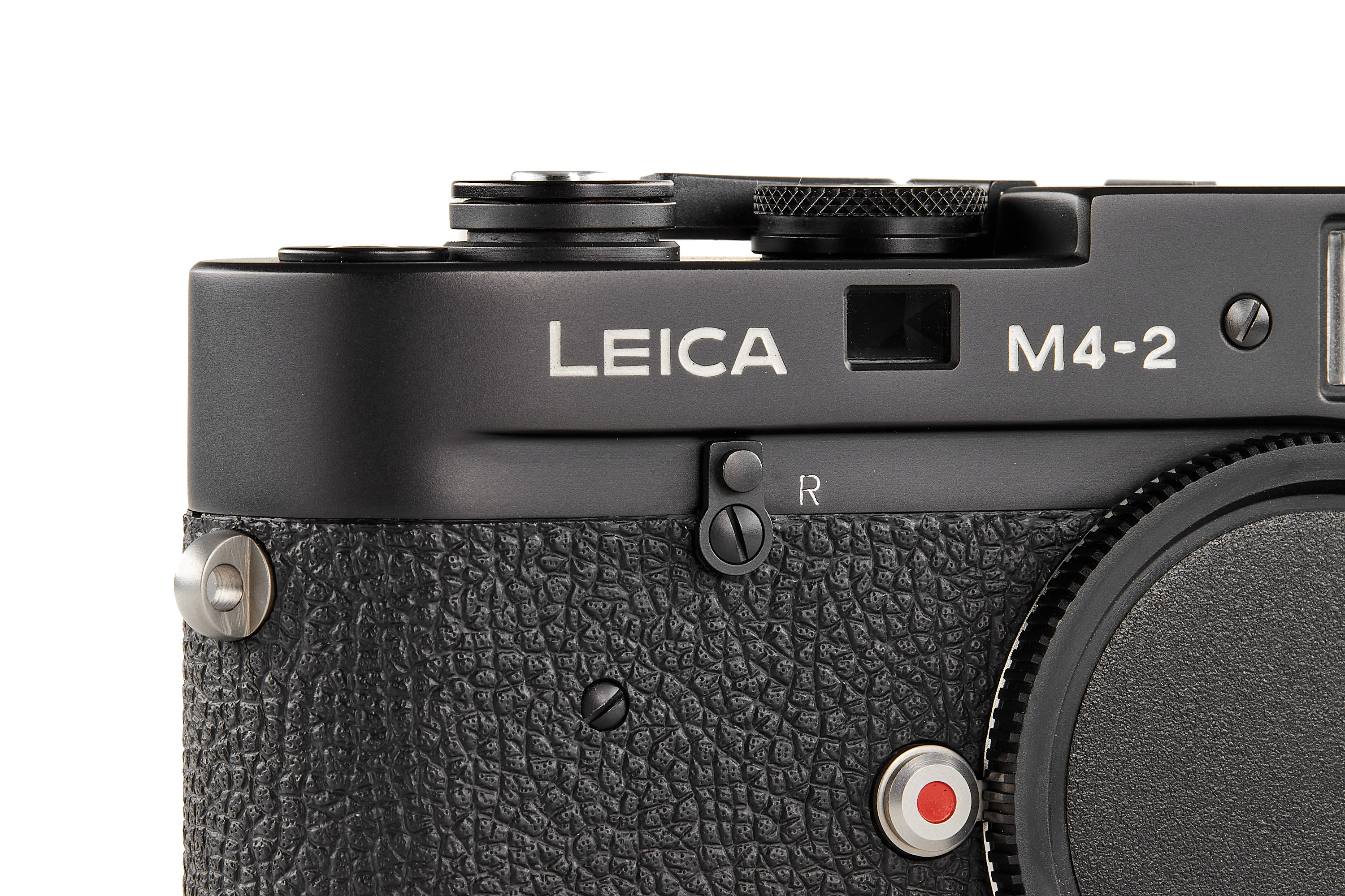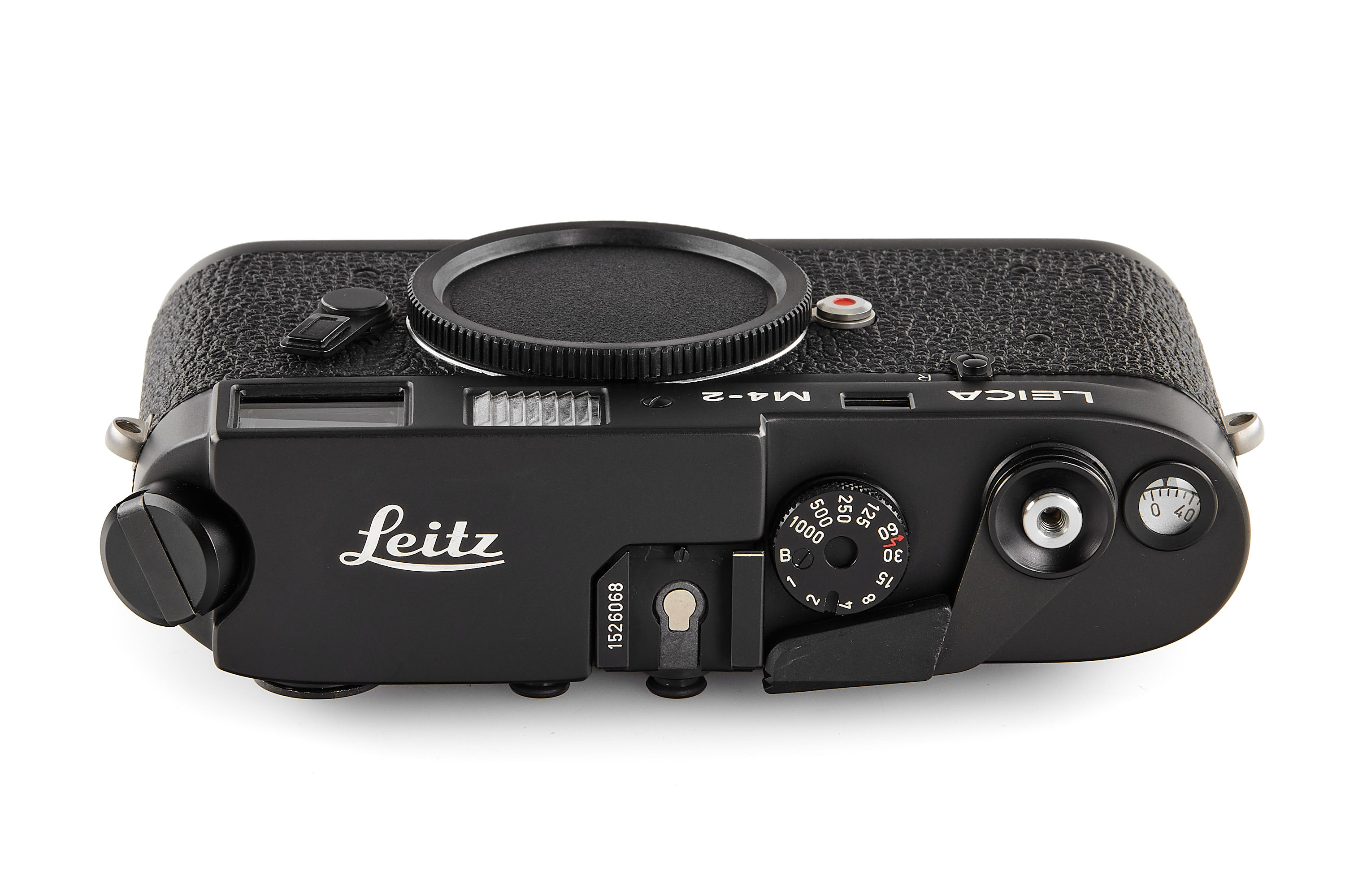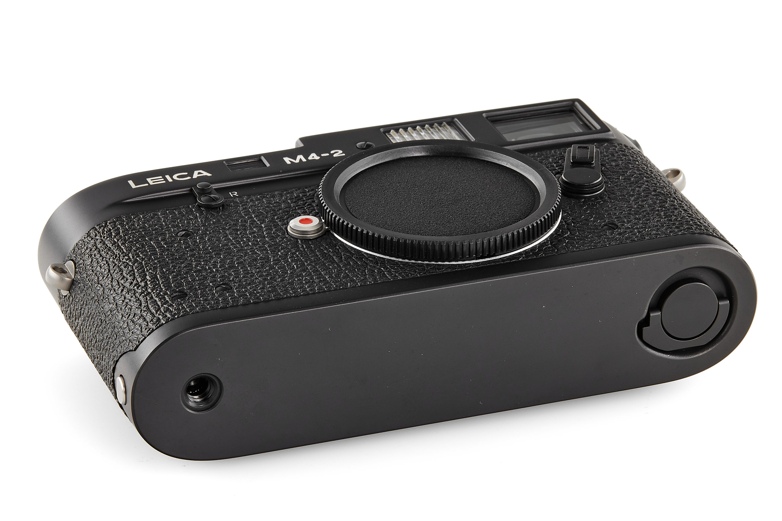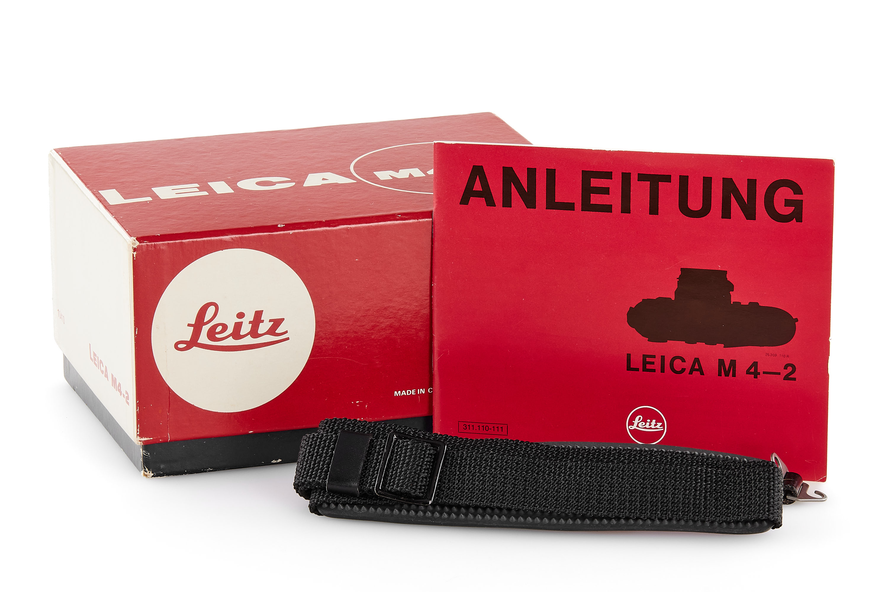 Beautiful black Leica M4-2 made in Canada in absolutely mint condition and in working order, with body cap, strap, German instructions and matching maker's box.